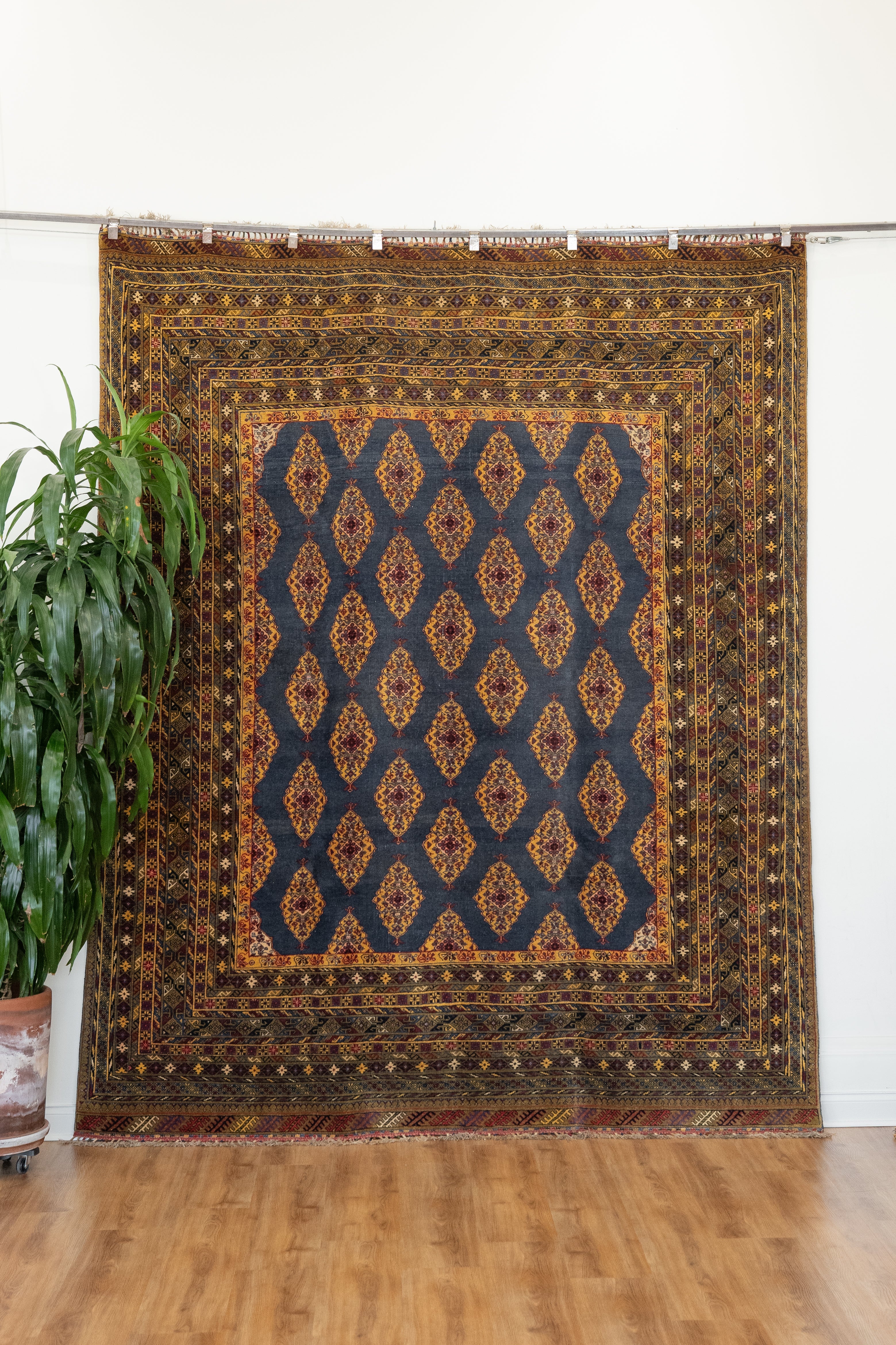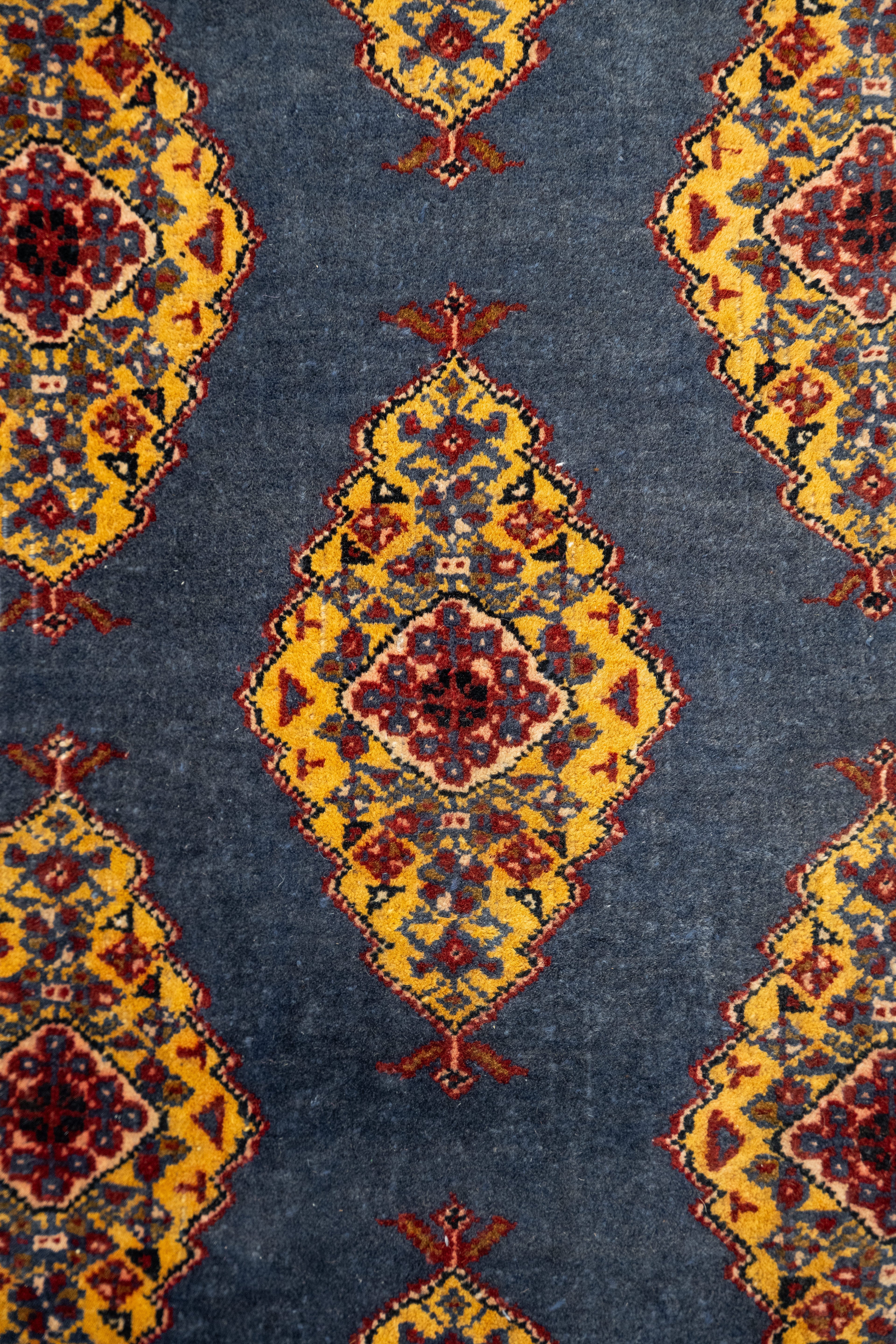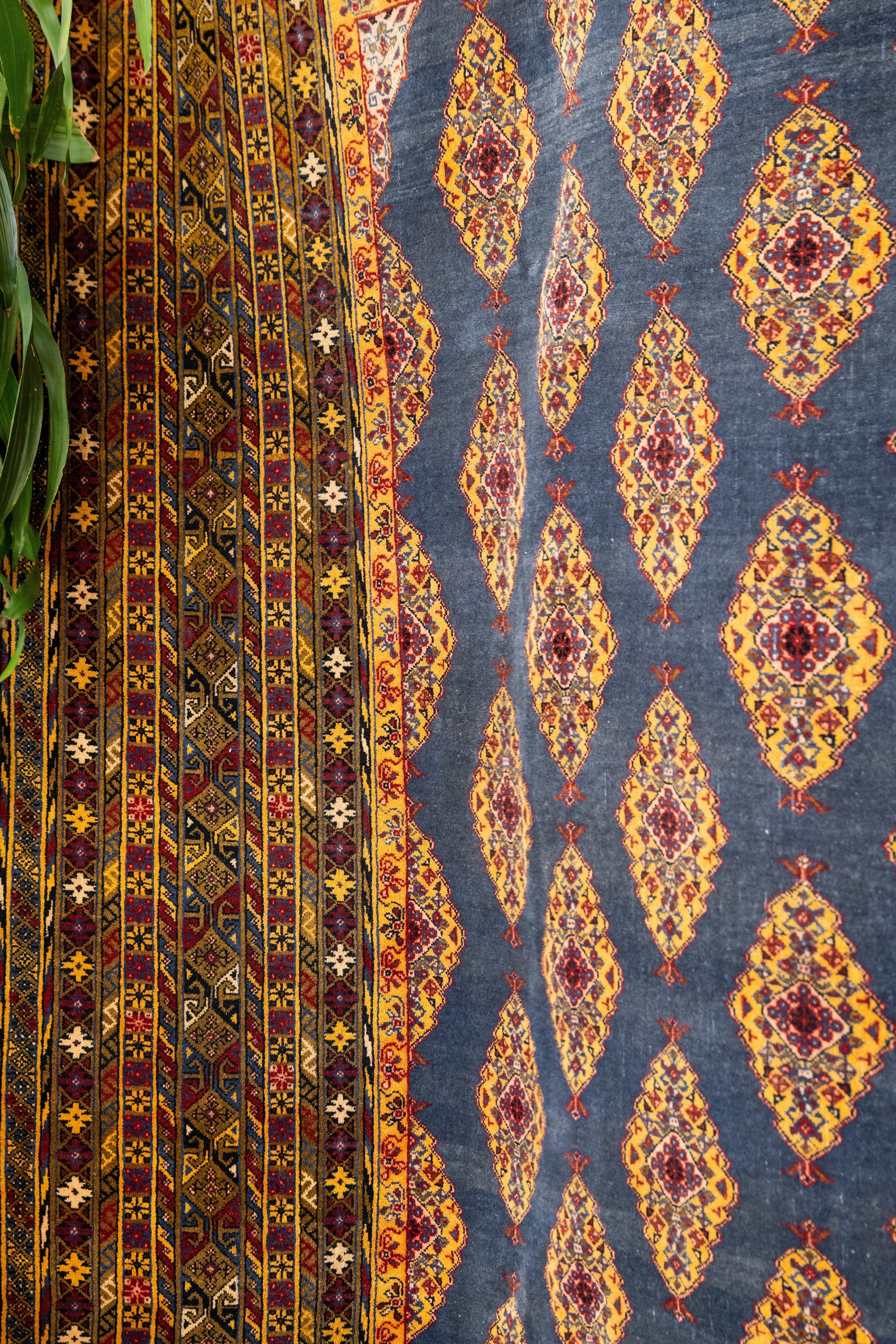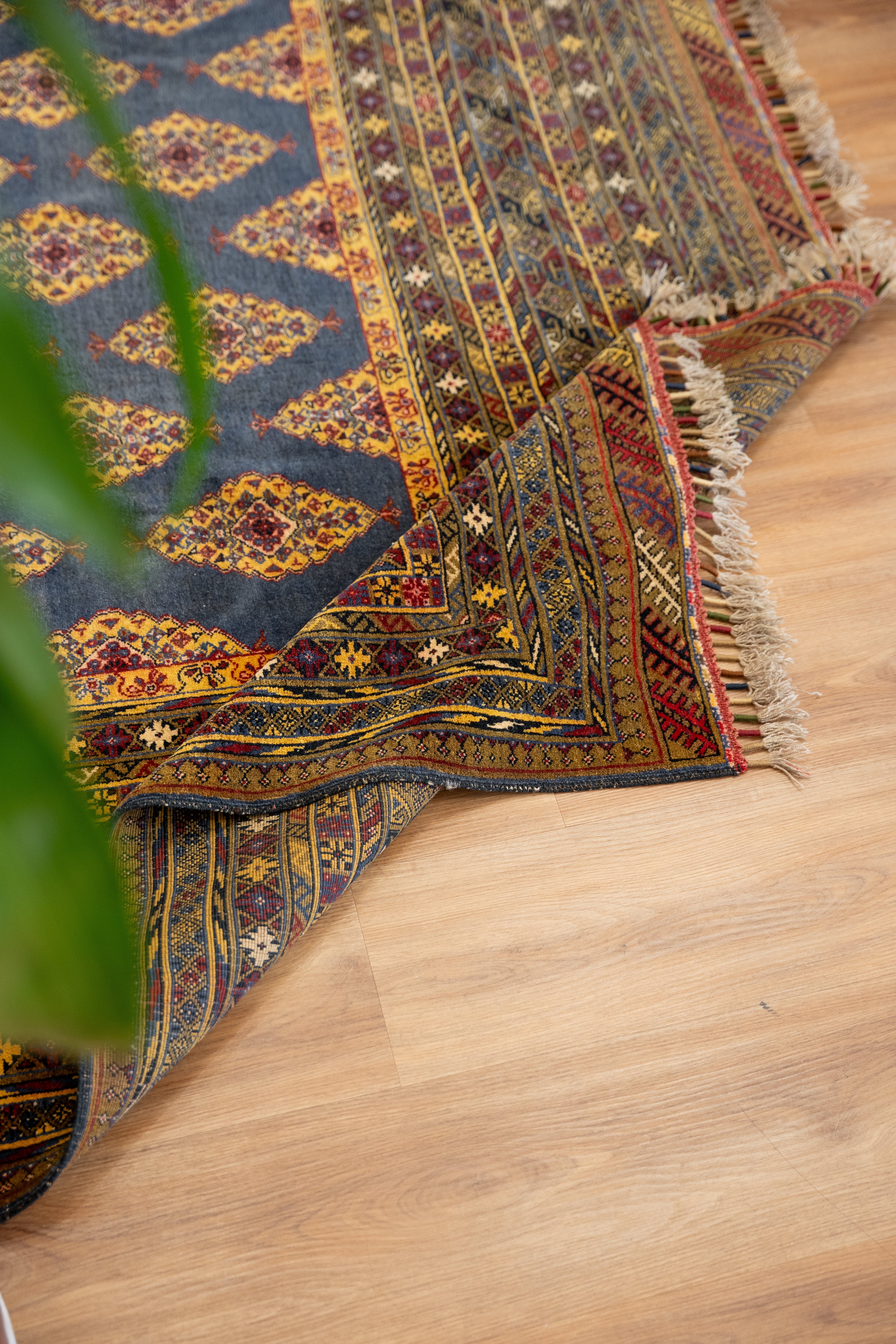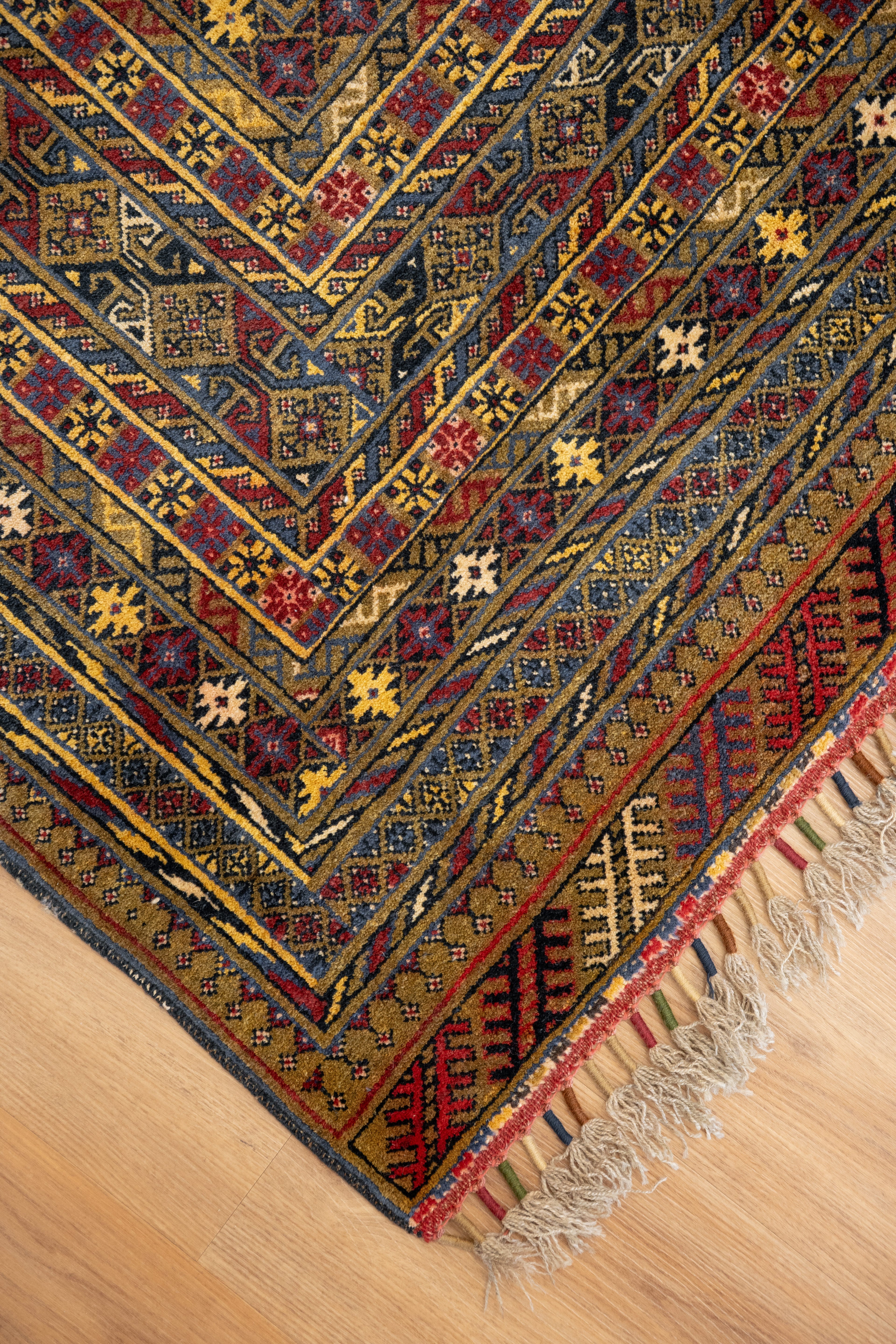 This one-of-a-kind rug is handmade from 100% wool. It features tribal rhombus-shaped repeat motifs, also known as Göl, or the elephant foot, and is set on a cobalt blue ground. This supple wool feels like velvet to the touch and has a luminous hand. All of our rugs are authentic and handpicked by Nedim.