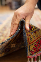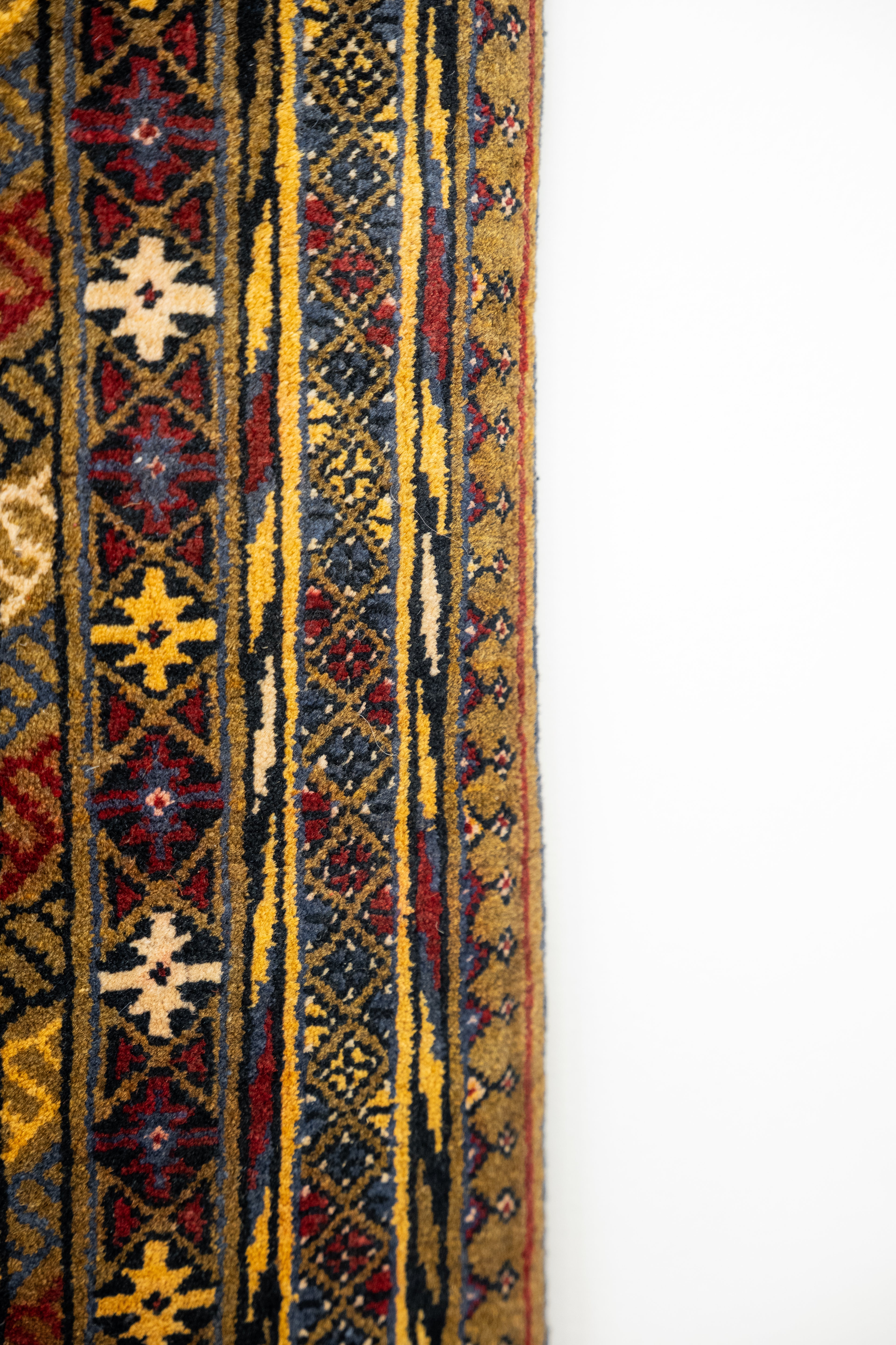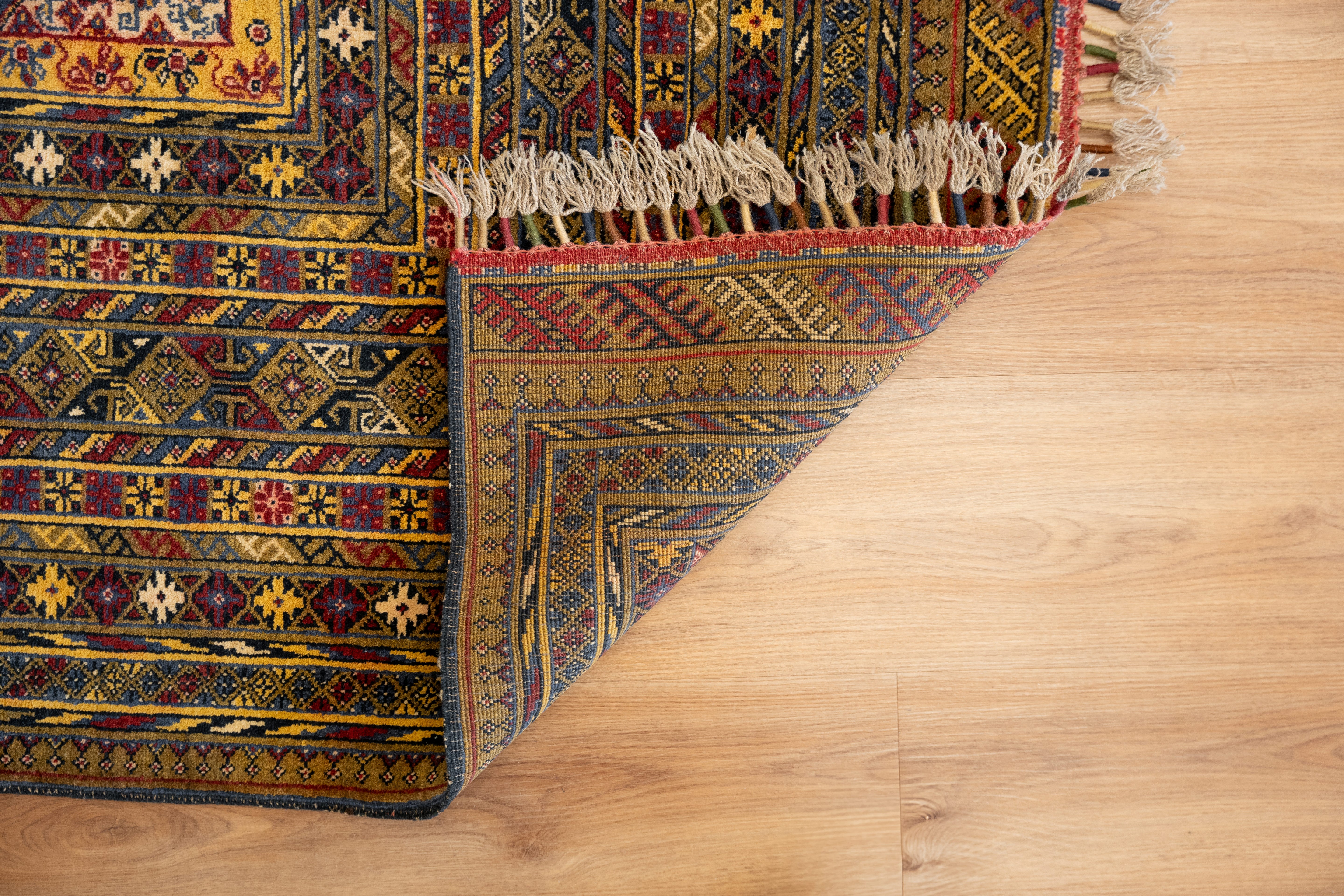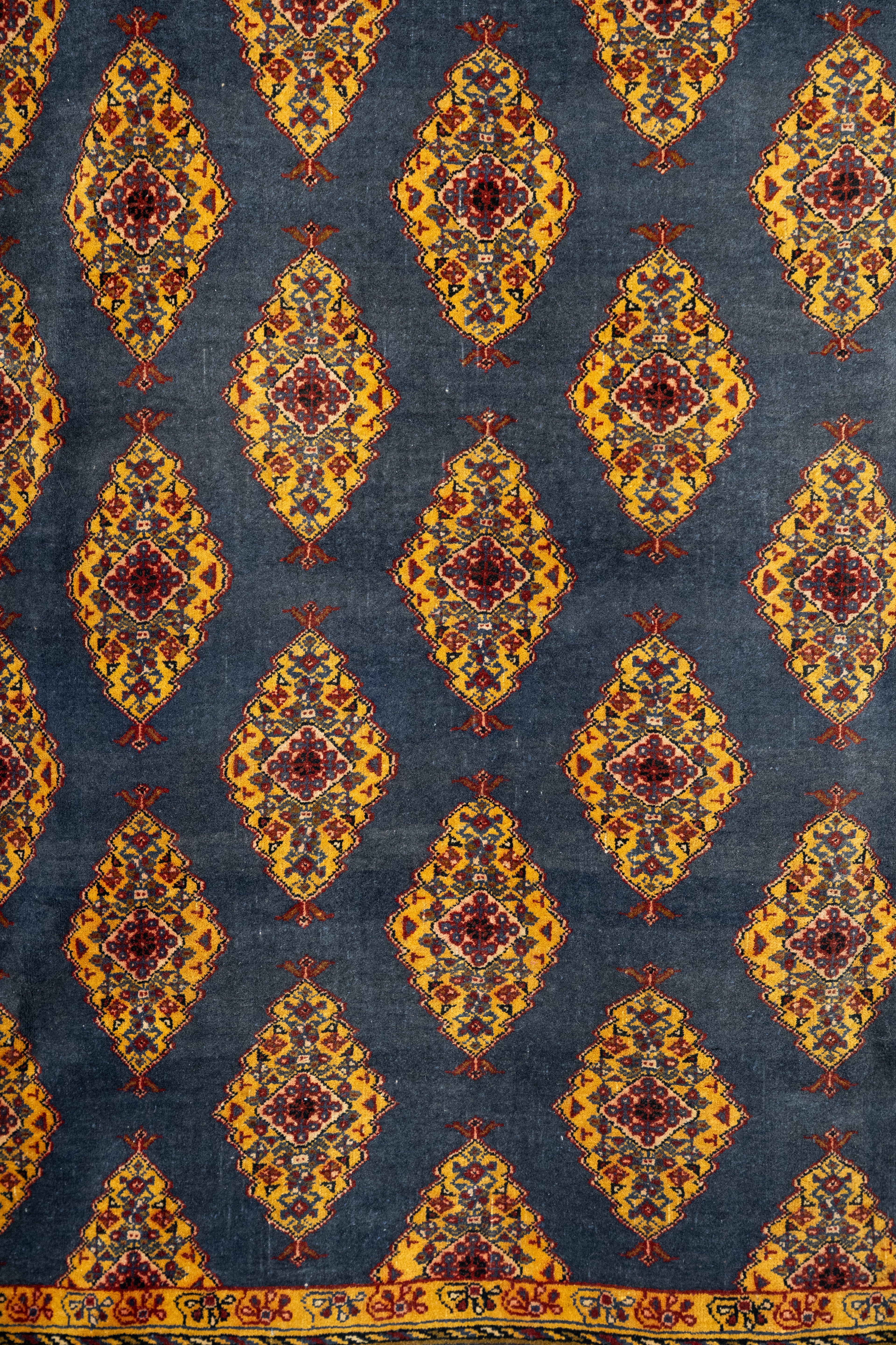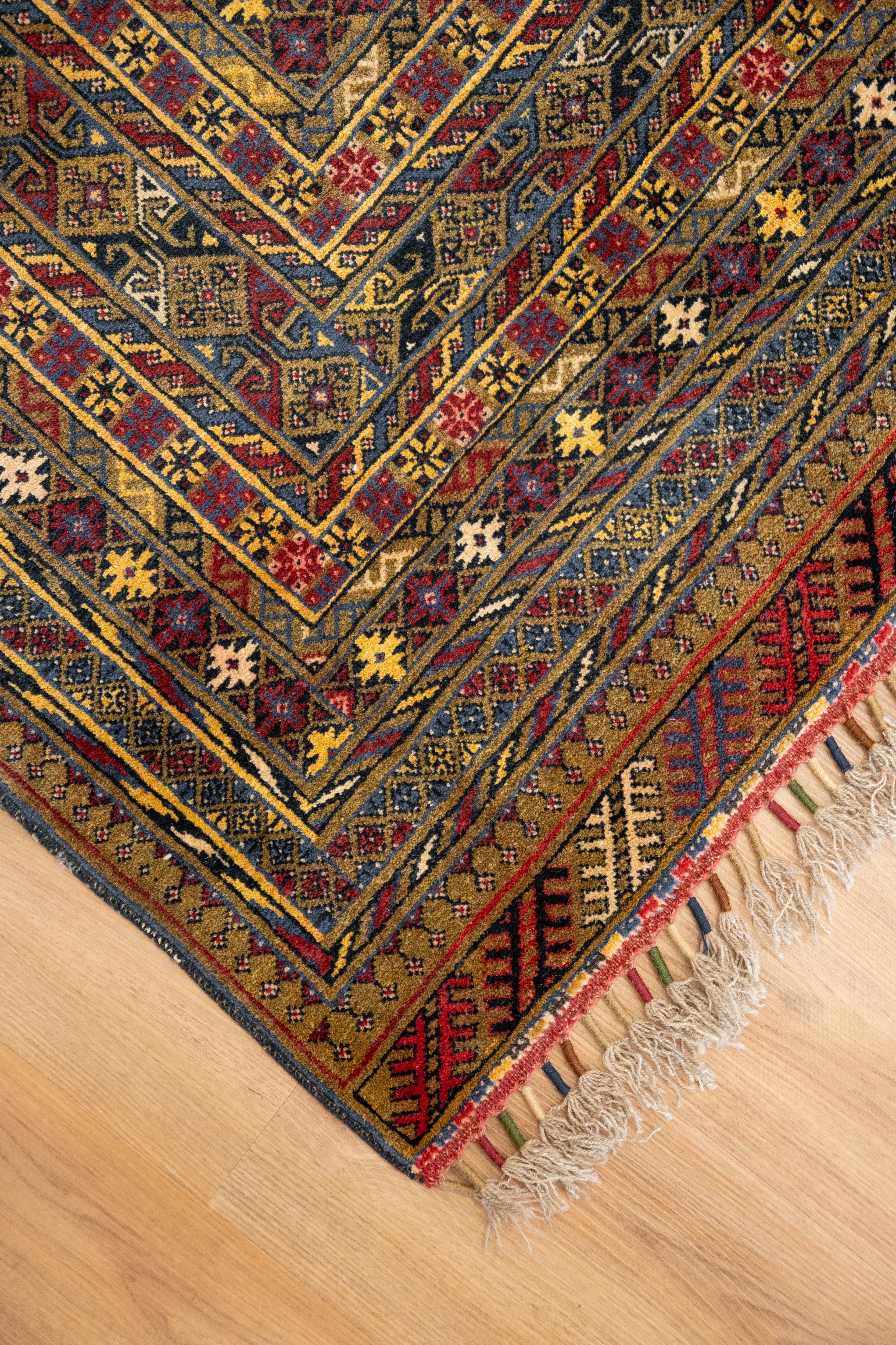 This one-of-a-kind rug is handmade from 100% wool. It features tribal rhombus-shaped repeat motifs, also known as Göl, or the elephant foot, and is set on a cobalt blue ground. This supple wool feels like velvet to the touch and has a luminous hand. All of our rugs are authentic and handpicked by Nedim.