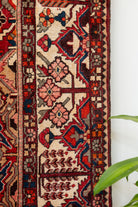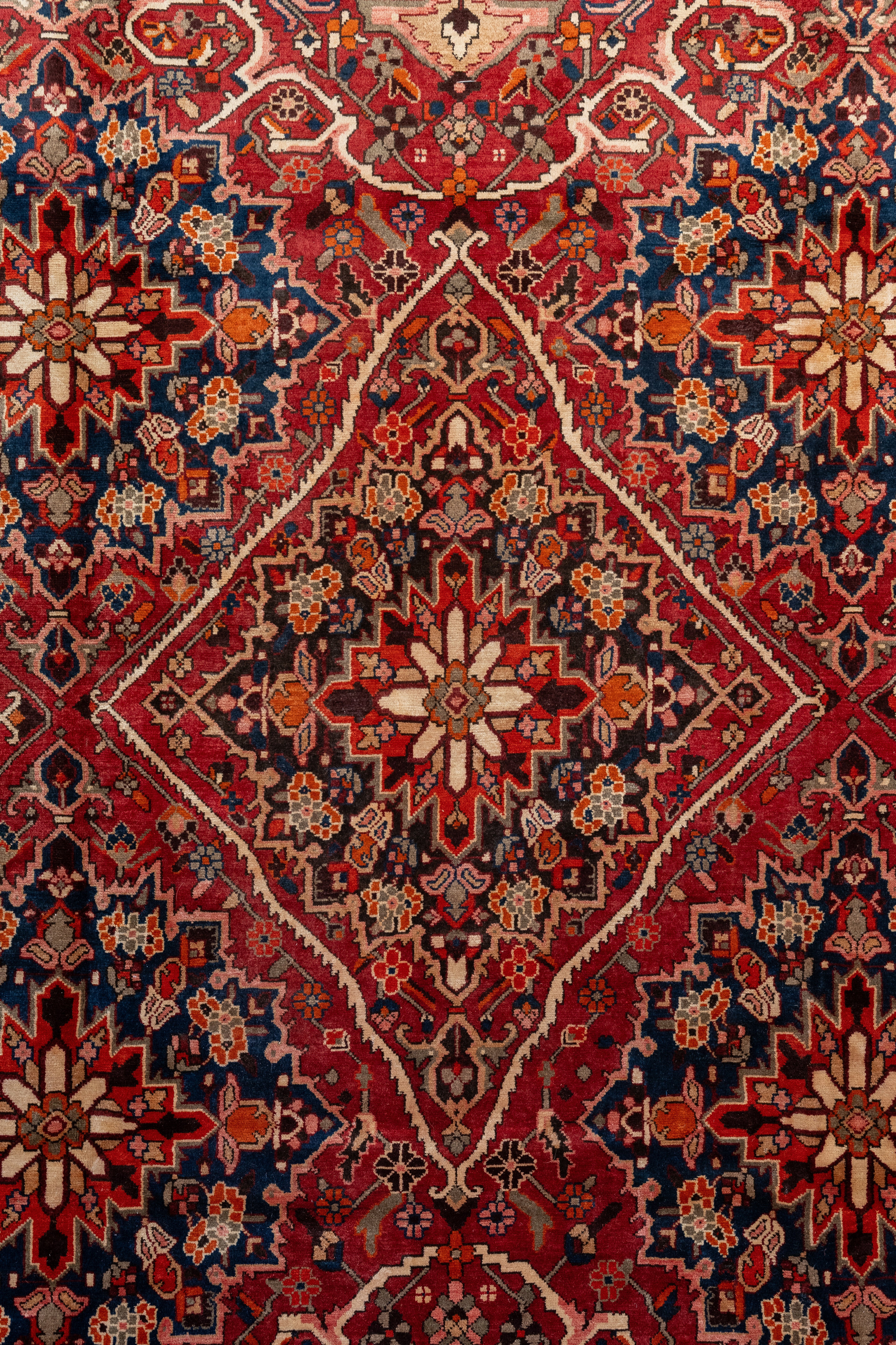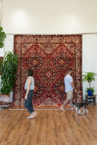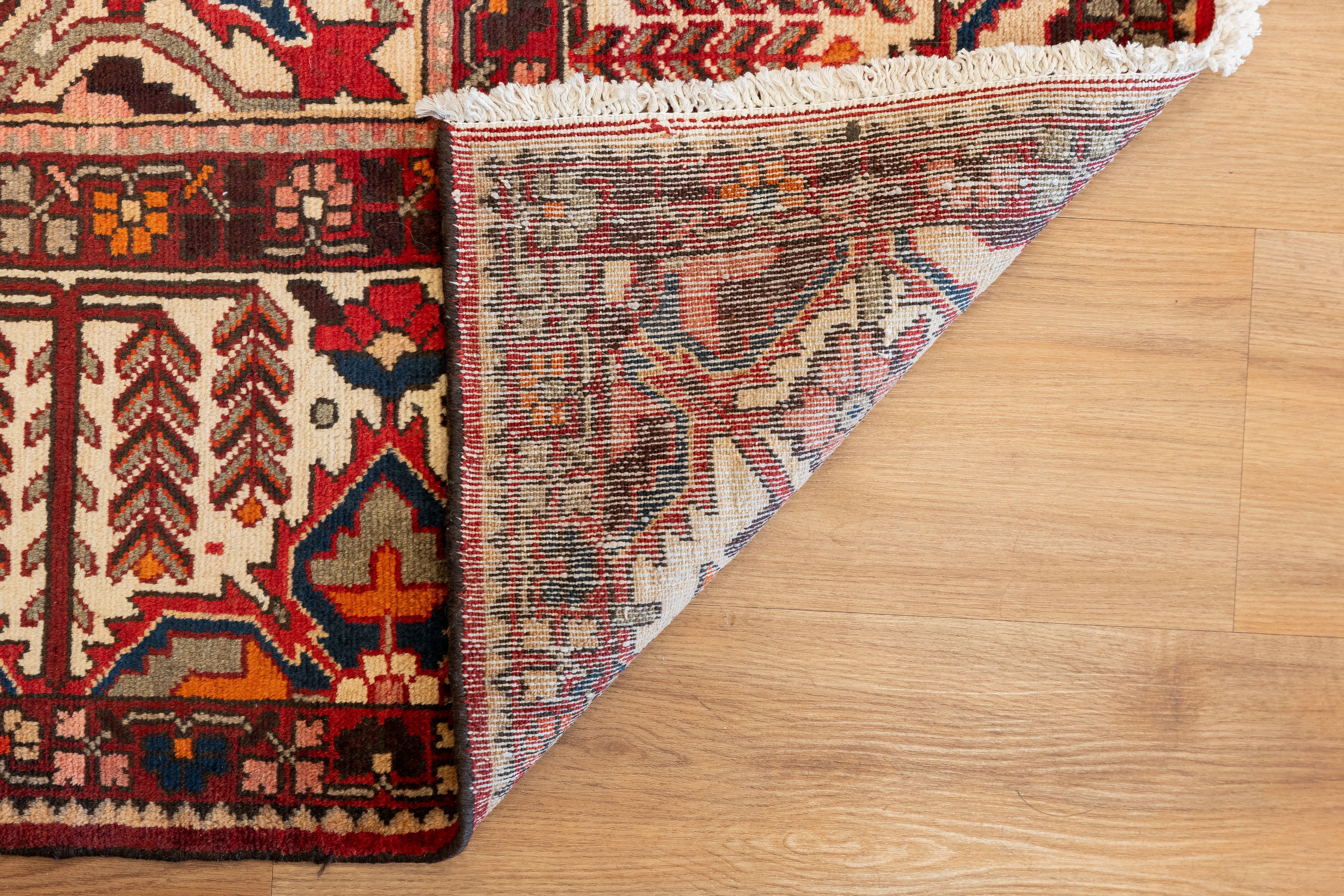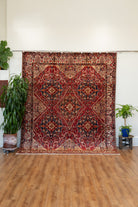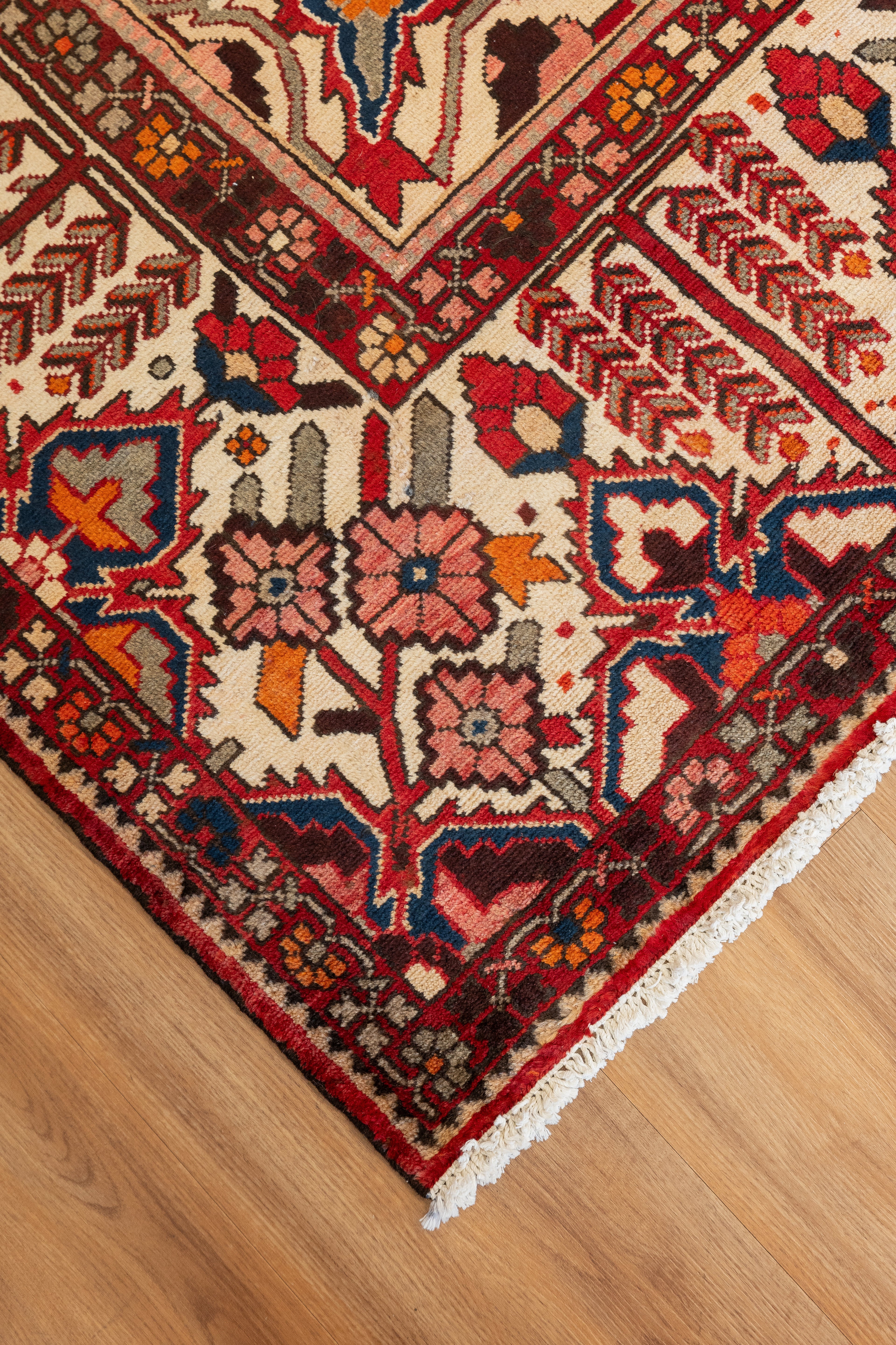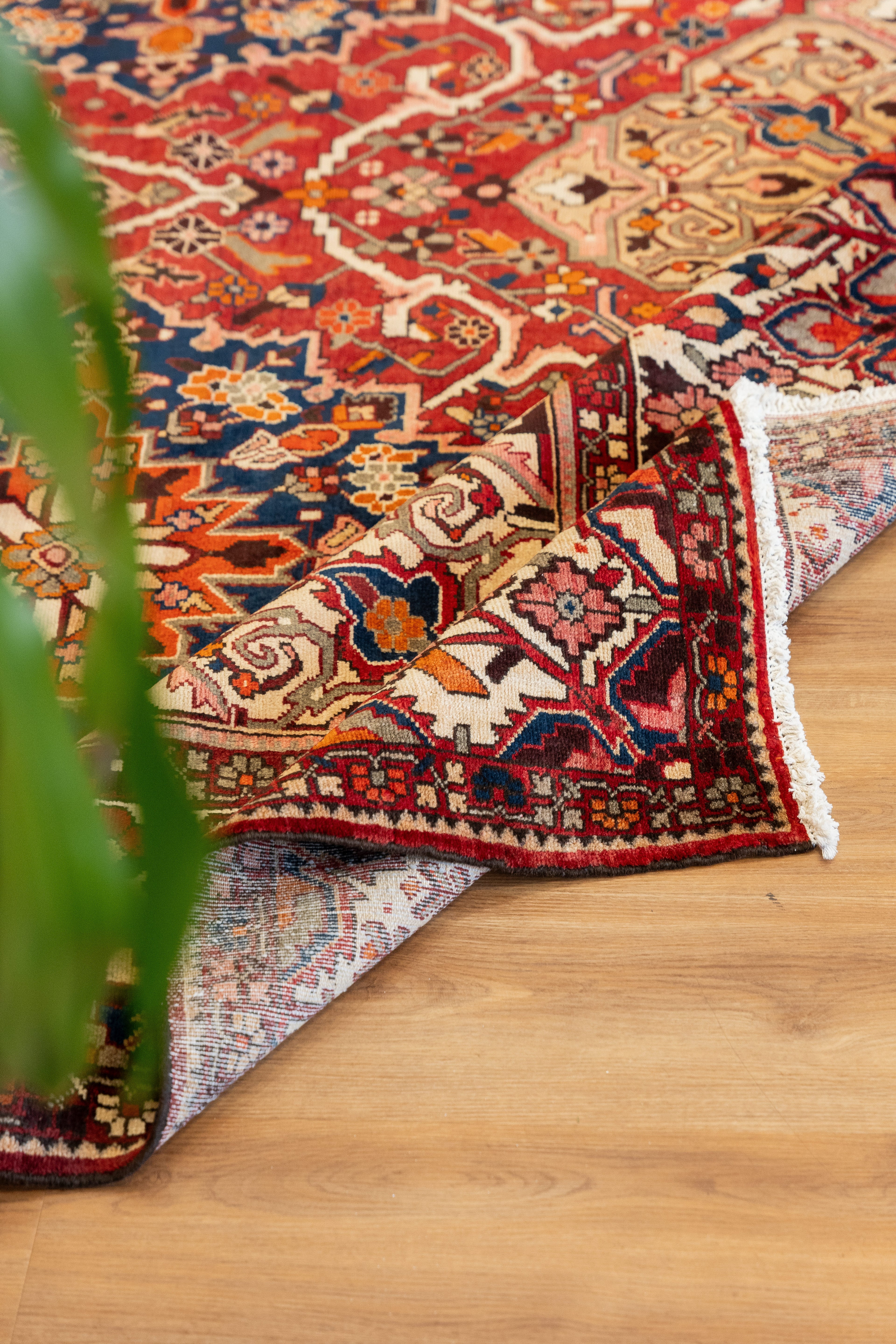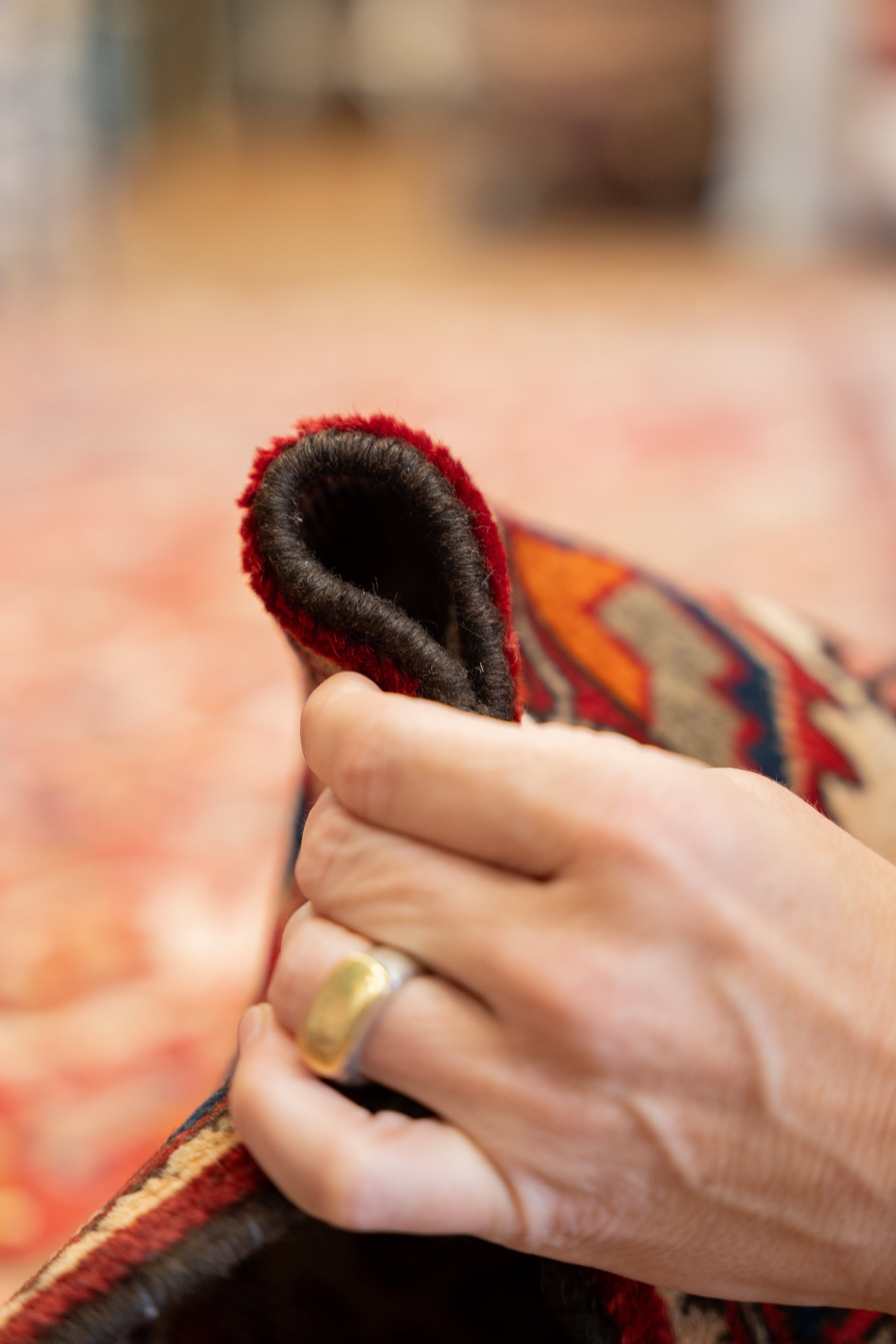 This rare rug is handmade from a cotton foundation and wool pile. Inspired by the artistry of the Bakhtiari tribes, it features traditional garden and floral motifs, such as the lotus and pomegranate motifs. Often arranged in repeating panel designs, like in this area rug. The wool is supple and lustre, with a sheen similar to silk due ot the high content of lanolin in this part of the world. These rugs are known for their vibrant colors, skilled craftsmanship, and soft texture. Each of our rugs is authentic and carefully handpicked by Nedim himself.