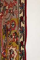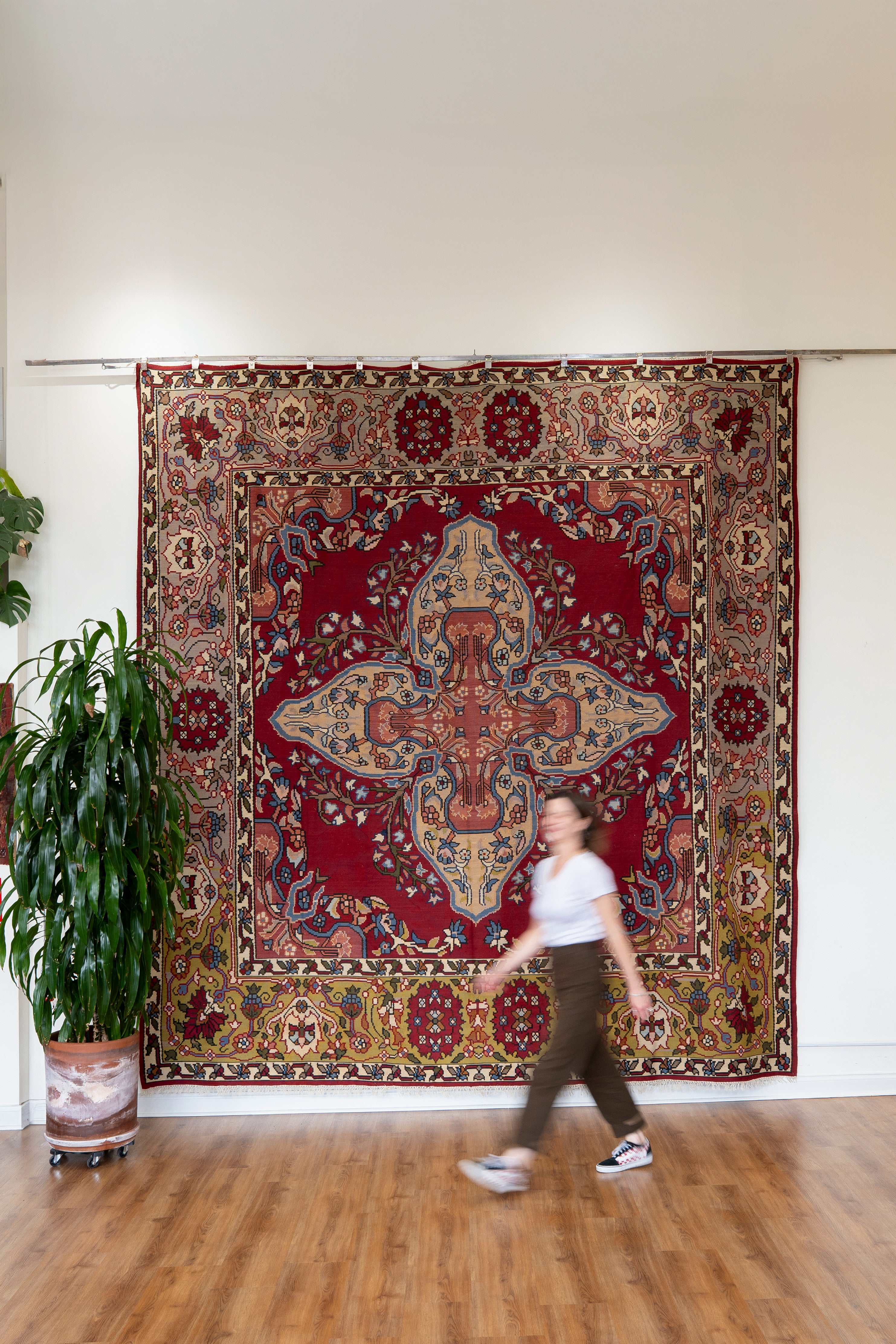 This one-of-a-kind, pile-less rug is lightweight and finely woven from 100% wool. Featuring a delicate floral bouquet motif, it draws from traditional nomadic design. The base showcases the natural hue of undyed wool, while the intricate floral patterns are rendered in soft blue and cream. A distinctive detail: one end of the rug is finished in chartreuse green, subtly fading into cream at the opposite edge. All of our rugs are authentic and carefully handpicked by Nedim.