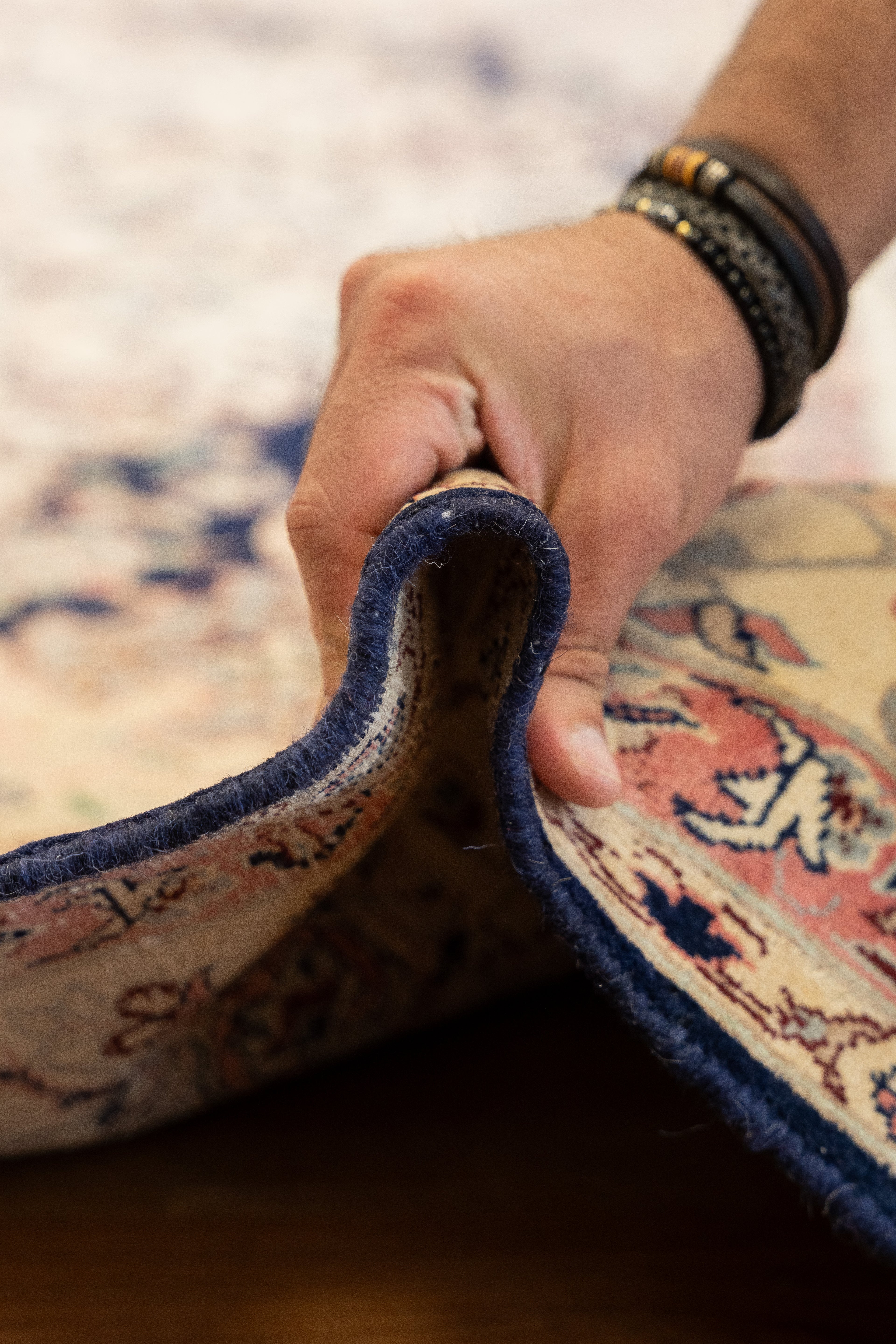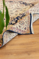 This one-of-a-kind area rug has a very soft and densely woven wool pile, and is made on a cotton foundation. The intricate floral motifs in this traditional rug are cleverly saturated, and the dark indigo blue ground creates a very strong contrasts. This rug is ideal for high traffic areas and present a neutral composition of colors that sku slightly pink. All of our rugs are authentic and handpicked by Nedim.