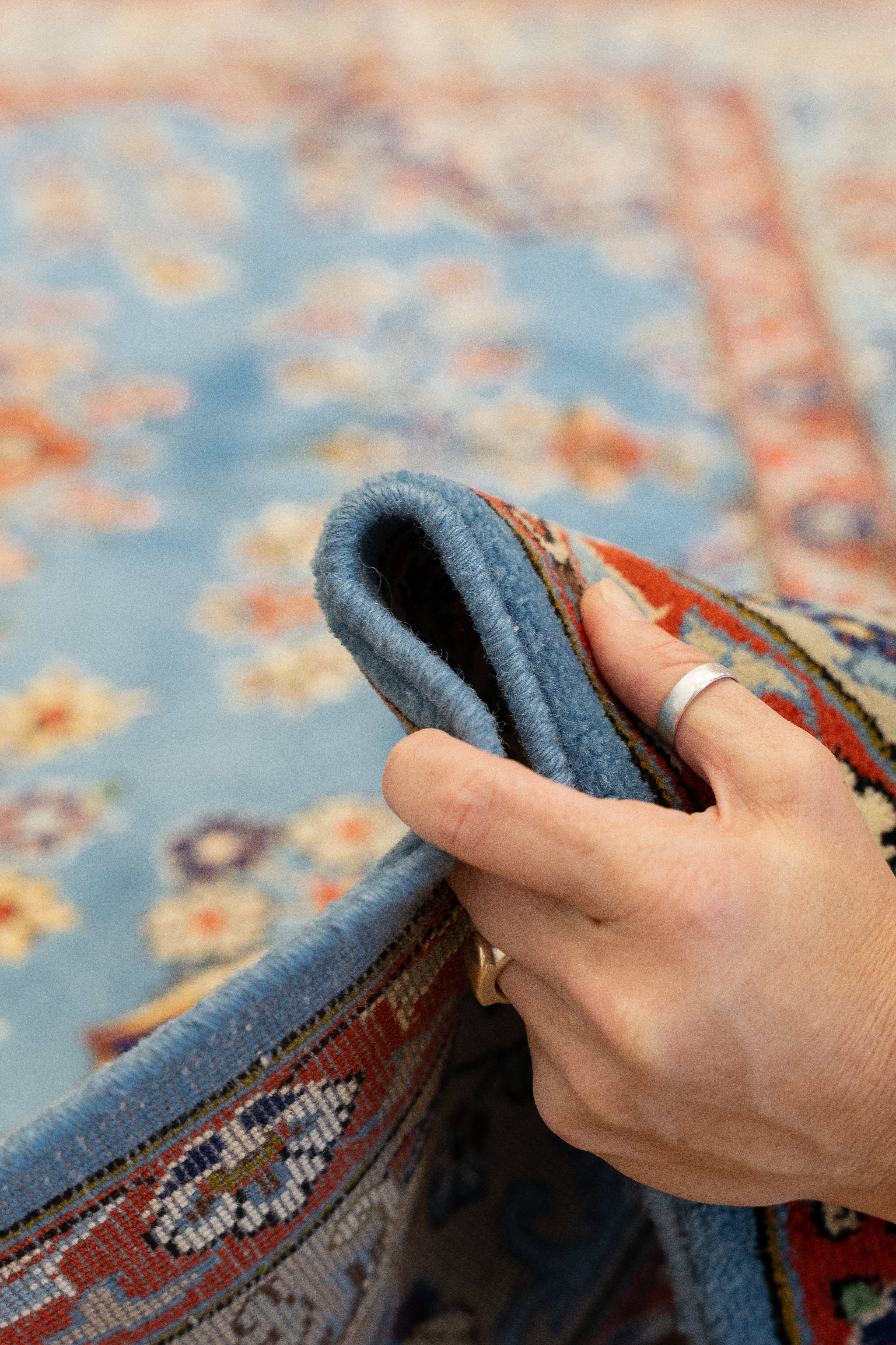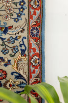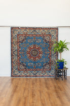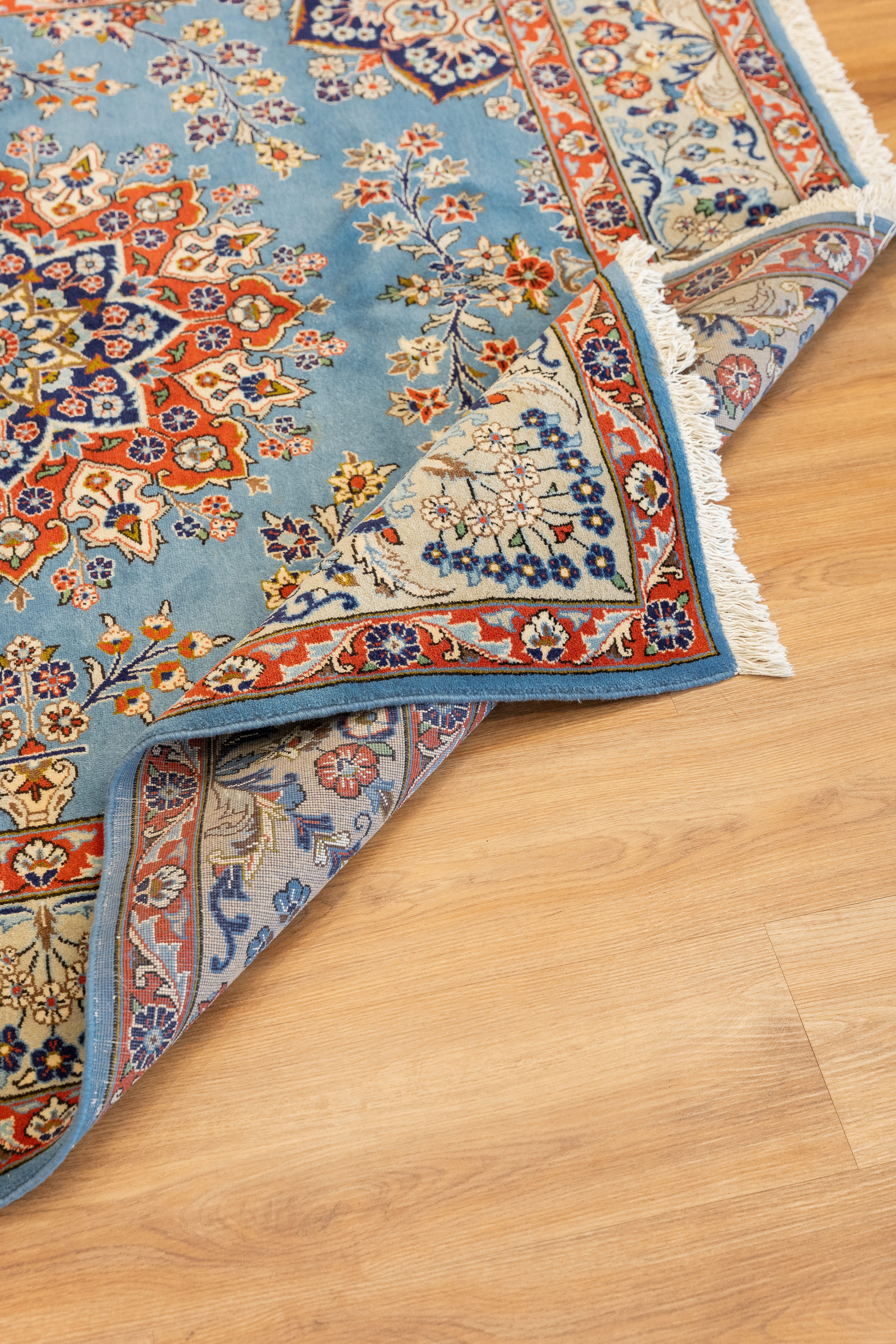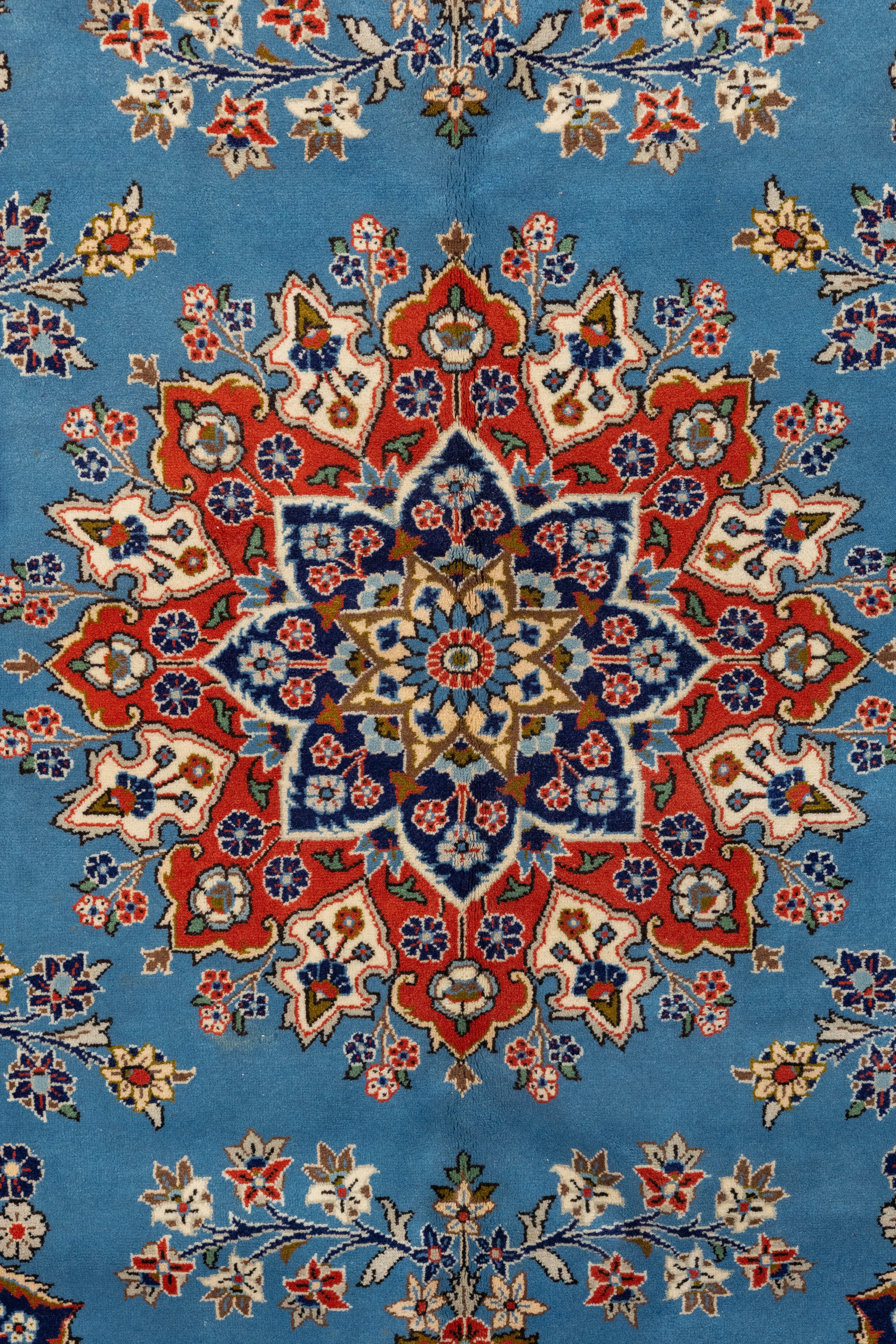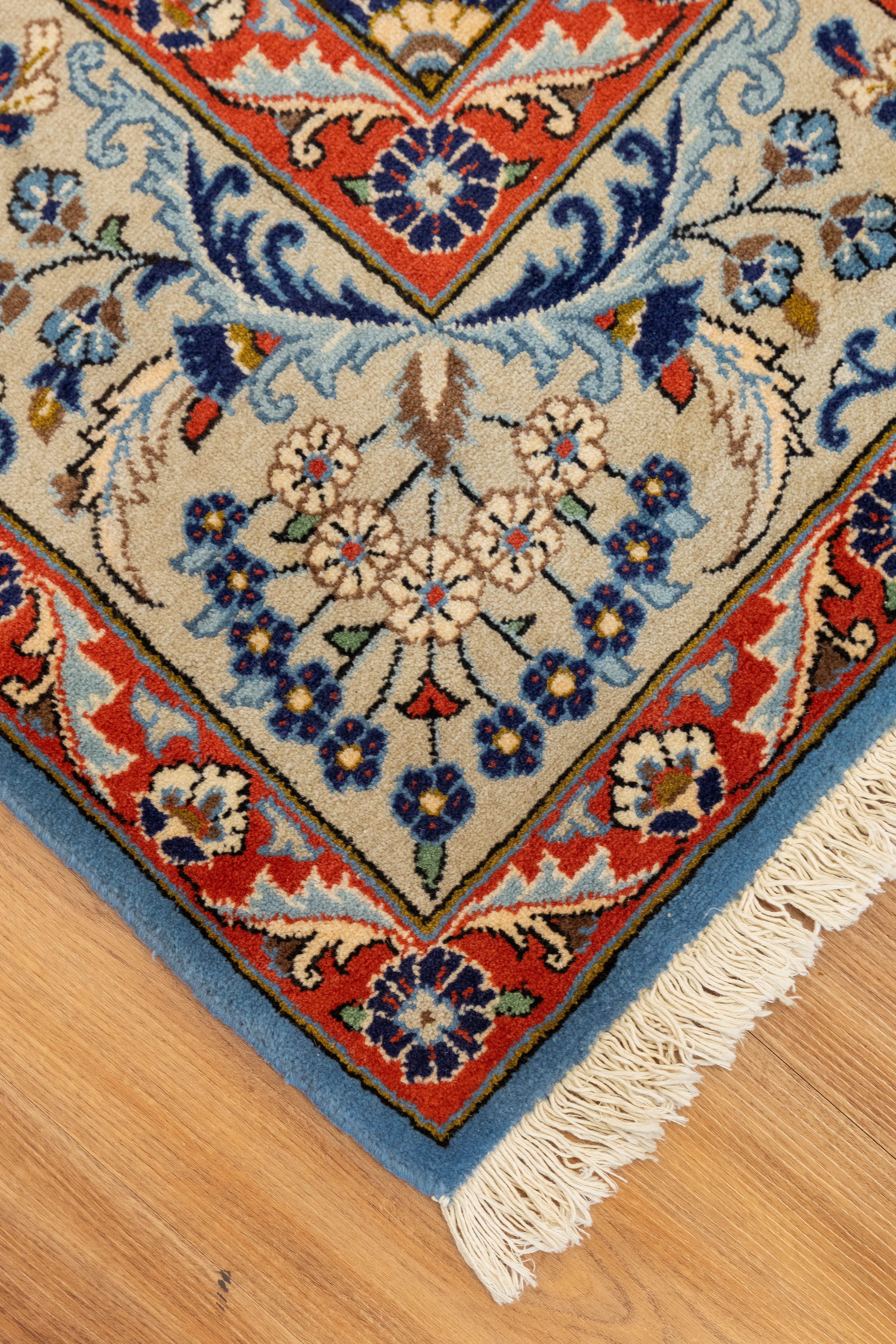 This one-of-a-kind area rug has a quarter of an inch pile and was made on a cotton foundation and wool pile. The center medallion is a classic Herati design, it's placed on a bright blue ground, and then surrounded by smaller floral motifs in red blue and cream. Rugs woven in the region have a thick pile and are hard-wearing. All of our rugs are authentic and carefully handpicked by Nedim.
