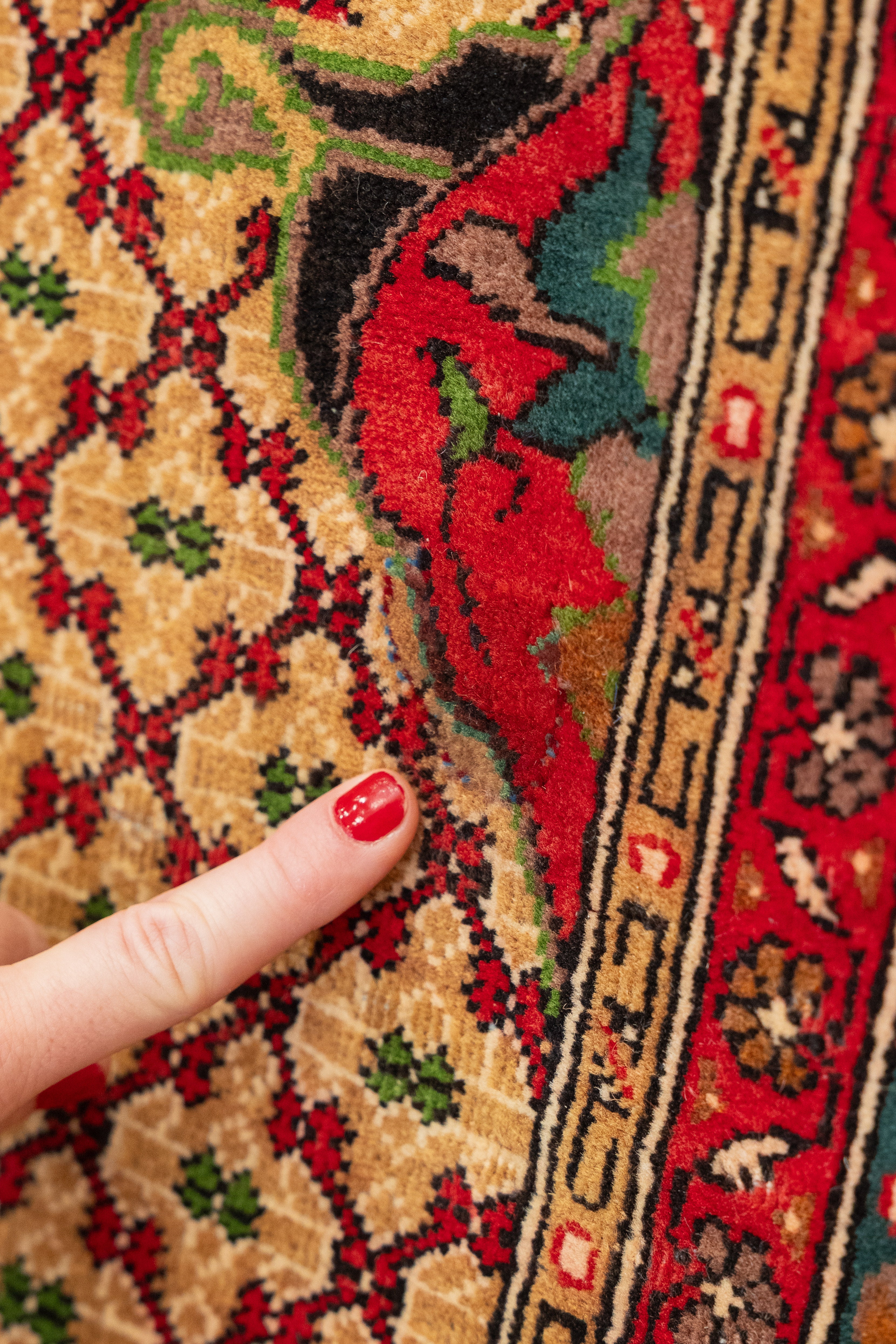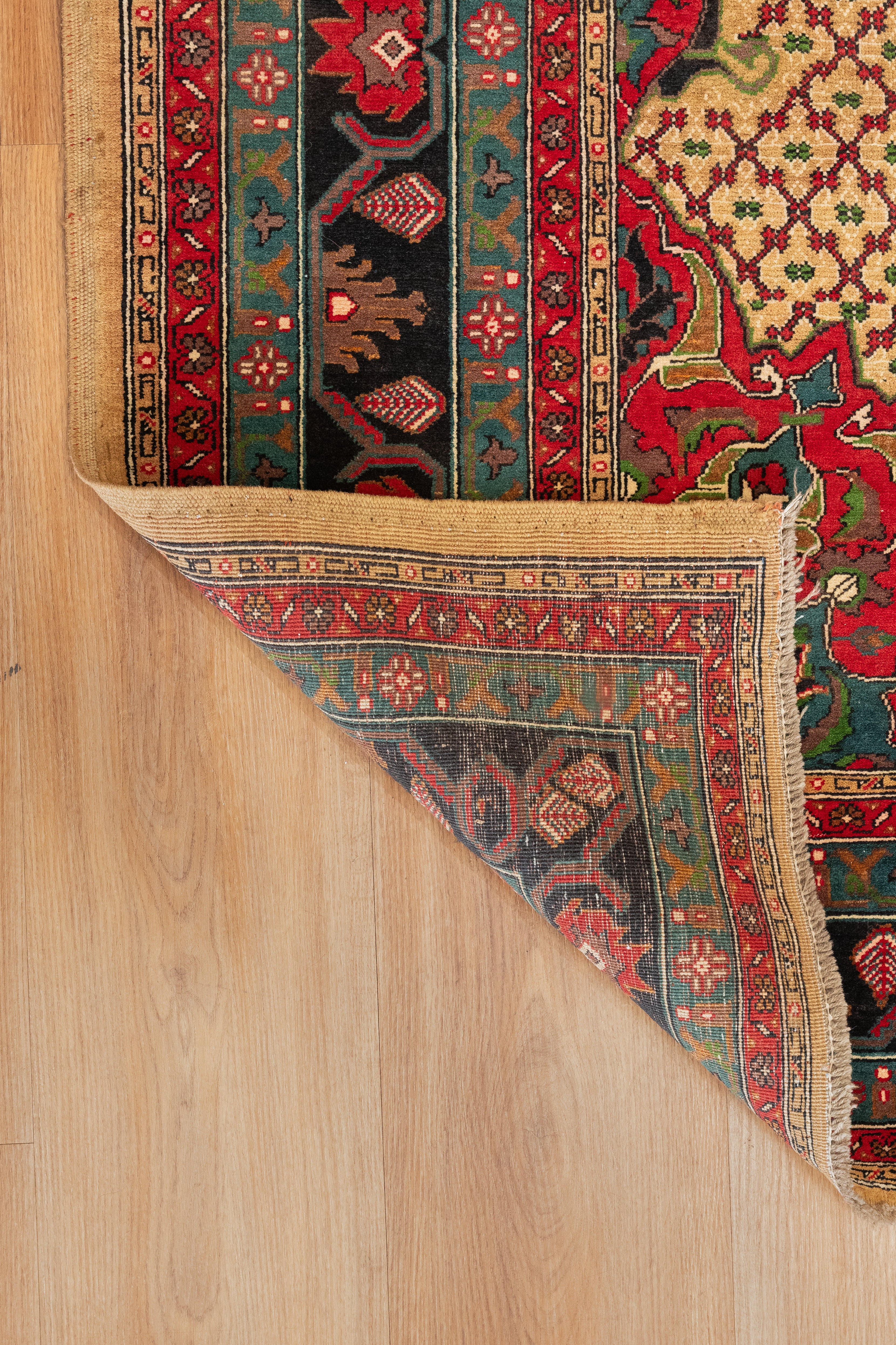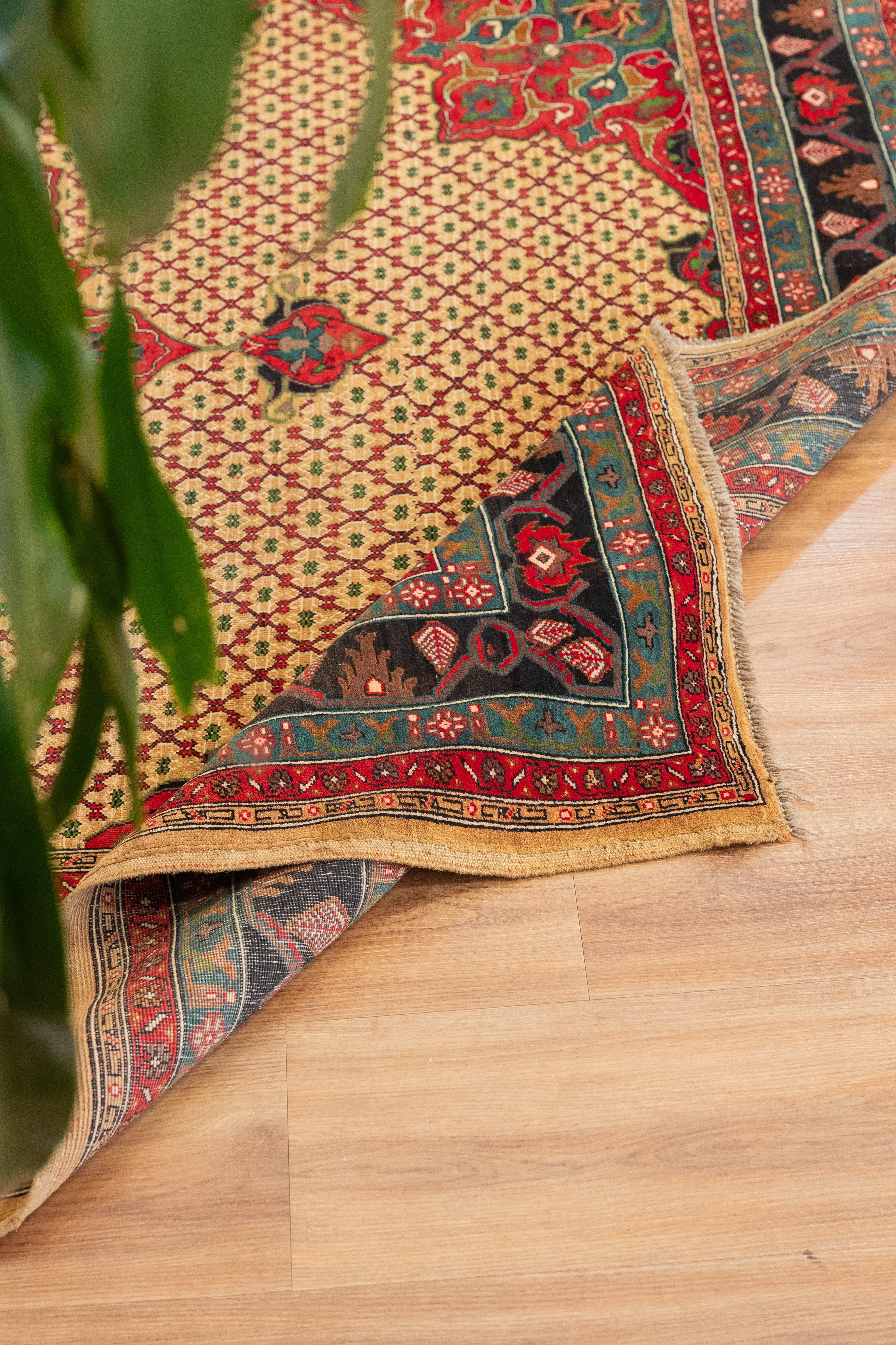 Woven by hand from the finest 100% wool, this one-of-a-kind rug tells a story of time, skill, and tradition. At its heart lies the timeless eight-point medallion, an emblem of balance and harmony. Radiating outward into a field of delicate diamonds that shimmer across a golden ground until they gently meet the four corners, rendering astonishing details that only a densely knotted weave can capture. Once the pattern is complete, the pile is sheared close to the knots, allowing the micro motifs to stand out in crisp relief. This rug is approximately 70 years old and shows beautiful signs of time and a few restorations. Please inspect all photos. Every rug in our collection is authentic, carefully handpicked by Nedim.