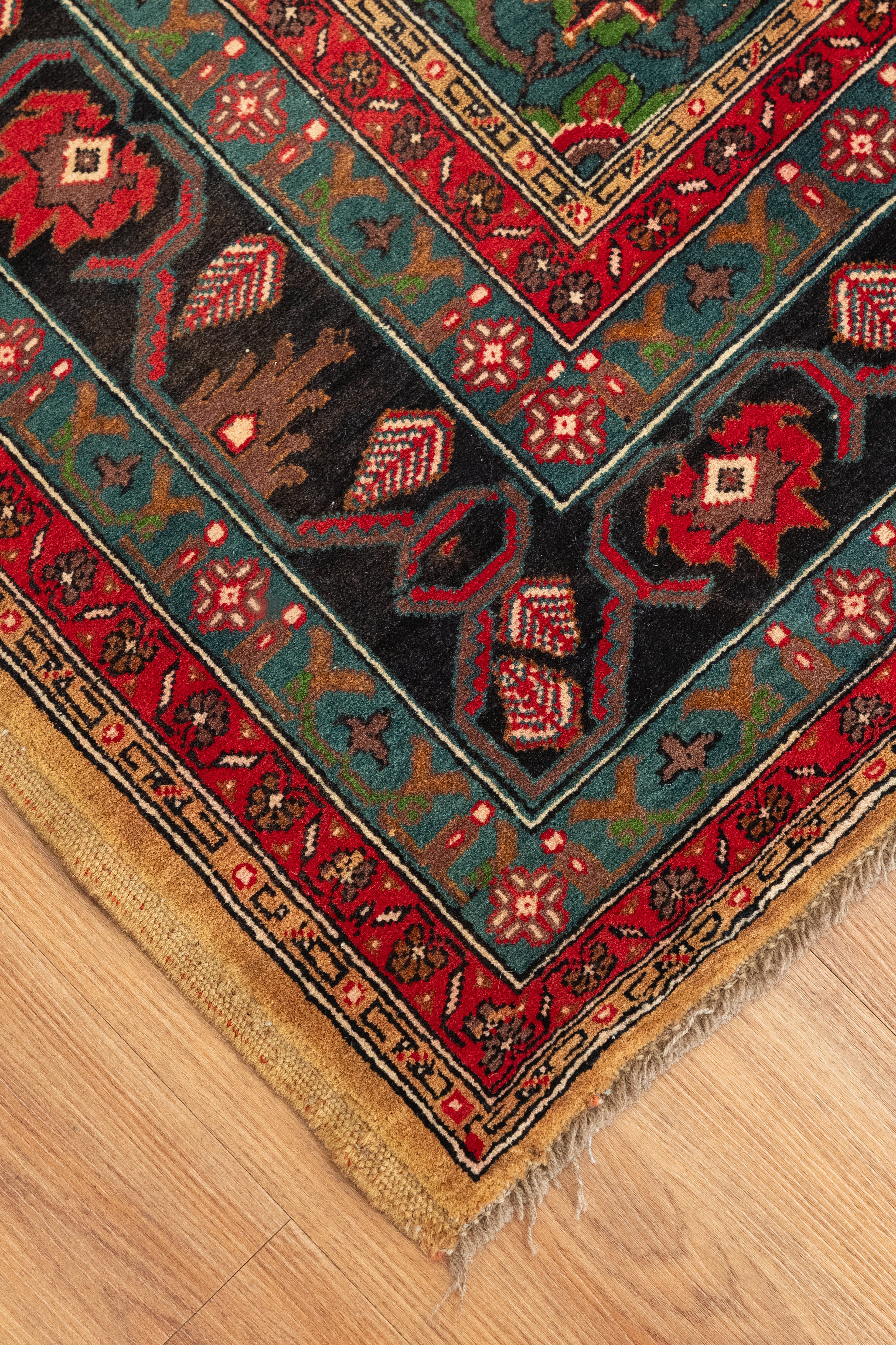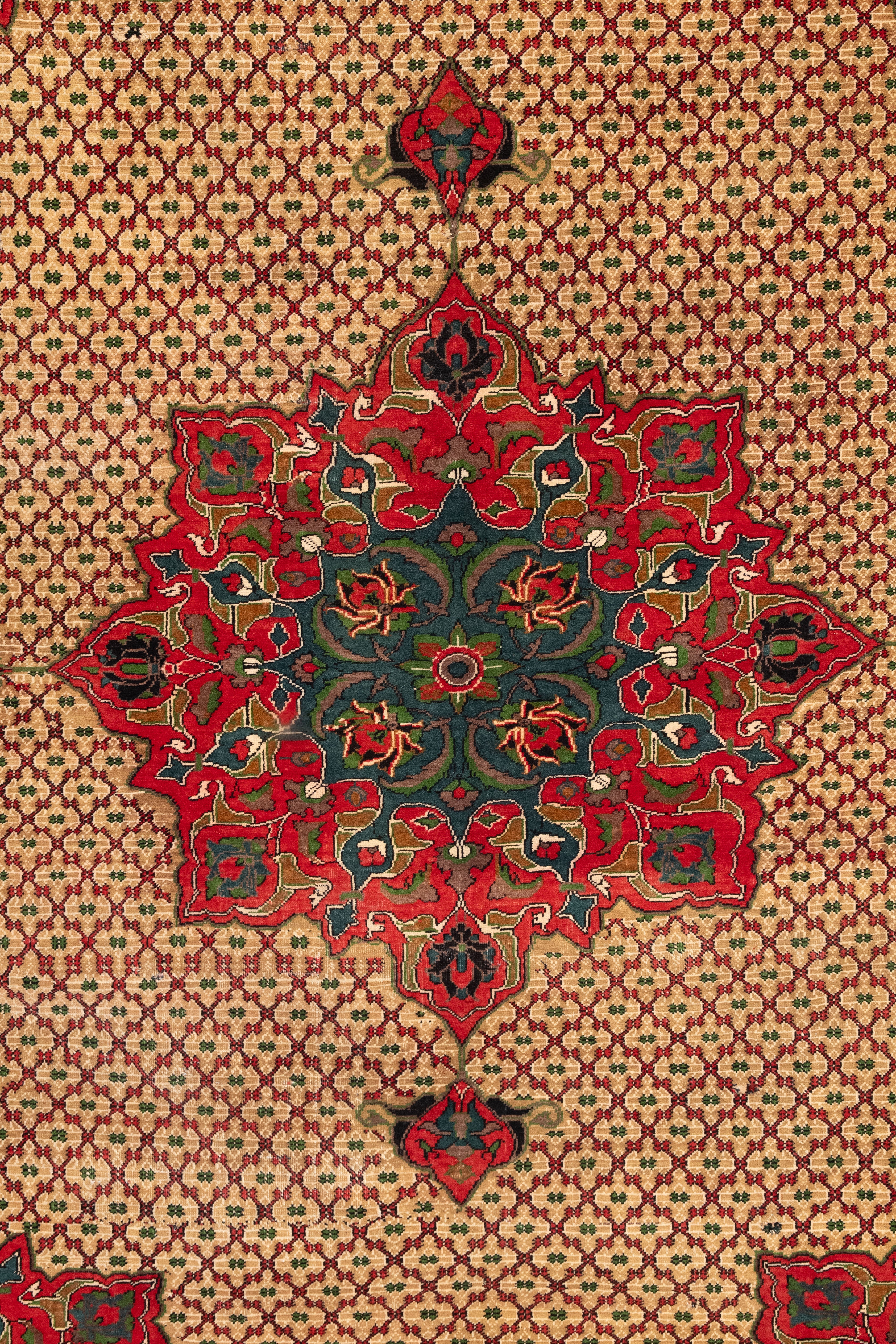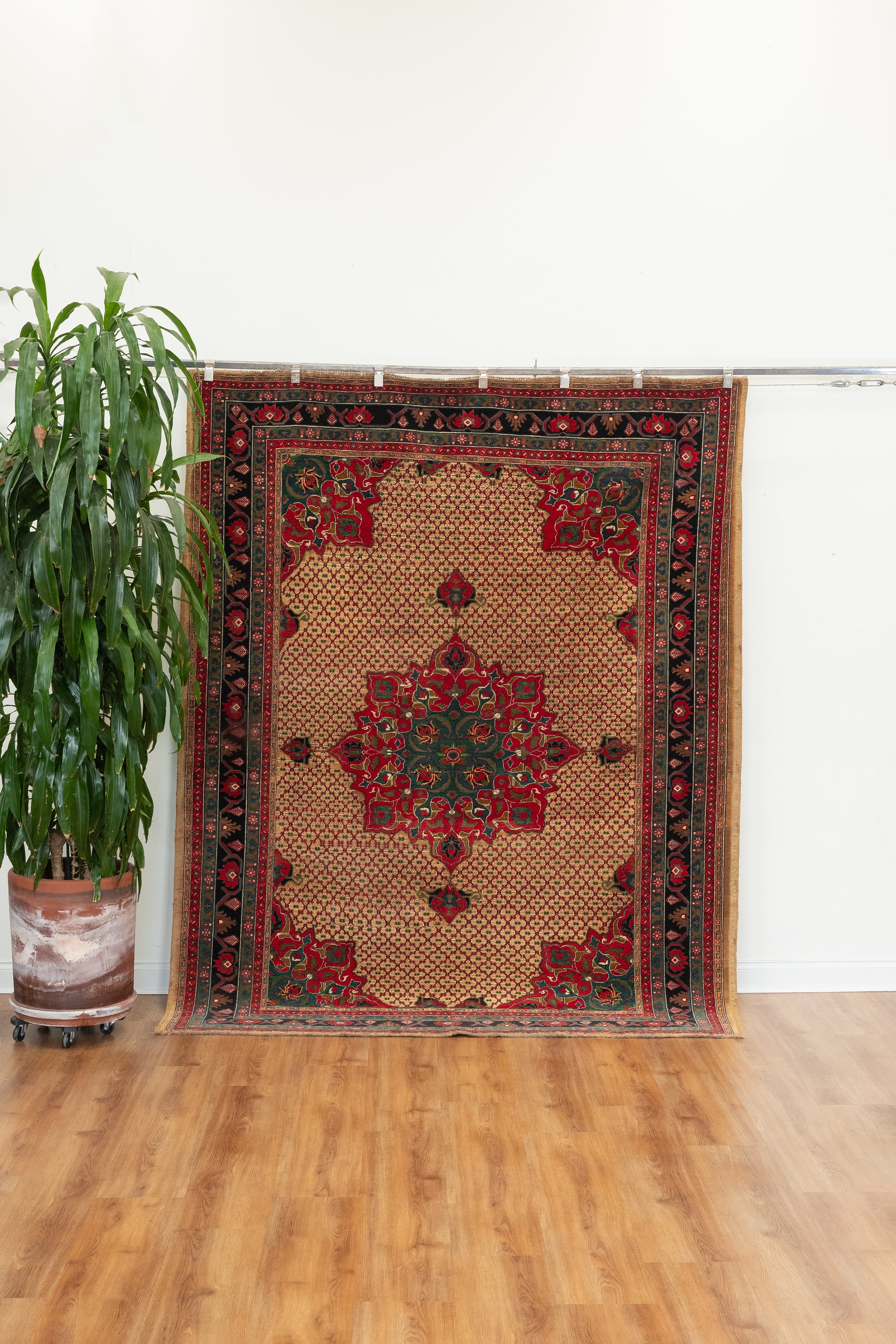 Woven by hand from the finest 100% wool, this one-of-a-kind rug tells a story of time, skill, and tradition. At its heart lies the timeless eight-point medallion, an emblem of balance and harmony. Radiating outward into a field of delicate diamonds that shimmer across a golden ground until they gently meet the four corners, rendering astonishing details that only a densely knotted weave can capture. Once the pattern is complete, the pile is sheared close to the knots, allowing the micro motifs to stand out in crisp relief. This rug is approximately 70 years old and shows beautiful signs of time and a few restorations. Please inspect all photos. Every rug in our collection is authentic, carefully handpicked by Nedim.