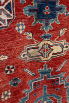 This one-of-a-kind handwoven area rug is made from a cotton foundation and 100% wool. Shirvan rugs originated in the area now part of modern-day Azerbaijan and can vary widely in design and interpretation. This soft, velvety, and high-density rug features delicate amulet motifs and geometric indigo blue floral motifs that repeat in formation. The ground is a bright tomato-red that varies in saturation depending on the lighting. All of our rugs are authentic and handpicked by Nedim himself.