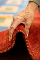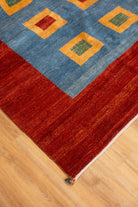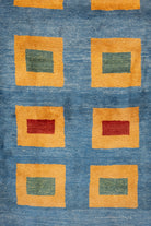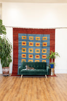 This one-of-a-kind area rug has a cotton foundation and 100% wool pile. Gabbeh rugs feature a tall pile, dense knotting, and a soft plush feel. The tribal square panel motifs are woven predominantly in marigold-orange and green colors. These rugs are hardy and long-lasting. All of our rugs are authentic and handpicked by Nedim himself.