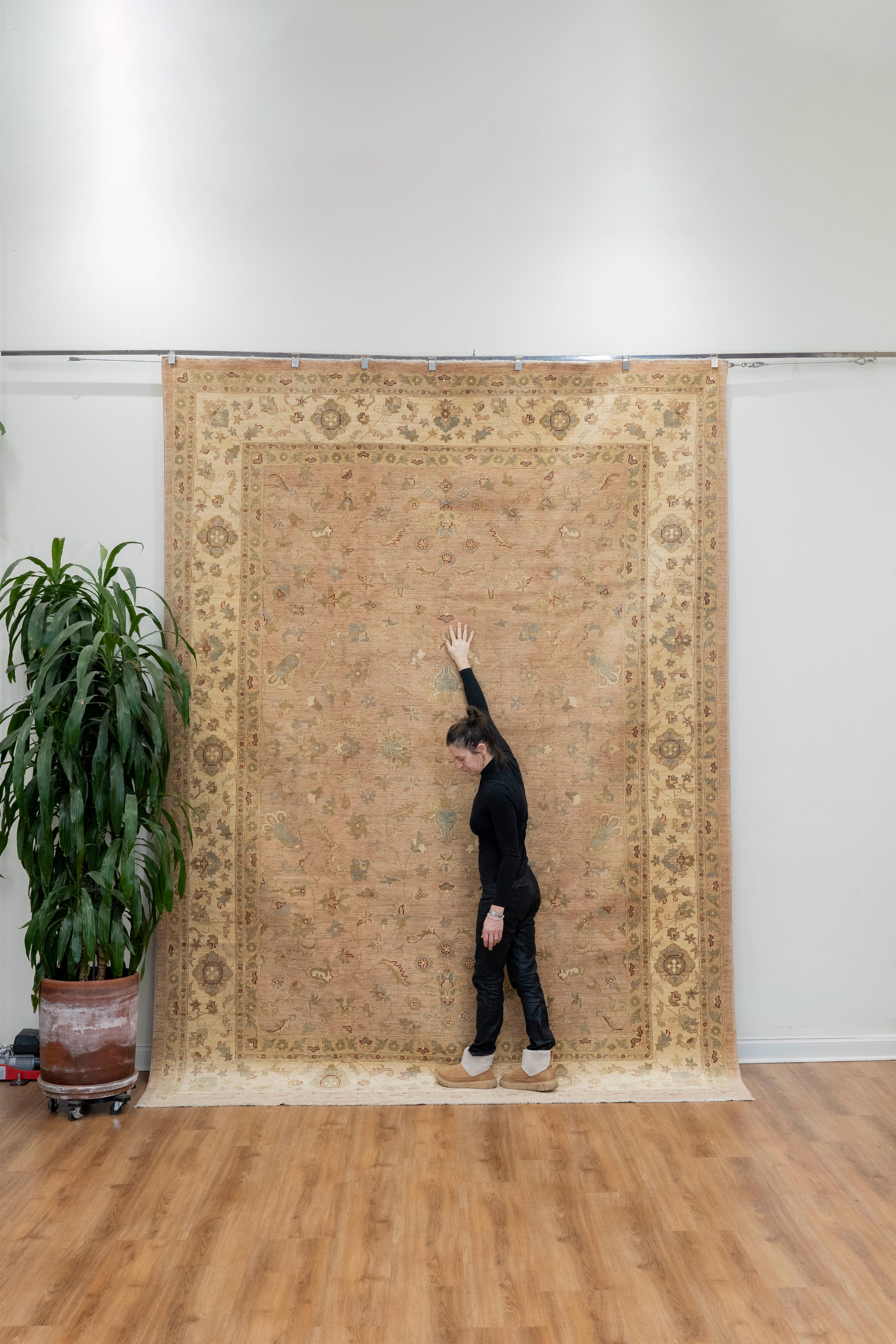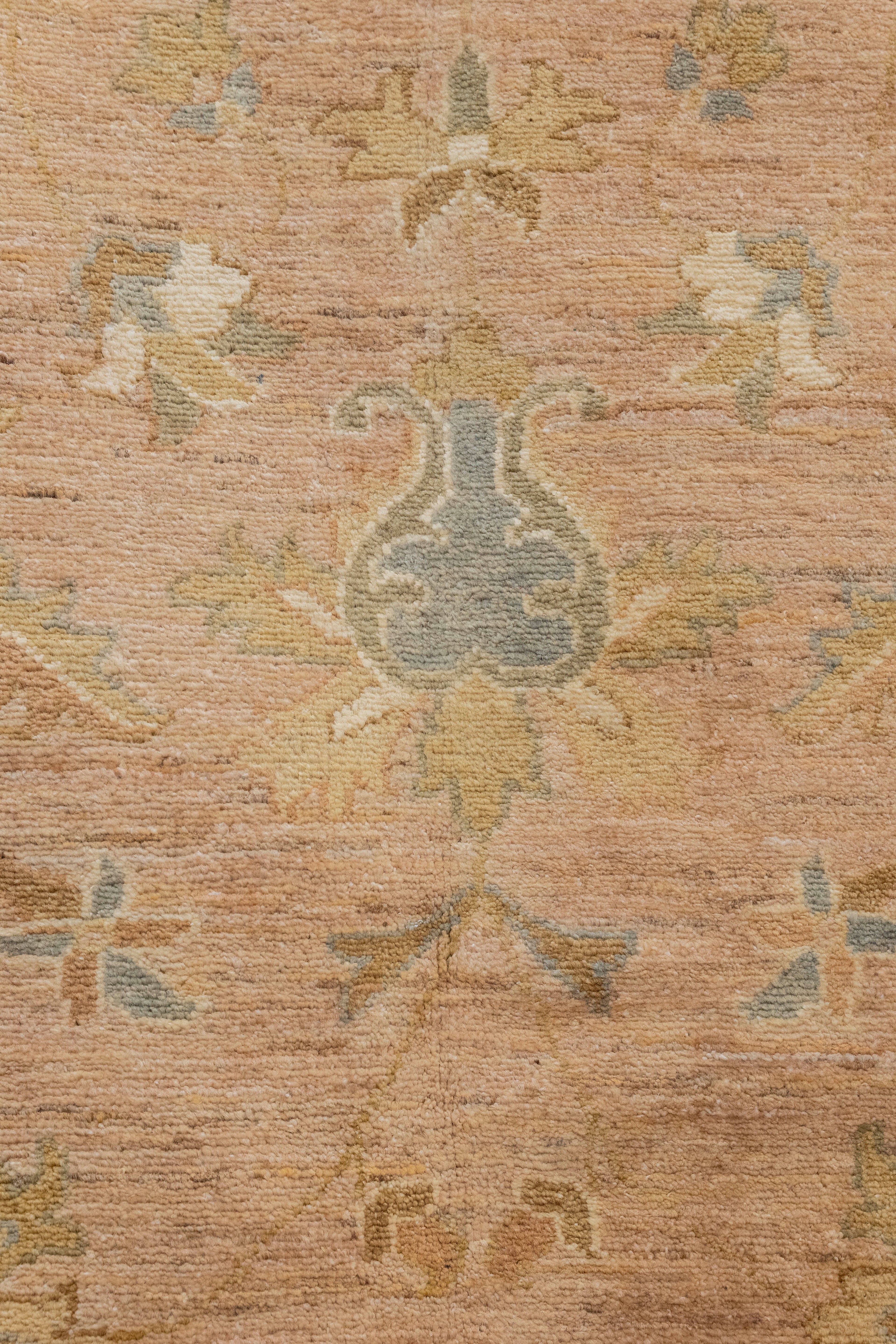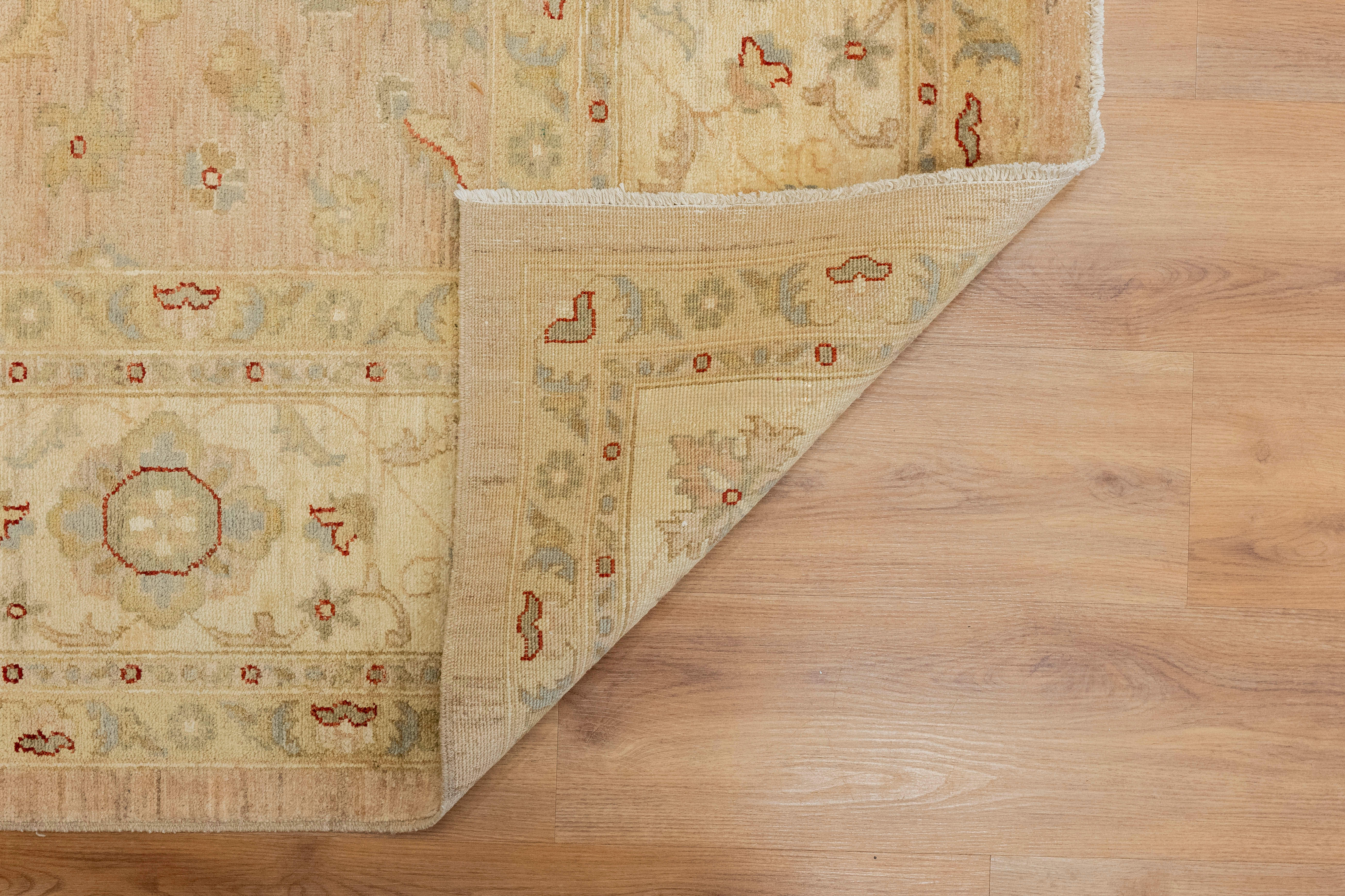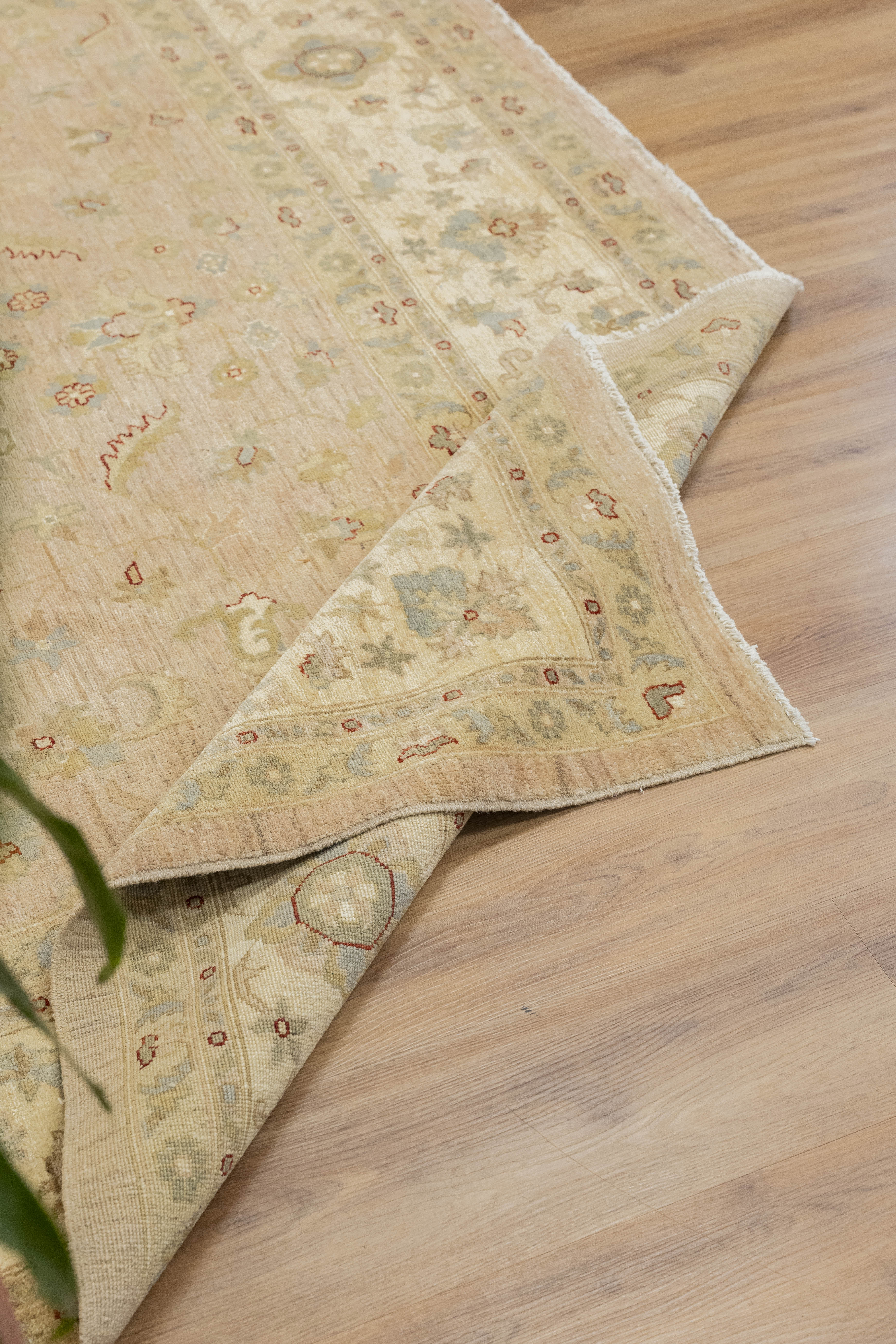 This unique rug, made from a cotton foundation and 100% premium wool pile, is crafted by Oushak ( it is spelled both ways! ) weavers, famed for their silky, luminous material. About 20 years old, it features a floral center motif woven on a peach ground. This rug features clean edges, ideal for lovers of the movie Wicked and those who adore the combo of pinks and greens! Each rug is authentic and handpicked by Nedim himself.