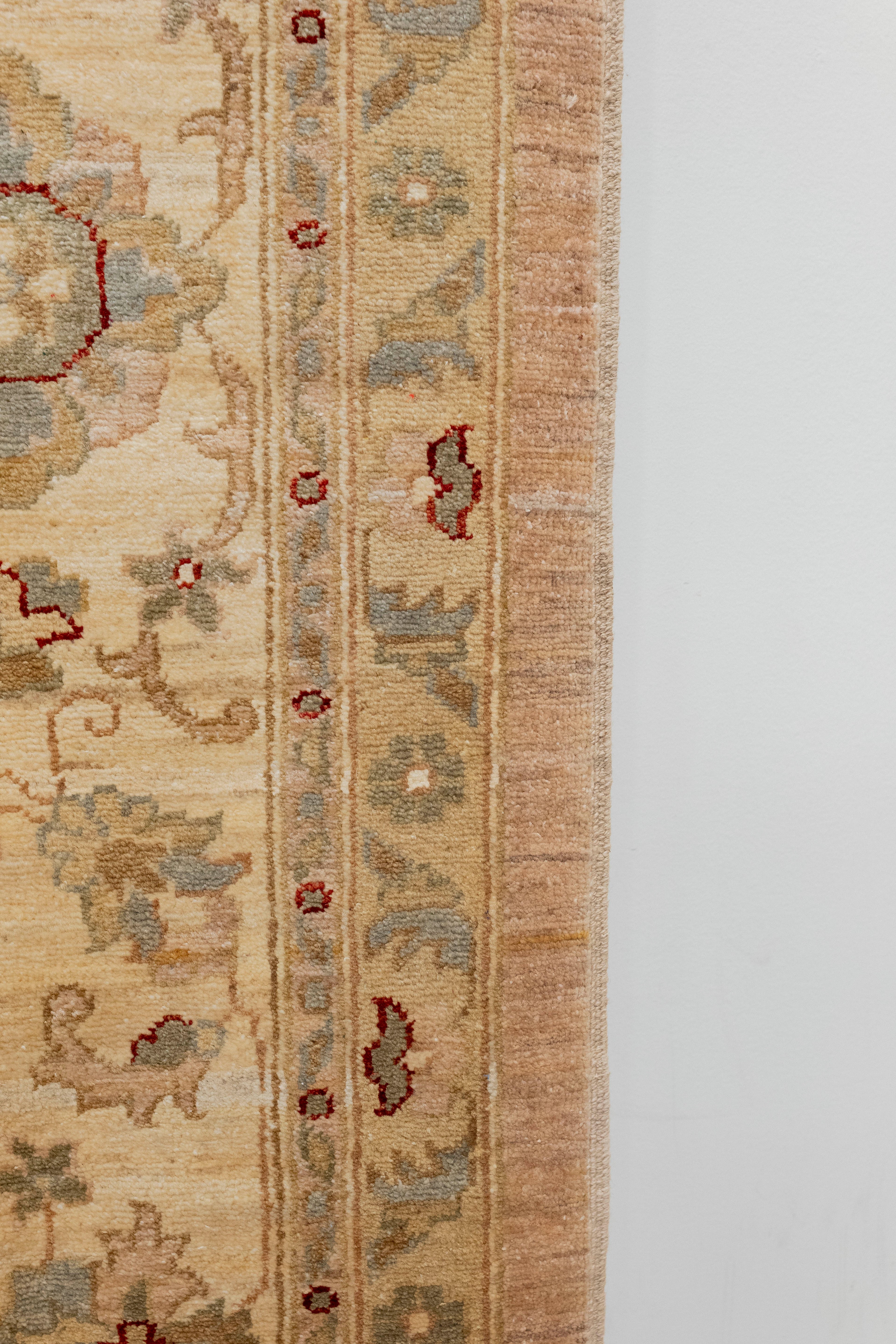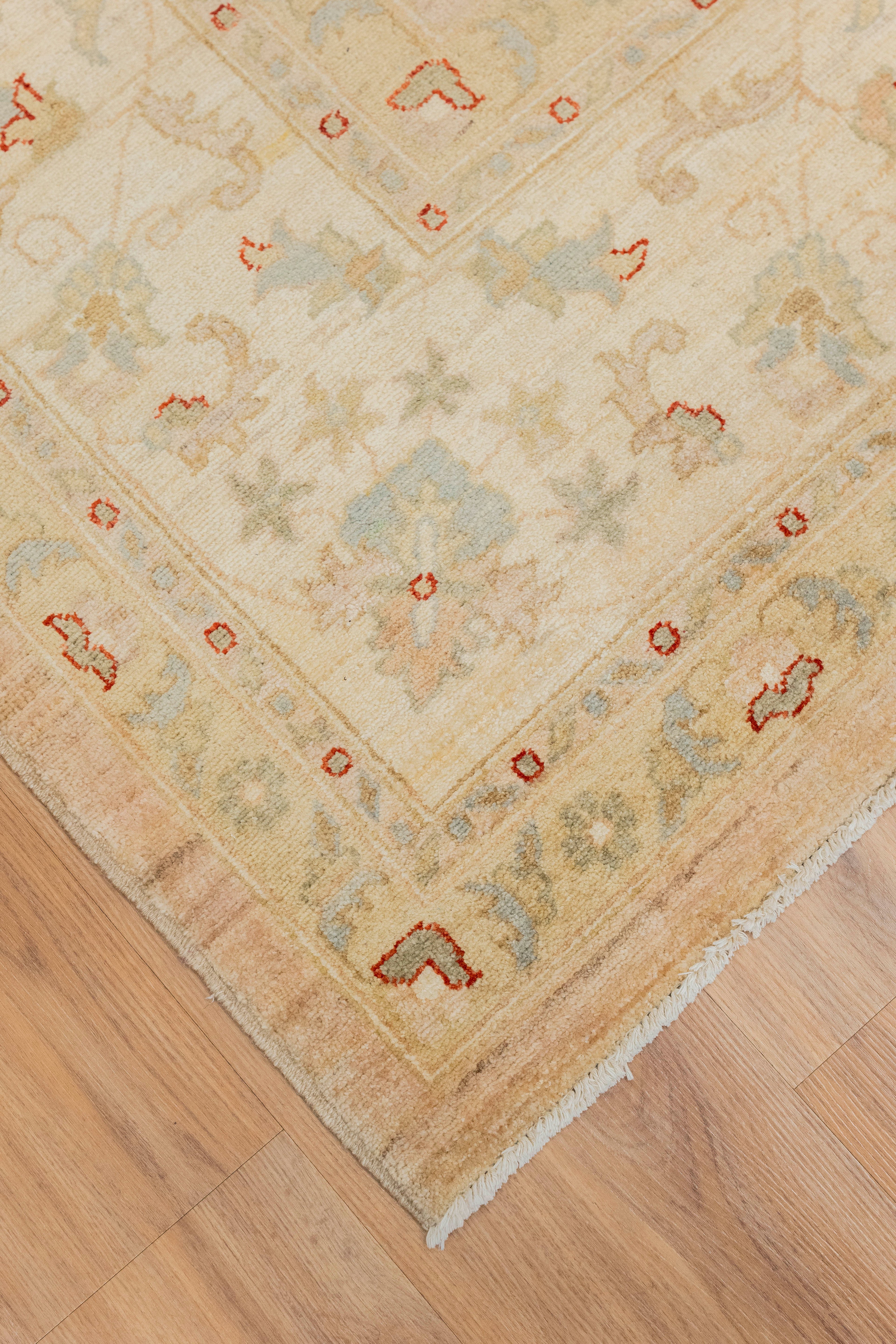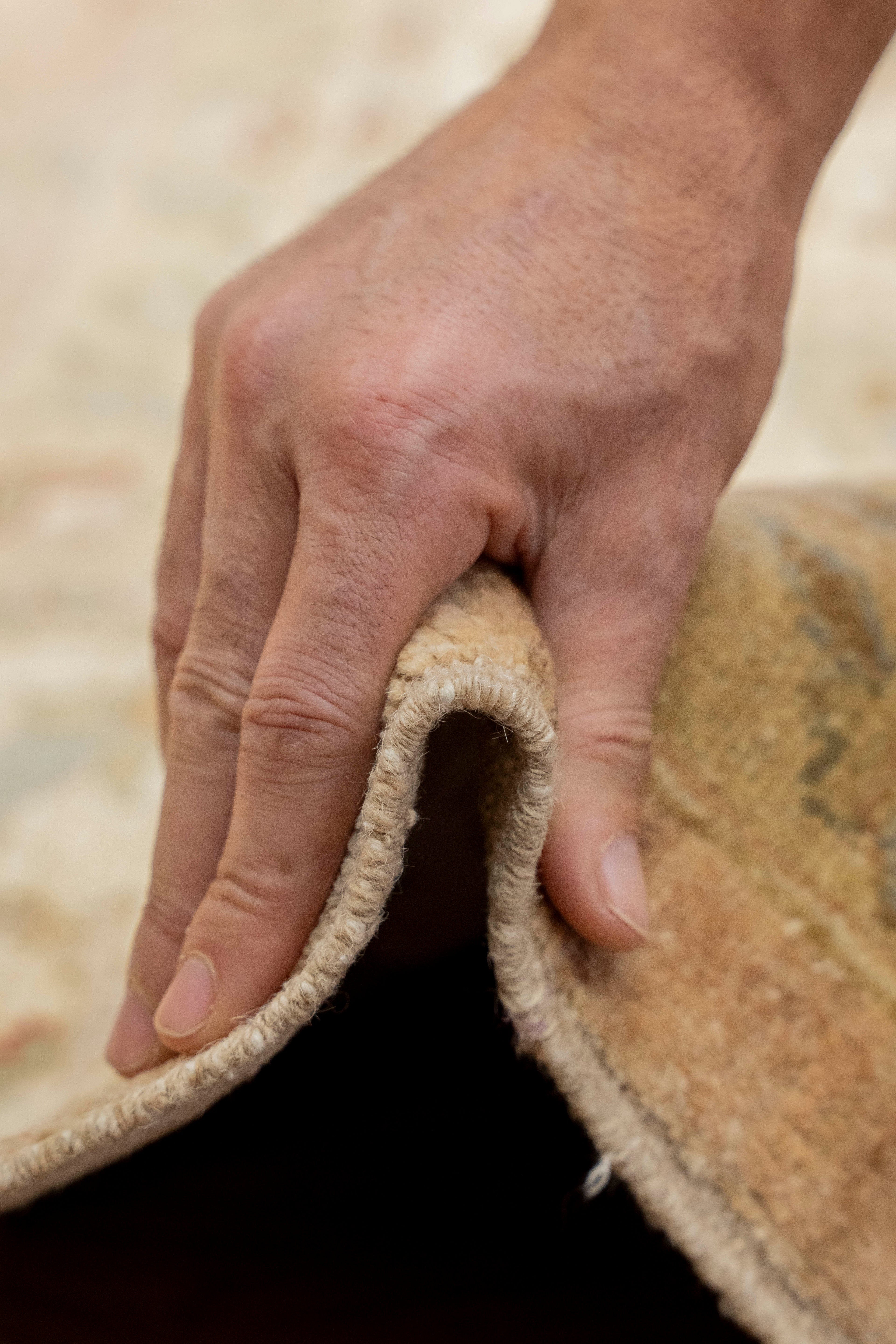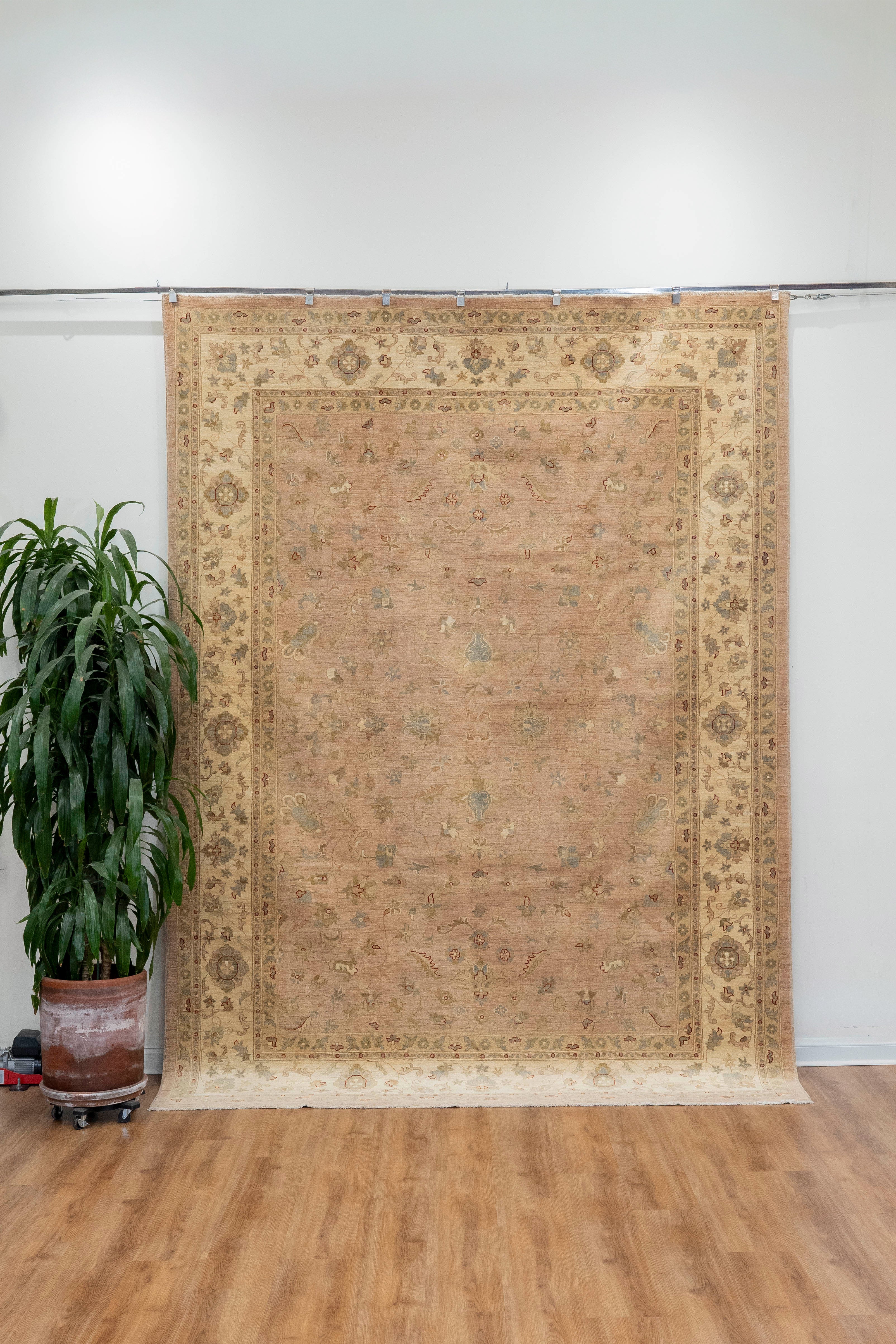This unique rug, made from a cotton foundation and 100% premium wool pile, is crafted by Oushak ( it is spelled both ways! ) weavers, famed for their silky, luminous material. About 20 years old, it features a floral center motif woven on a peach ground. This rug features clean edges, ideal for lovers of the movie Wicked and those who adore the combo of pinks and greens! Each rug is authentic and handpicked by Nedim himself.