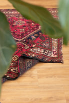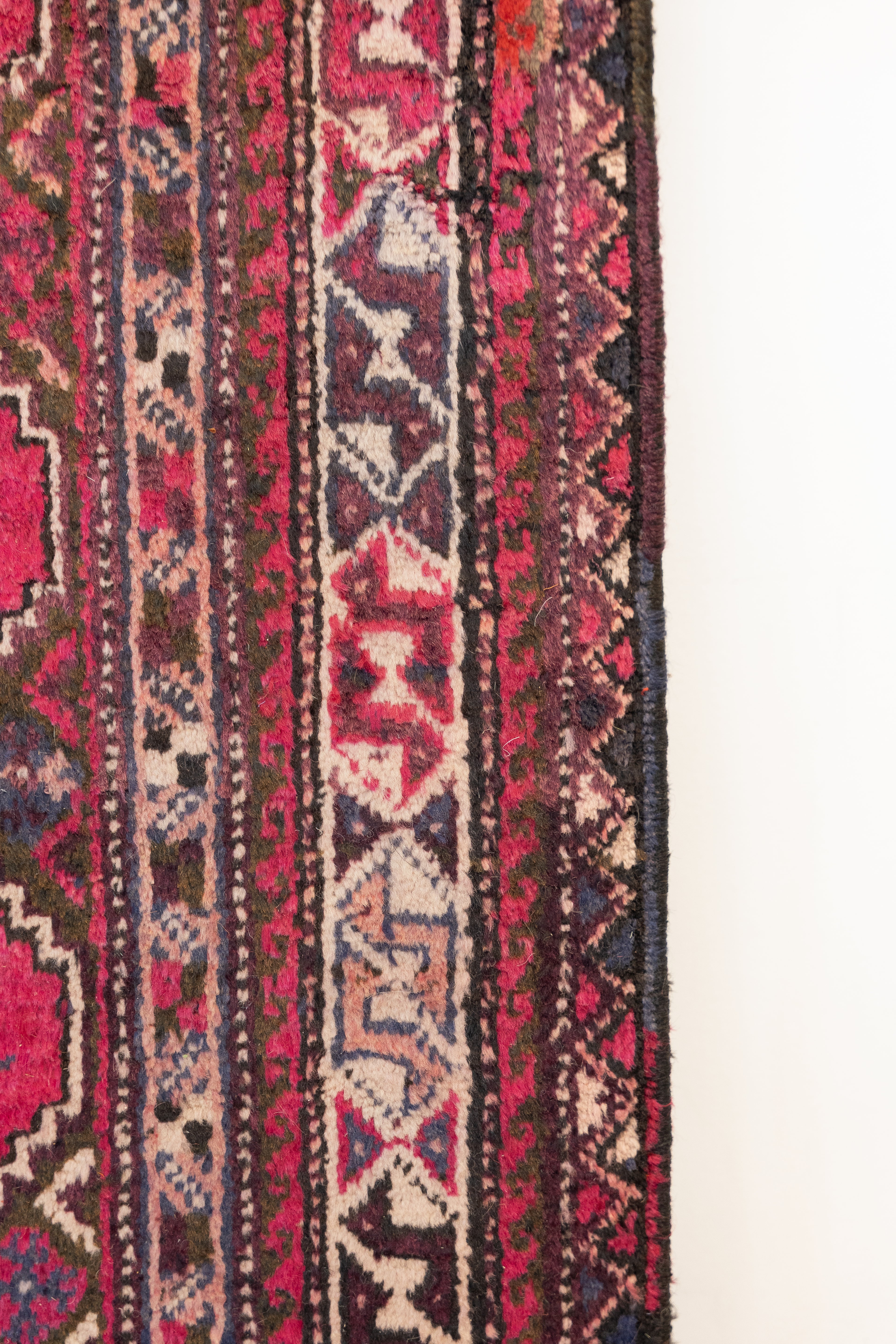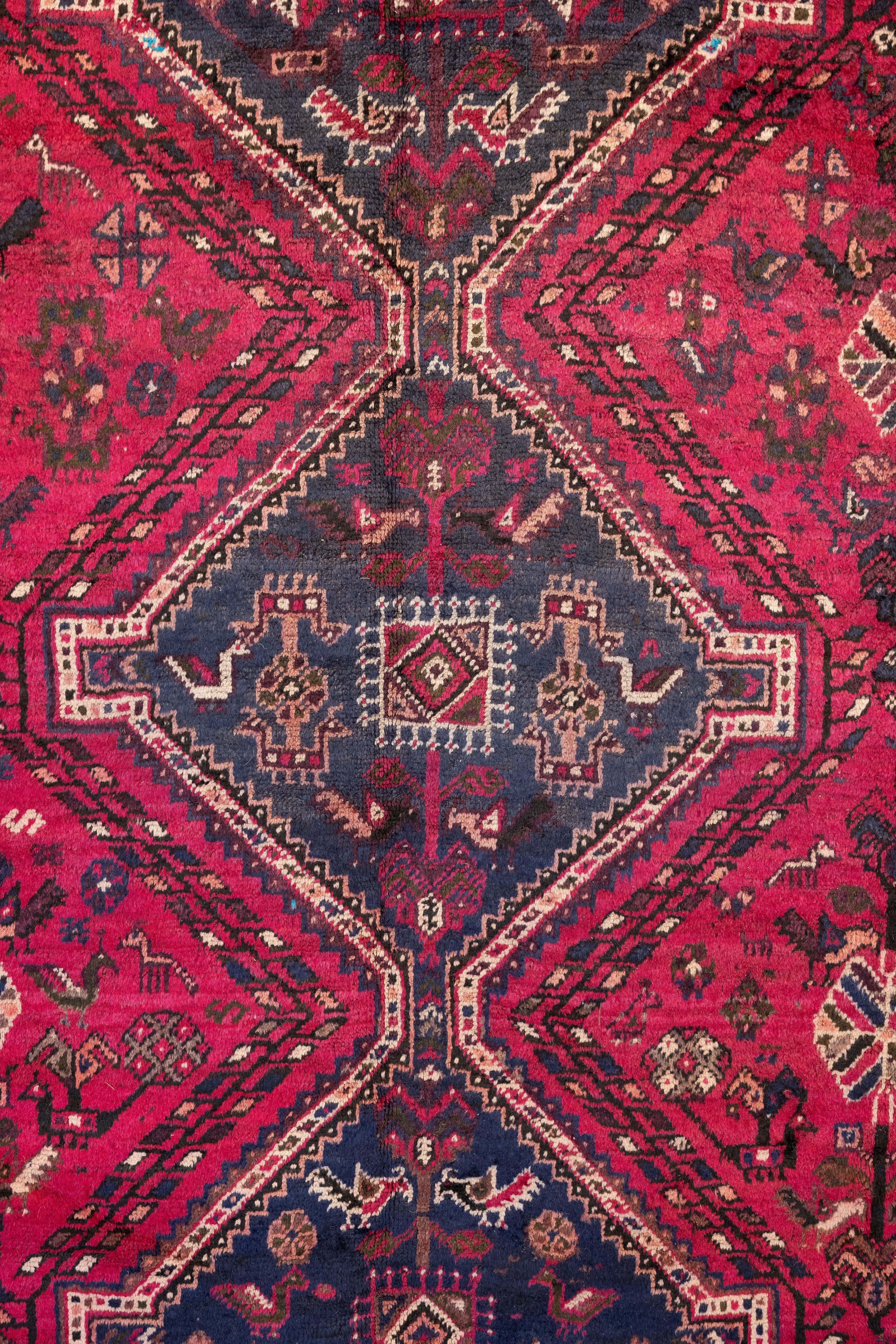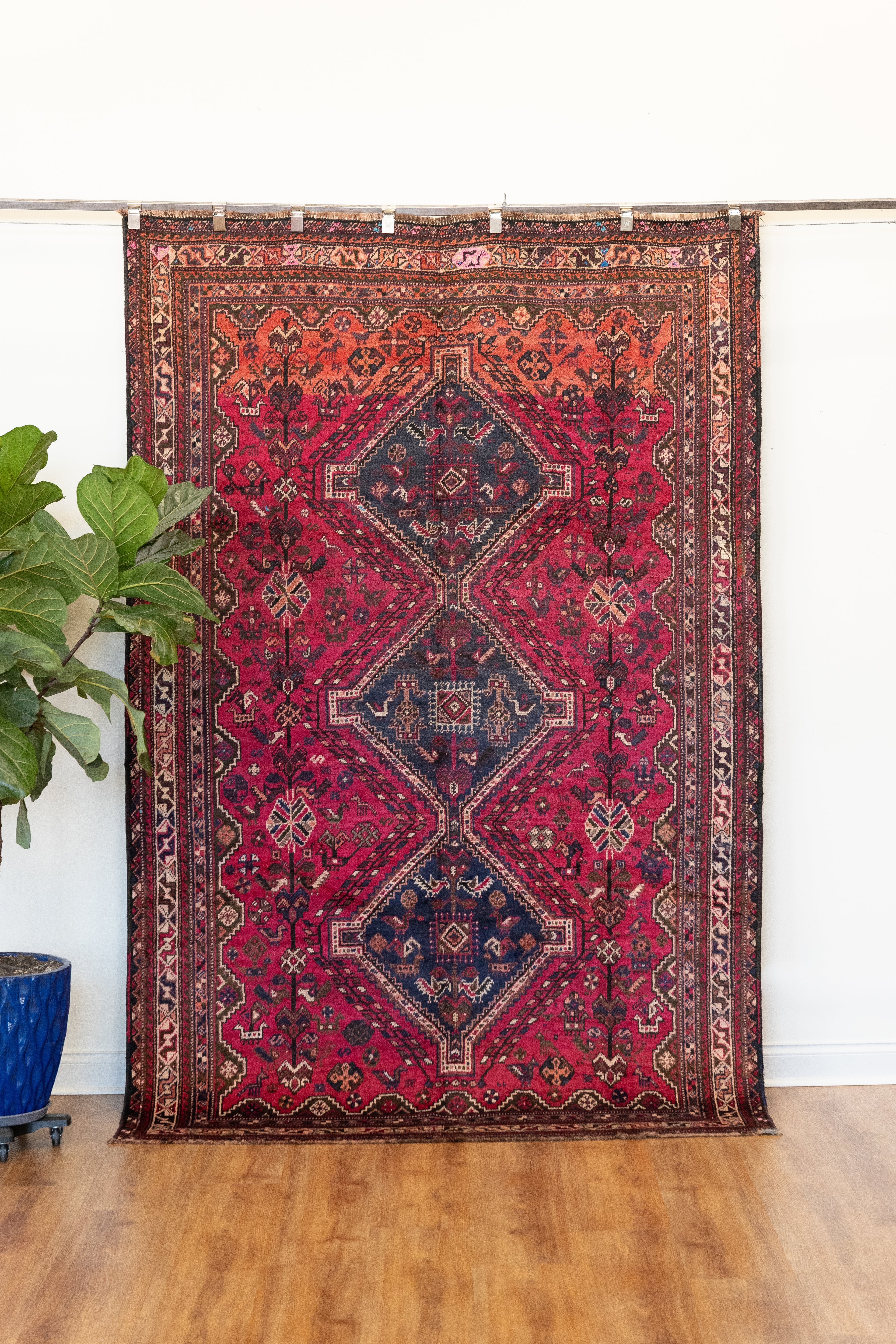 This one-of-a-kind rug is handwoven from 100% sheep’s wool. Traditionally, these rugs feature one to three rhombic geometric patterns in the field. However, the weavers often improvise, deviating from their family’s inherited designs to include occasional unique figures — most often birds, animals, or trees — reflecting the natural surroundings of nomadic camp life. The field in this rug is a dark magenta red with lots of undertone of pink. Each rug in our collection is authentic and personally handpicked by Nedim himself.