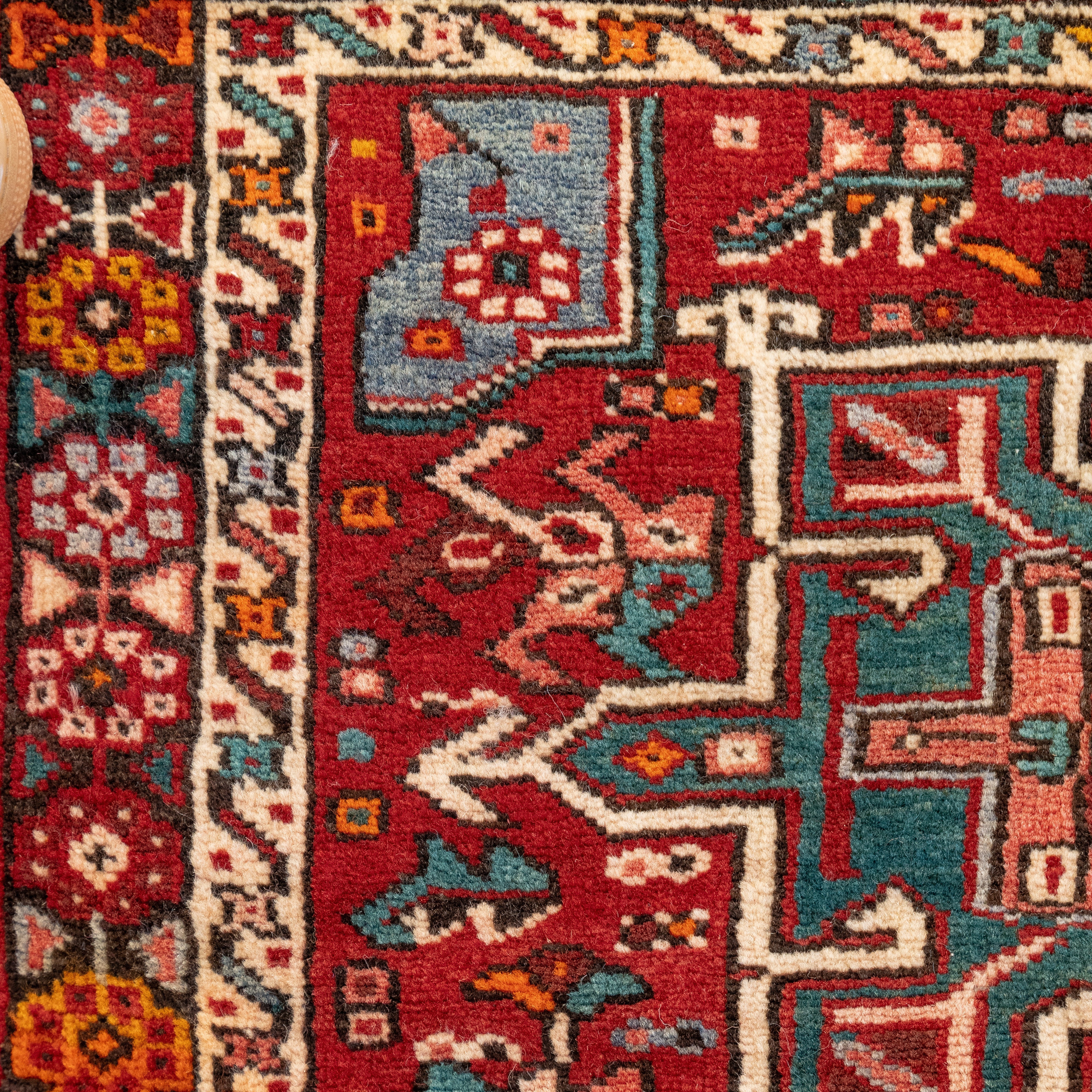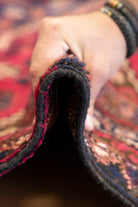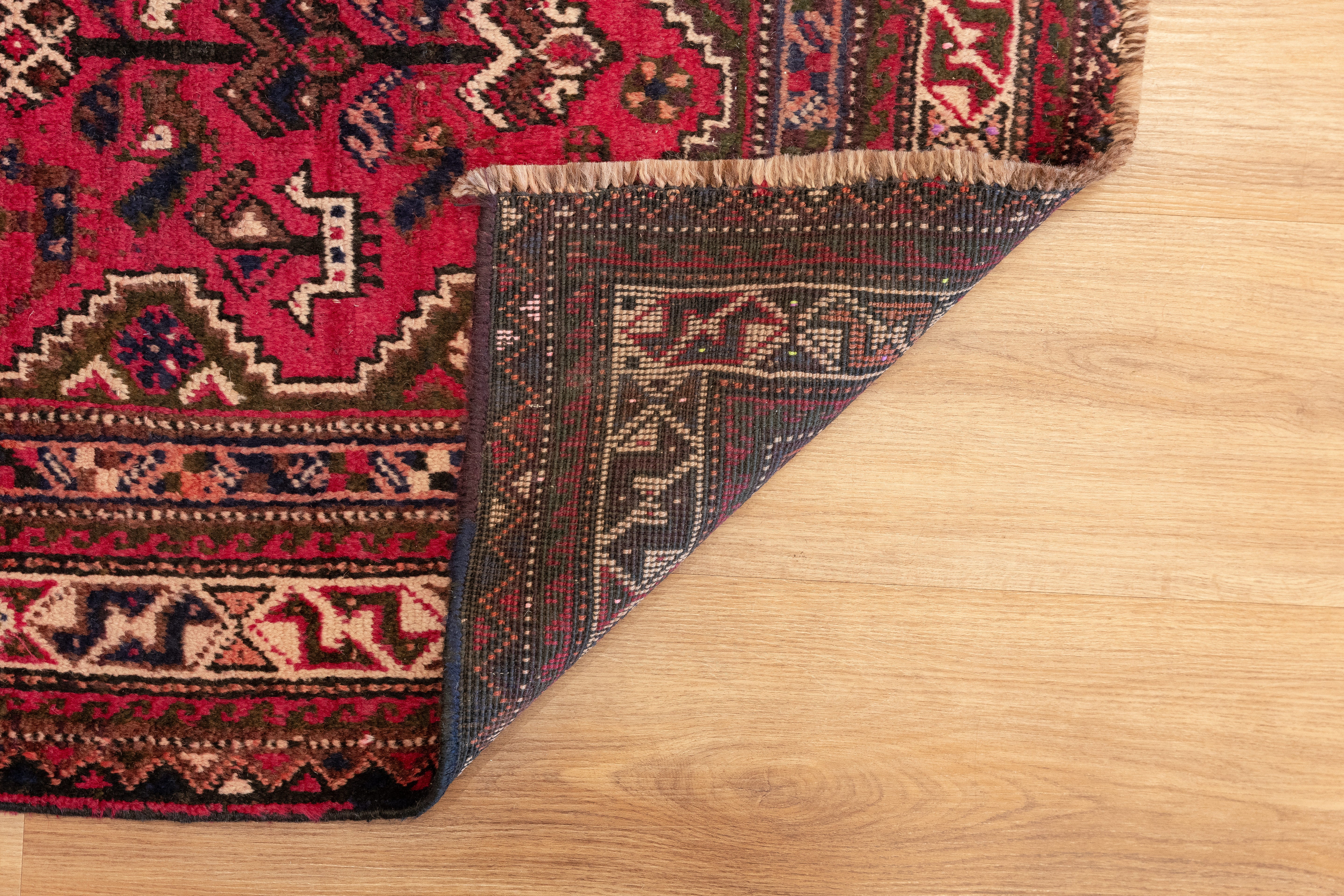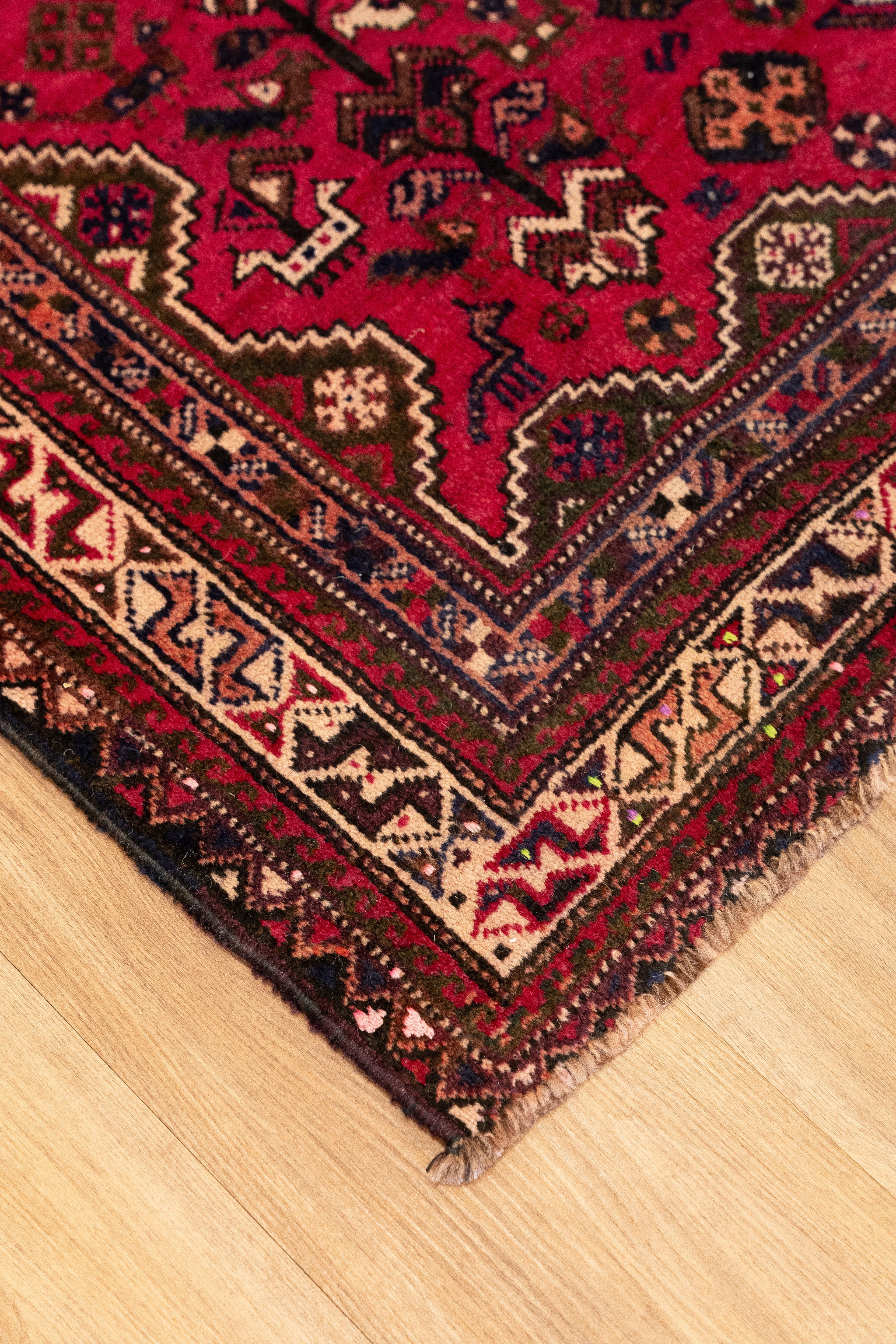 This one-of-a-kind rug is handwoven from 100% sheep’s wool. Traditionally, these rugs feature one to three rhombic geometric patterns in the field. However, the weavers often improvise, deviating from their family’s inherited designs to include occasional unique figures — most often birds, animals, or trees — reflecting the natural surroundings of nomadic camp life. The field in this rug is a dark magenta red with lots of undertone of pink. Each rug in our collection is authentic and personally handpicked by Nedim himself.