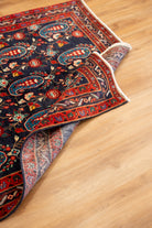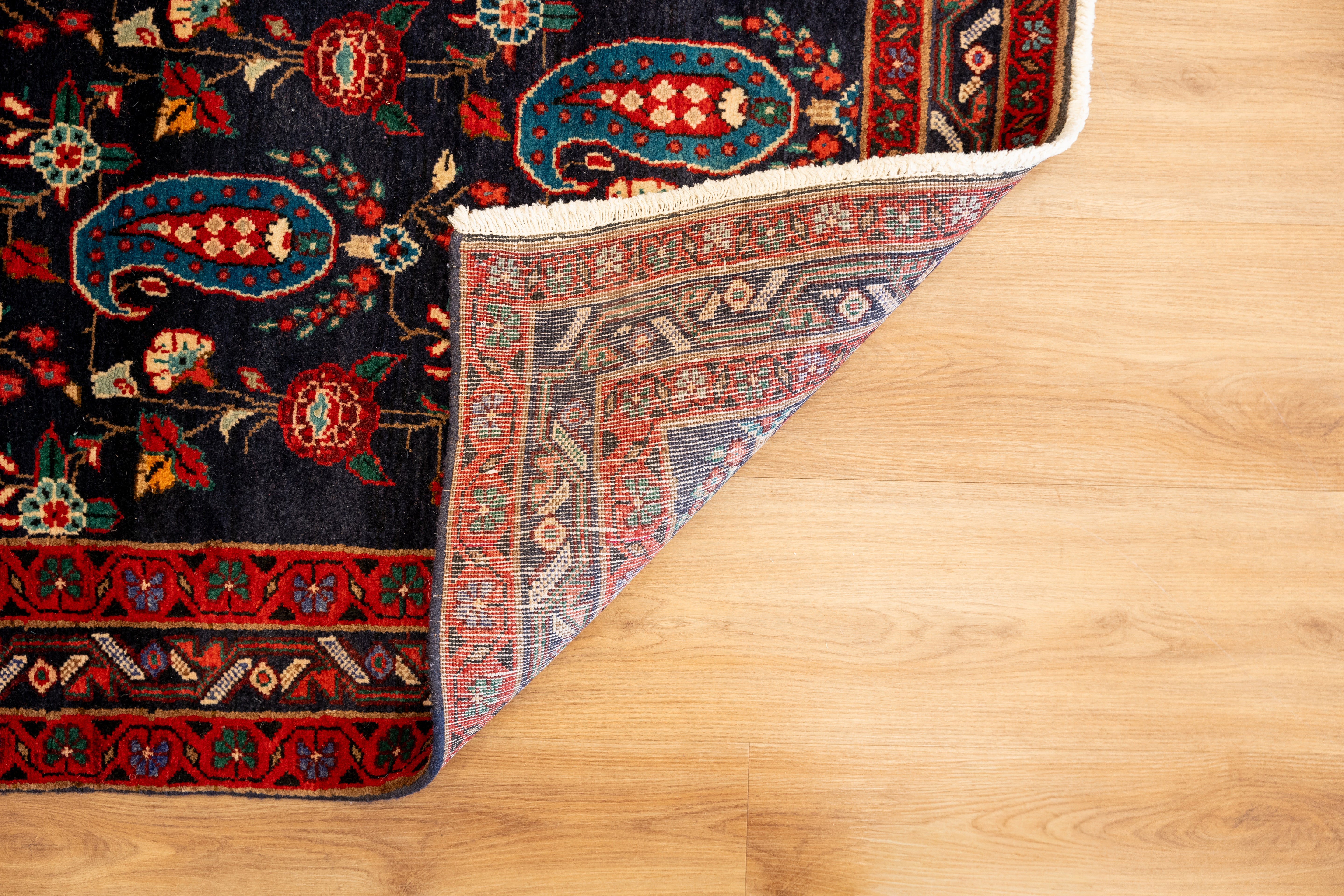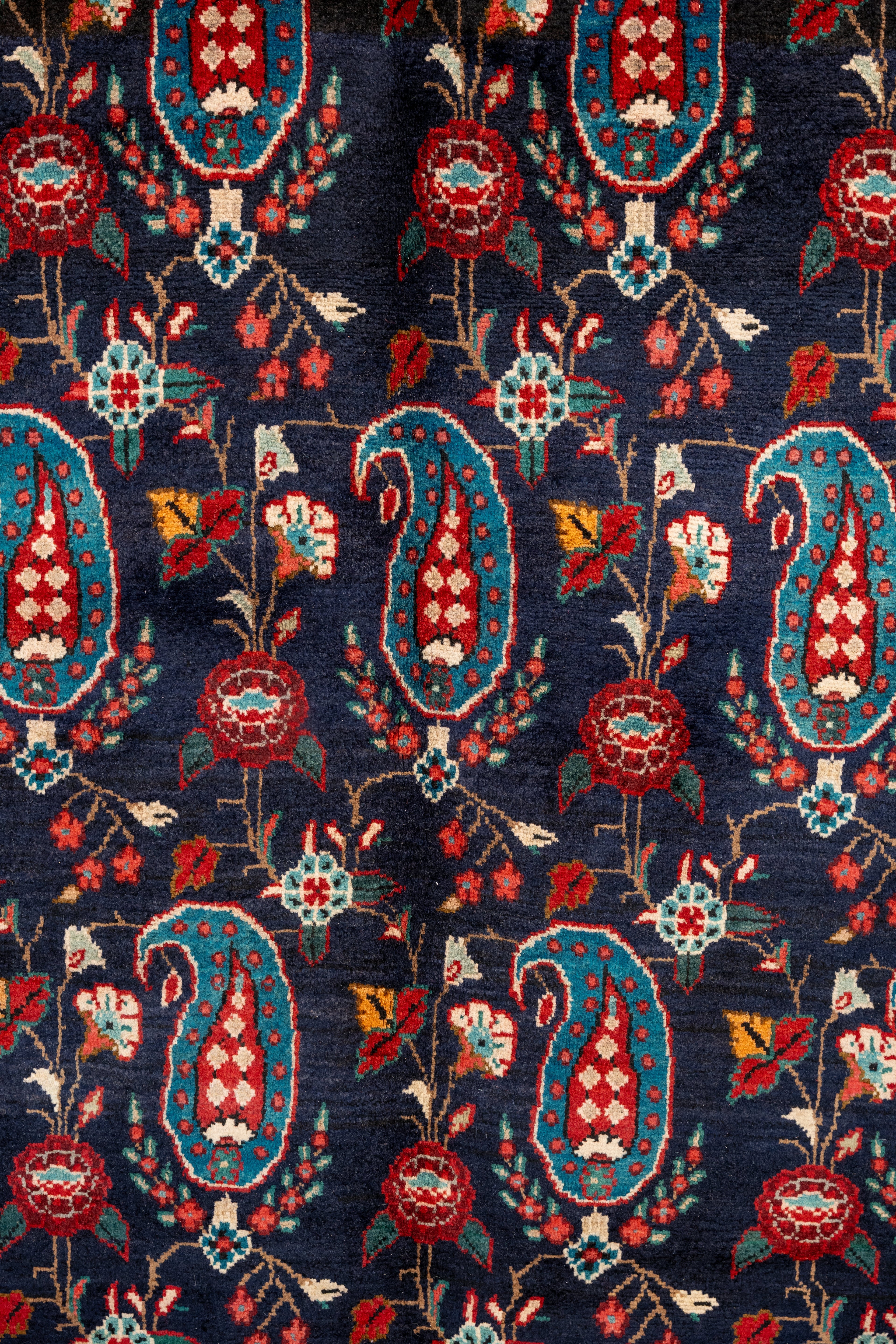 This one-of-a-kind hand-knotted area rug is made from 100% wool pile and a cotton foundation. These colorful rugs with enlarged paisley motifs are traditionally from the Ankara region of Turkey. This rug is woven on a dark blue - almost midnight - ground. All of our rugs are authentic and carefully handpicked by Nedim.