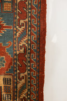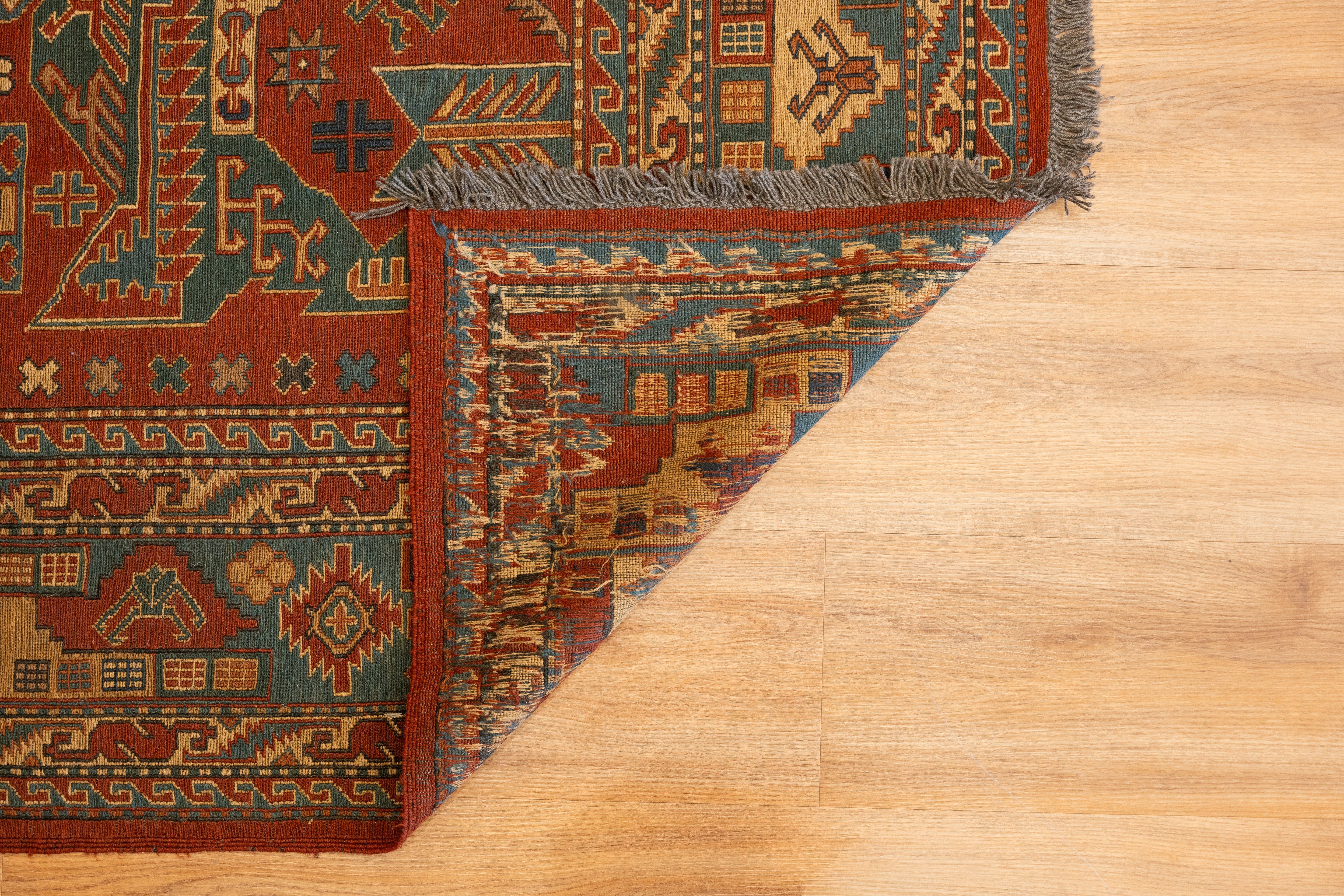 This one-of-a-kind Sumak rug (also spelled Soumak) features a wool construction. These rugs are flat-weave but thicker than Kilims, strong, and exceptionally durable. Unlike Kilims, Sumak rugs are not reversible because non-clipped yarns are left on the back. The unique arrangement of jewel colors in this rug gives it an overall copper tone. Each one of our rugs is authentic and handpicked by Nedim himself.