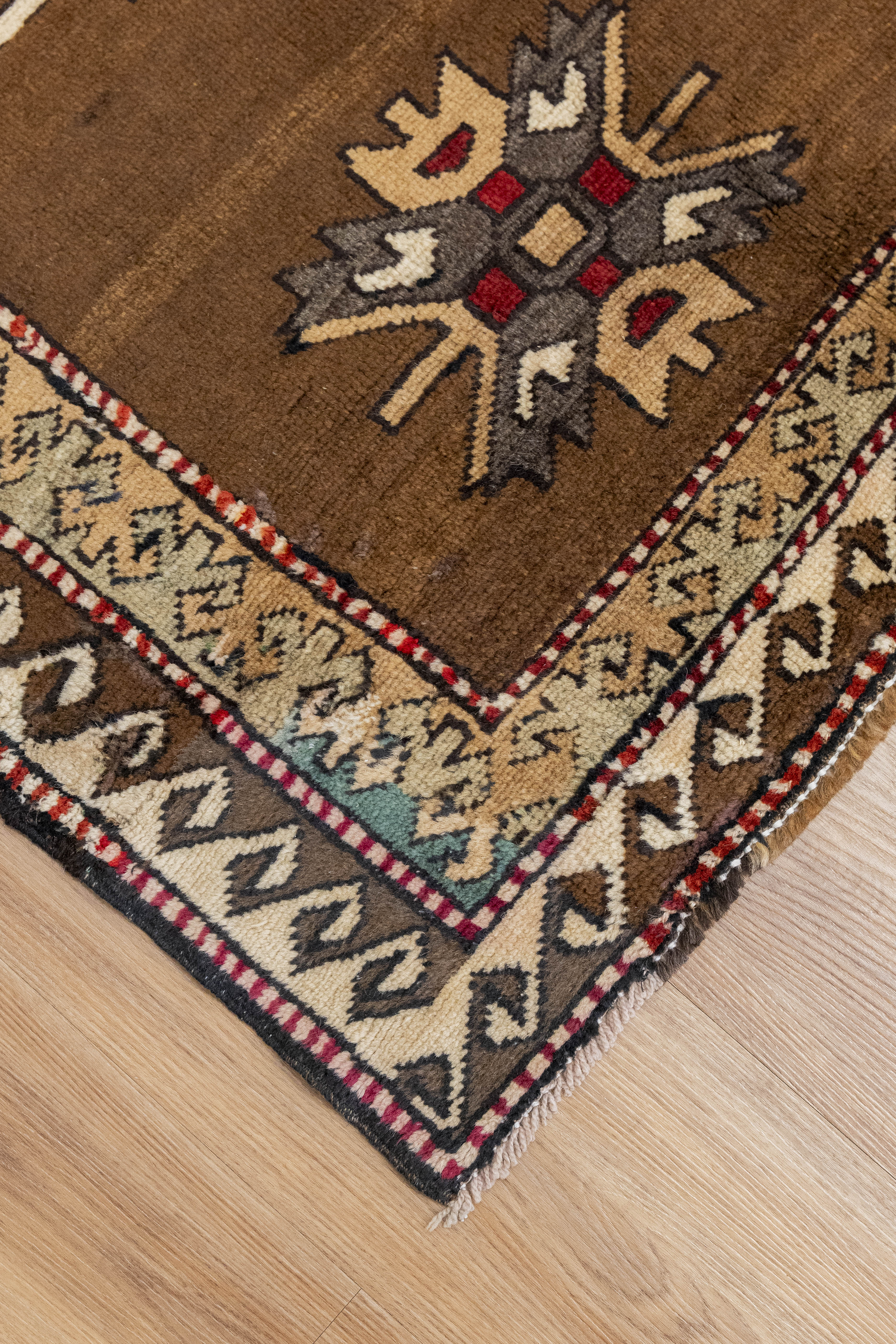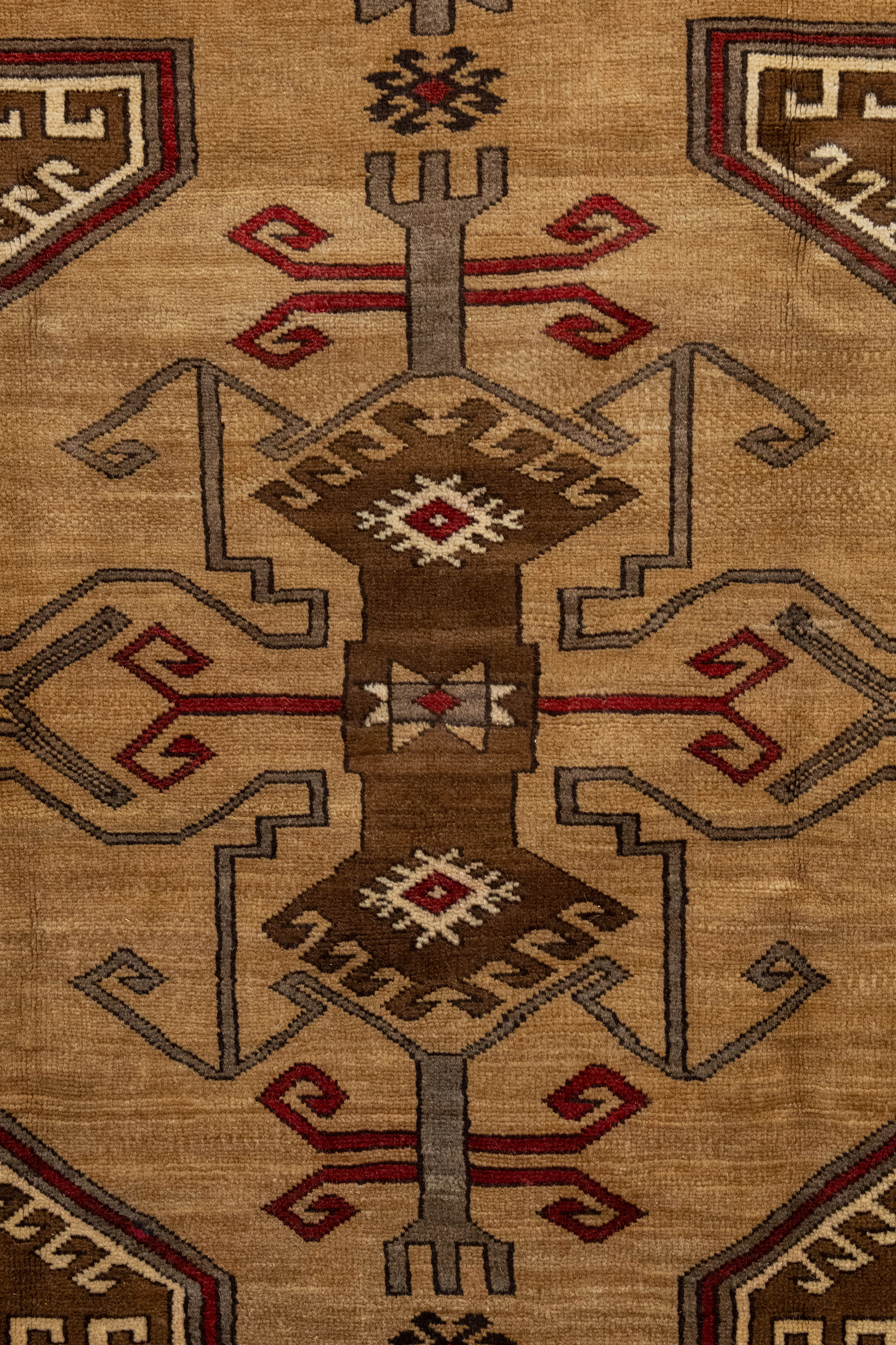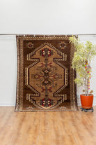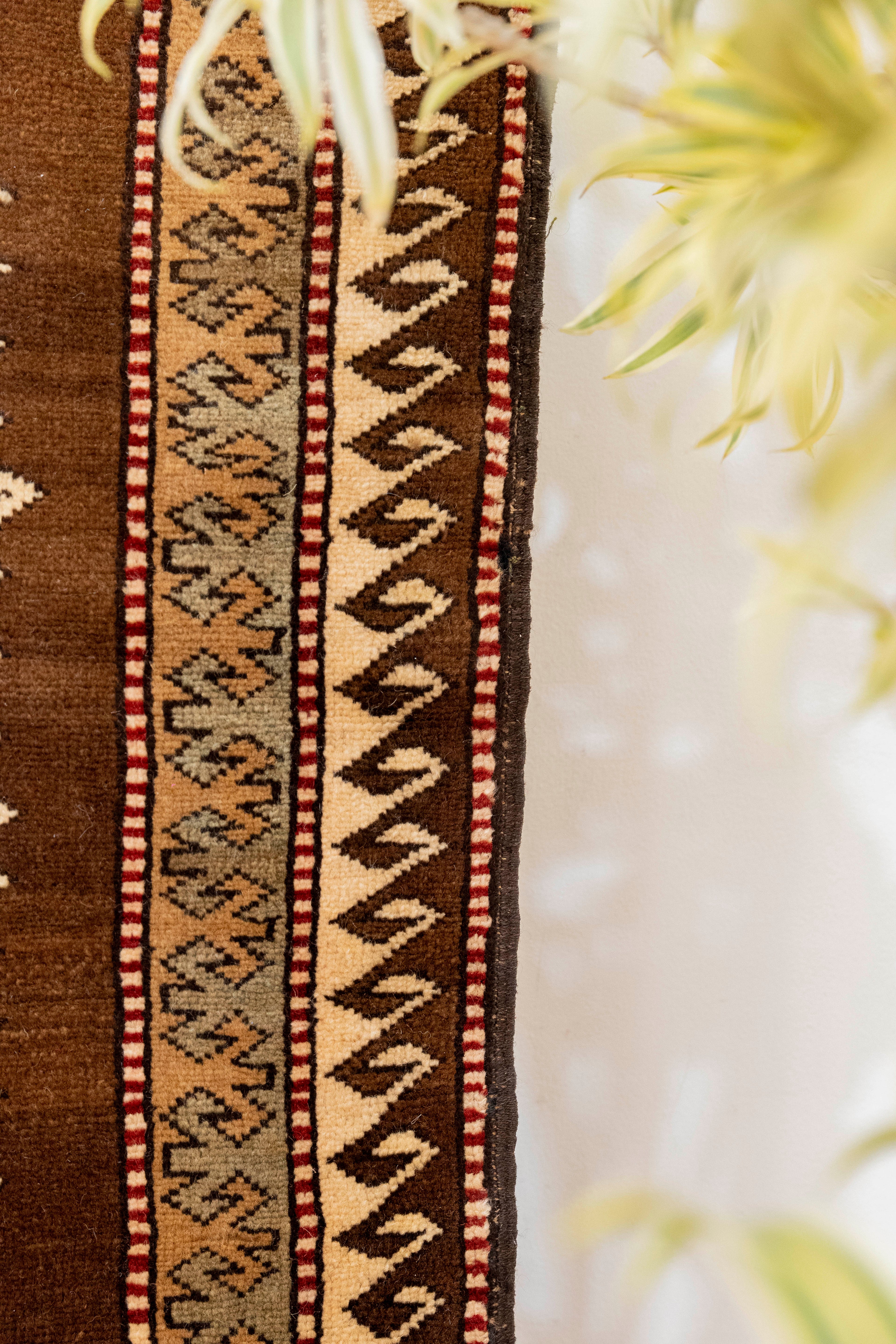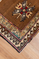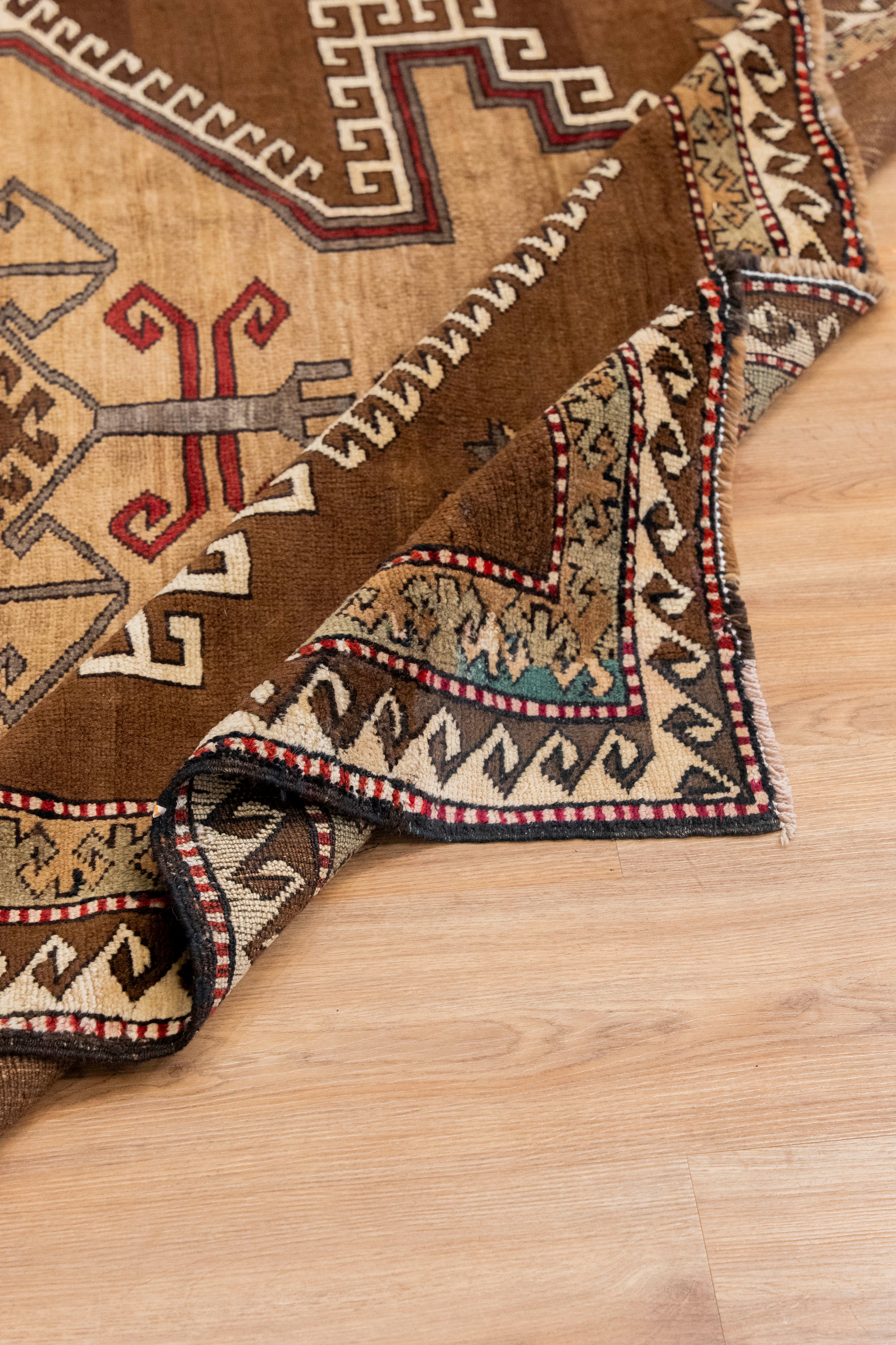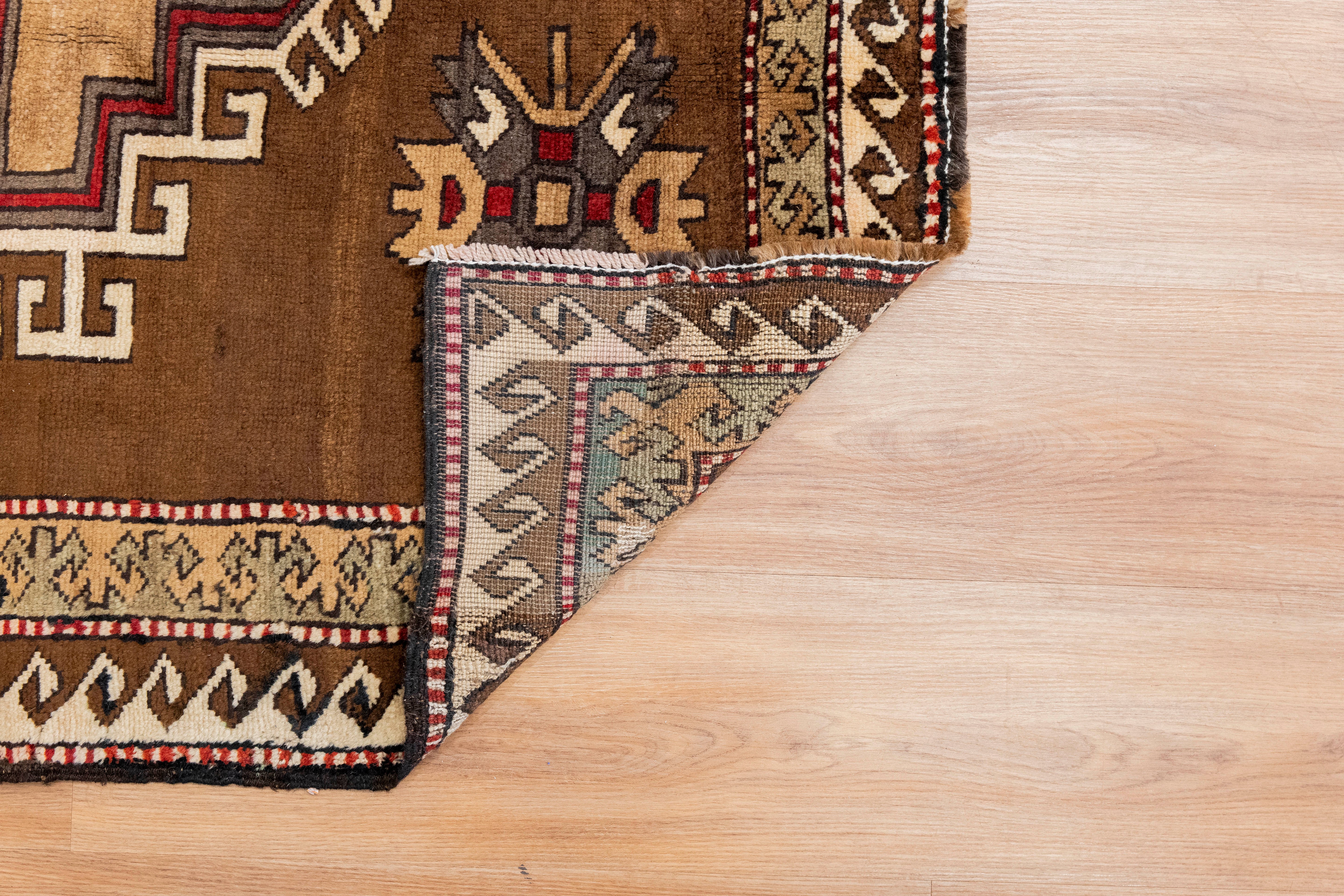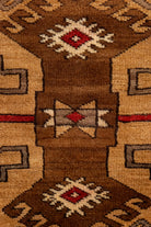 This one-of-a-kind vintage Kurdish tribal rug is crafted on a cotton foundation and woven with 100% wool pile. It features an evil eye in the center of the rug as well as an eight-point star, which symbolizes spirituality and good luck. This beautiful tribal pattern has shades of brown and is very soft to the touch. All of our rugs are authentic and handpicked by Nedim himself.