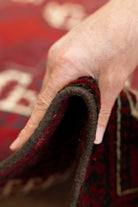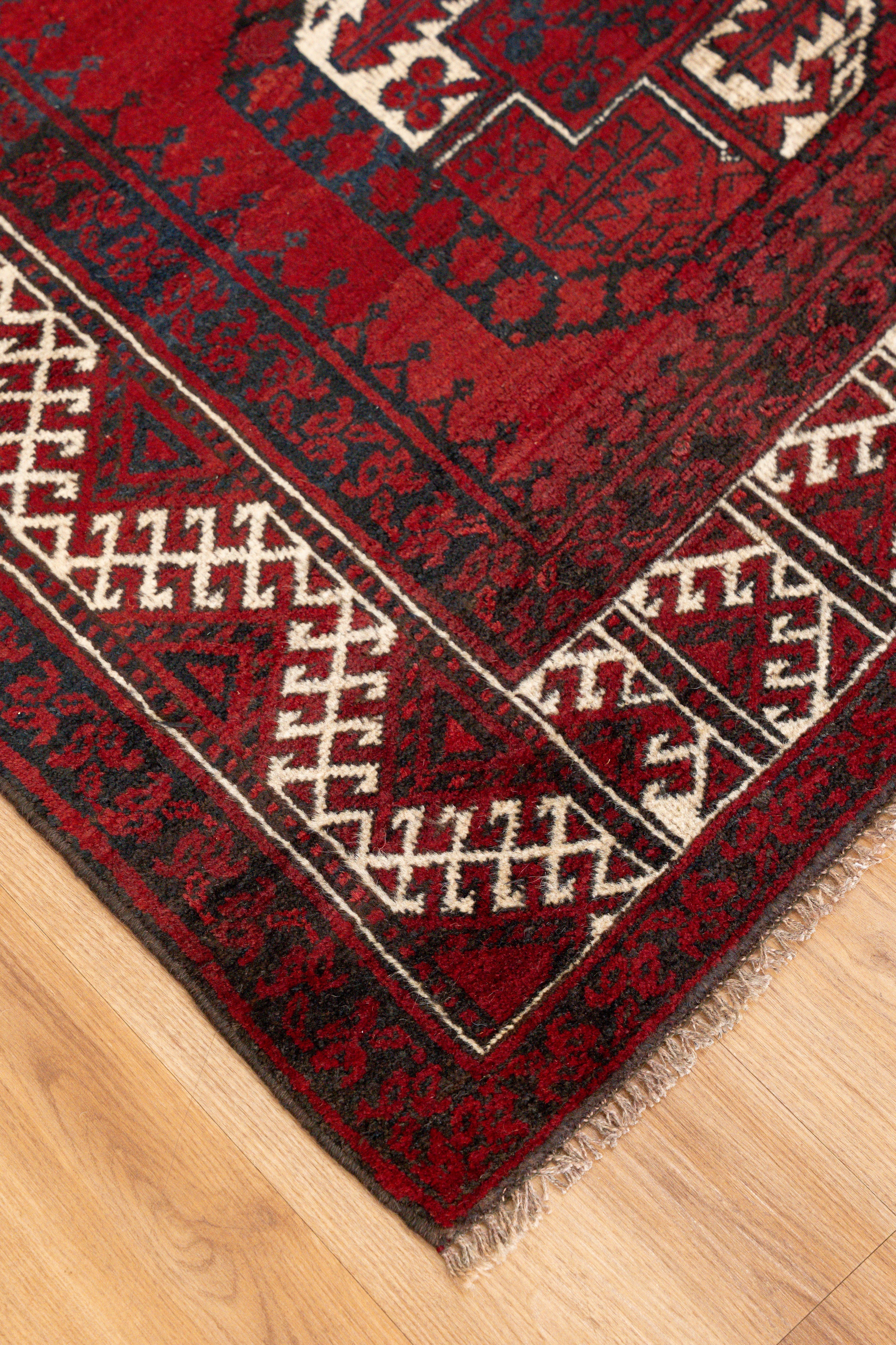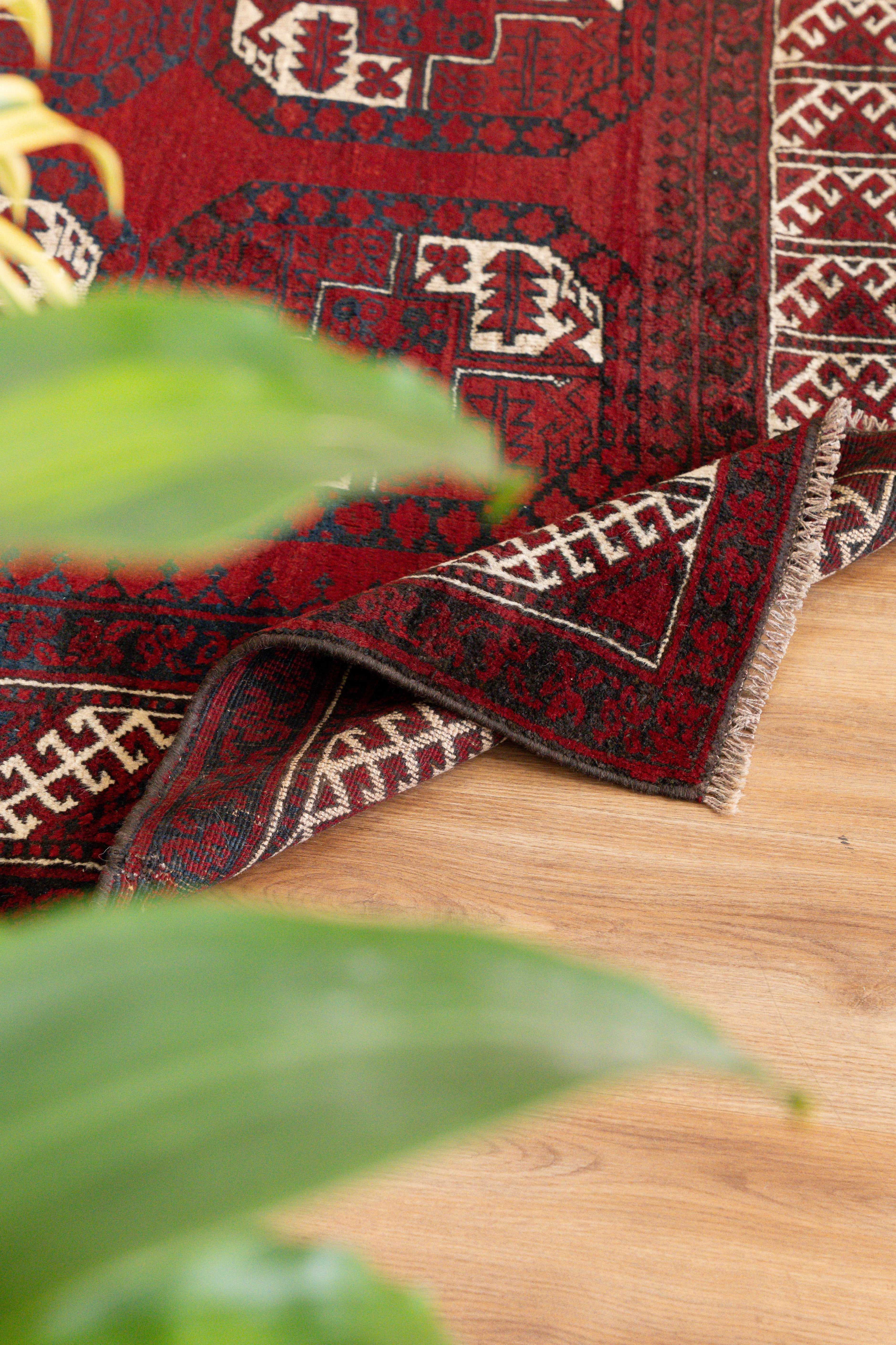 close to a square shape. Deep complementary reds paired with cream really bring out the motifs, while also remaining subtle. The medium-pile is soft and velvety to the touch. Drawing inspiration from antique Turkoman design, it features tribal and geometric motifs. All of our rugs are authentic and handpicked by Nedim.