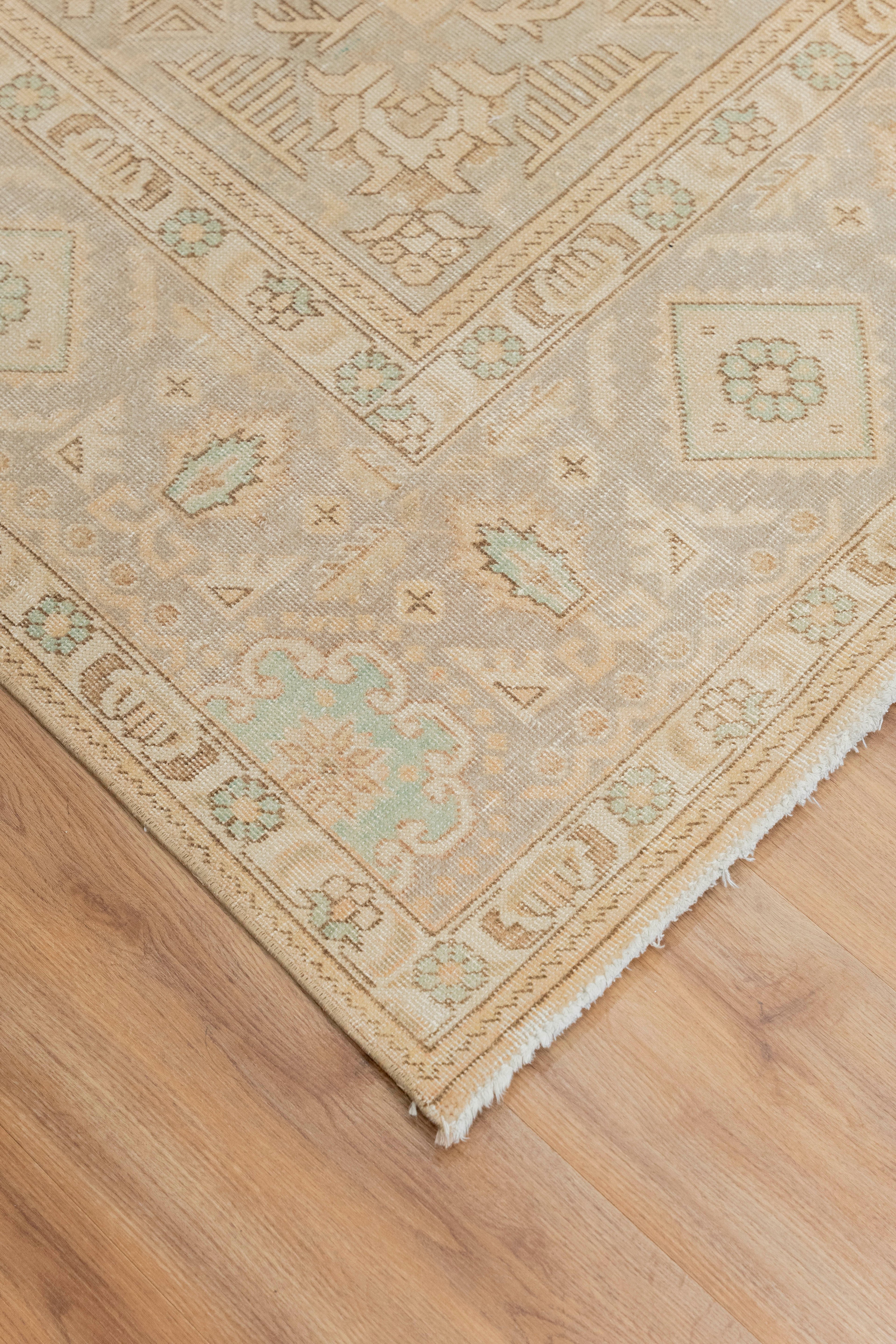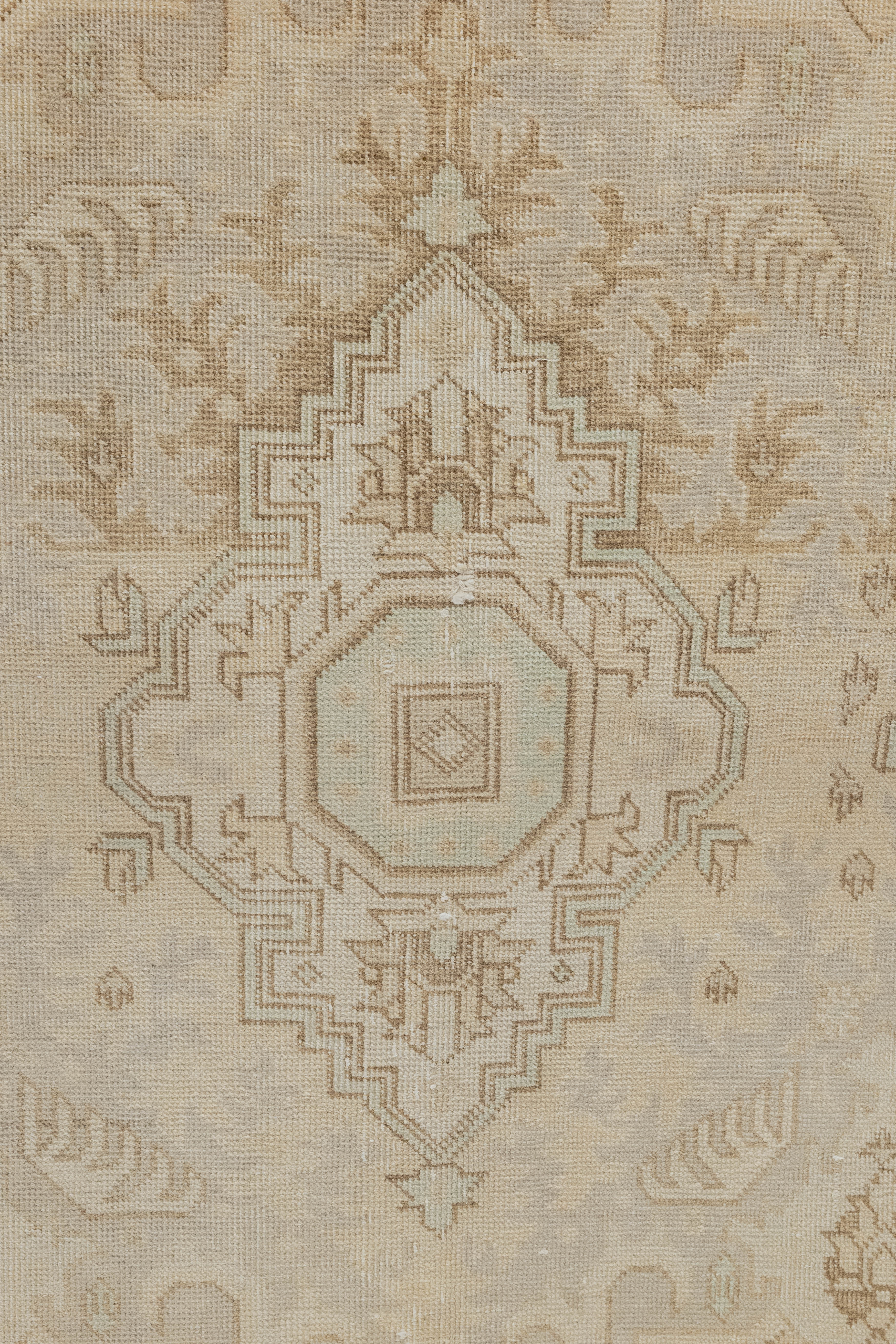 This one-of-a-kind vintage rug is handmade with a cotton foundation and a wool pile. It is brown and tan with cream pastels. Heriz rugs are celebrated for their chunky, coarse construction, which makes them some of the most resilient oriental rugs. They are perfect for high-traffic areas - yet they still provide a luxuriously soft, velvety feel underfoot. This piece has low-pile and features a lovely floral border, a center motif, and amazing vintage patina. Please inspect all photos. Each of our rugs is authentic and carefully handpicked by Nedim himself.