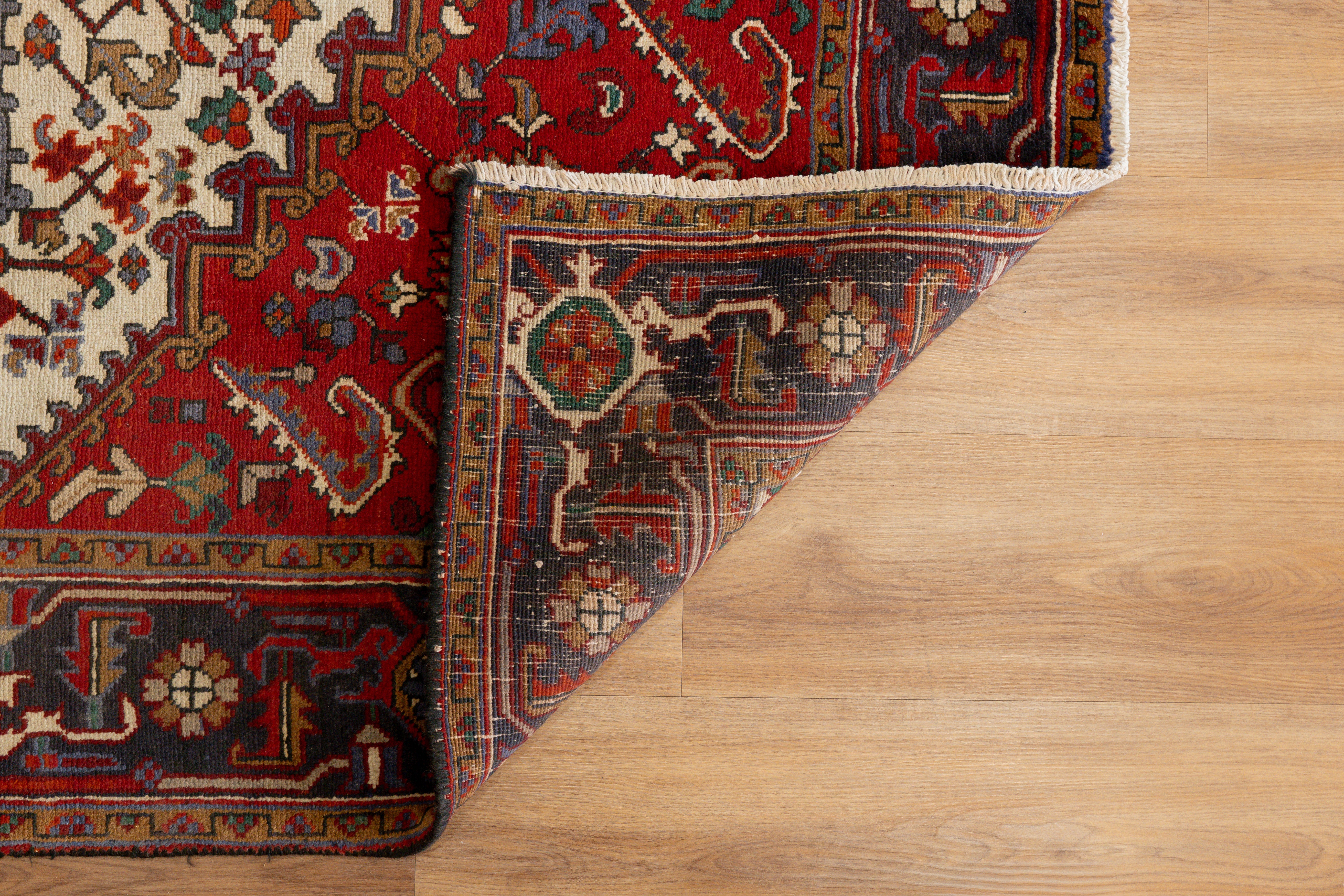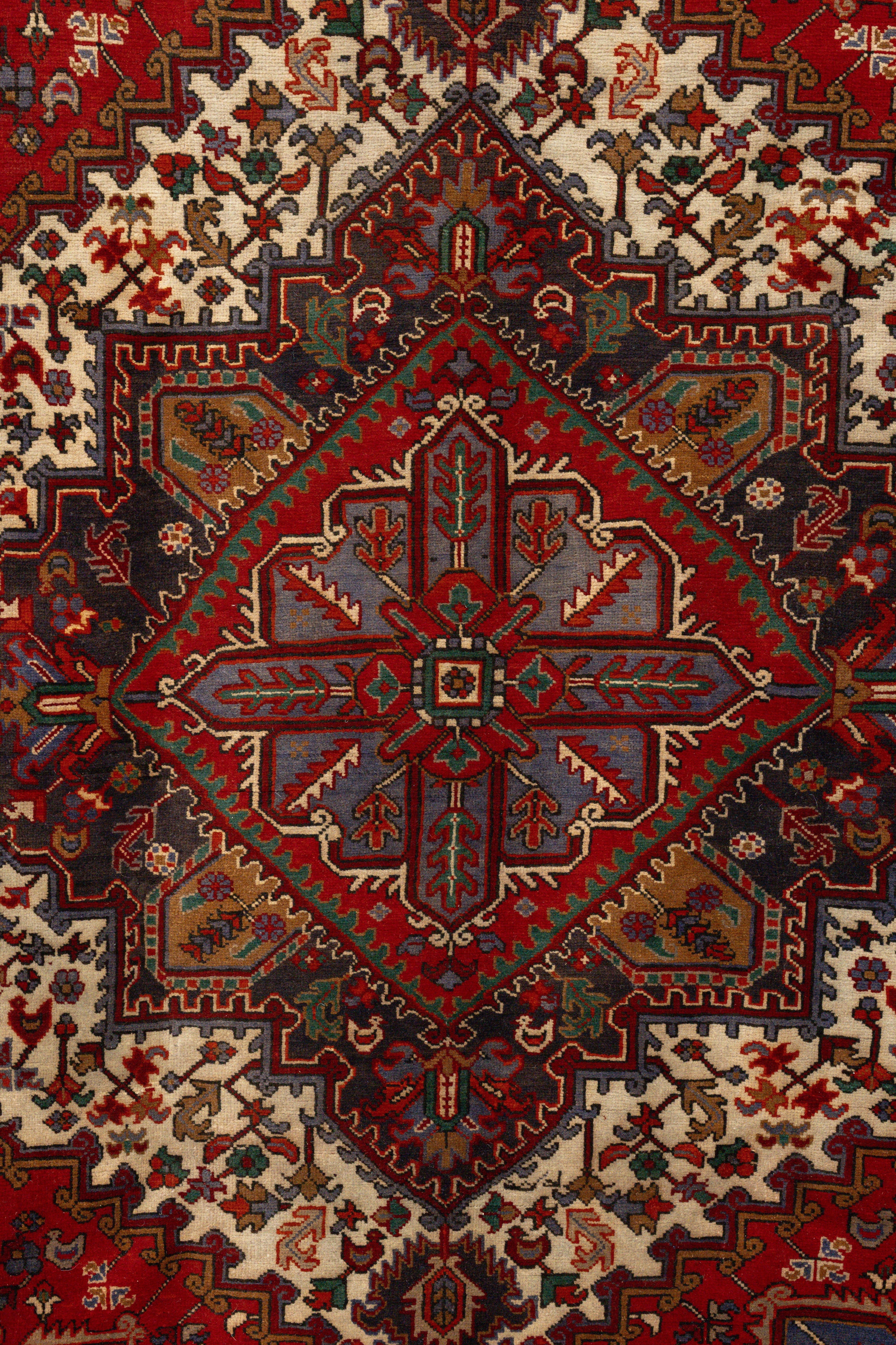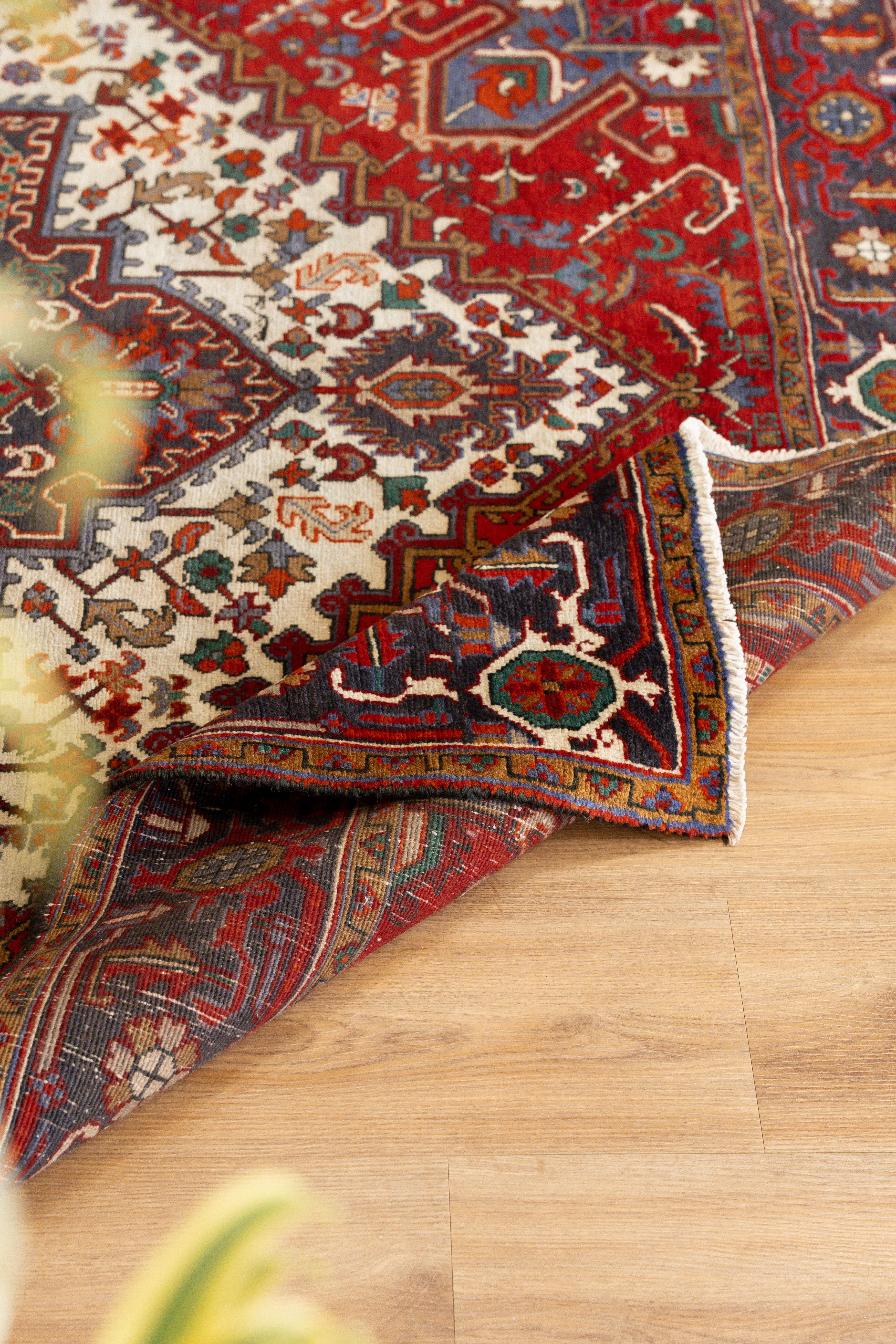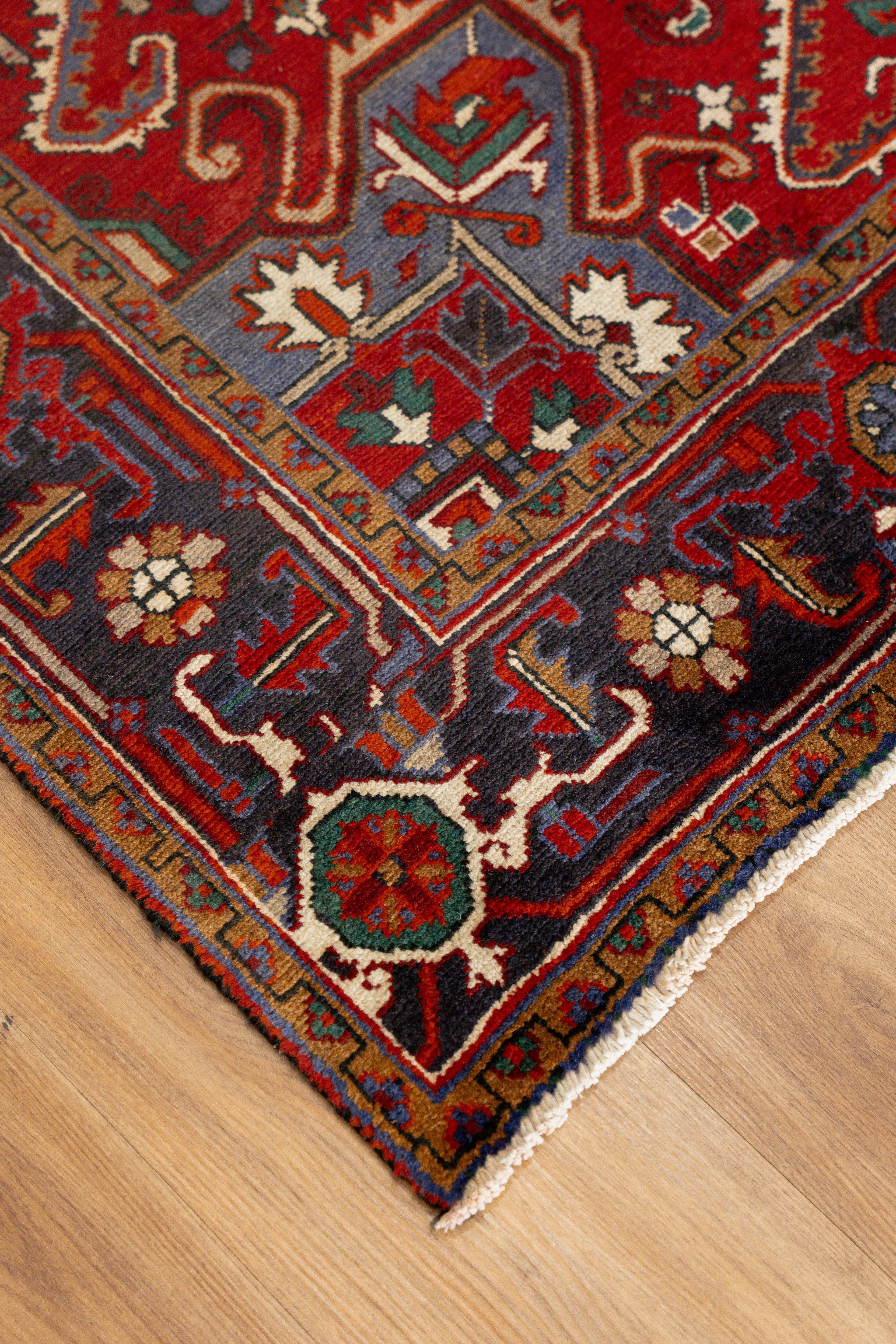 This one-of-a-kind vintage rug has a soft feel and a beautiful shine to it. With a cotton foundation and 100% wool pile, Heriz rugs are known for their chunky, coarse construction. This makes them among the most durable rugs of the region, while still offering a soft, velvety feel underfoot. This piece features a classic central medallion surrounded by geometric, floral, and tribal motifs in rich tones of red, olive green, and a dark gold shade. Each of our rugs are authentic and carefully handpicked by Nedim himself.