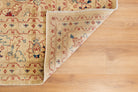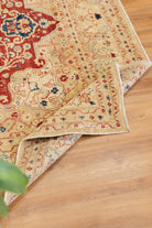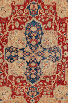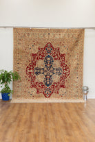 This one-of-a-kind handwoven area rug is made from a cotton foundation and a 100% wool pile. Shirvan rugs originated in the area now part of modern-day Azerbaijan and can vary widely in design and interpretation. This low-pile rug features delicate amulet motifs and a geometric, bright red center motif. The ground is tan and beige that varies in saturation, depending on the lighting.  This rug is perfect for a bedroom or a living room. All of our rugs are authentic and handpicked by Nedim himself.