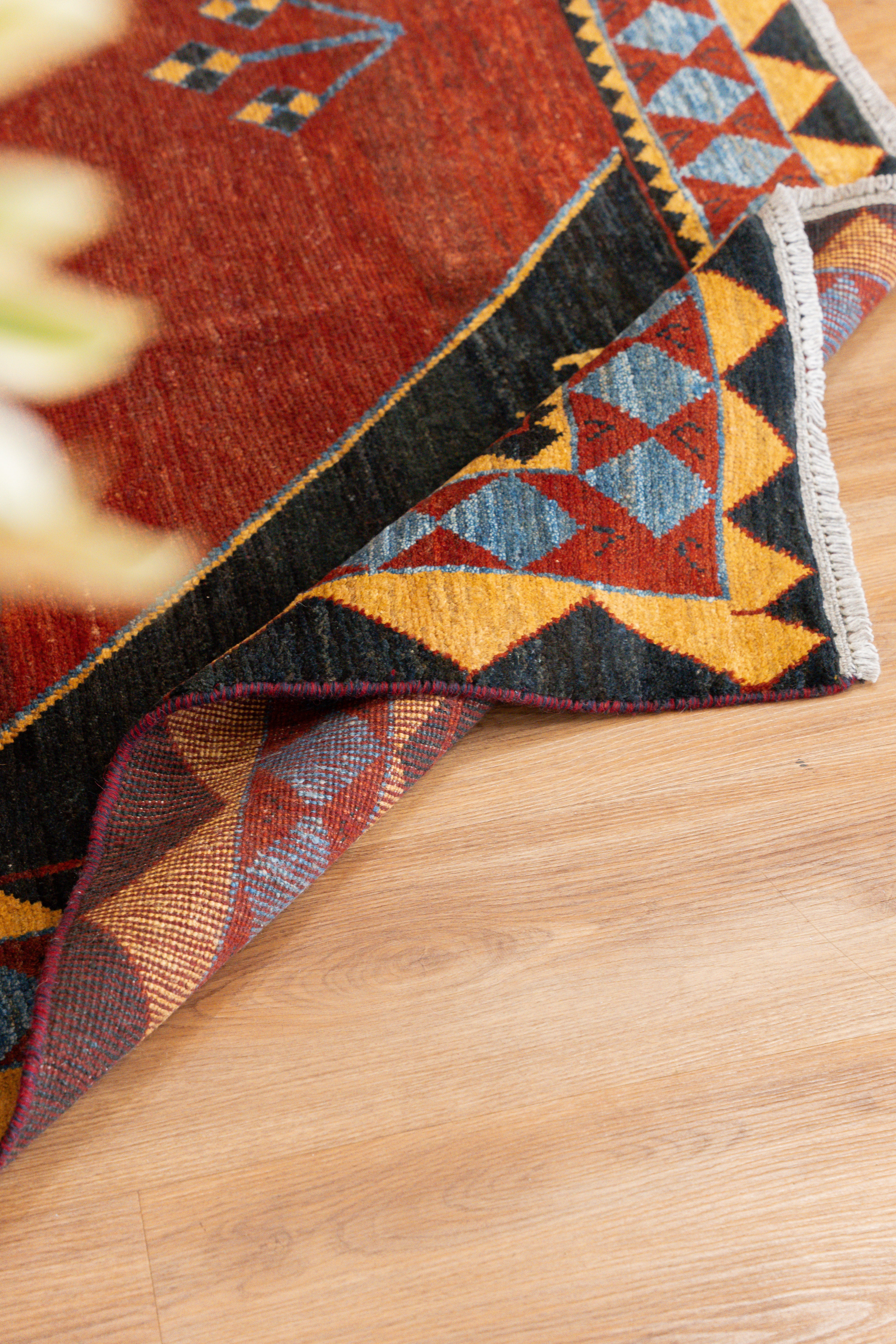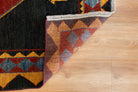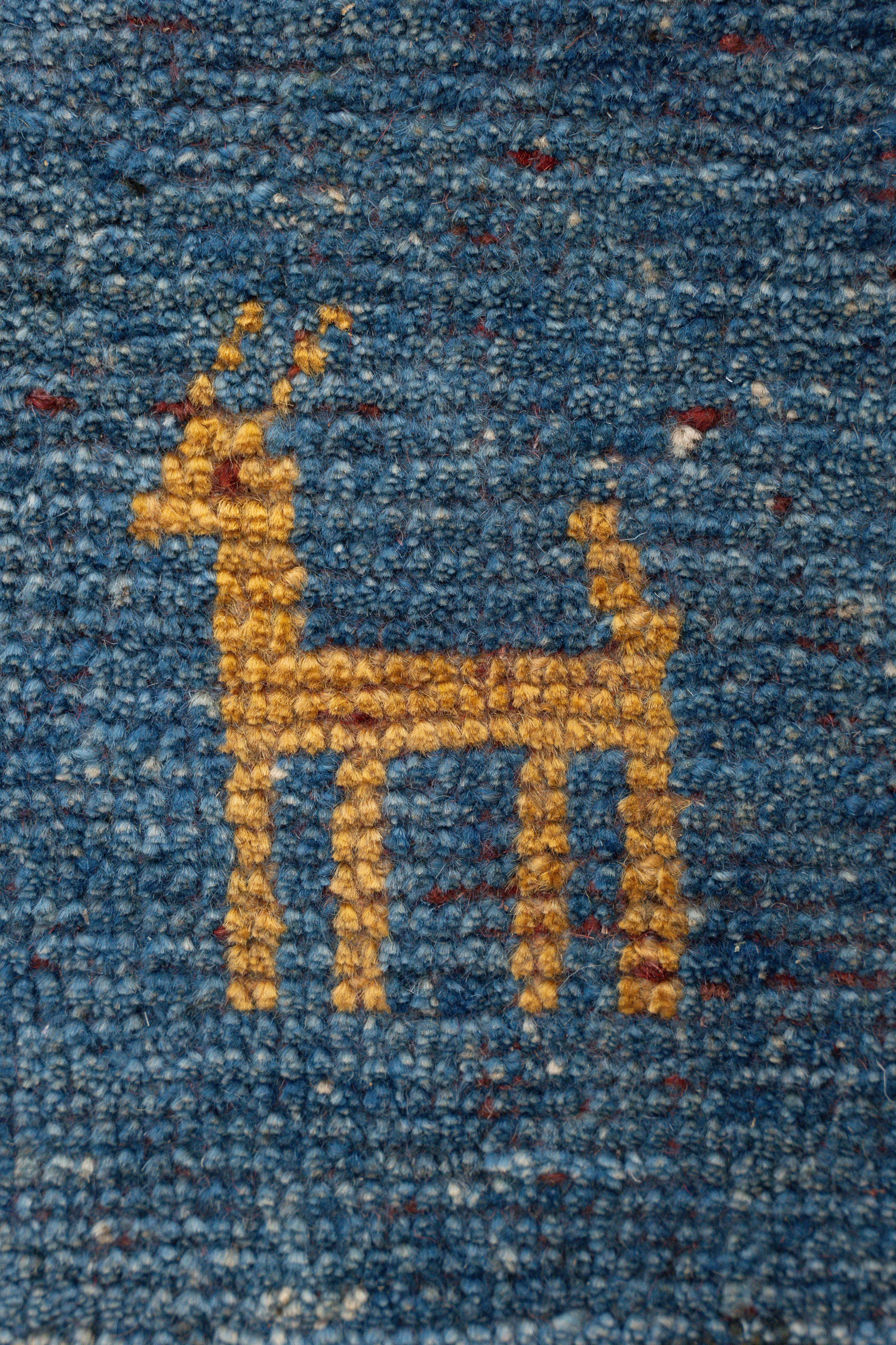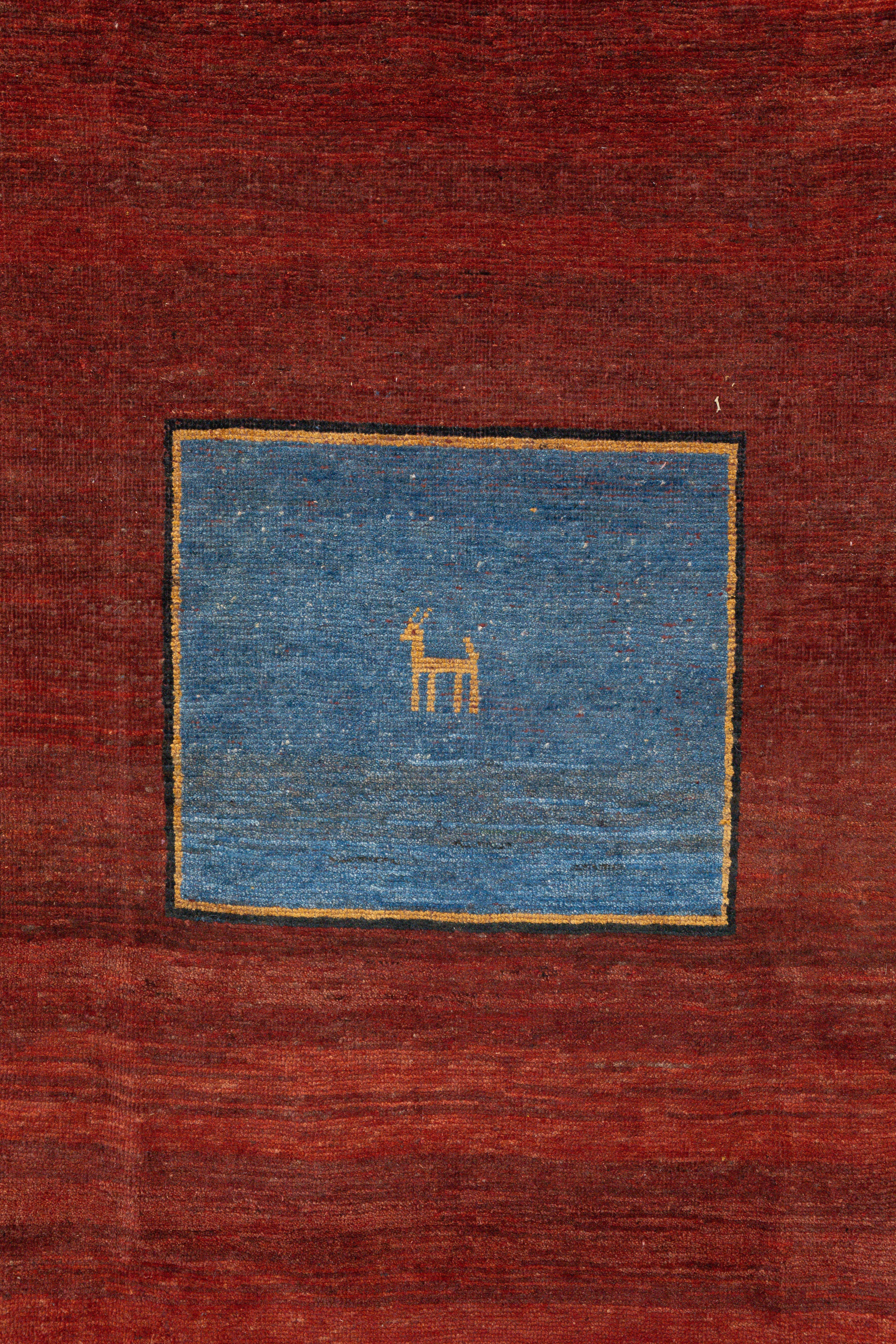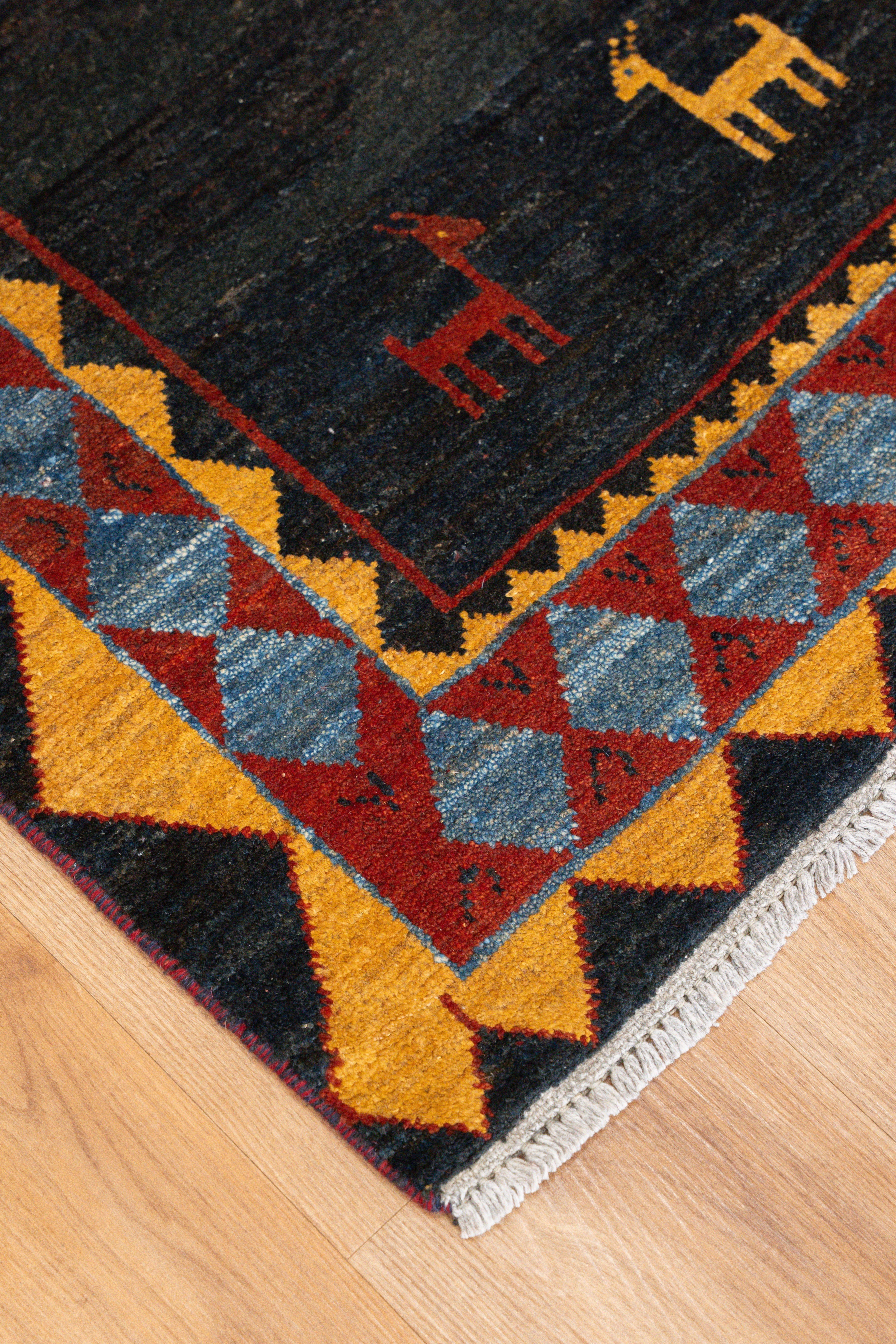 These one-of-a-kind vintage Gabbeh rugs are handwoven in many villages surrounding the Kurdish region. This rug has a cotton base and an all-wool, medium pile. Though very soft to the touch, these rugs are very durable and long-lasting. It features unique tribal motifs that are blue, red, mustard, and black. On each corner of the rug, there are animal (goat) motifs presented in alternating colors. Perfect for a living room or bedroom! All of our rugs are authentic and handpicked by Nedim himself.
