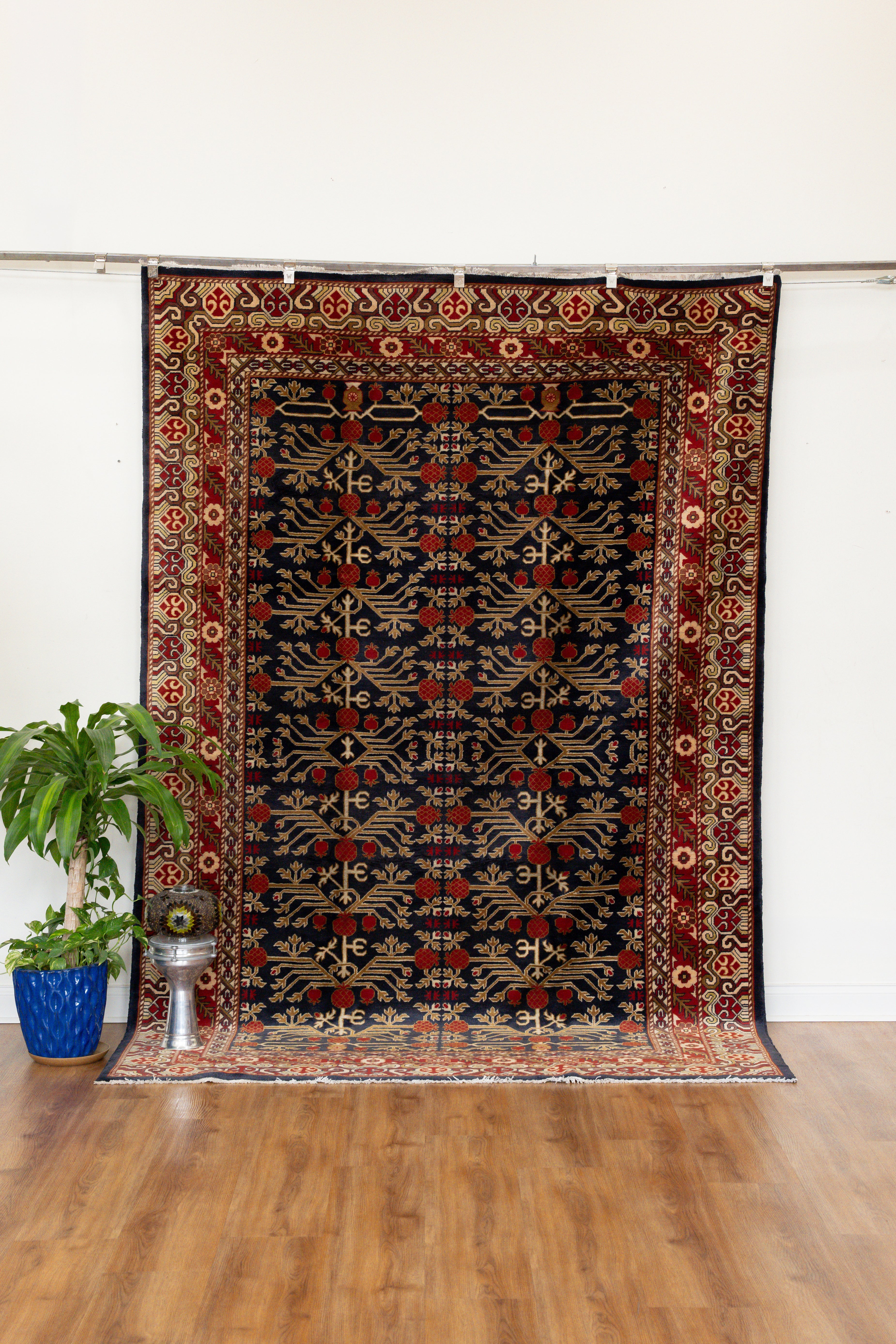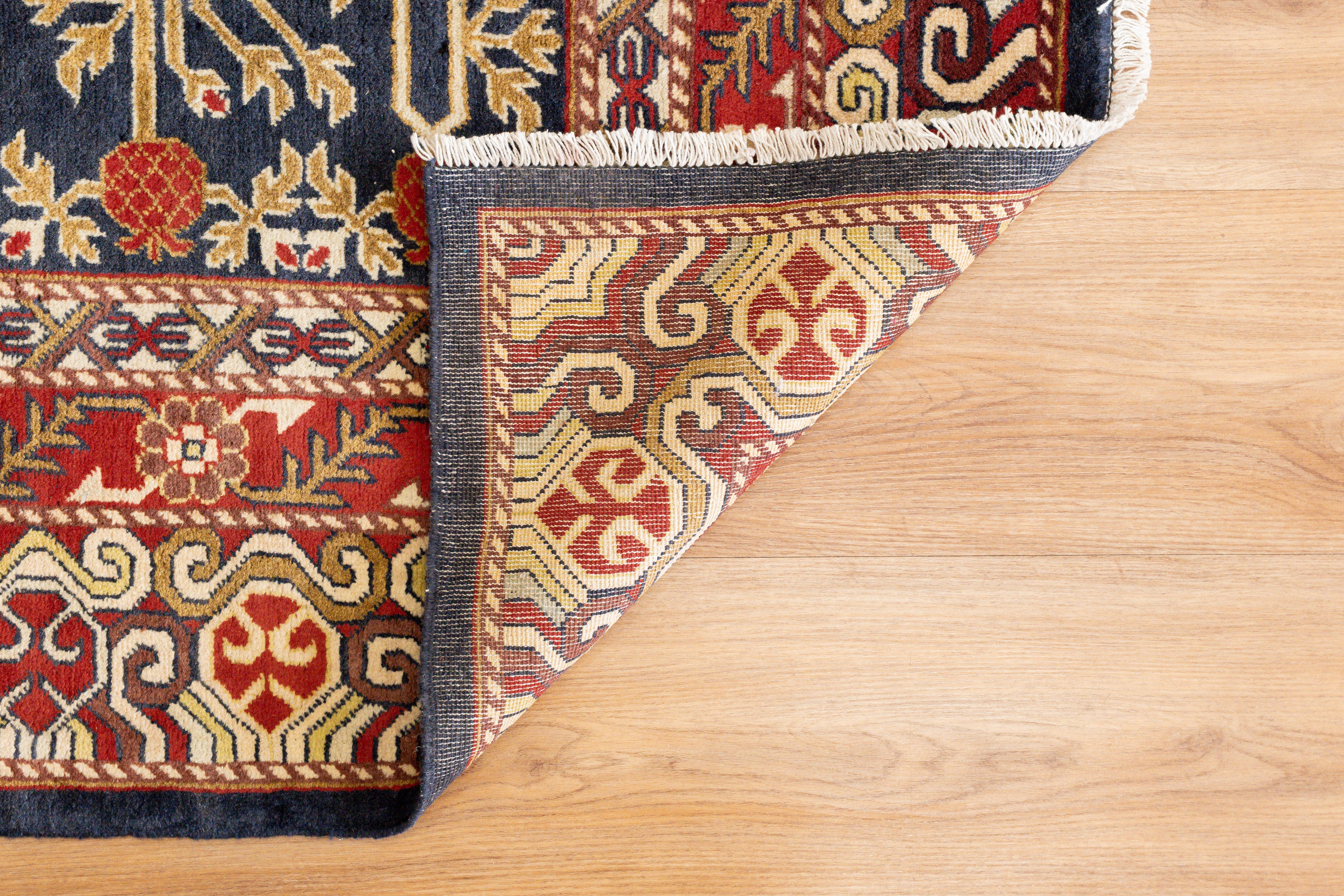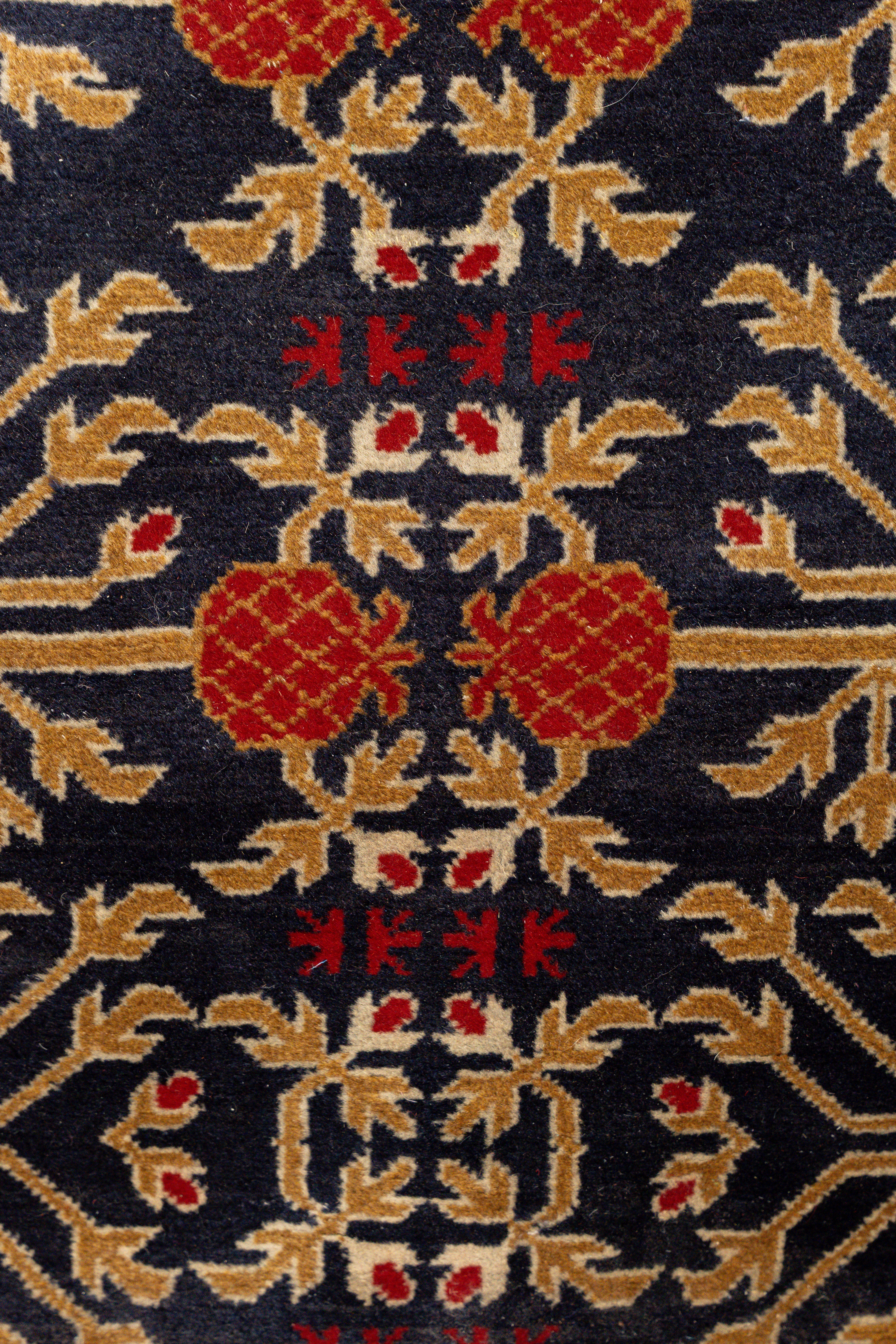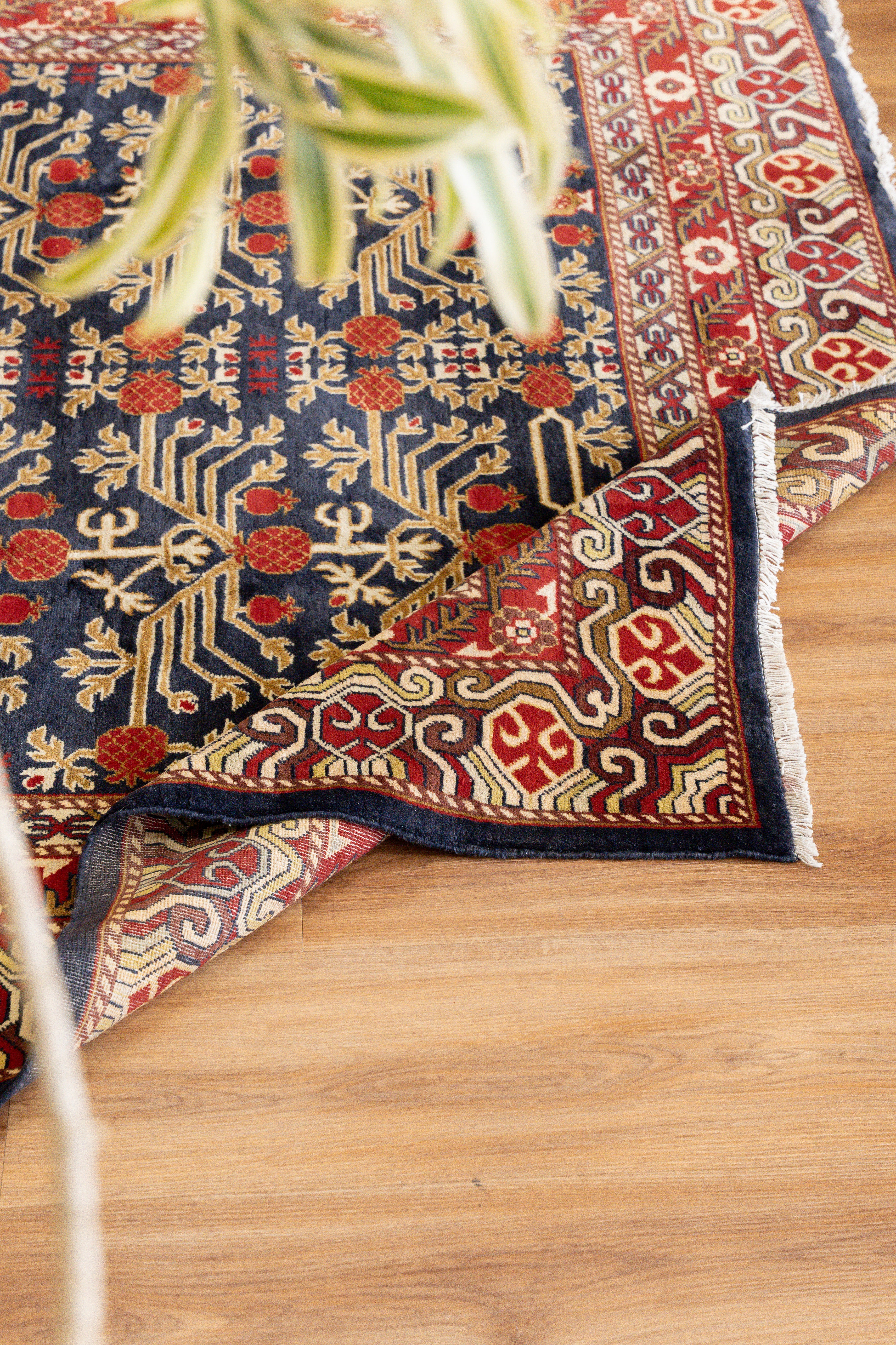 This one-of-a-kind Kurdish rug is made from cotton foundation with a 100% wool pile. Offering a soft texture, this medium-pile is woven on a deep navy blue ground. It has brown, red, tan and olive green accents that show us a repeating pomagranite pattern with leaf and floral motifs throughout. It reflects the artistry of nomadic weavers who use unique motifs to tell intricate, symbolic stories—each design unique and meaningful to its tribe. Every rug in our collection is authentic and carefully handpicked by Nedim himself.