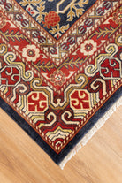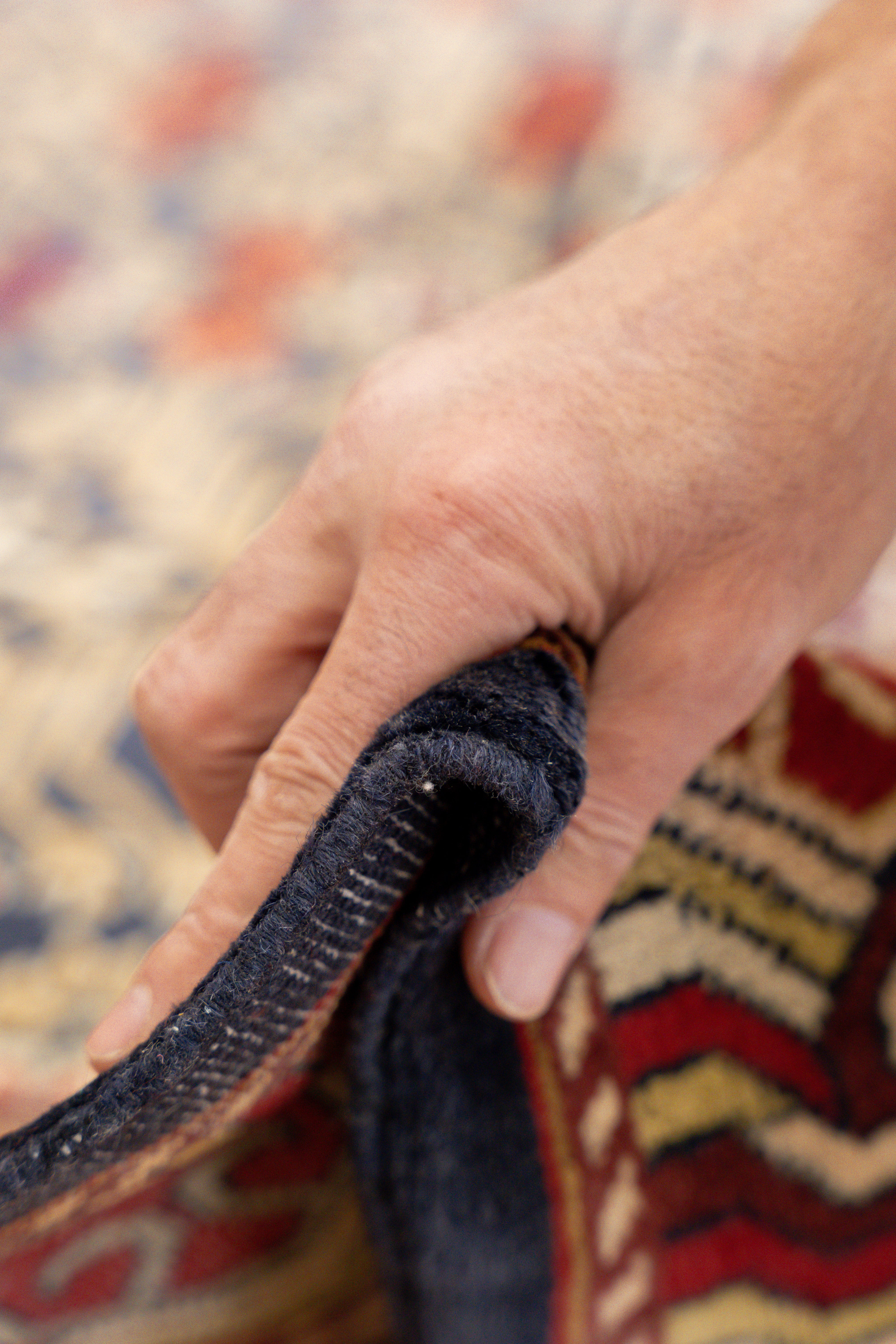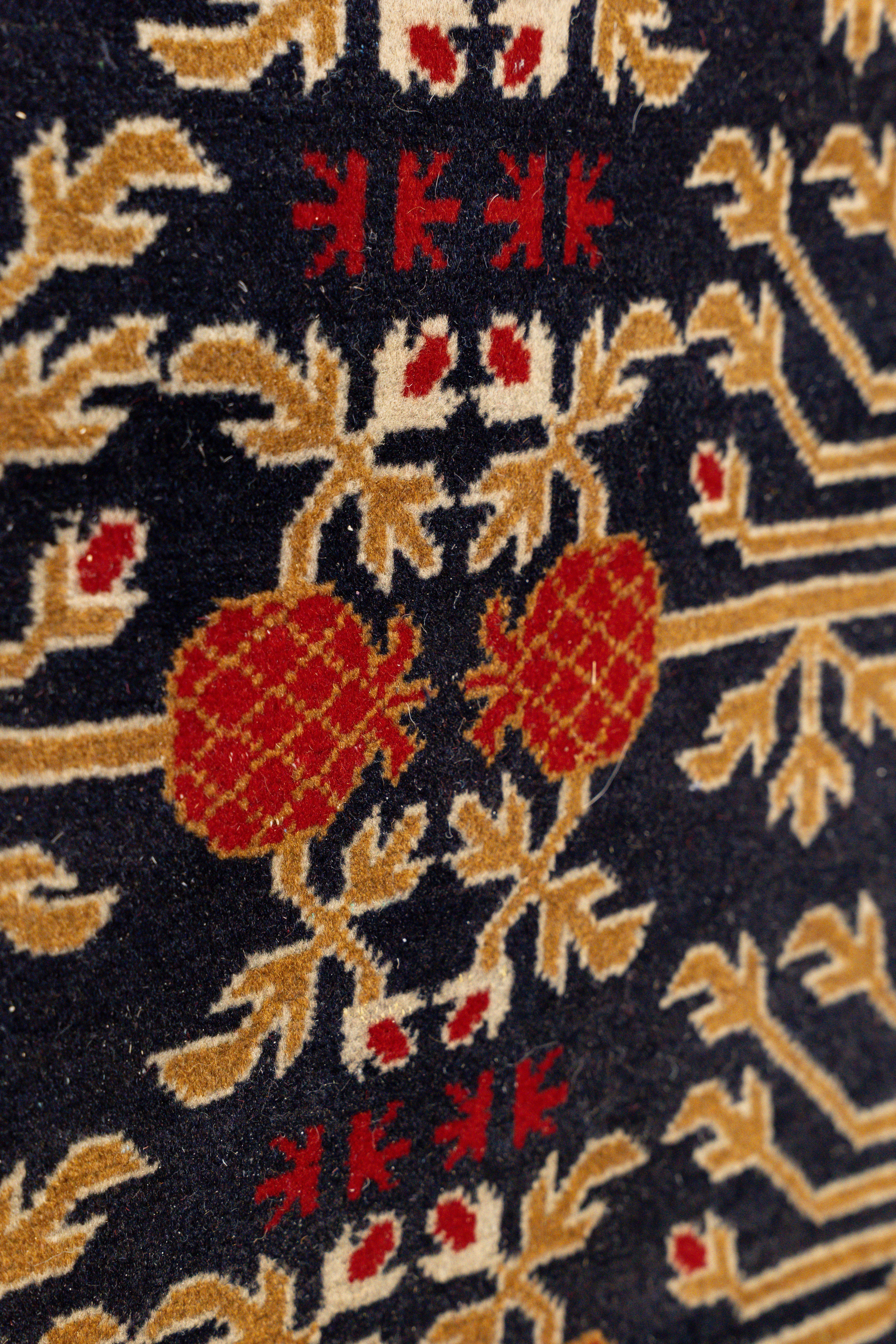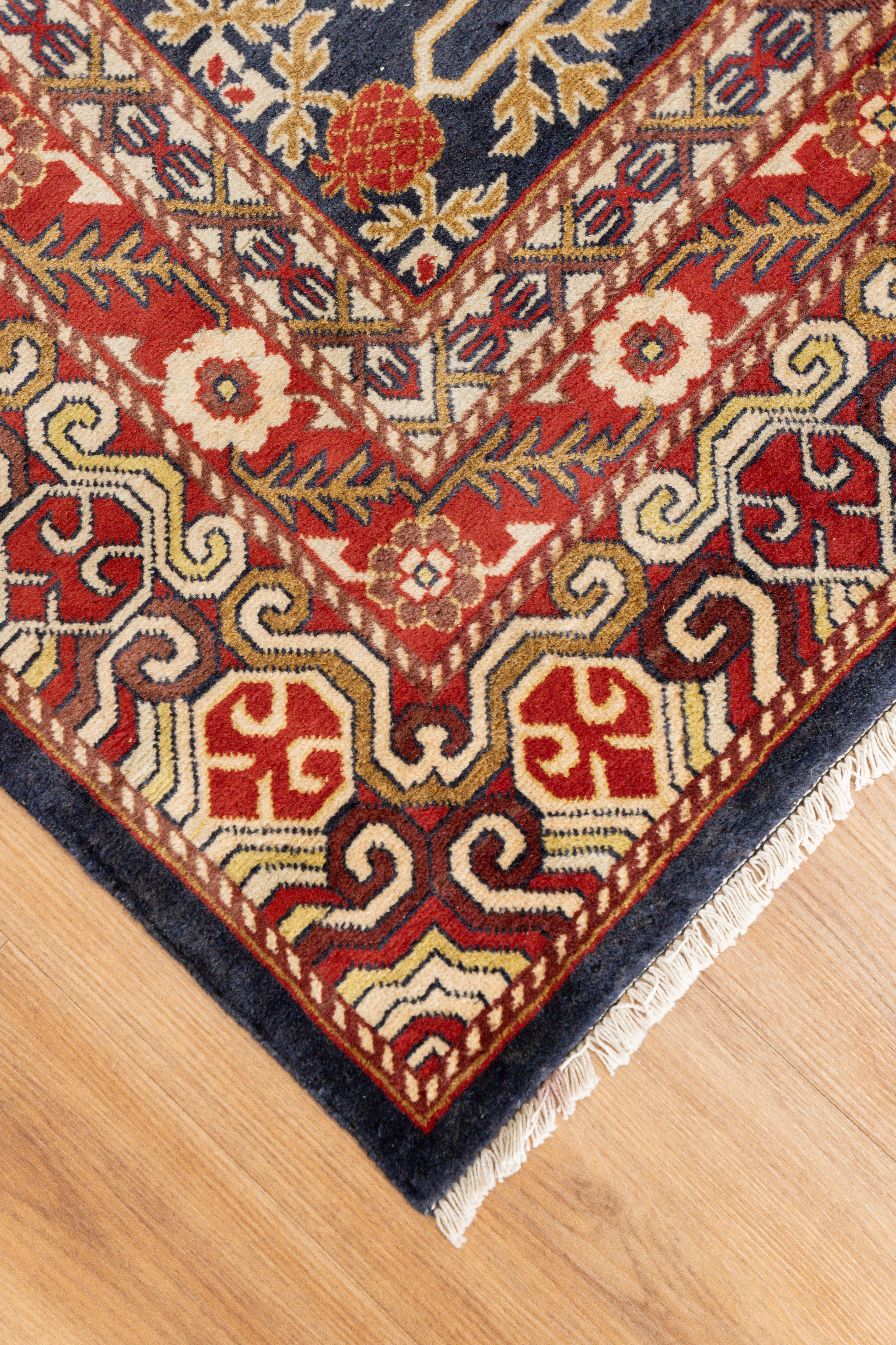 This one-of-a-kind Kurdish rug is made from cotton foundation with a 100% wool pile. Offering a soft texture, this medium-pile is woven on a deep navy blue ground. It has brown, red, tan and olive green accents that show us a repeating pomagranite pattern with leaf and floral motifs throughout. It reflects the artistry of nomadic weavers who use unique motifs to tell intricate, symbolic stories—each design unique and meaningful to its tribe. Every rug in our collection is authentic and carefully handpicked by Nedim himself.