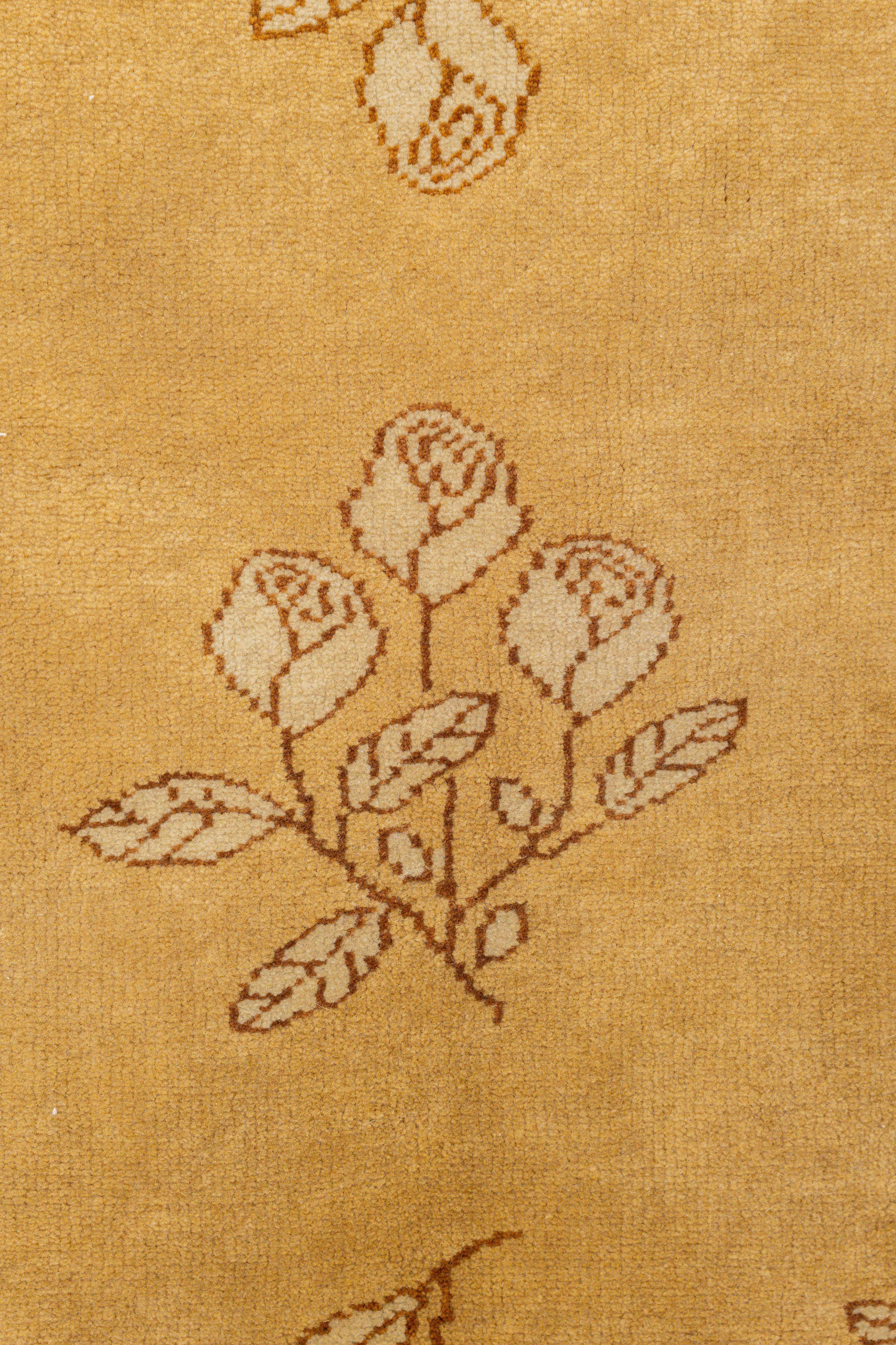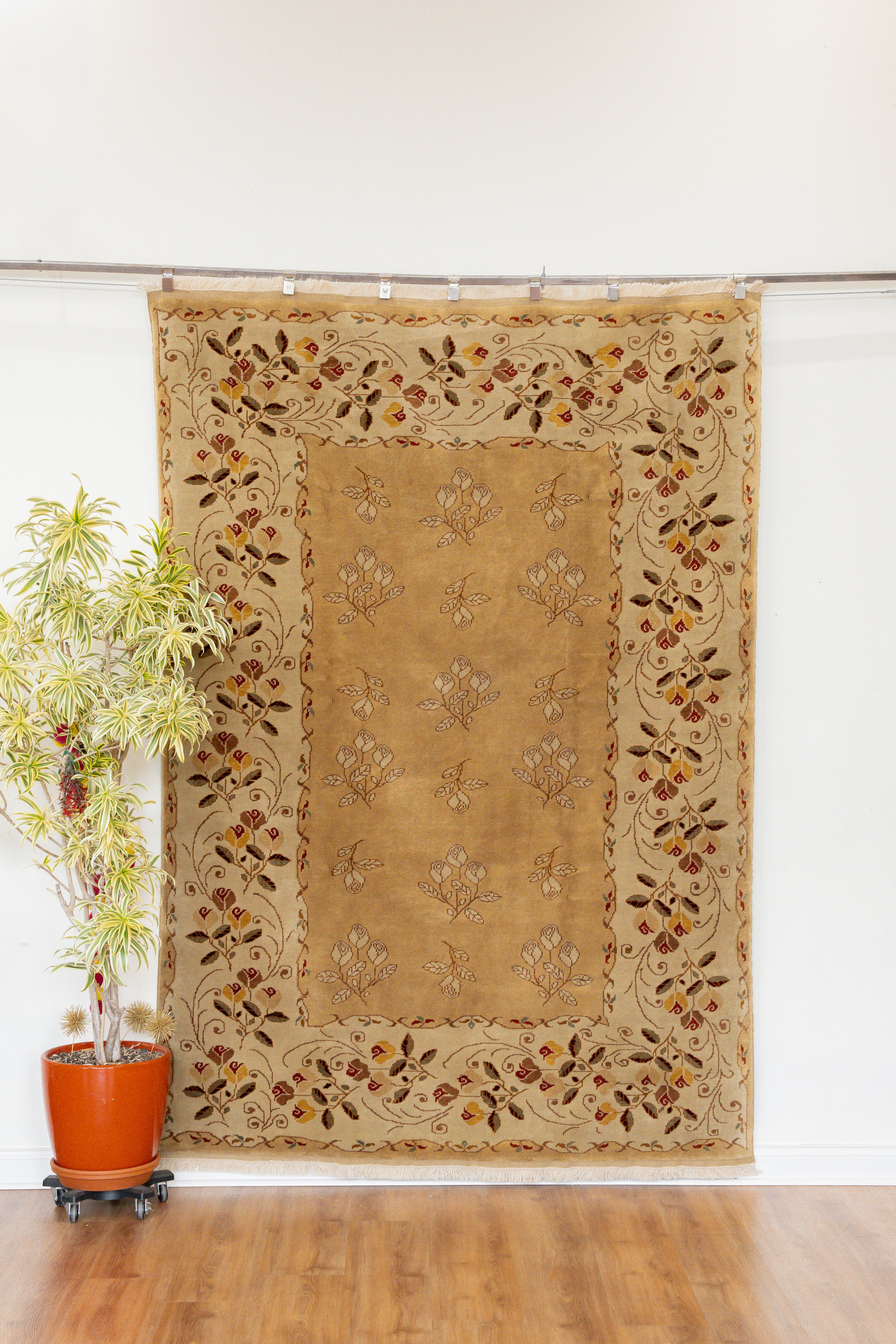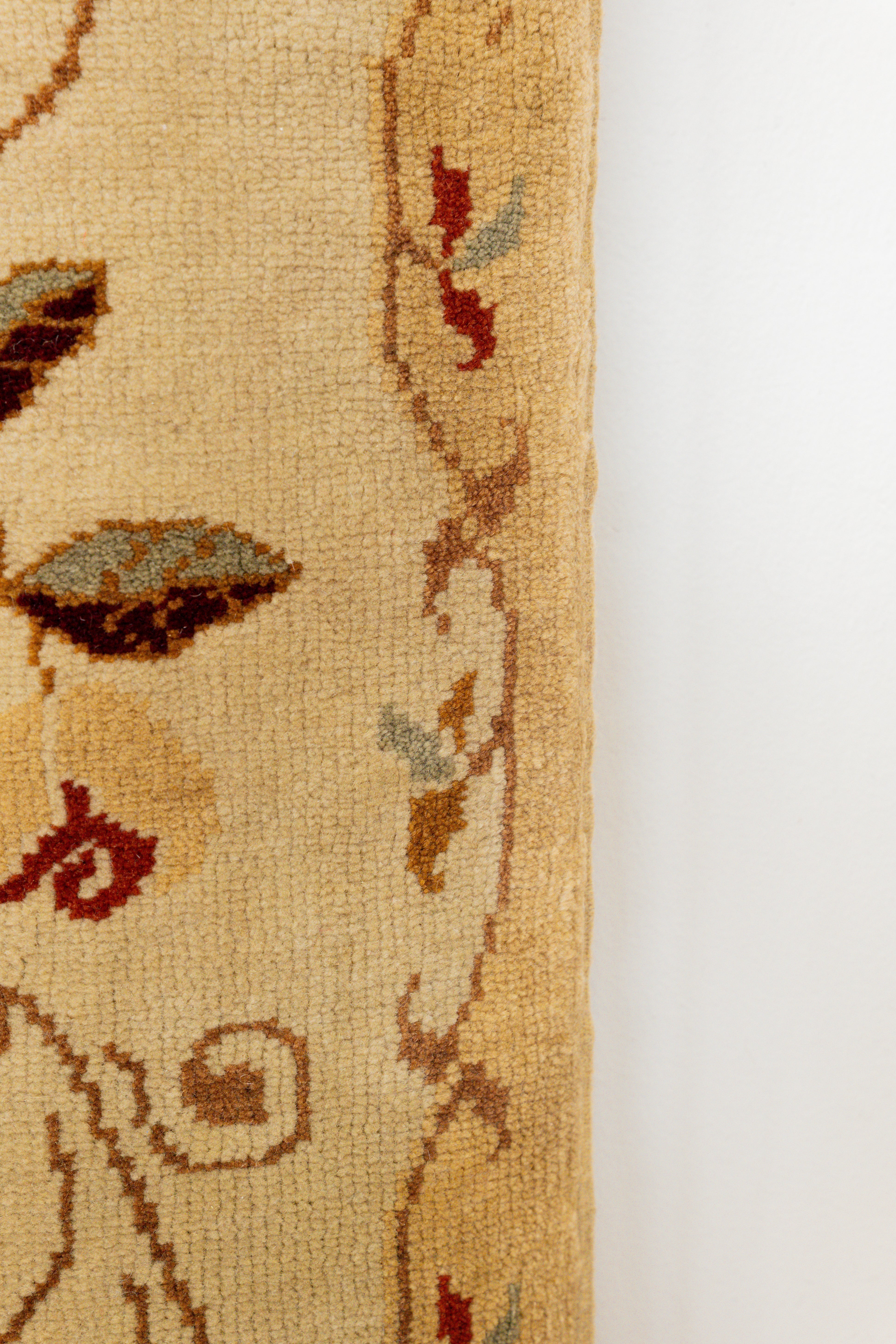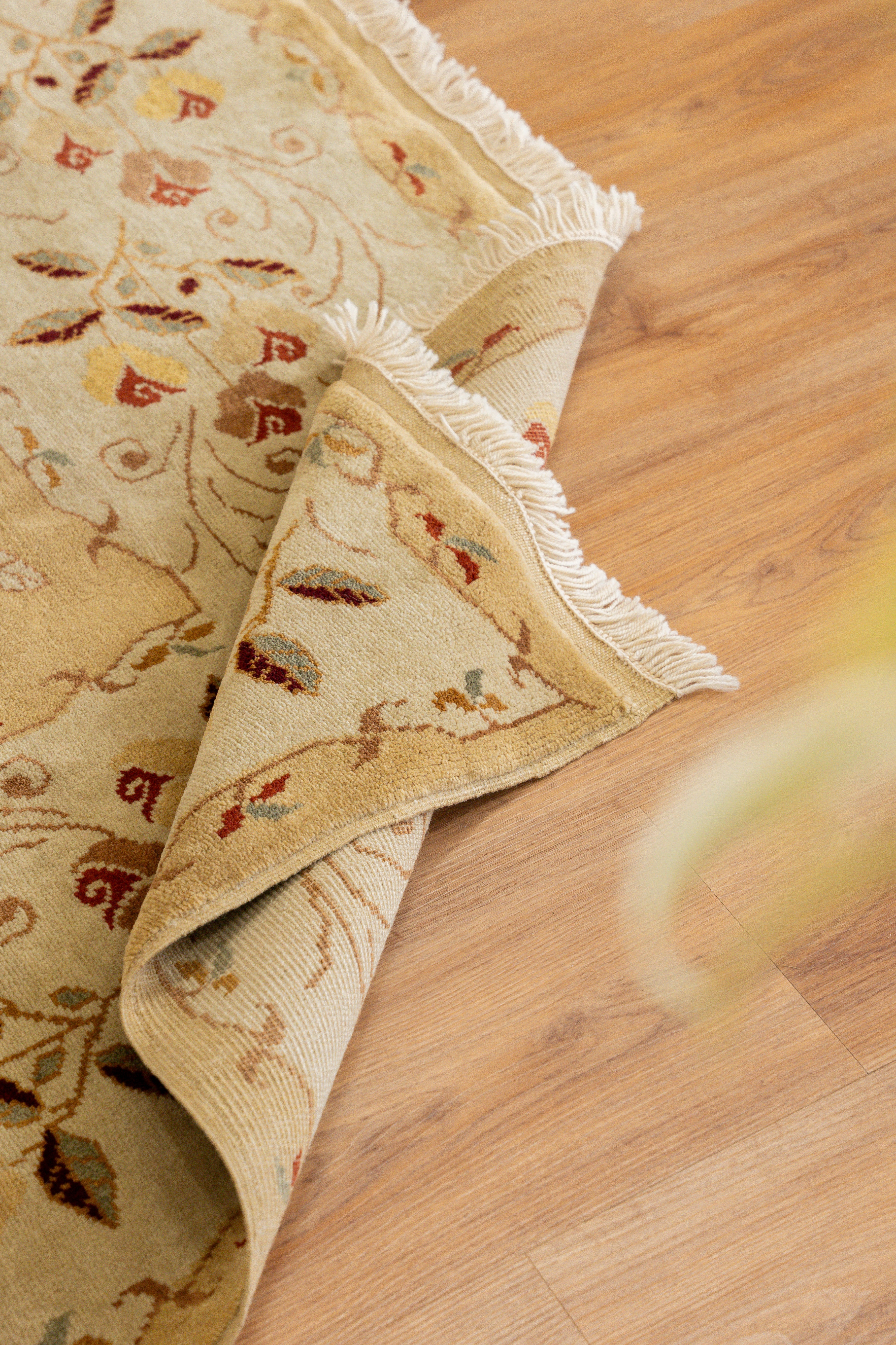 This one-of-a-kind rug is made from 100% premium wool. The medium-pile presents us with romantic, delicate floral motifs that are tan, olive and red with some yellow highlights. The weavers of these rugs are known for the silky, luminous wool that they work with. The feel is velvet-like and lustrous and perfect for comfortability n a bedroom or living room. Each of our rugs is authentic and carefully handpicked by Nedim himself.