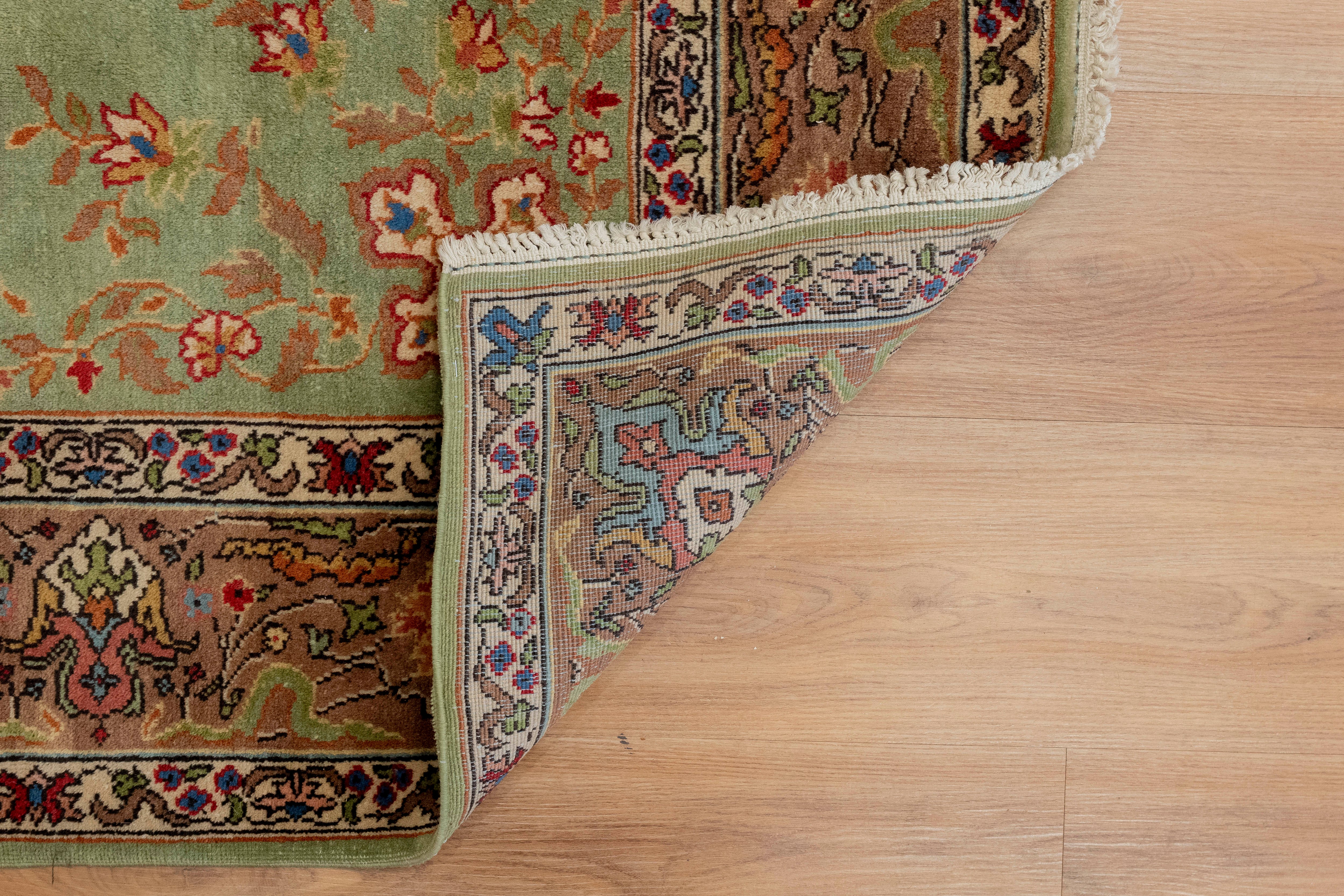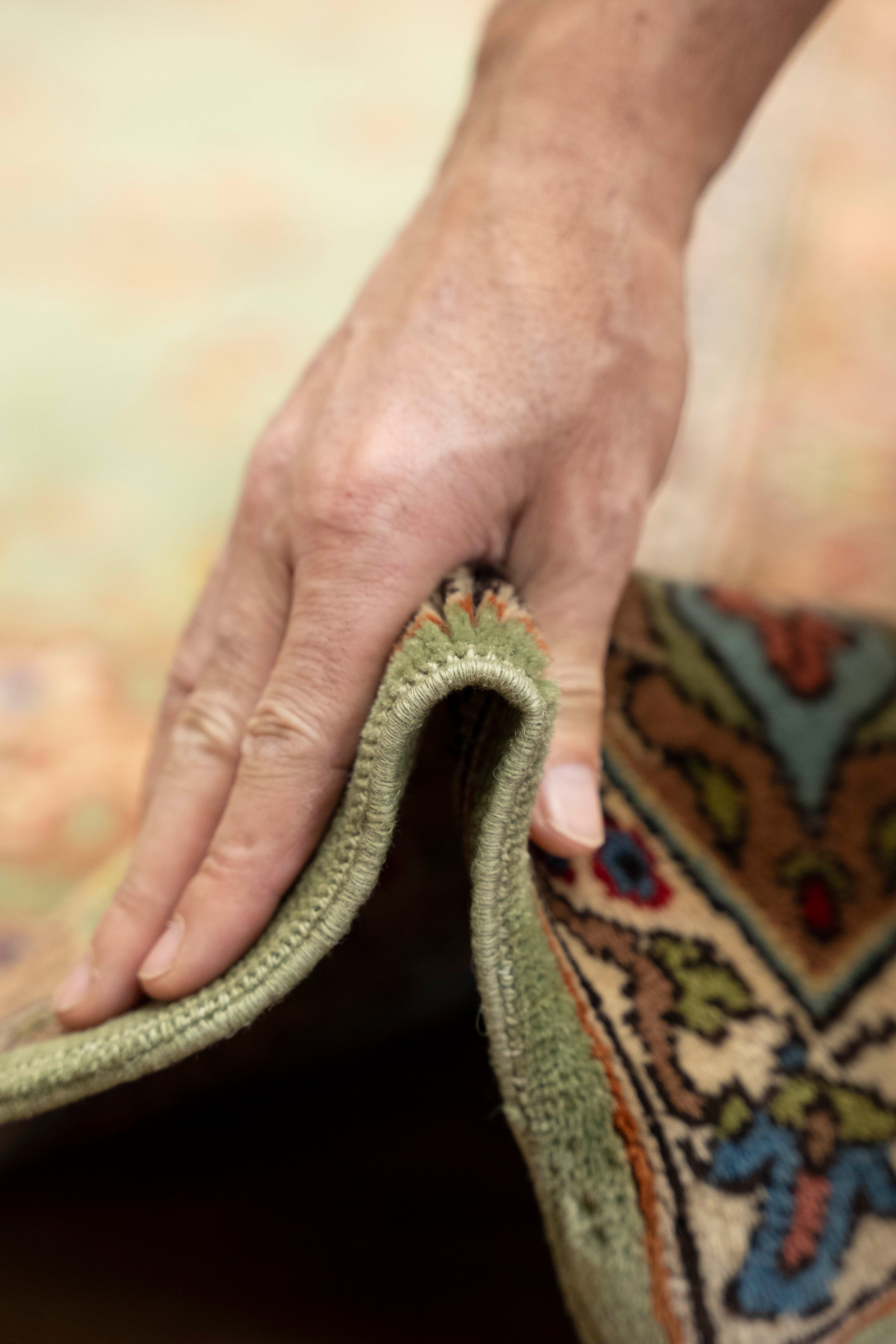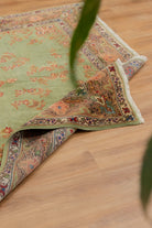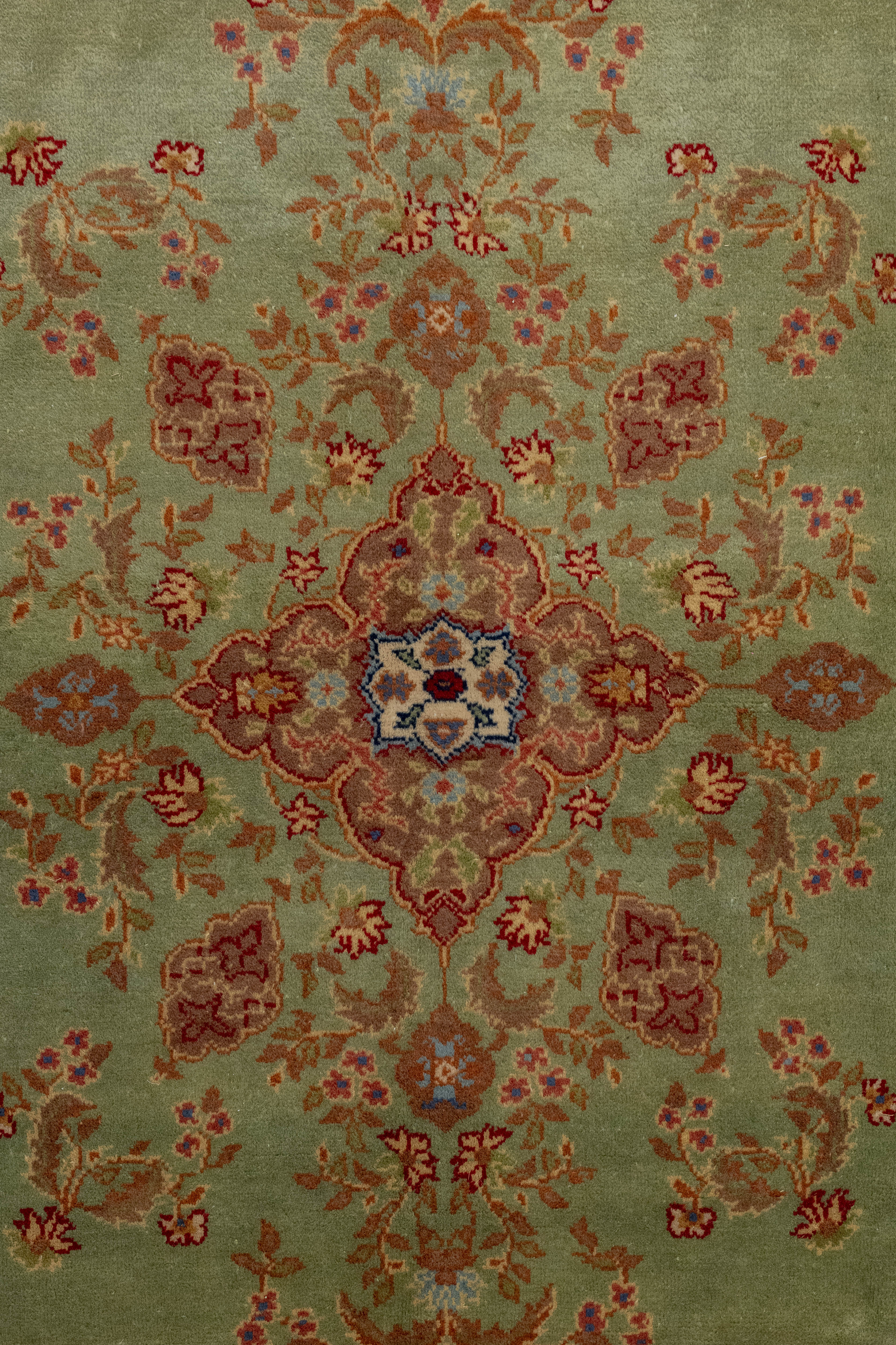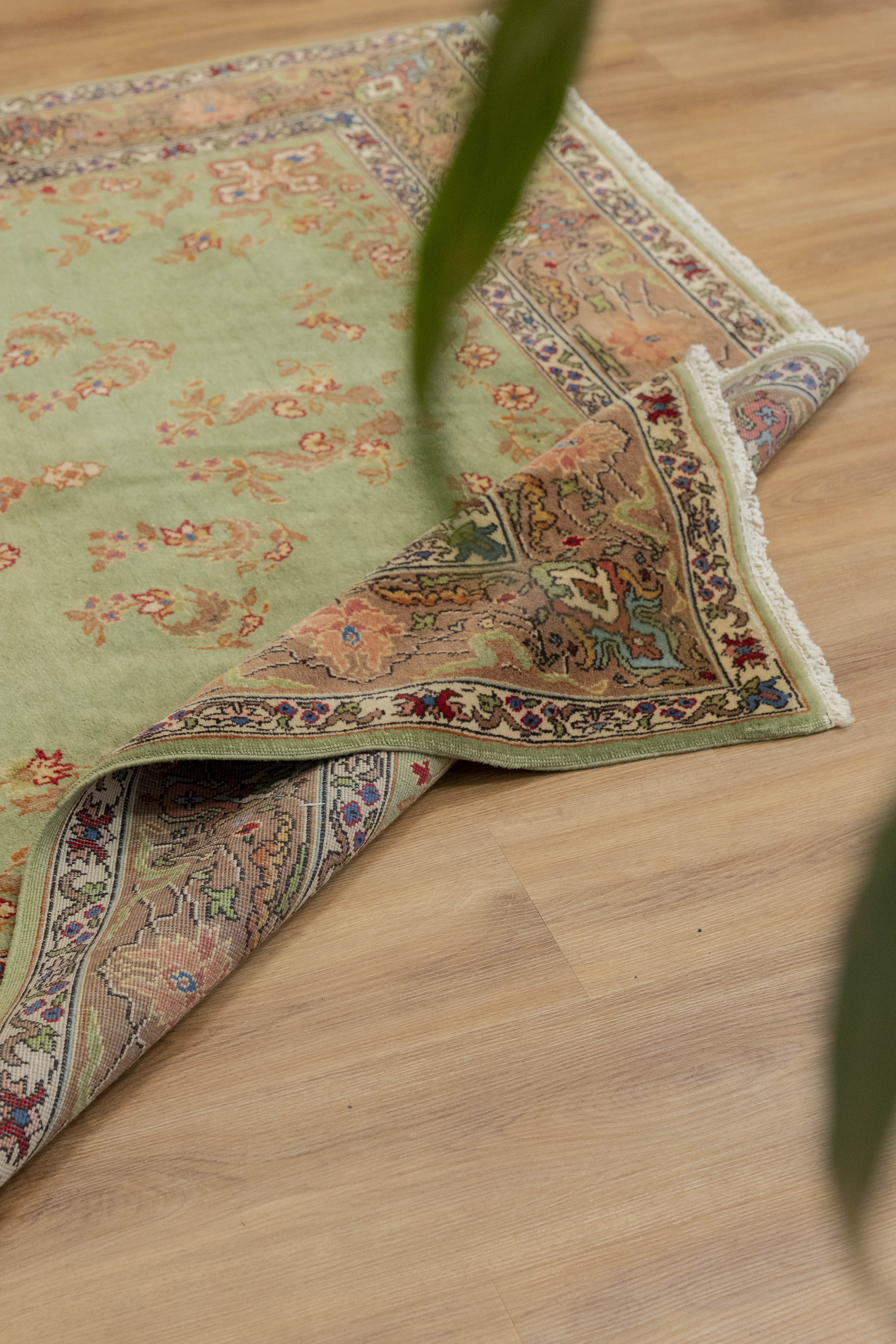 This unique rug, made from a cotton foundation and 100% premium wool pile, is crafted by Oushak ( it is spelled both ways! ) weavers, famed for their silky, luminous material. About 40 years old, it features a floral center medallion against a rare mint green ground, which diverges from the region's typical repeating patterns. Each rug is authentic and handpicked by Nedim himself.