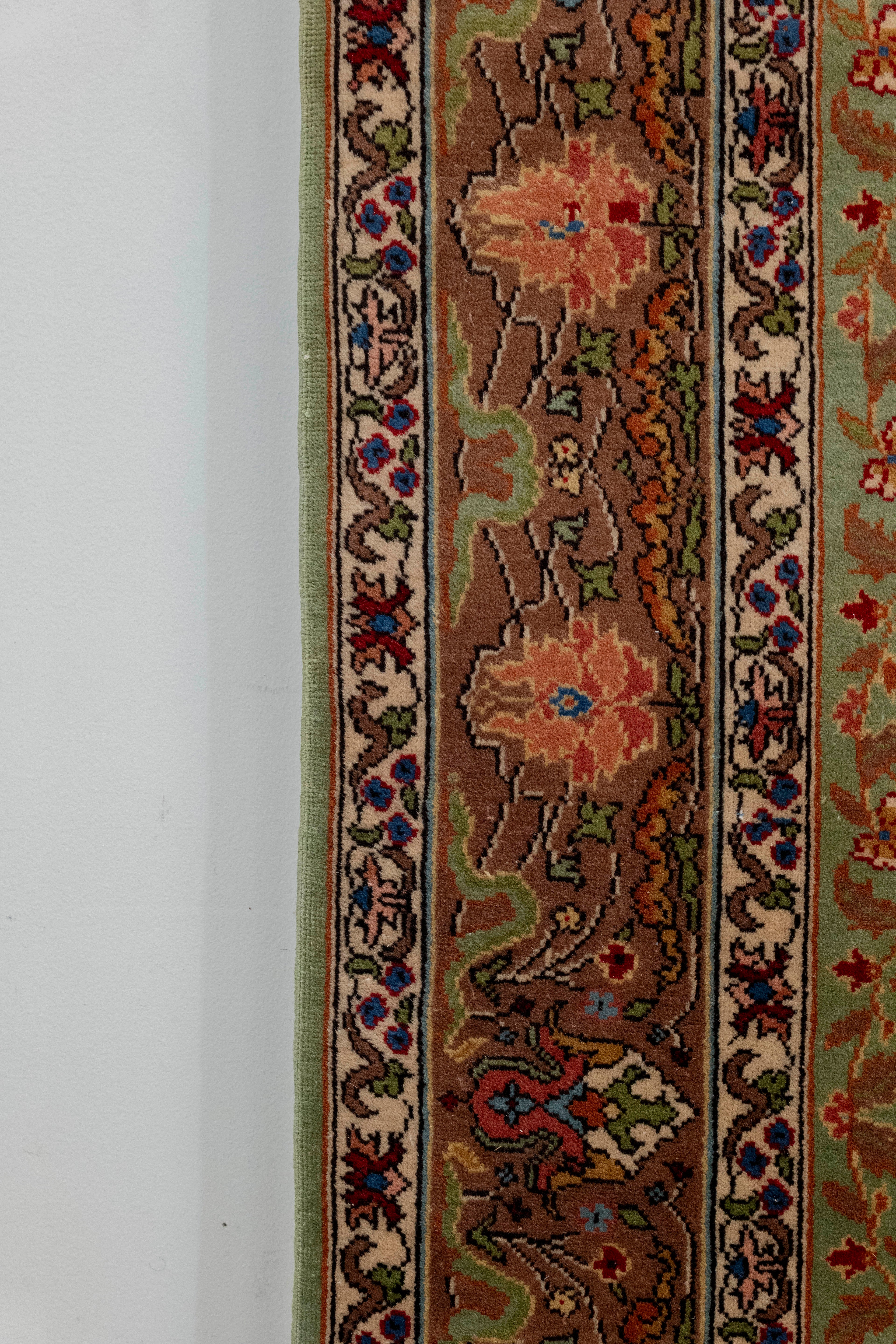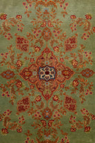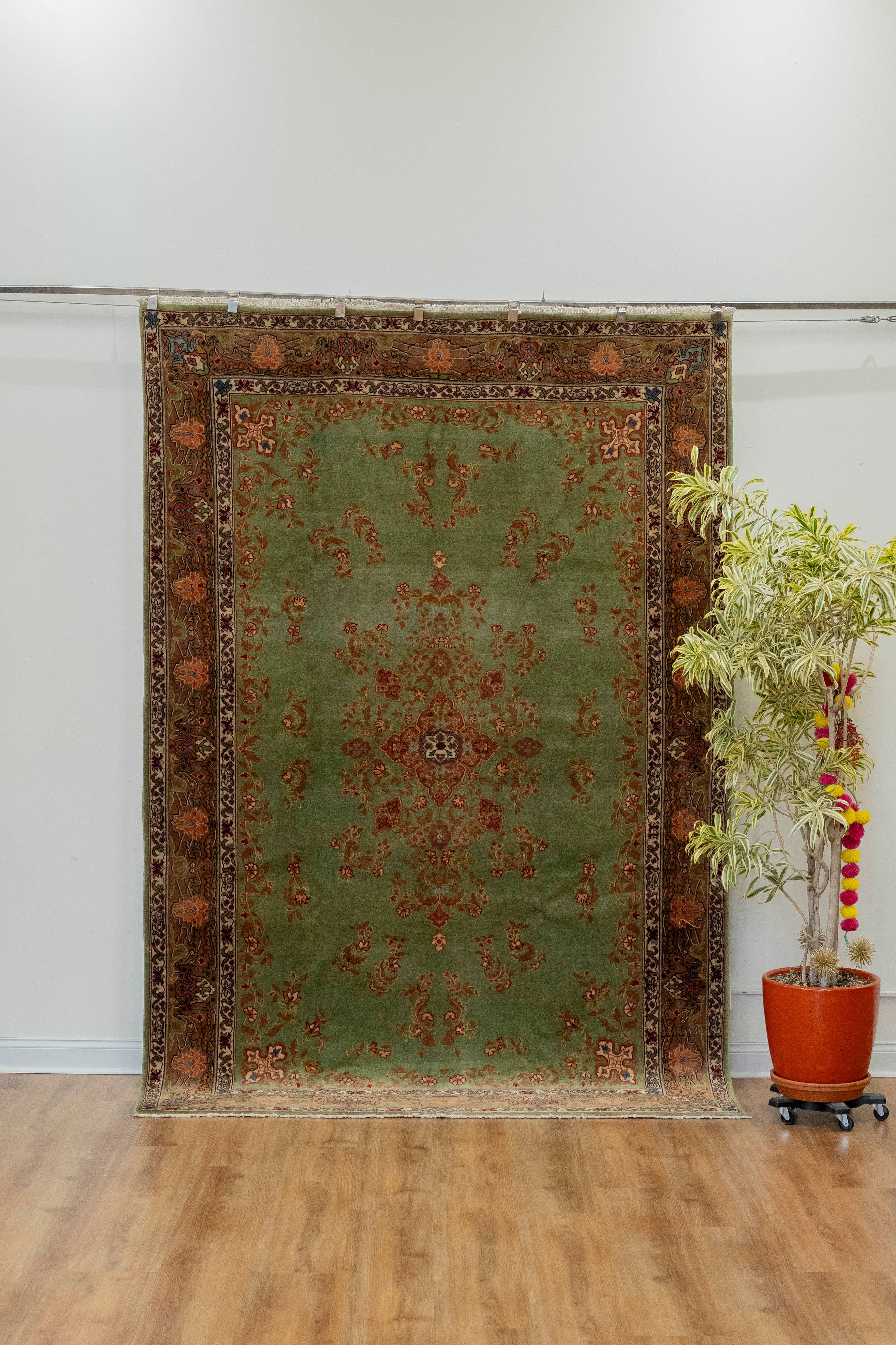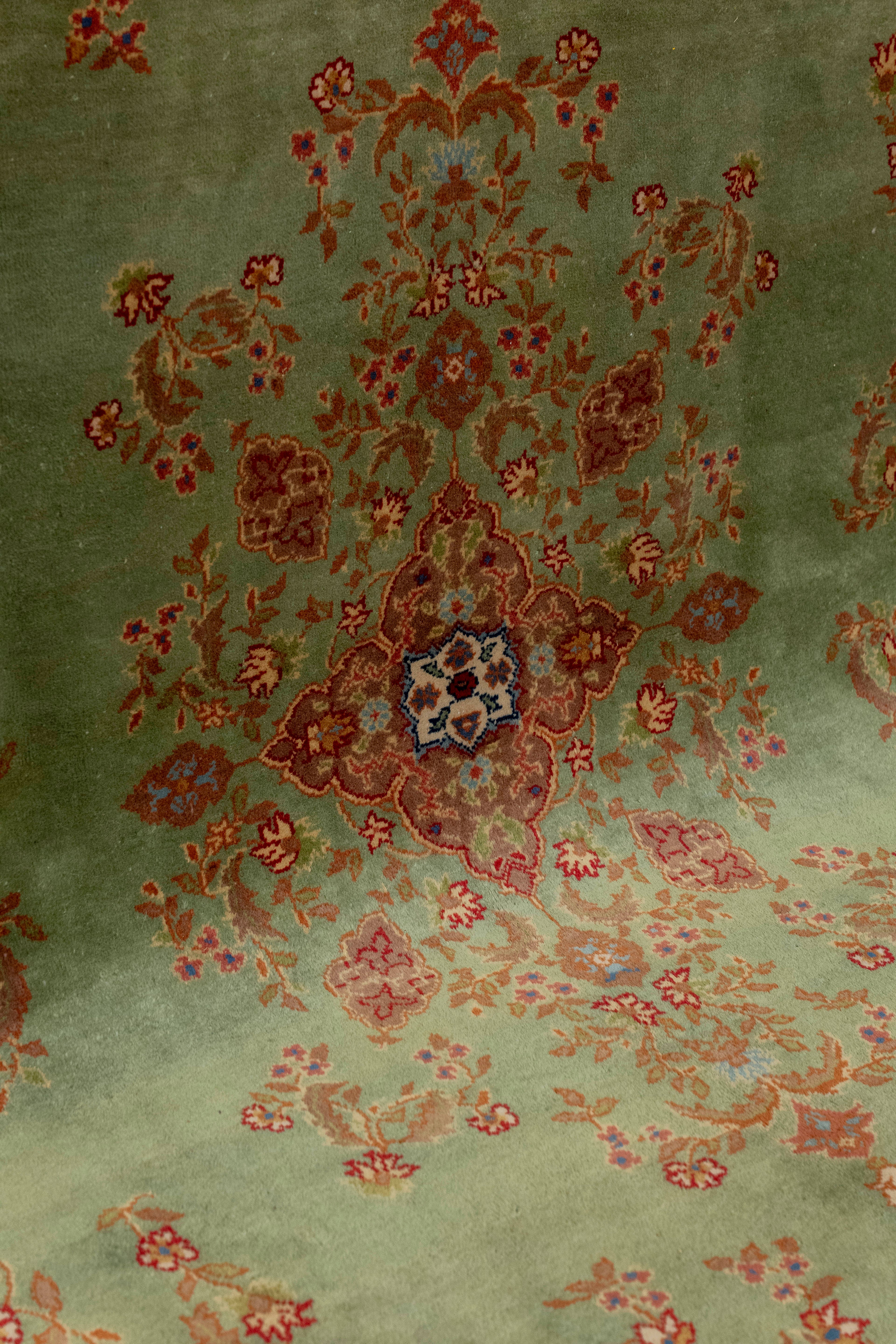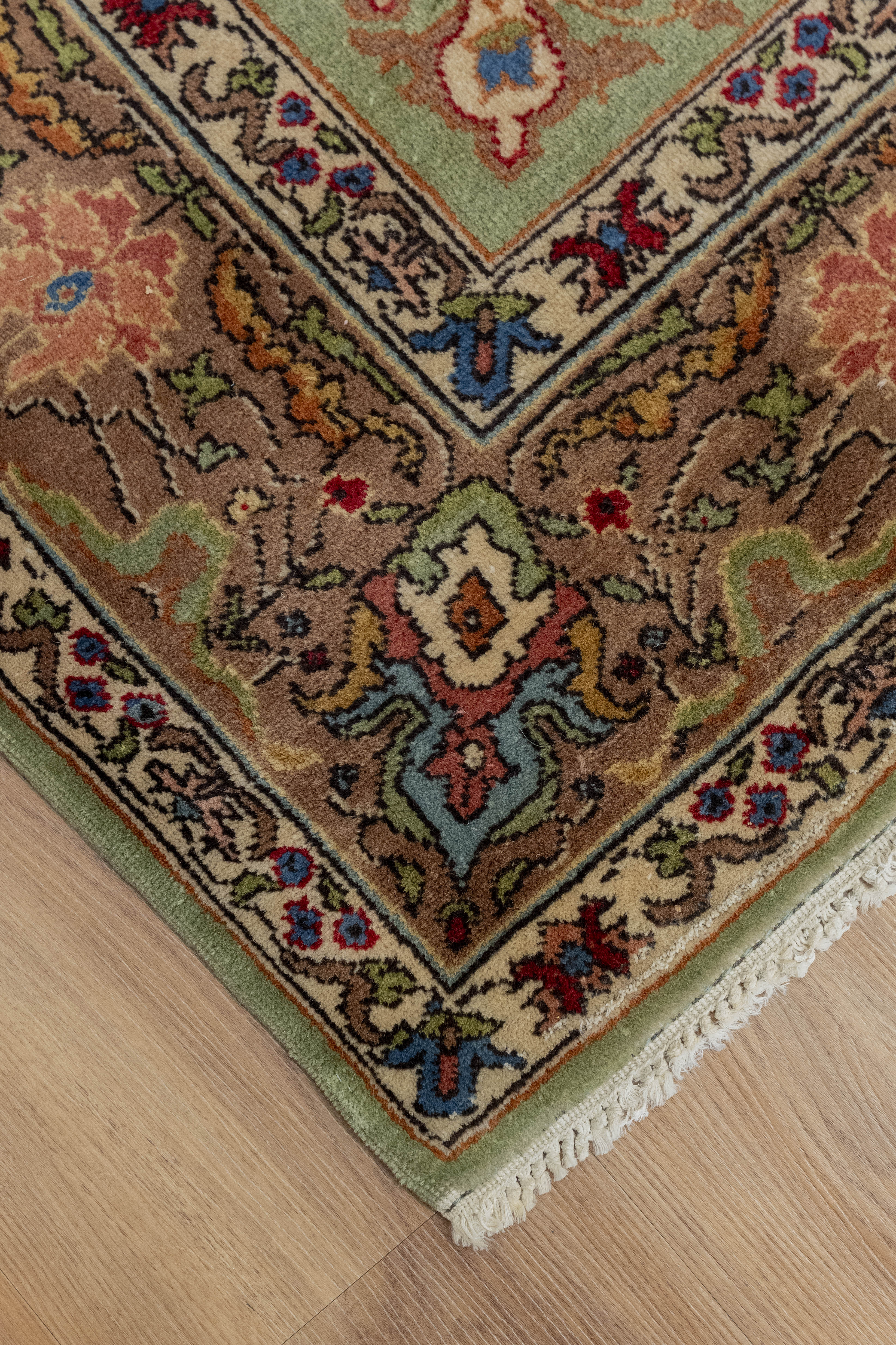 This unique rug, made from a cotton foundation and 100% premium wool pile, is crafted by Oushak ( it is spelled both ways! ) weavers, famed for their silky, luminous material. About 40 years old, it features a floral center medallion against a rare mint green ground, which diverges from the region's typical repeating patterns. Each rug is authentic and handpicked by Nedim himself.