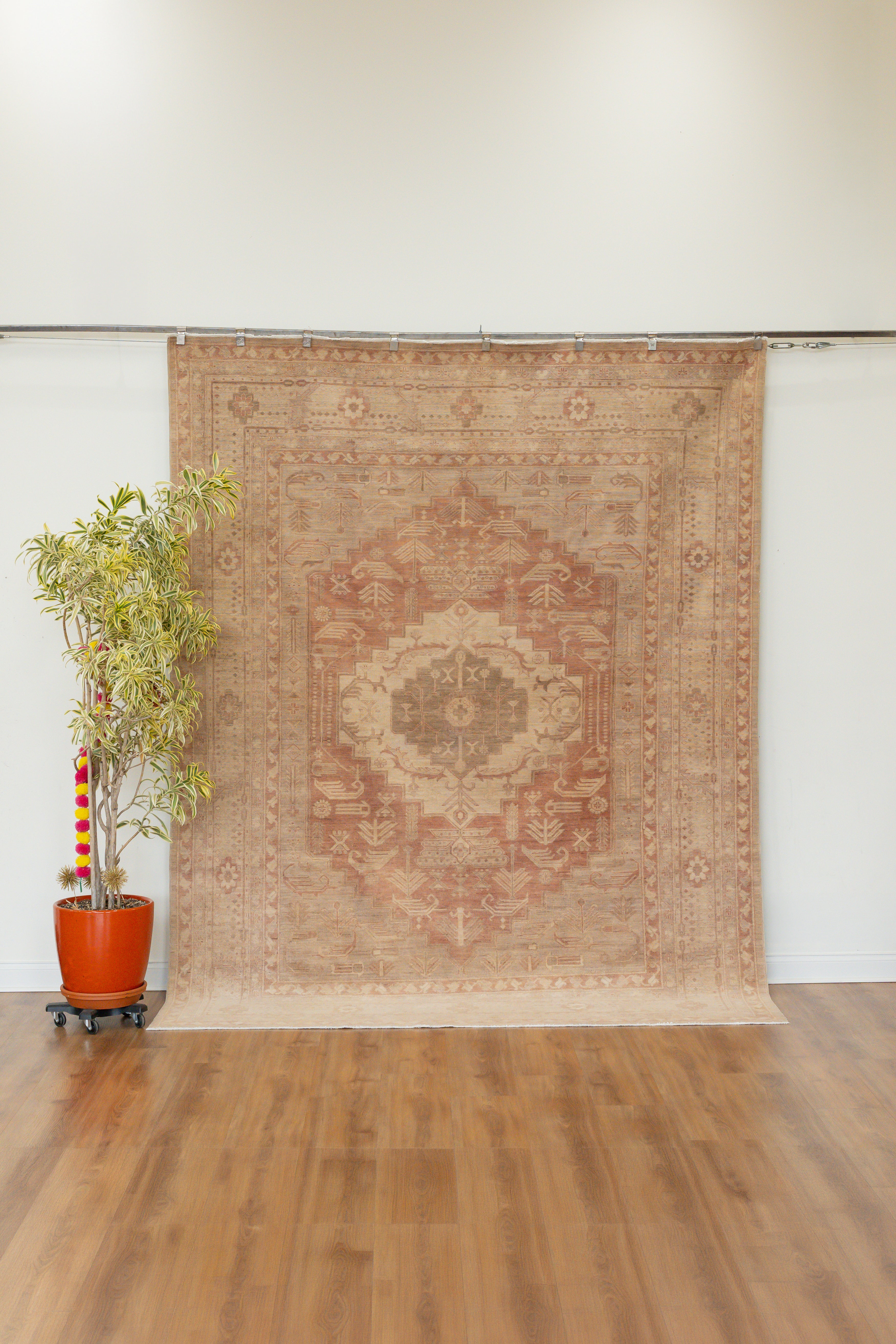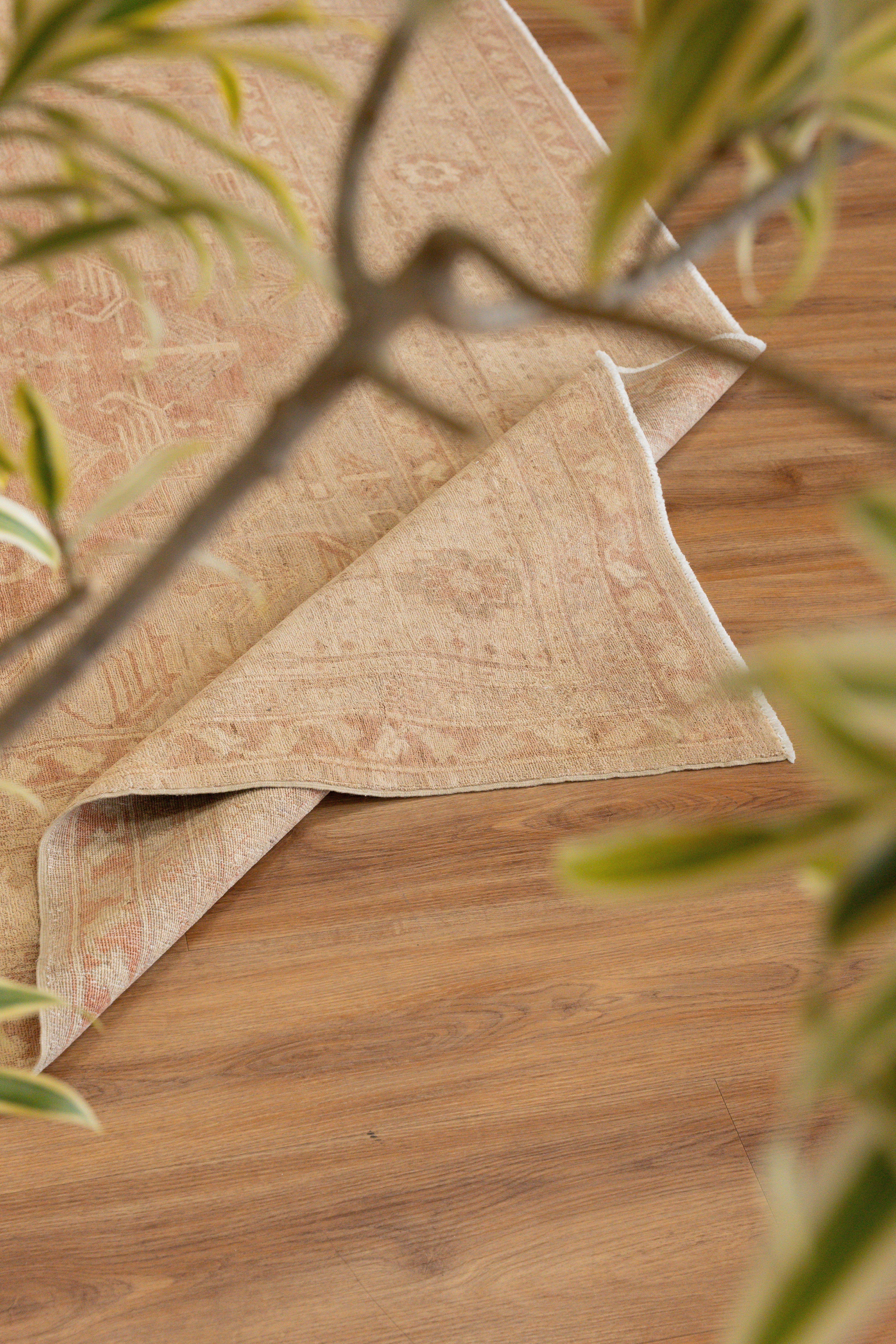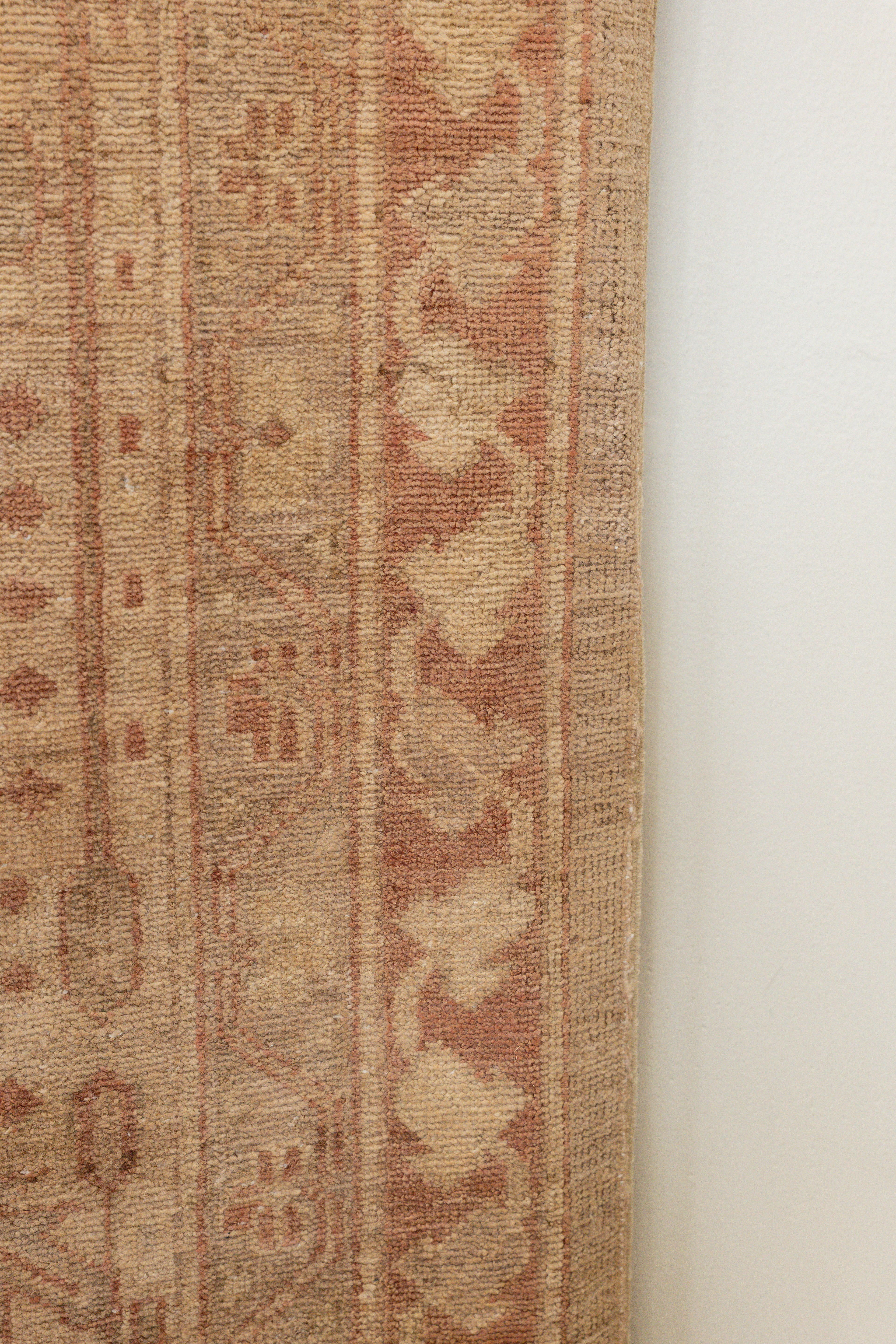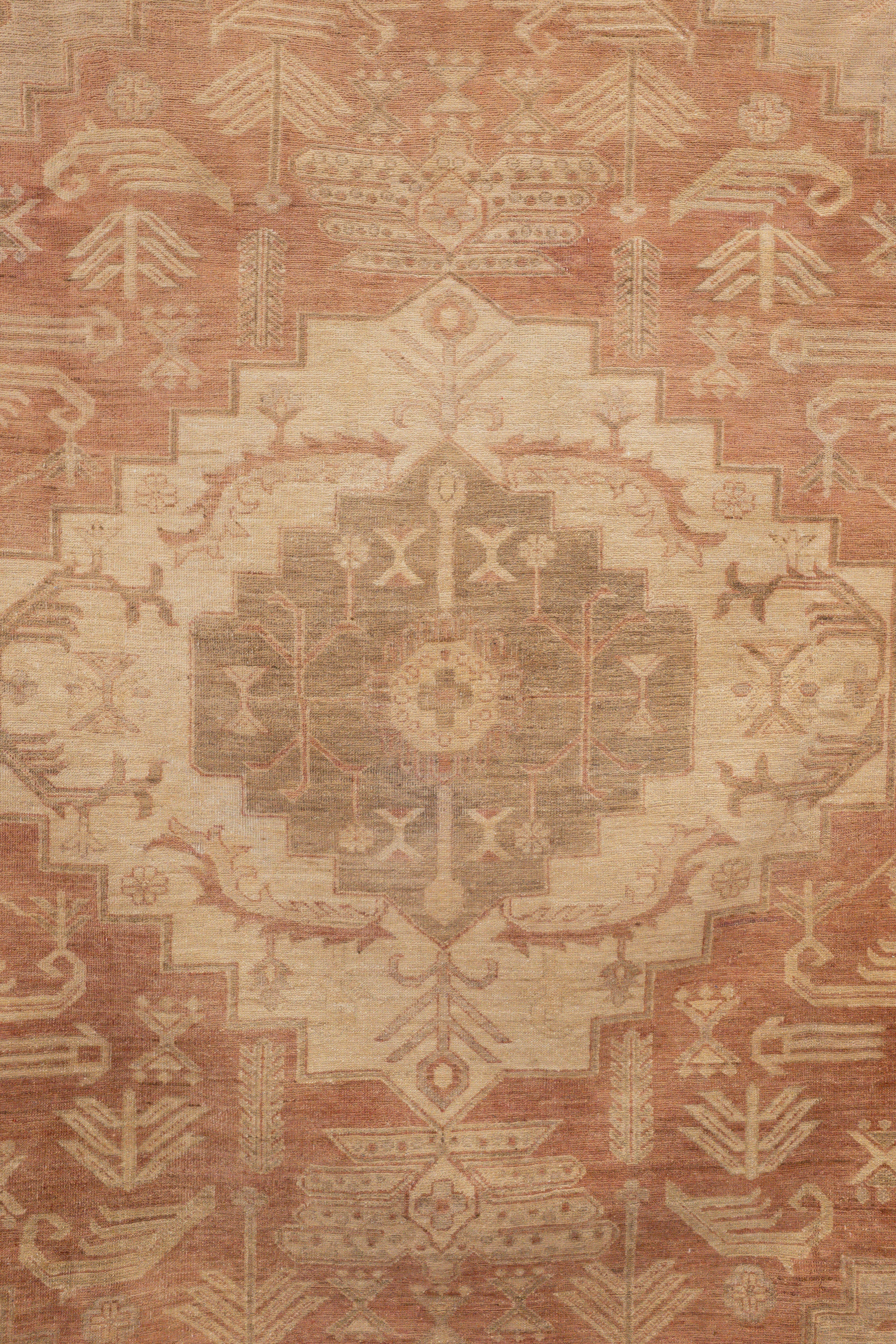 This rug is made from a cotton foundation and 100% premium wool pile. Ushak rugs are famed for their silky, luminous material. This rug features a center geometric motif, and has shades of brown and salmon throughout. Please inspect each photo as this rug shows beautiful signs of time. Each rug is authentic and handpicked by Nedim himself.