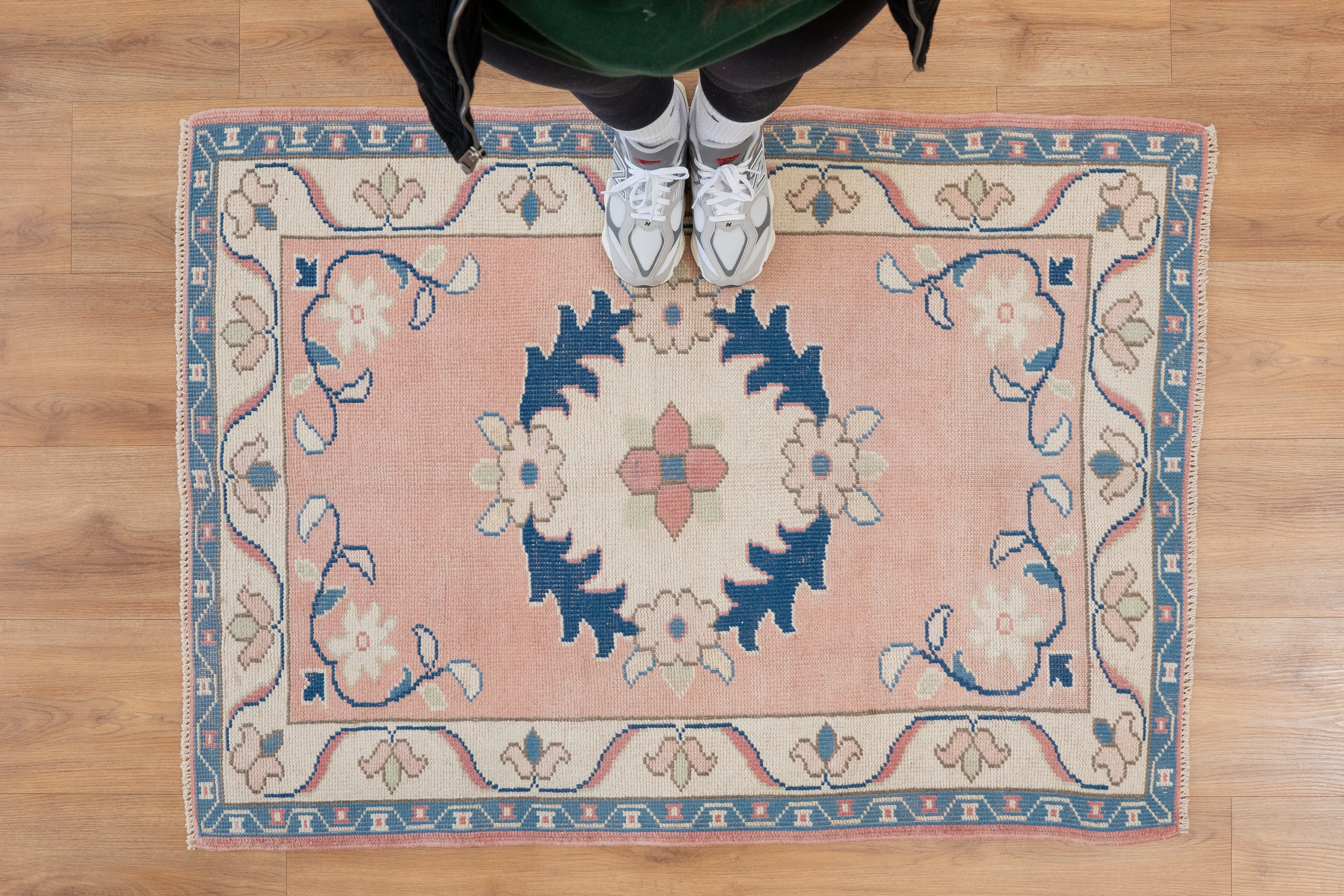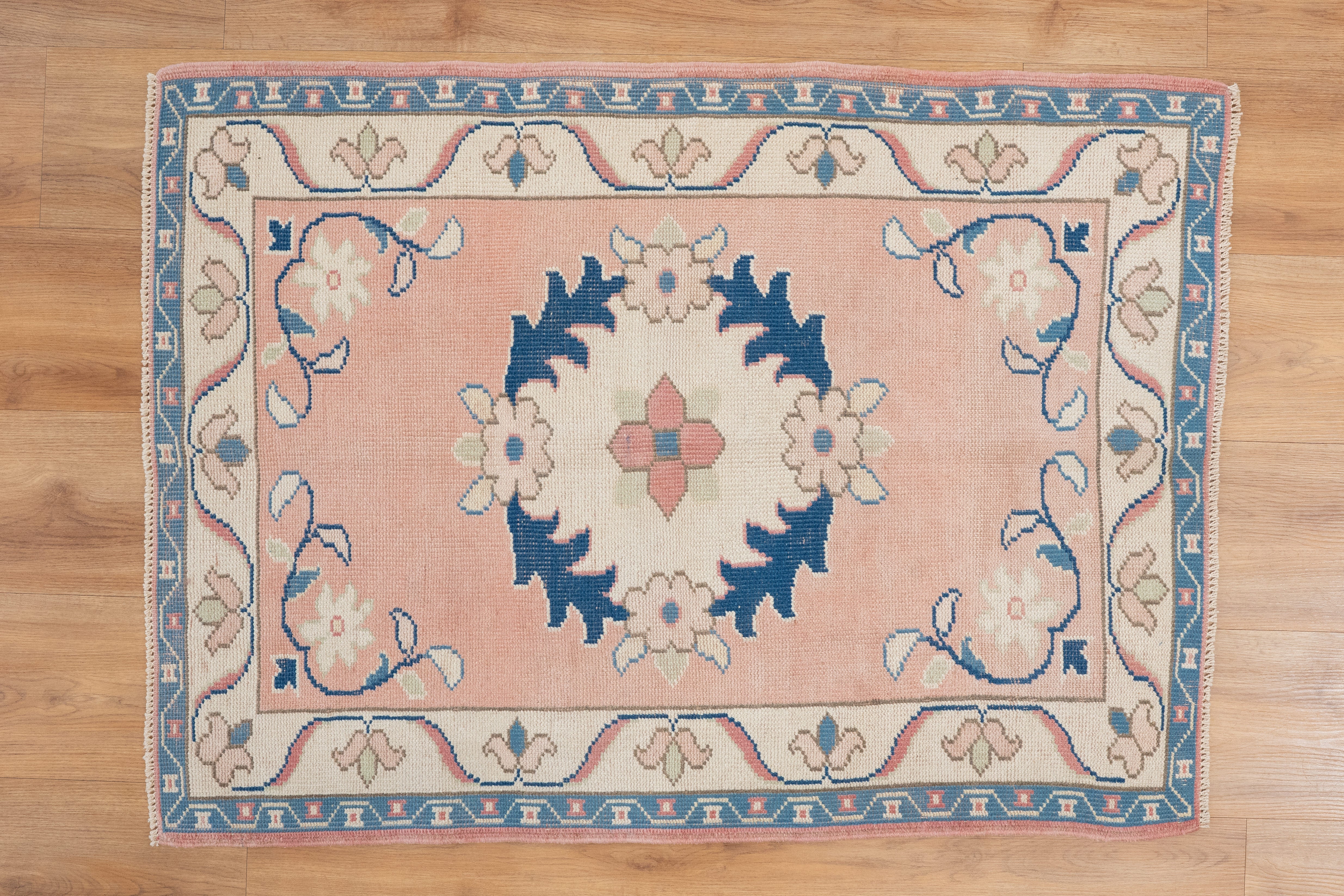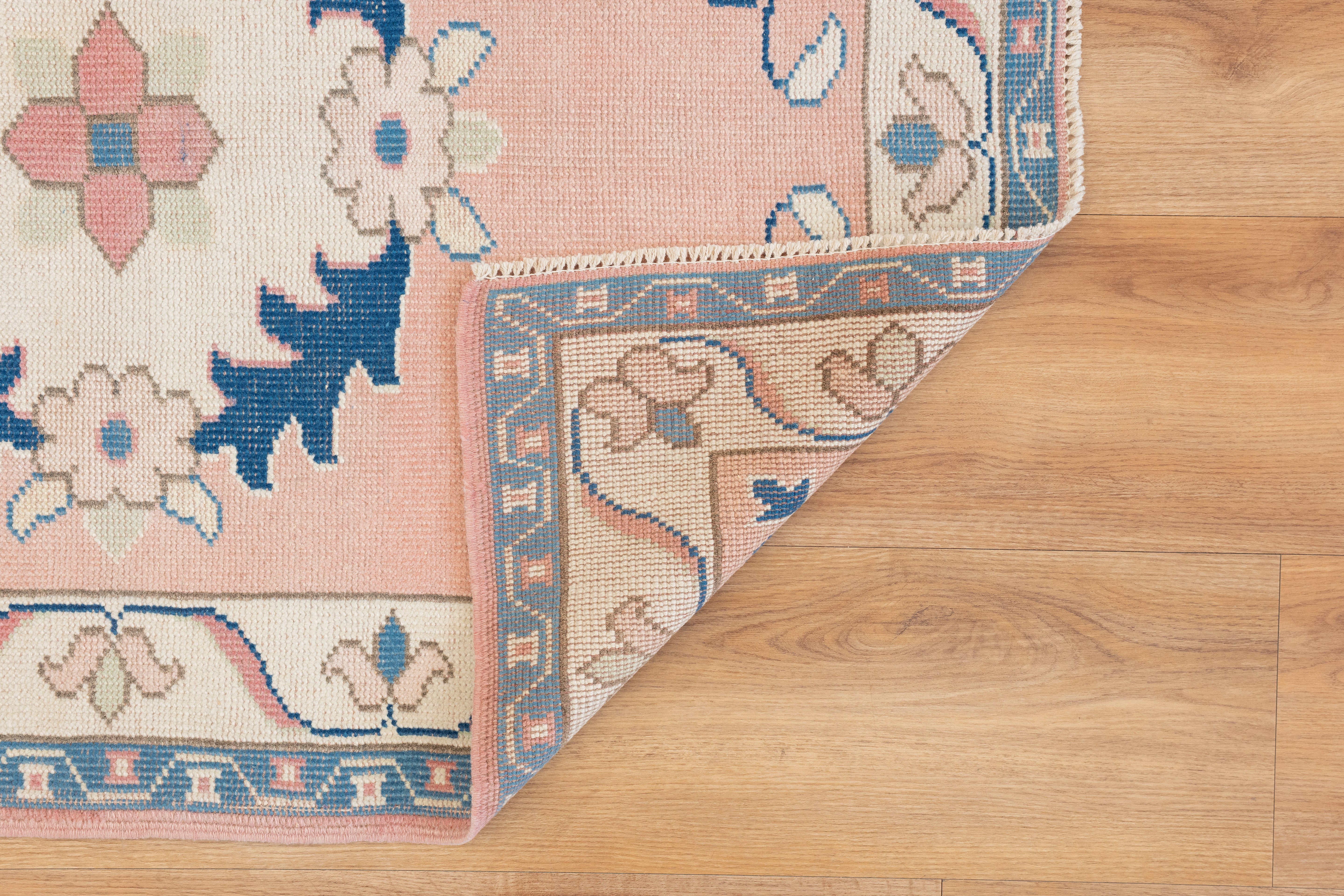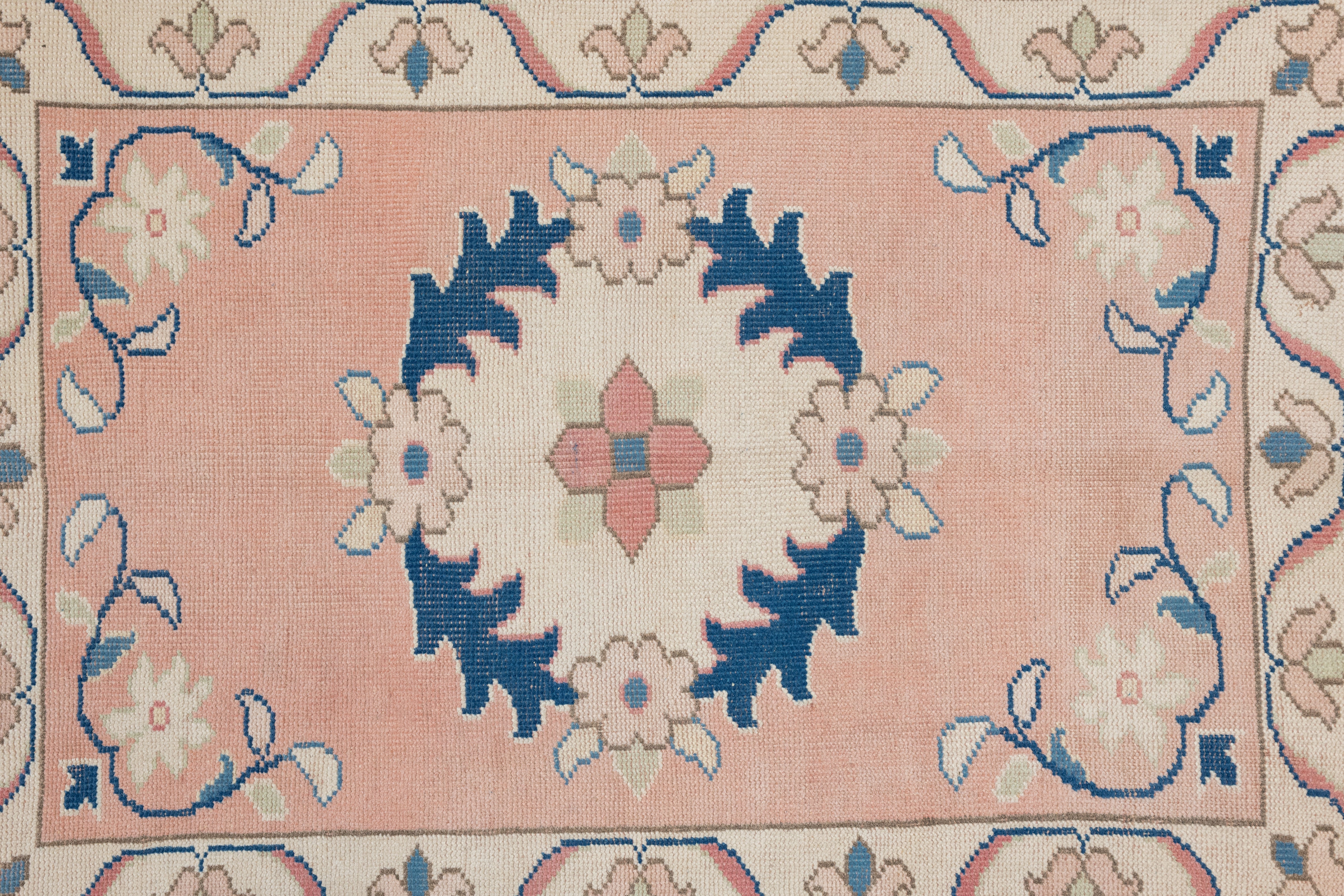 One-of-a-kind vintage rug made from wool and cotton. Ideal for an entryway, bathroom, or reading nook. The traditional tribal floral motifs are set on a baby-pink color ground. All of our rugs are authentic, and carefully handpicked by Nedim.