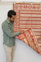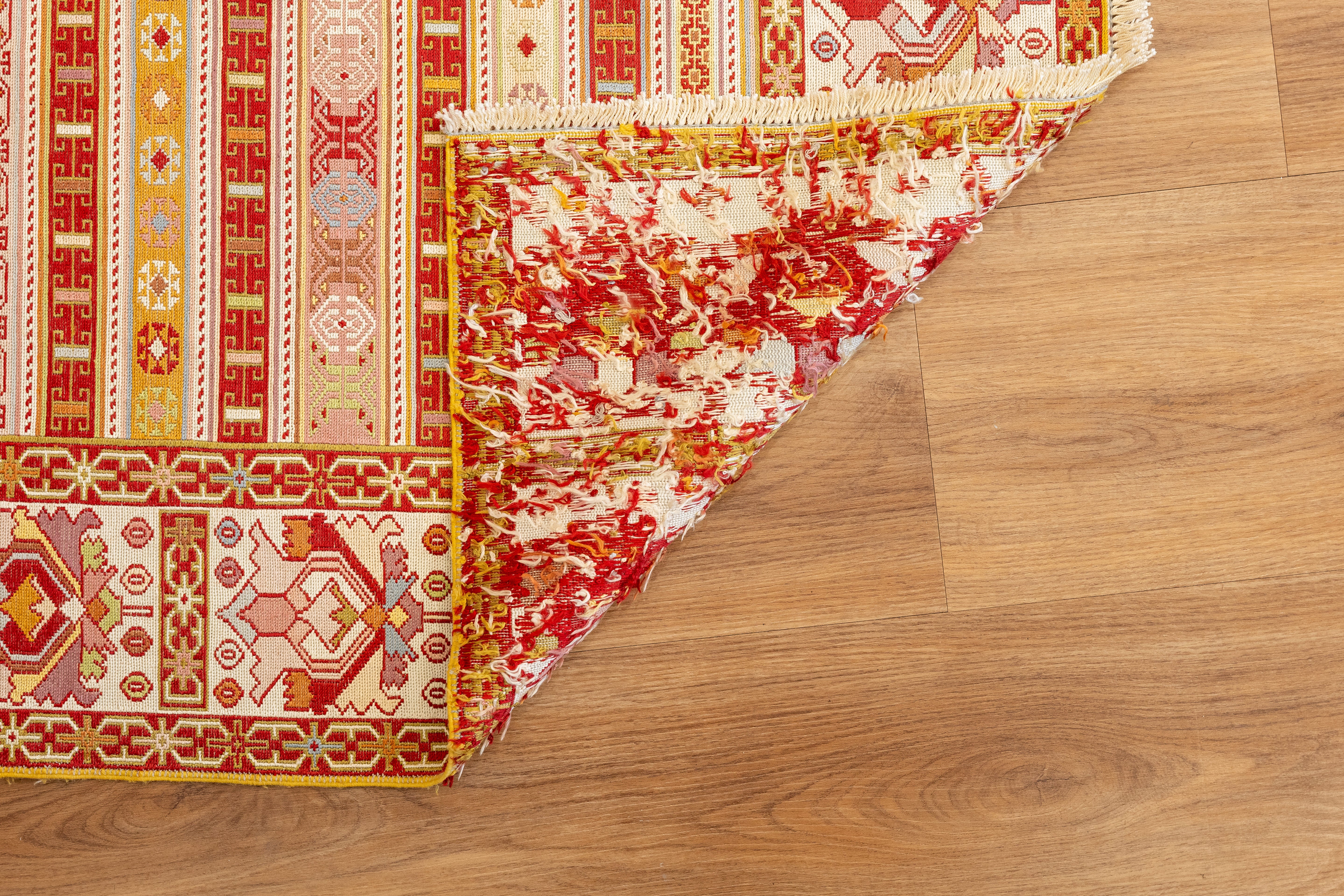 This one-of-a-kind Sumak rug (also spelled Soumak) is embroidered in silk. These rugs are flat-weave but thicker than Kilims, although both weaves are considered pileless rugs. Unlike Kilims, Sumak rugs are not reversible because non-clipped yarns are left on the back. This rug features the lotus motif and a remarkable luster that comes from its 100% silk content. This small rug can be framed and used as tapestry art, or on the floor in low-traffic areas. Each one of our rugs is authentic and handpicked by Nedim himself.