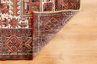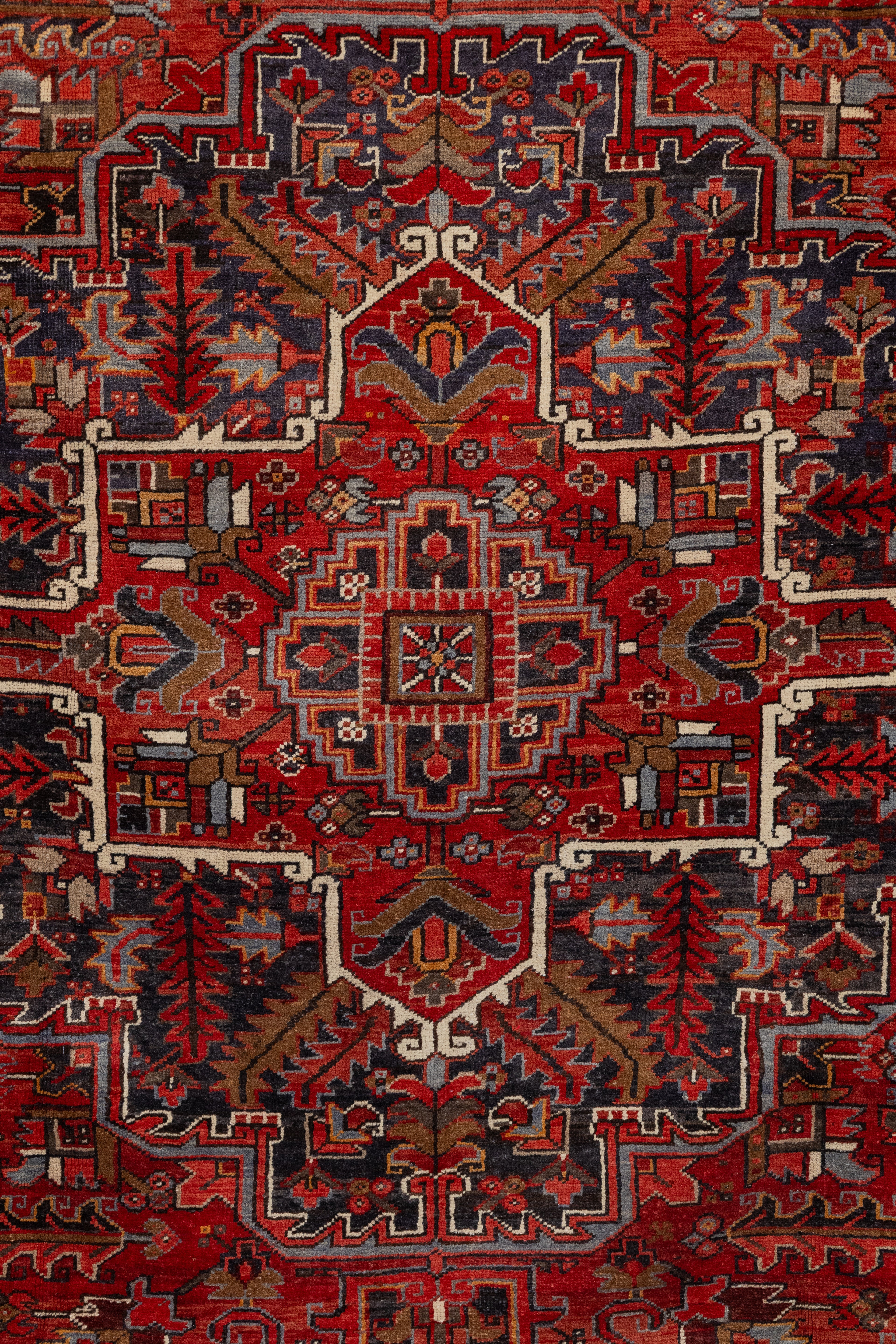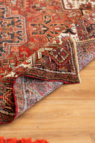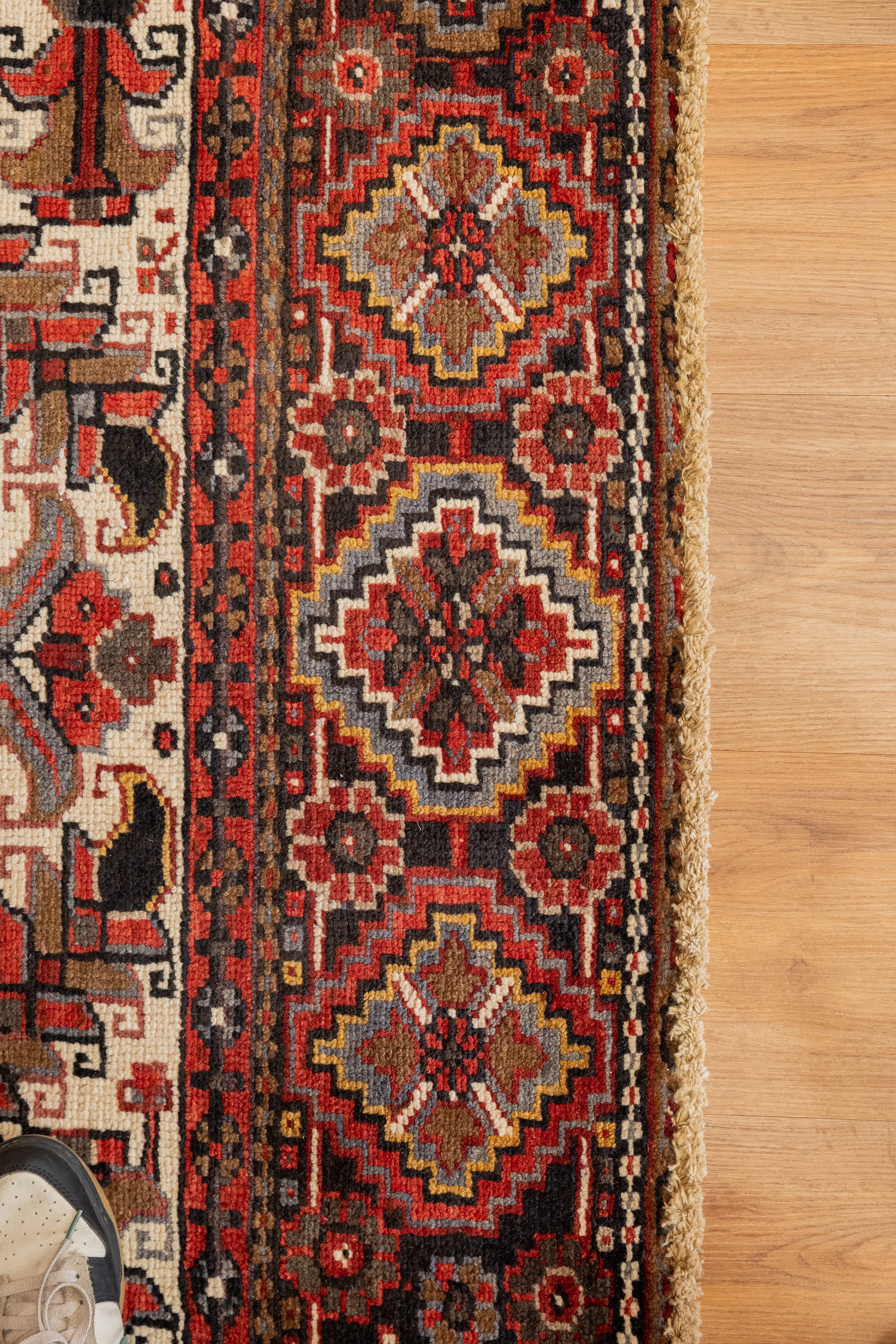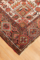 This one-of-a-kind vintage rug is handmade with a cotton foundation and a wool pile. Heriz rugs are celebrated for their chunky, coarse construction, which makes them some of the most resilient oriental rugs - perfect for high-traffic areas - yet they still provide a luxuriously soft, velvety feel underfoot. This piece features a classic geometric central medallion surrounded by geometric floral and tribal motifs in rich tones of coral red, khaki green, and ivory. Each of our rugs is authentic and carefully handpicked by Nedim himself.