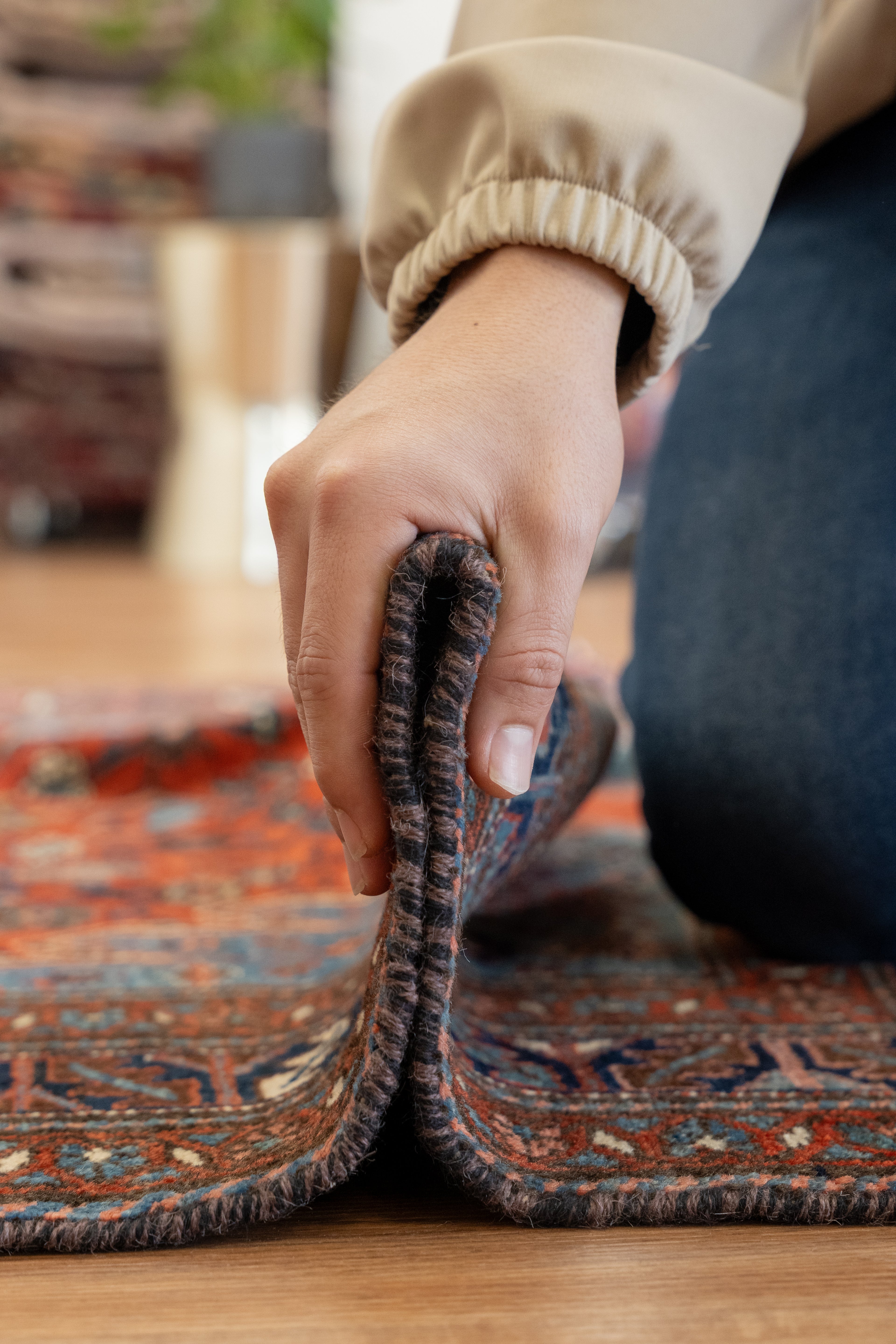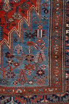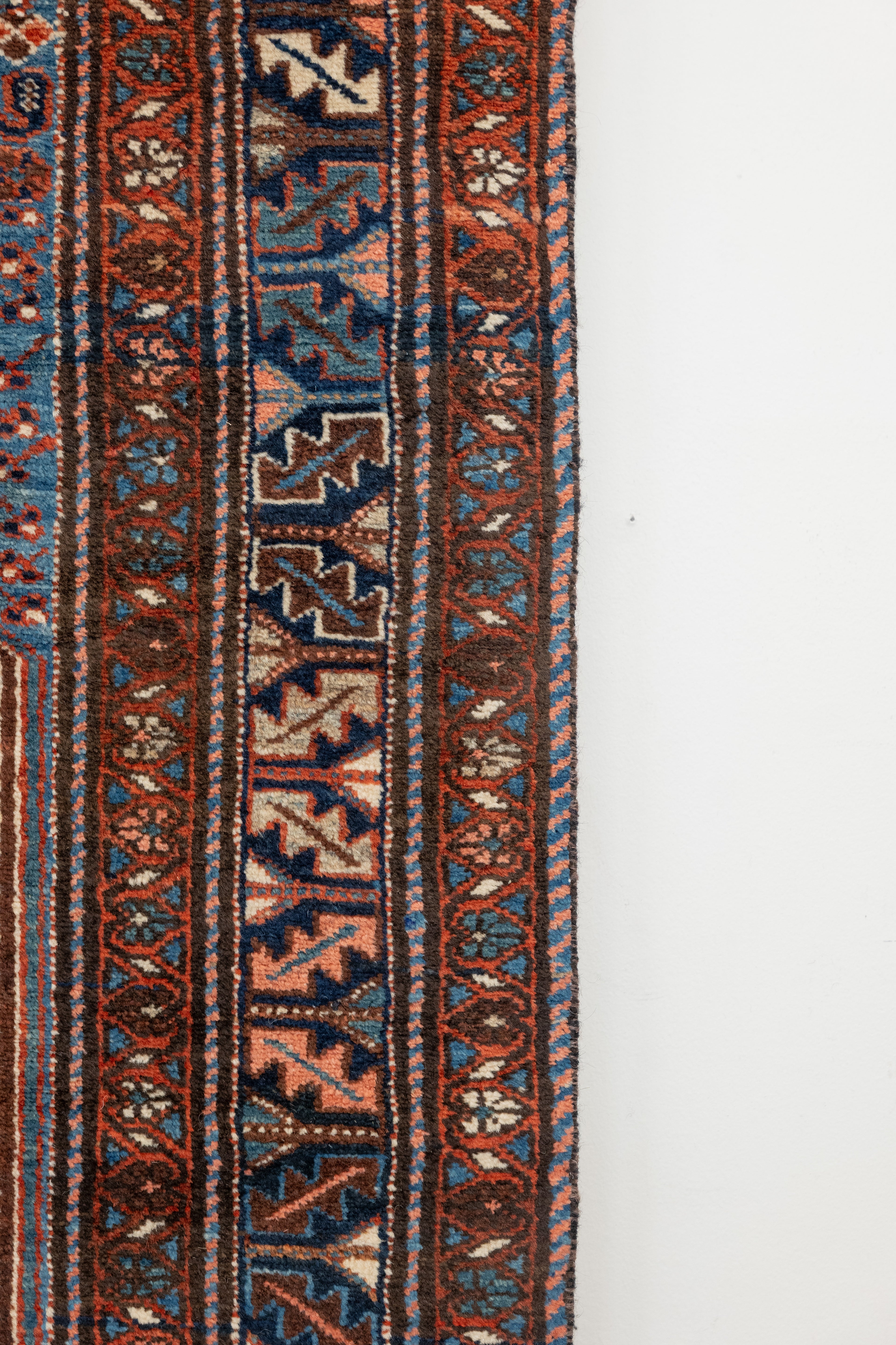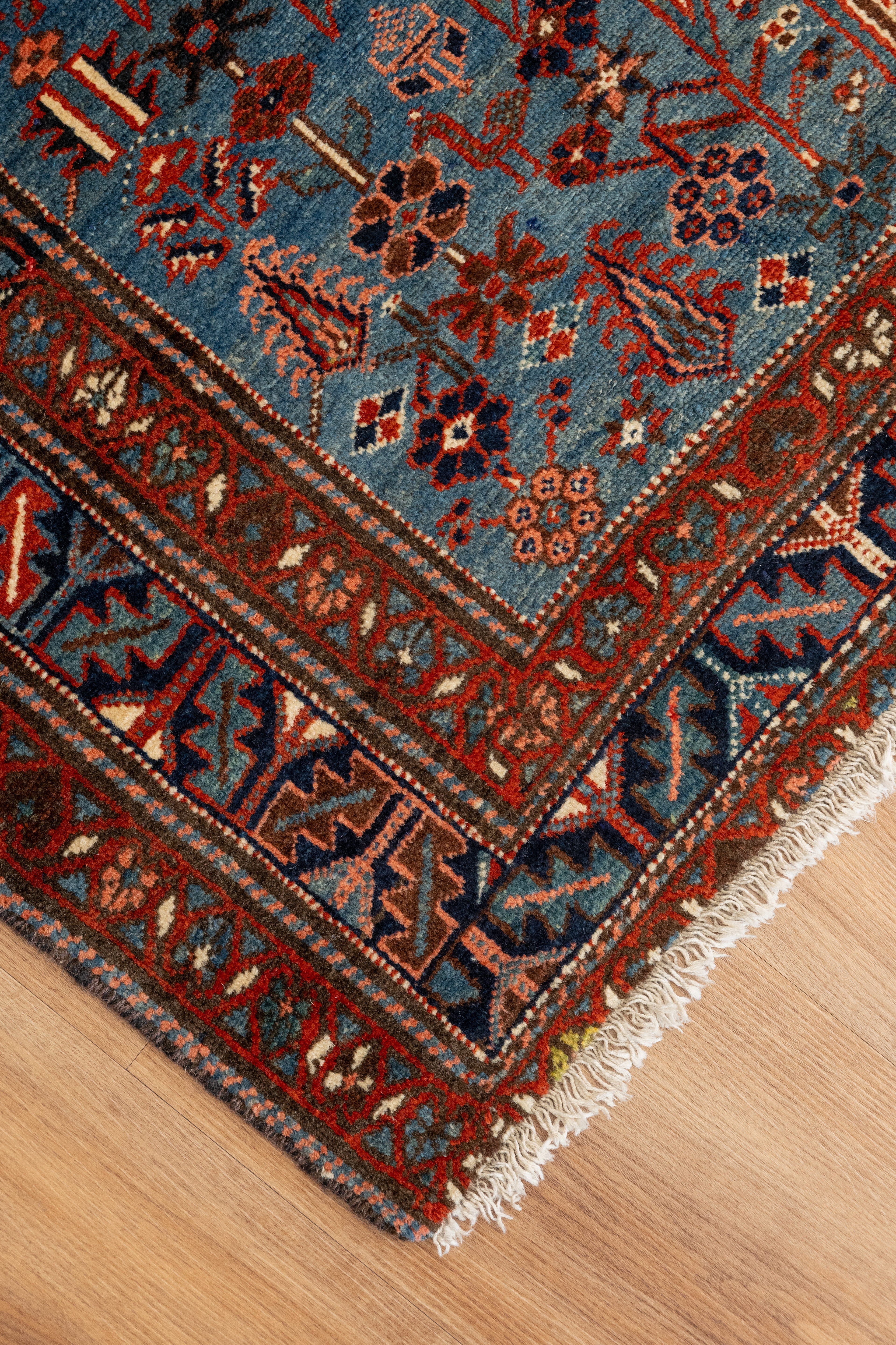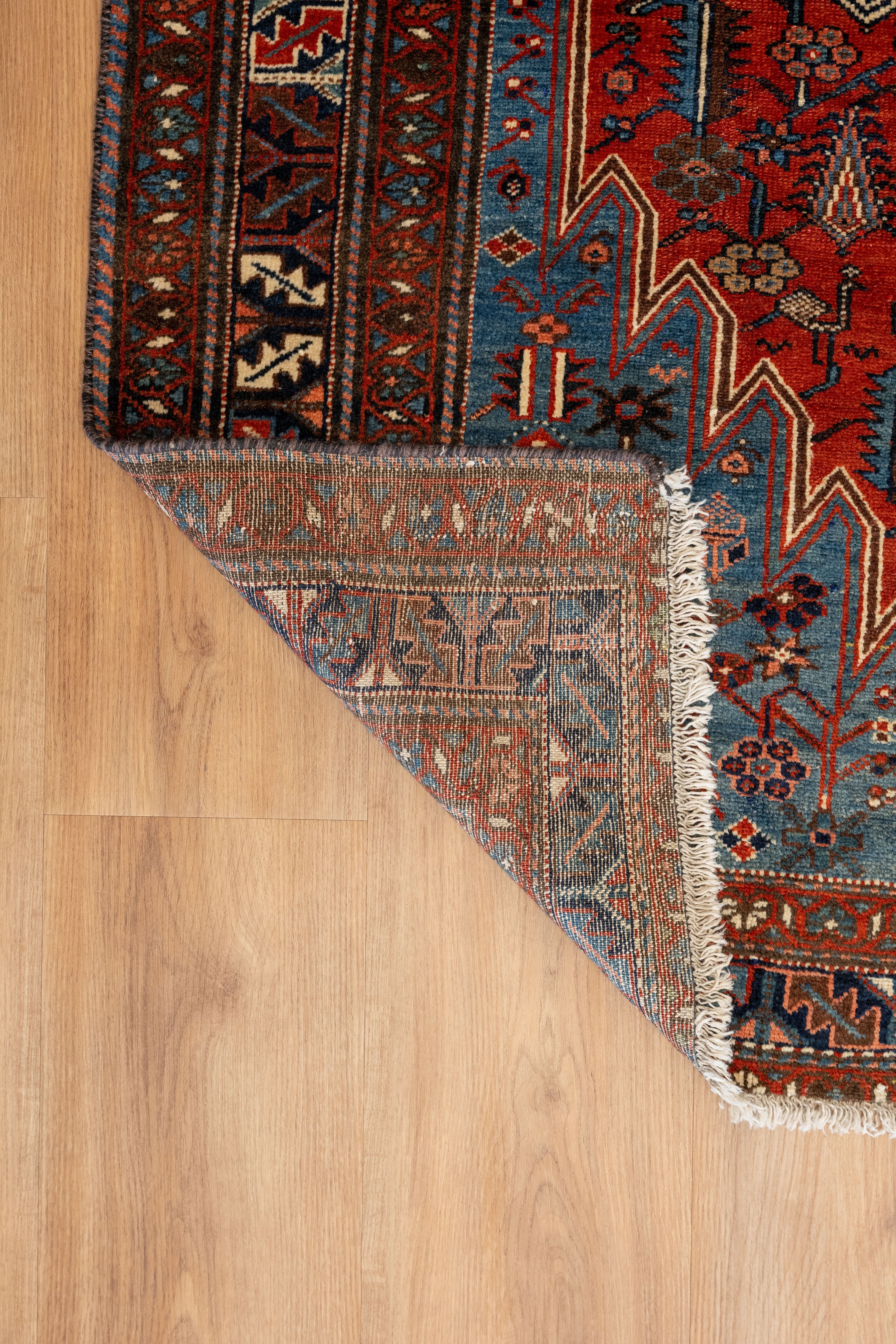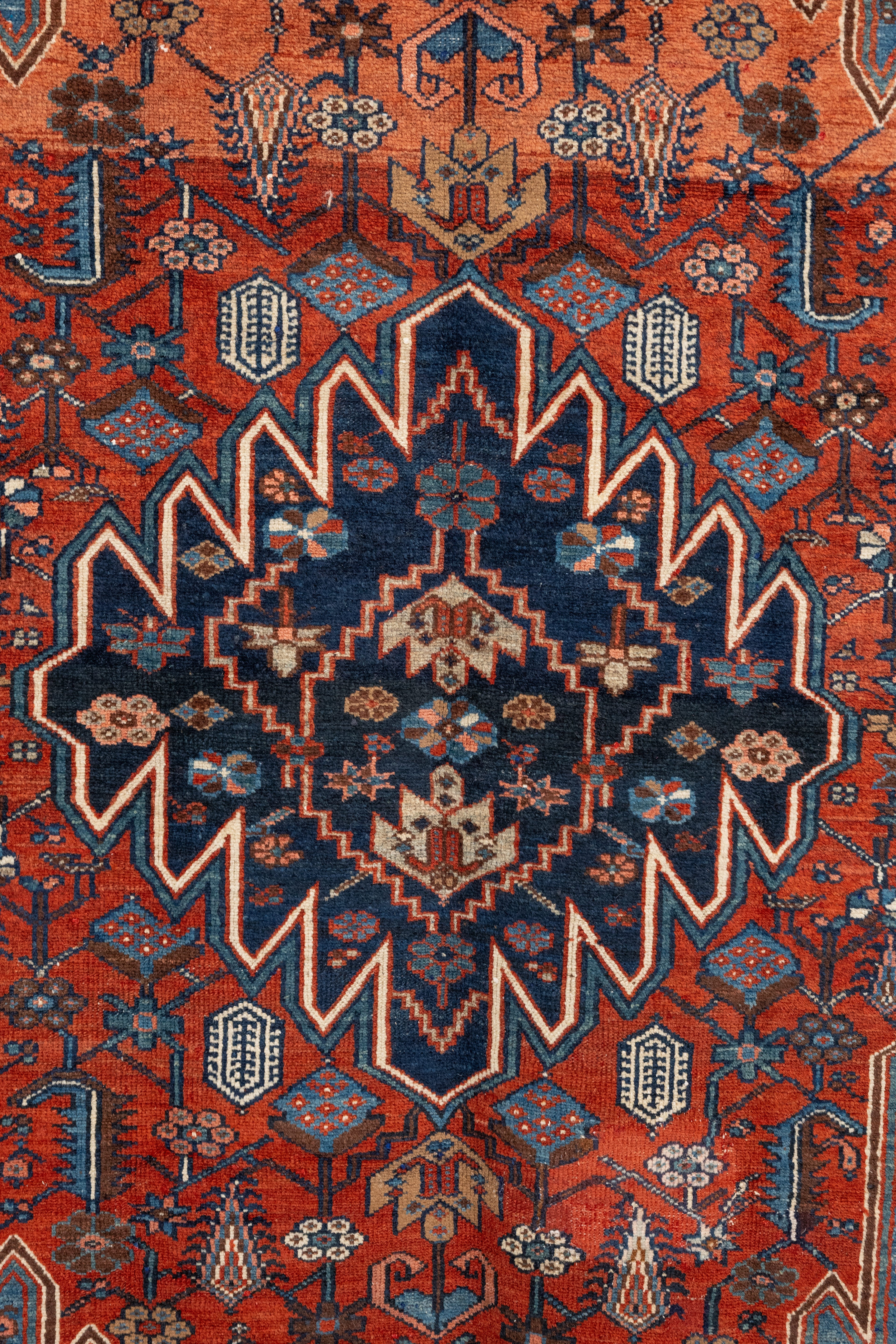 This unique rug is crafted from premium, 100% wool. The traditional motifs, featuring peacock birds and cypresses, are woven on a blue ground and again on a dark orange within the medallion. The frame has geometric leaf motifs. This rug boasts an unusual all-over design, atypical of this area of the world. Approximately 50 years old, this rug has a few skillfully executed restorations; please inspect all photos. All of our rugs are authentic and carefully handpicked by Nedim.