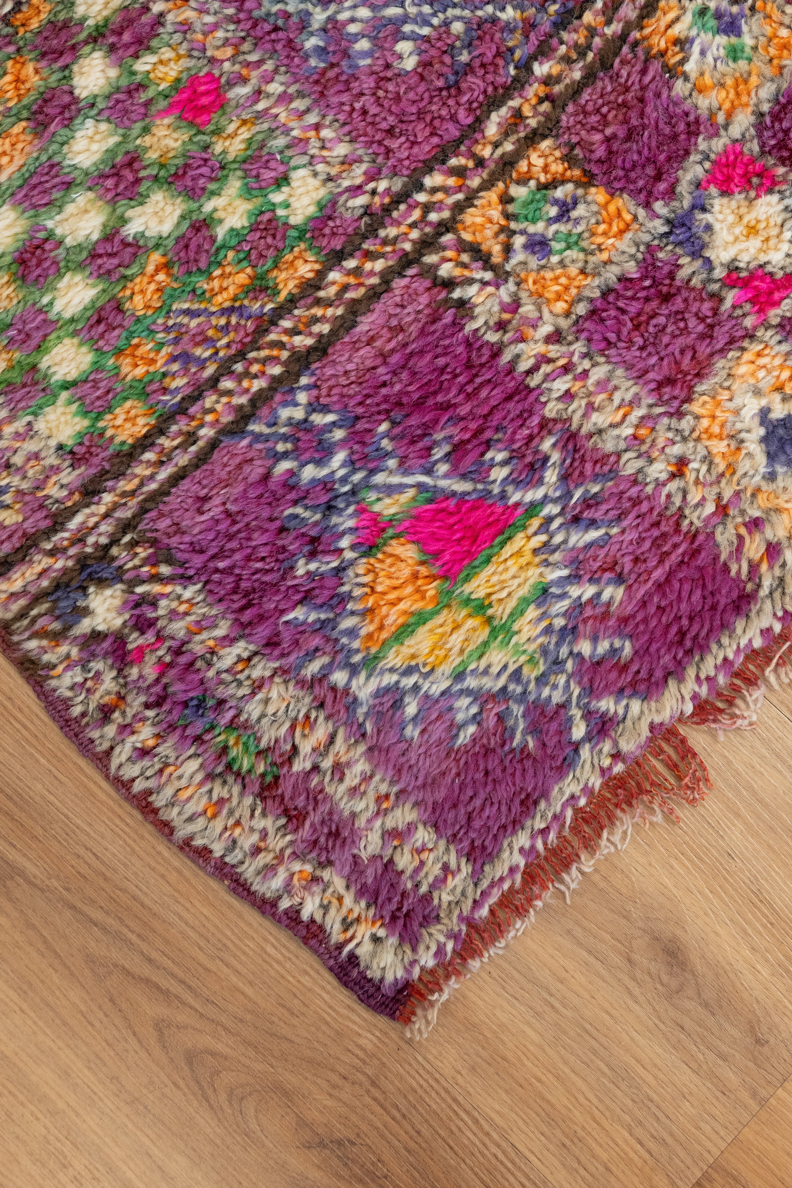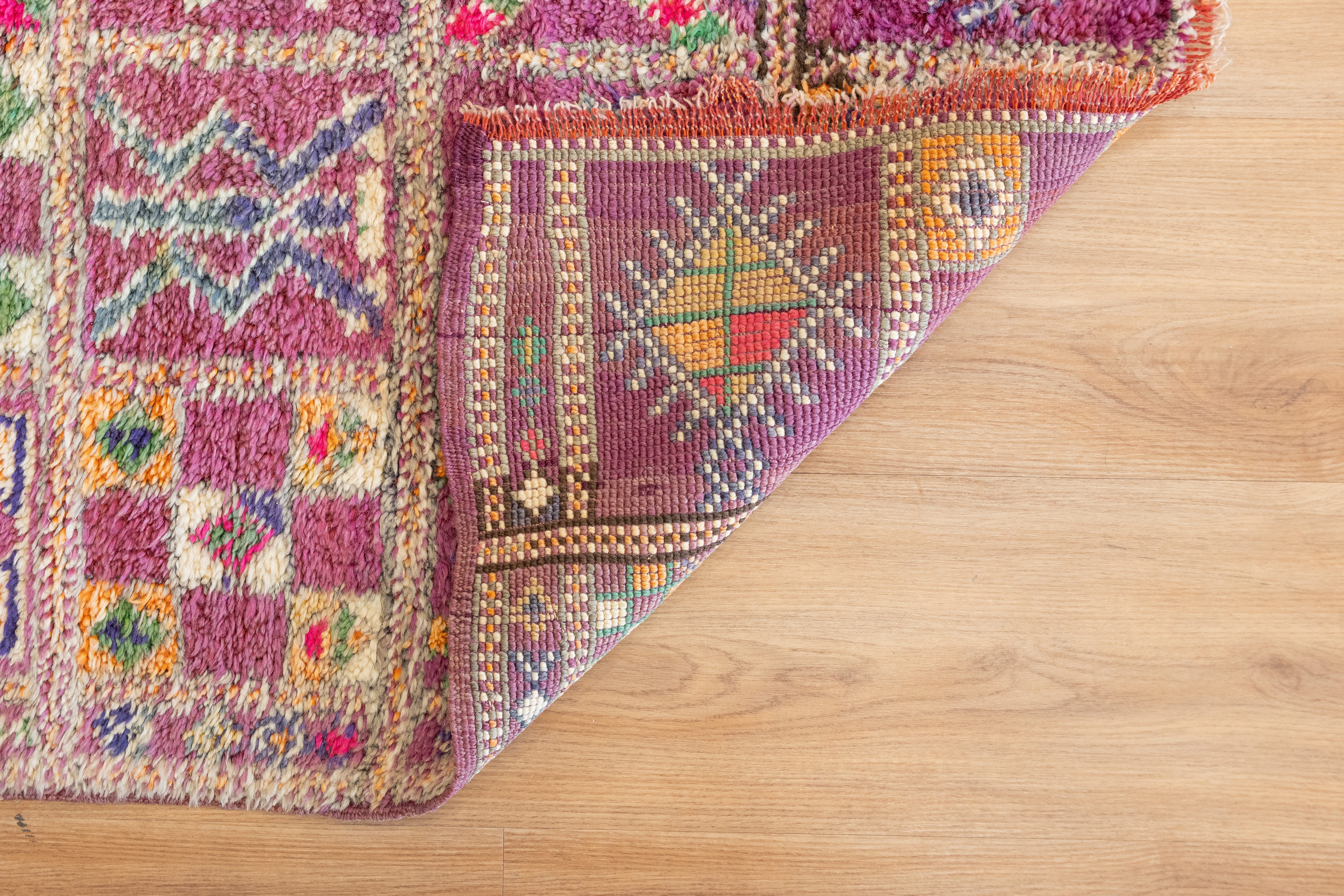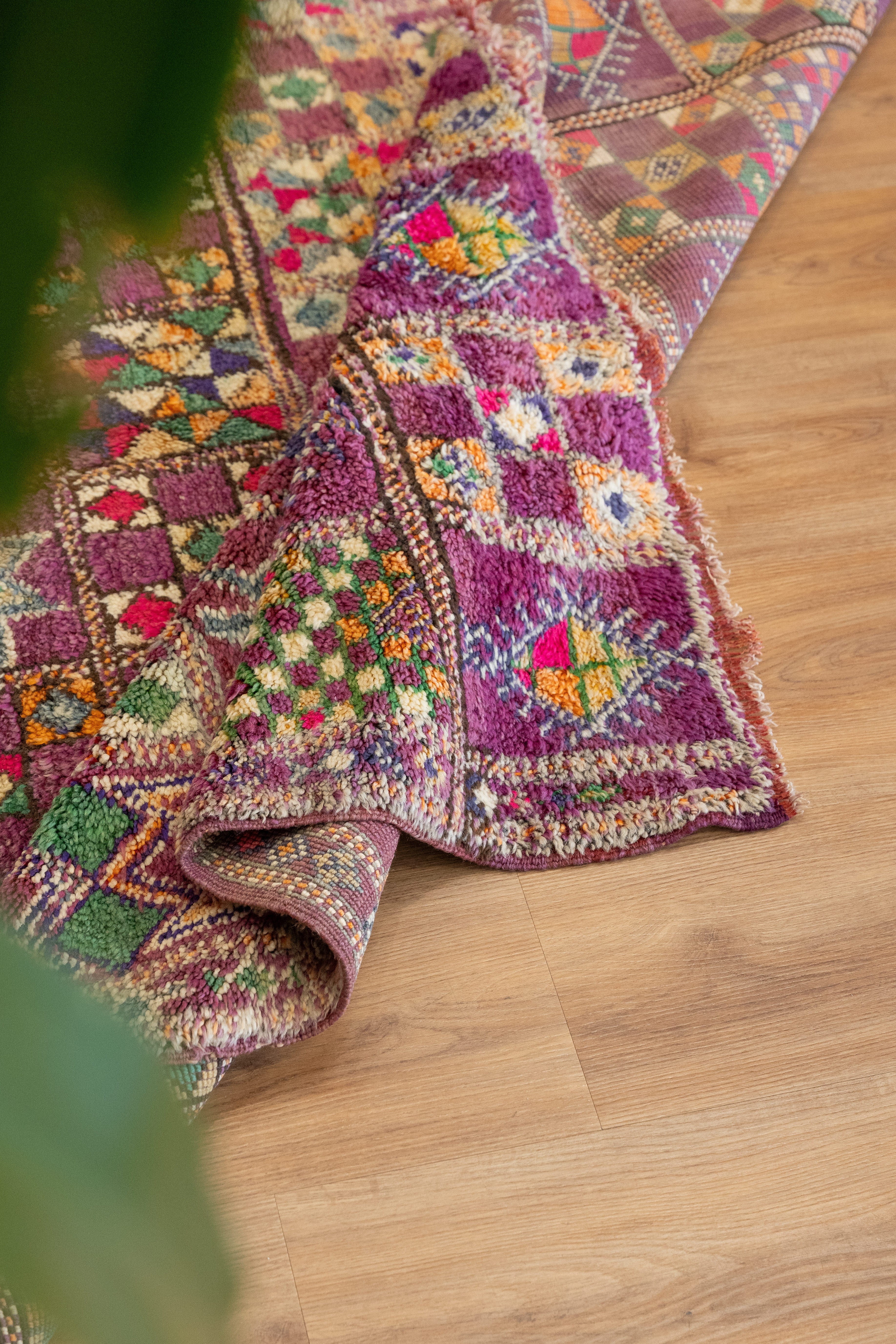 This one-of-a-kind plush rug is handcrafted from 100% wool. Approximately 30 years old, its quality craftsmanship ensures it remains soft, durable, and vibrant for years to come. Moroccan rugs are known for their pastel tones and subtle hues - commonly coral pink, light grey, and persimmon orange. This particular piece stands out with rare purple hues and traditional green star motifs, adding a unique cultural charm. Please inspect all photos, irregular shape and a few carefully executed restorations are part of the preservation of character and authenticity. Each rug in our collection is authentic and personally handpicked by Nedim.