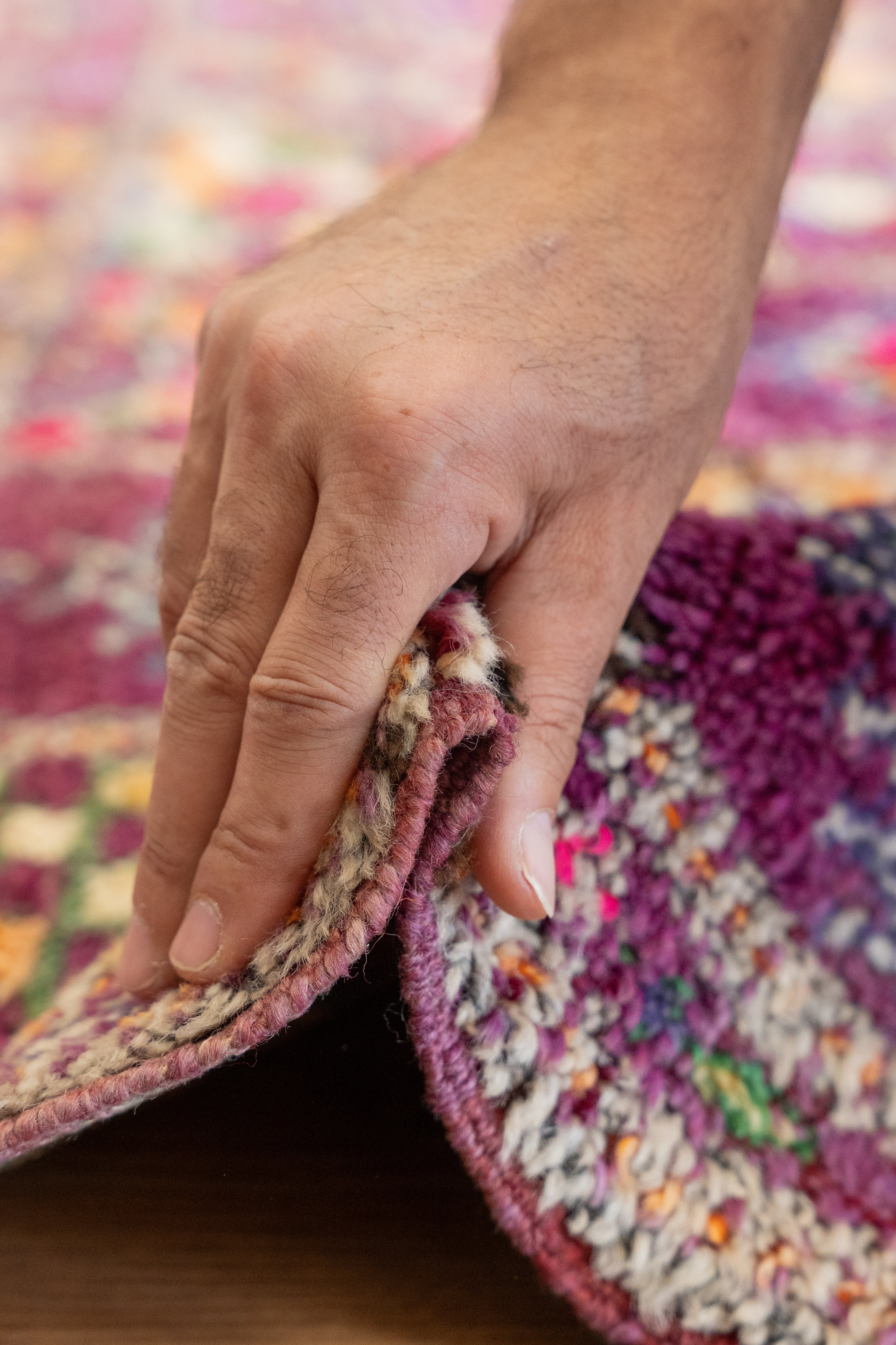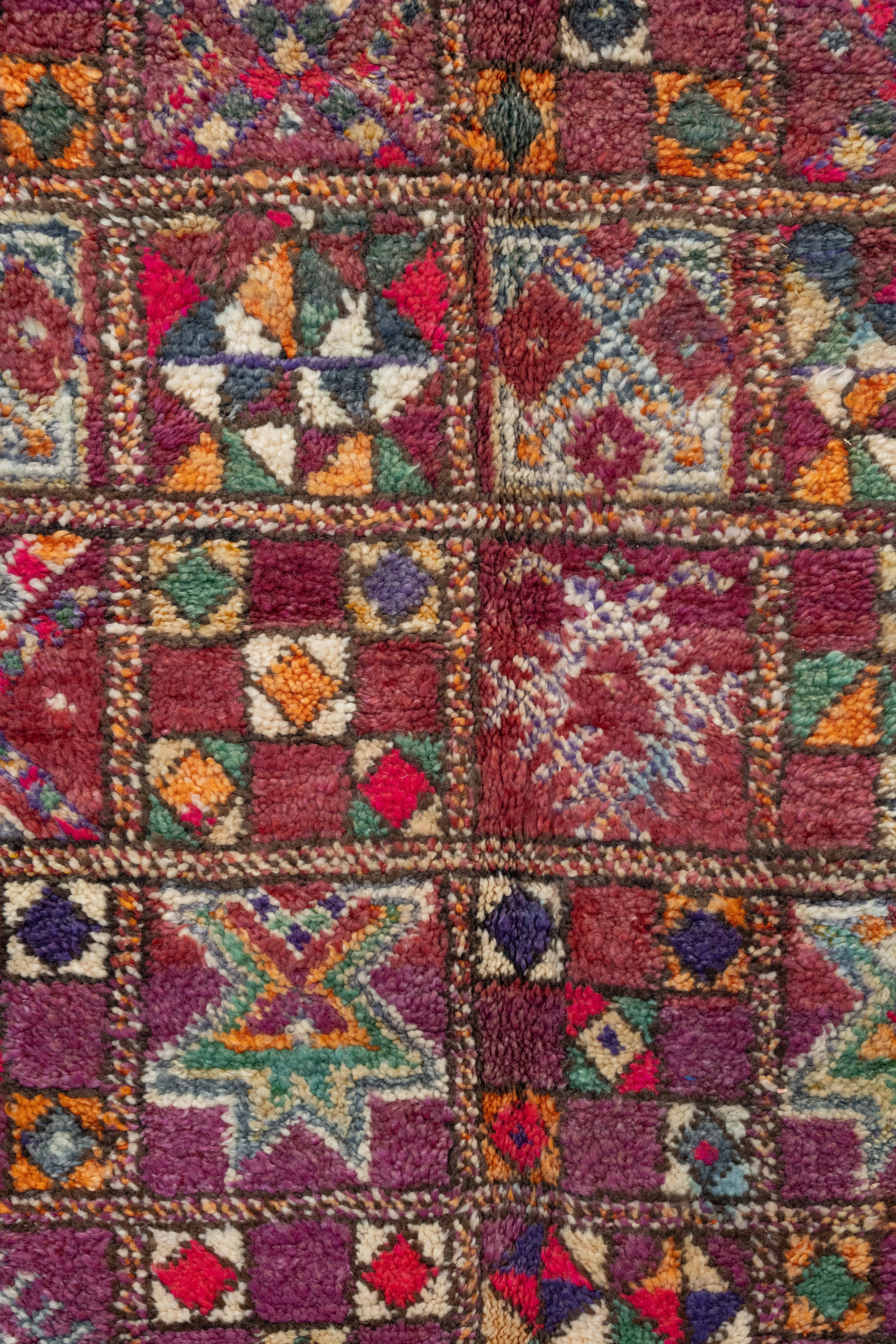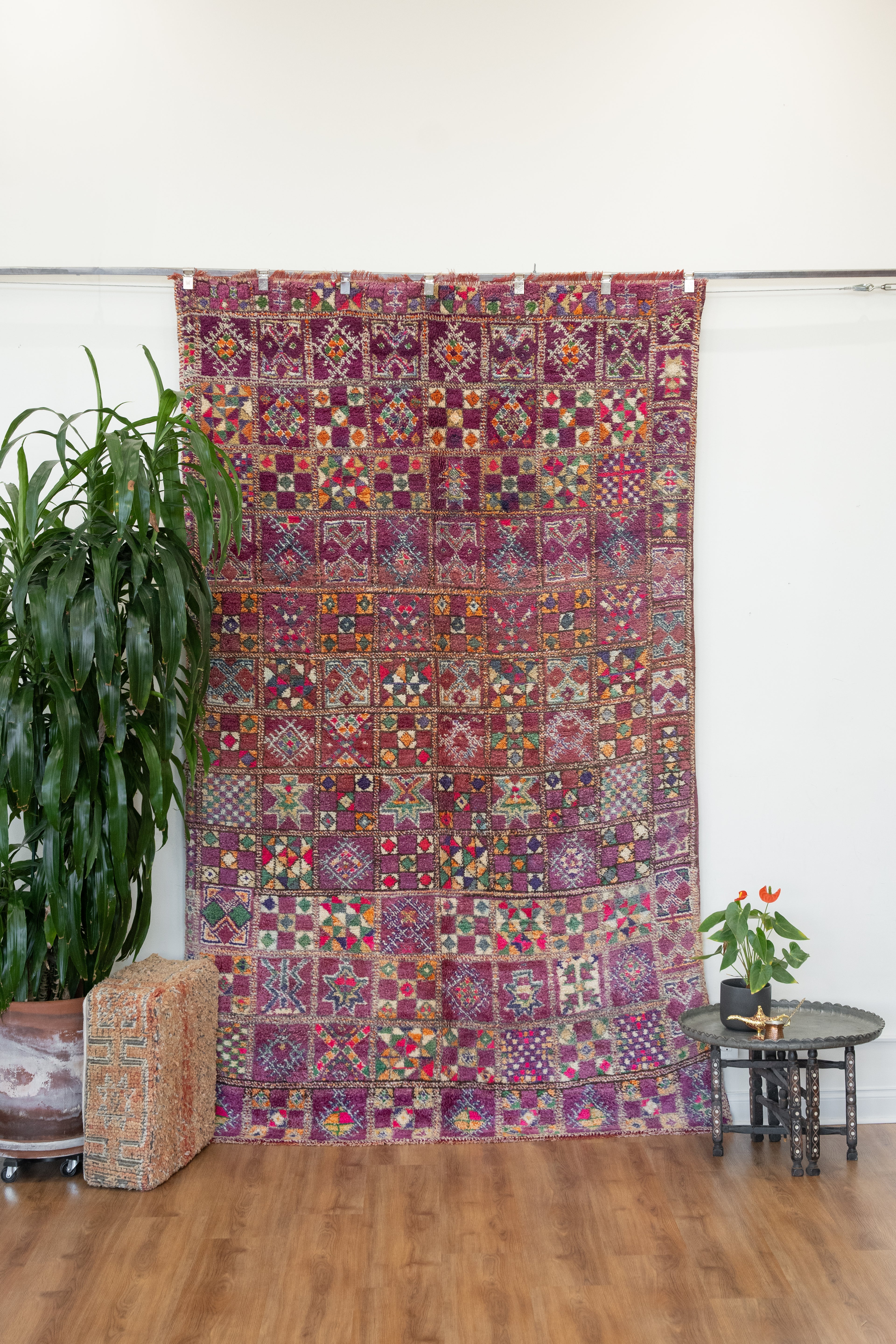 This one-of-a-kind plush rug is handcrafted from 100% wool. Approximately 30 years old, its quality craftsmanship ensures it remains soft, durable, and vibrant for years to come. Moroccan rugs are known for their pastel tones and subtle hues - commonly coral pink, light grey, and persimmon orange. This particular piece stands out with rare purple hues and traditional green star motifs, adding a unique cultural charm. Please inspect all photos, irregular shape and a few carefully executed restorations are part of the preservation of character and authenticity. Each rug in our collection is authentic and personally handpicked by Nedim.