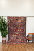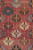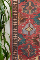 This one-of-a-kind vintage Kilim rug, handwoven over 50 years ago, features traditional Ejder (Dragon) motifs repeated across a soft, faded magenta wool ground. In folklore, the dragon is a mythological symbol of prosperity and fertile soil nourished by spring rains. The palette blends timeless tones of teal and chambray blue, adding depth to the design. As a true heirloom textile, this piece bears the marks of age. Restorations, areas of wear, and natural fading. Please inspect all photos carefully. Each rug in our collection is personally handpicked by Nedim.