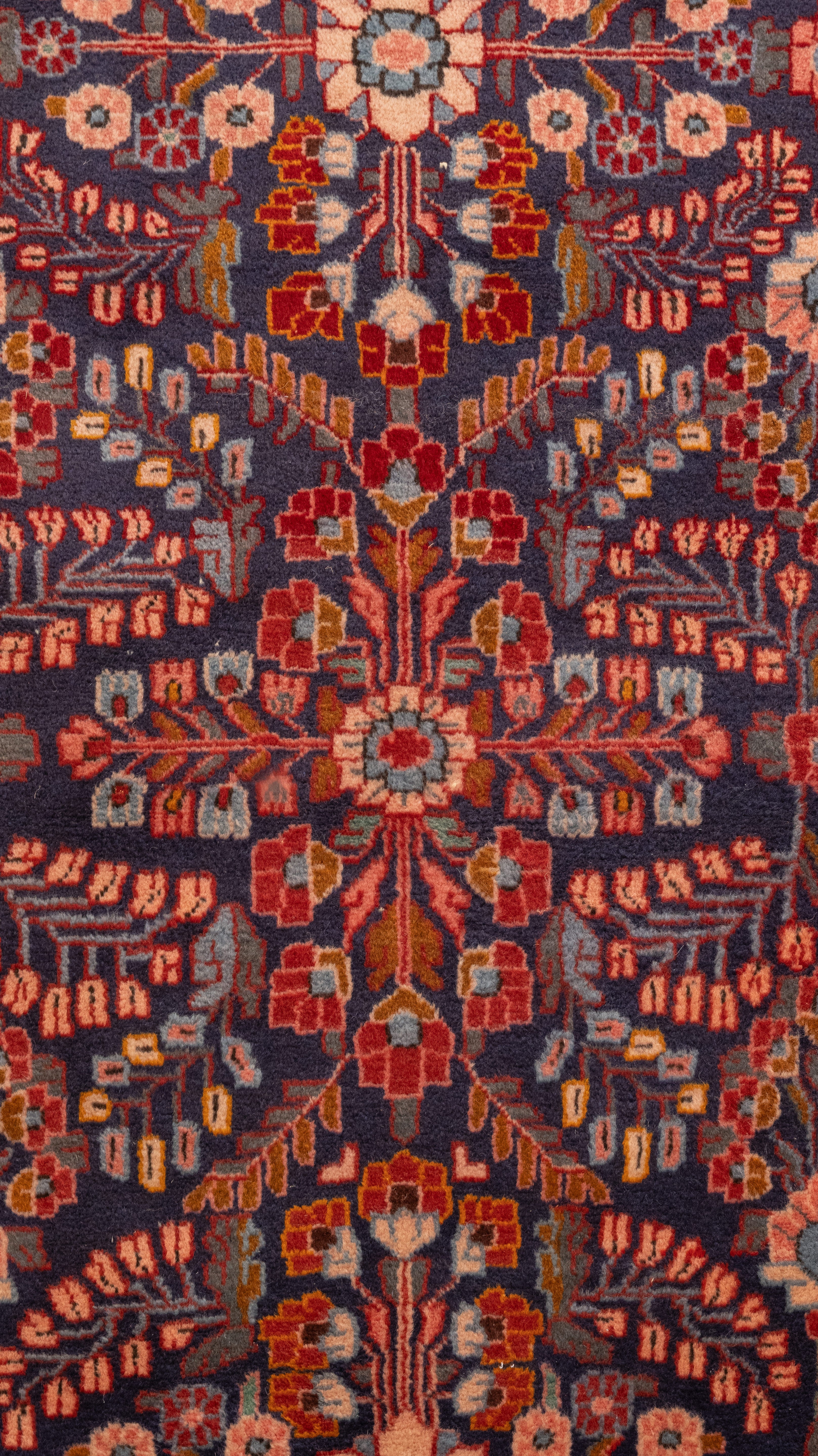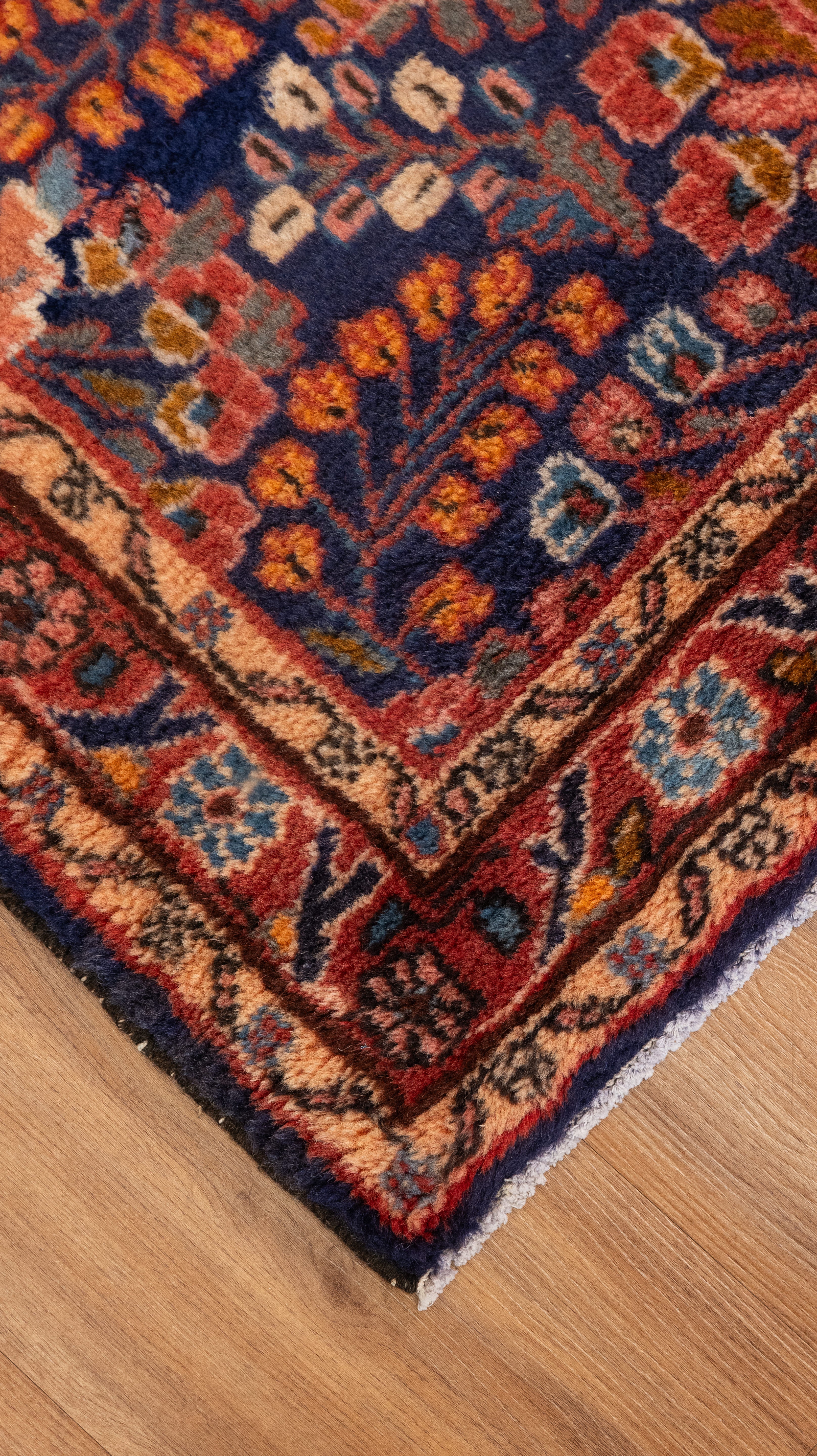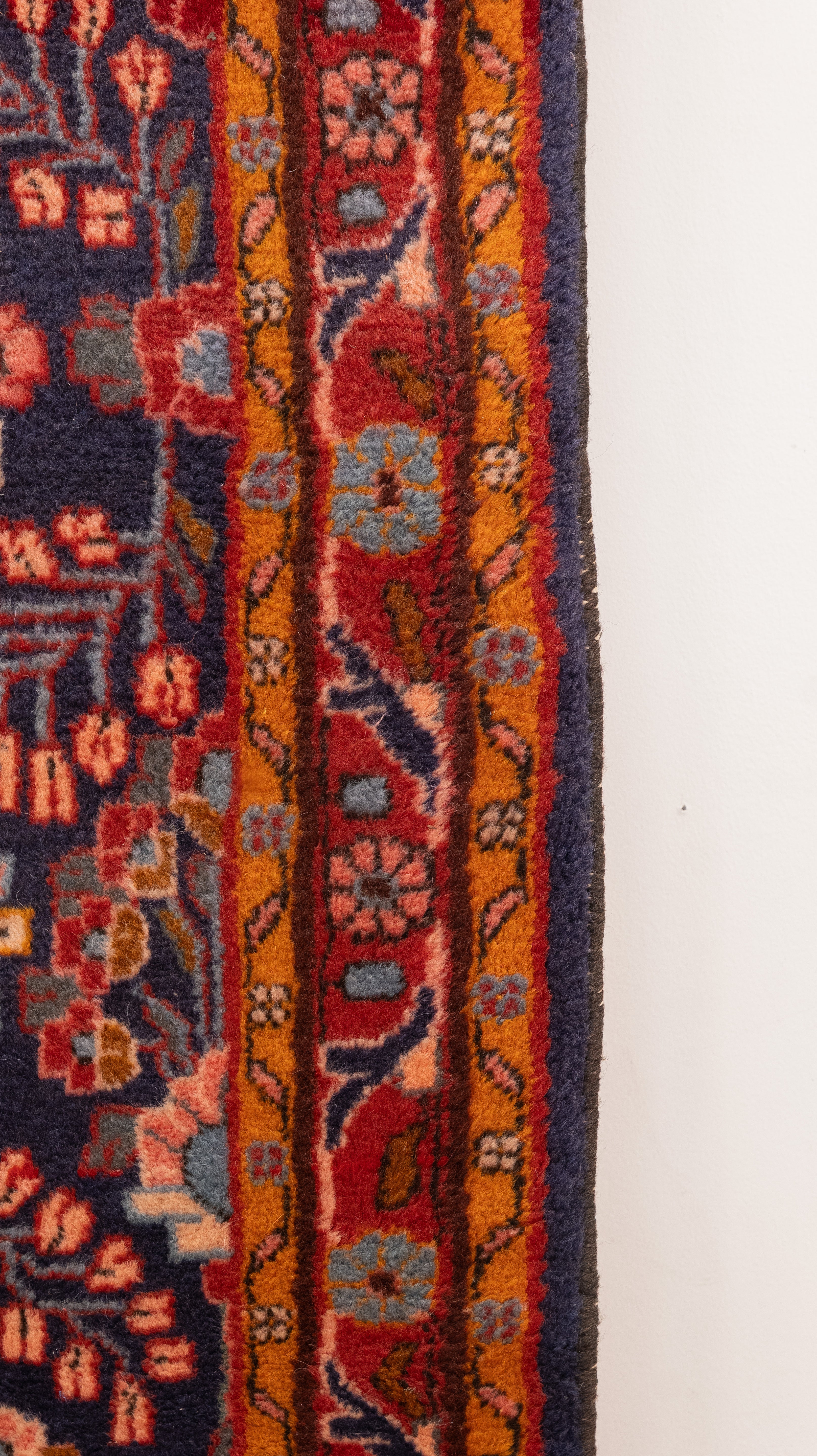 This one-of-a-kind runner is hand-knotted with a durable cotton foundation and a soft, 100% wool pile. Its plush texture is paired with an elegant all-over floral motif, set against a true indigo blue ground. While designed to withstand high foot traffic, the tall pile makes it less suitable for kitchens. Please note that, due to the nature of a handmade object, this runner has some irregular measurements, with one end larger than the other. Like every piece in our collection, this rug is authentic and carefully handpicked by Nedim.