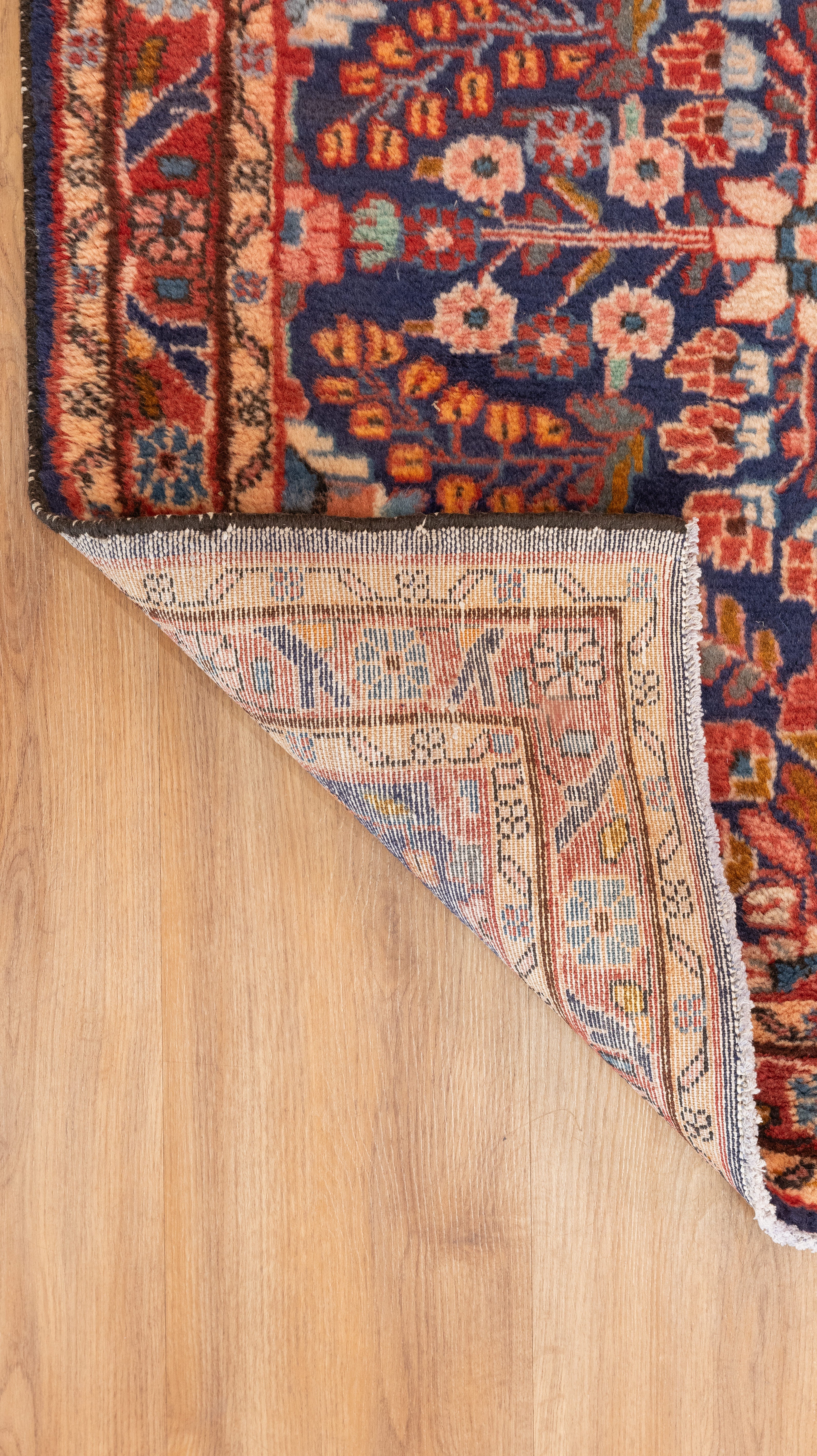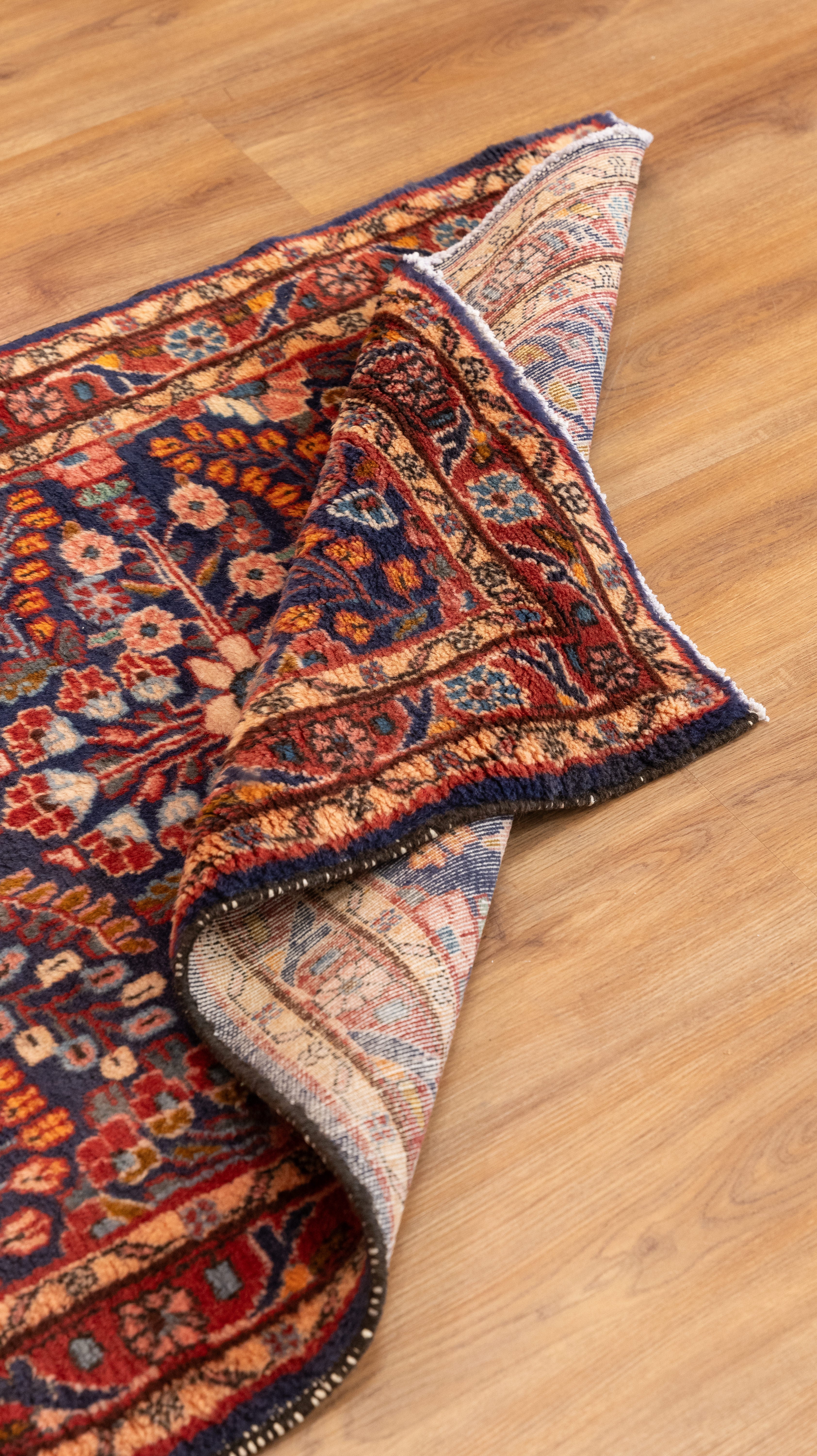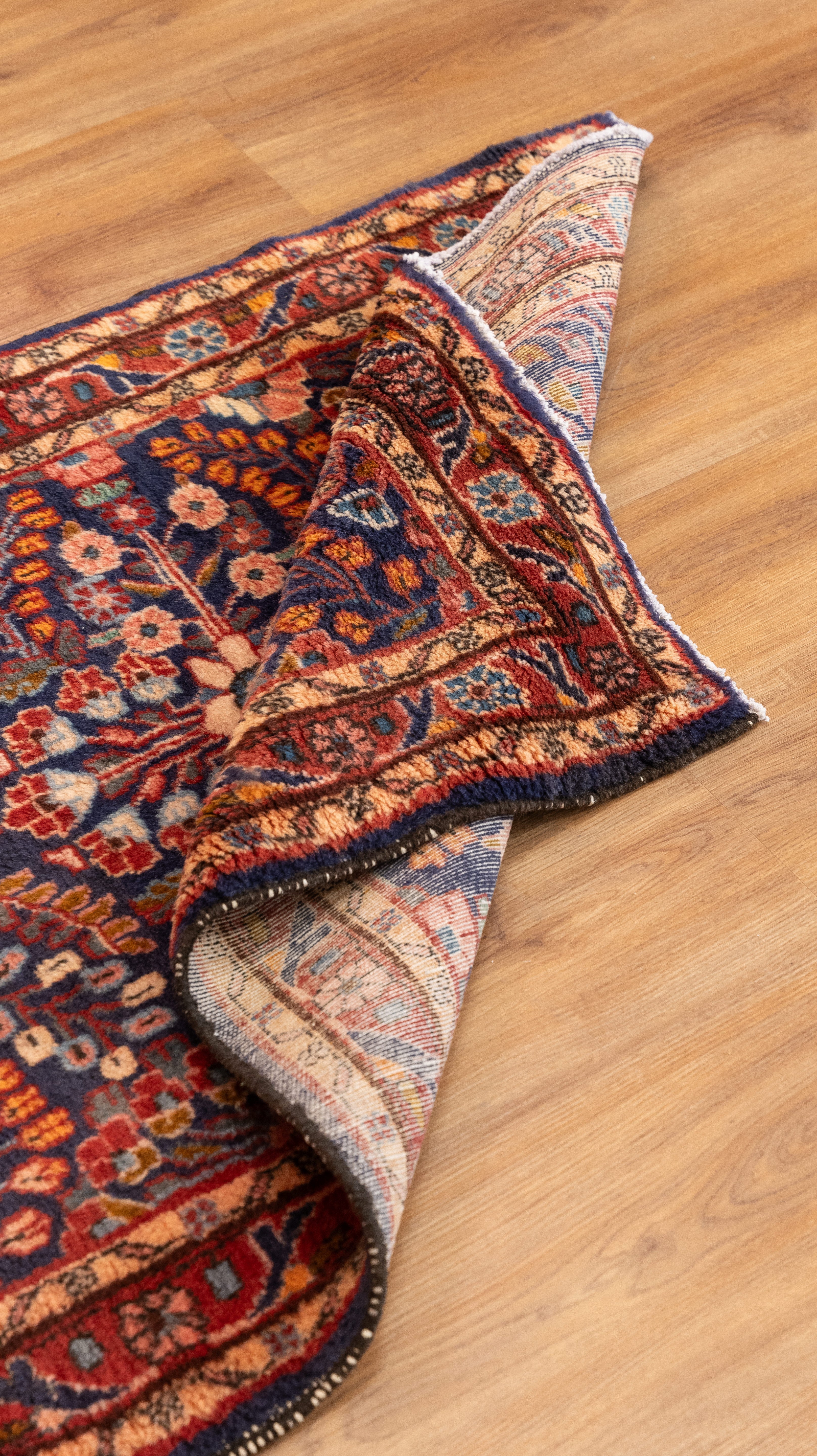 This one-of-a-kind runner is hand-knotted with a durable cotton foundation and a soft, 100% wool pile. Its plush texture is paired with an elegant all-over floral motif, set against a true indigo blue ground. While designed to withstand high foot traffic, the tall pile makes it less suitable for kitchens. Please note that, due to the nature of a handmade object, this runner has some irregular measurements, with one end larger than the other. Like every piece in our collection, this rug is authentic and carefully handpicked by Nedim.