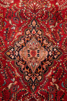 This one-of-a-kind, high-density rug, features a floral center medallion motif surrounded by more then 6 ribbon frame motifs. These rugs are hard-wearing and have a silk lustrous feel. Although the base is a vibrant red, there are many colors woven into this rug; yellows, coral pink, marigold-yellow and ivory. All of our rugs are authentic and carefully handpicked by Nedim.