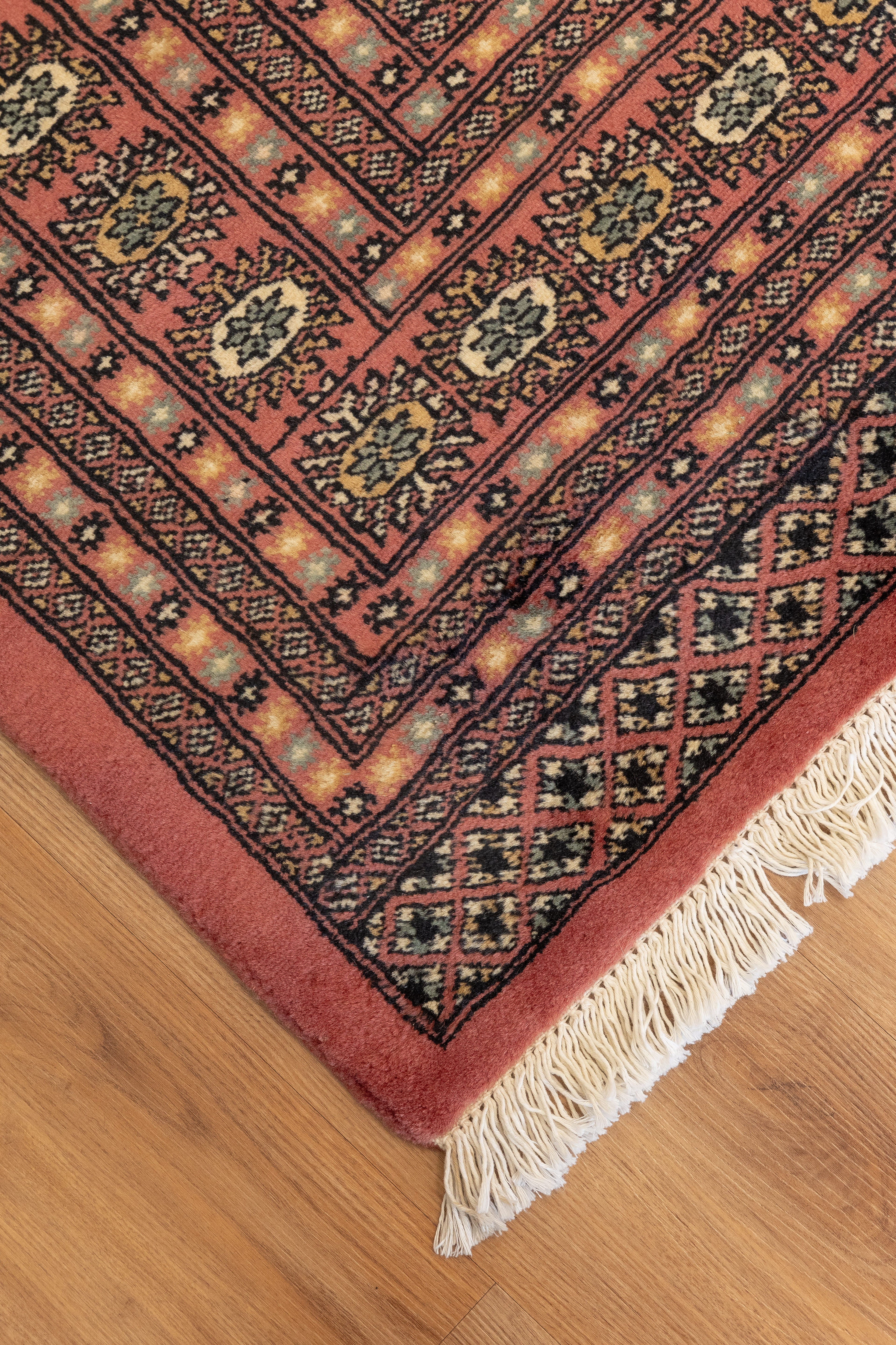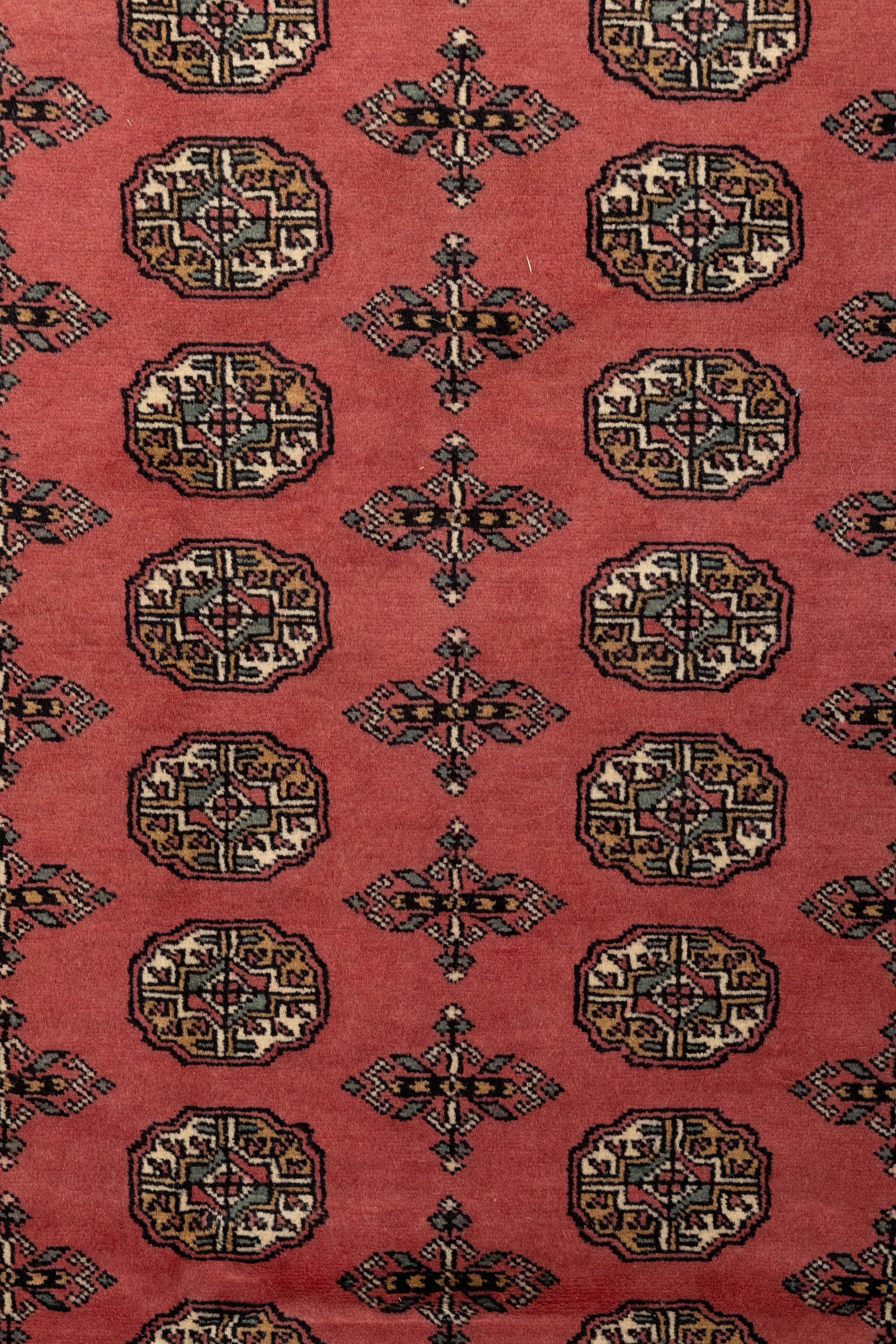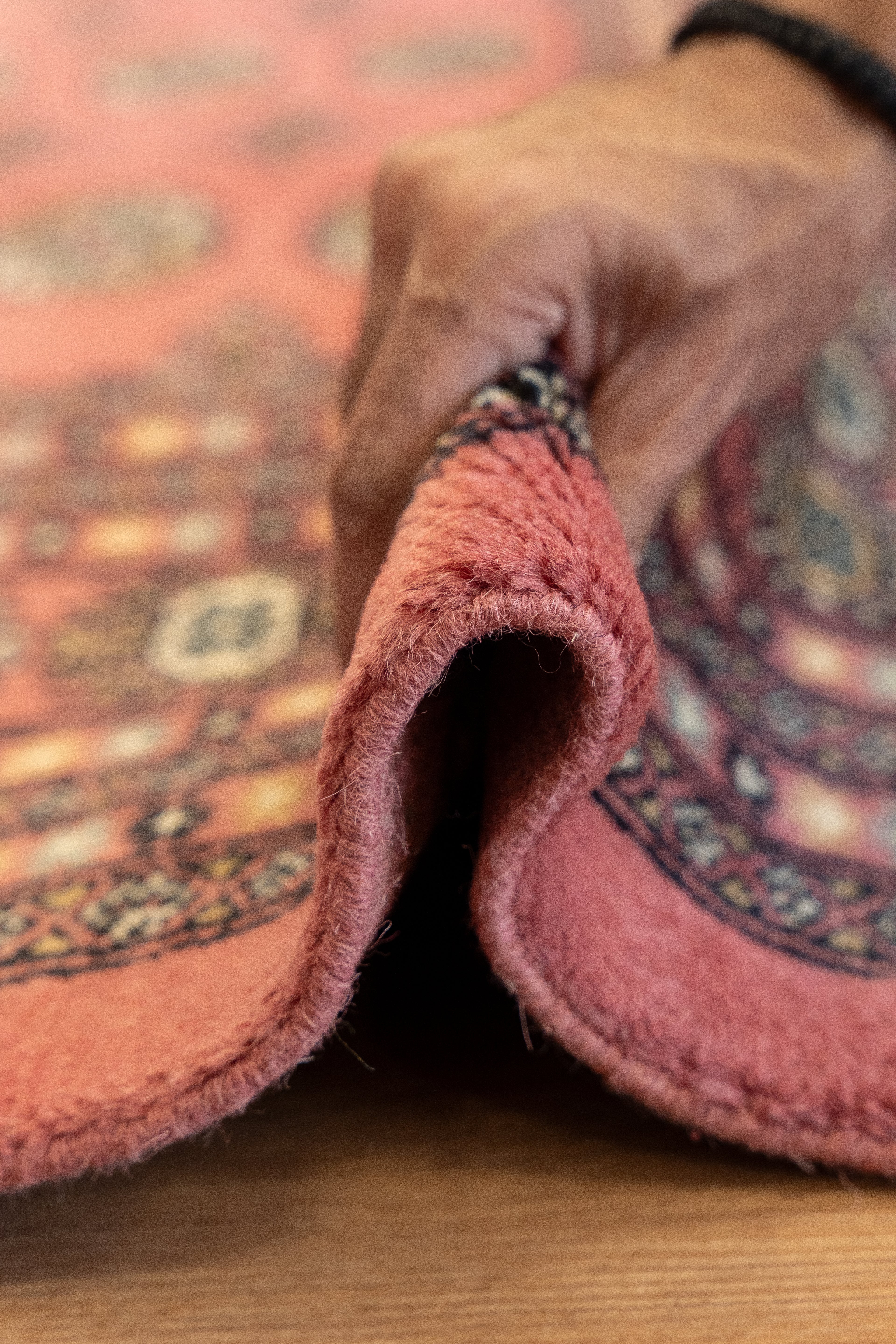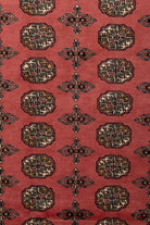 This one-of-a-kind rug is handmade from a cotton foundation and wool pile. It features repeated tribal octagonal-shaped motifs called Göl. This supple wool is dyed on a dark candy-pink ground and has blue and cream accents. This traditional rug feels velvety to the touch and is very soft. All of our rugs are authentic and handpicked by Nedim.