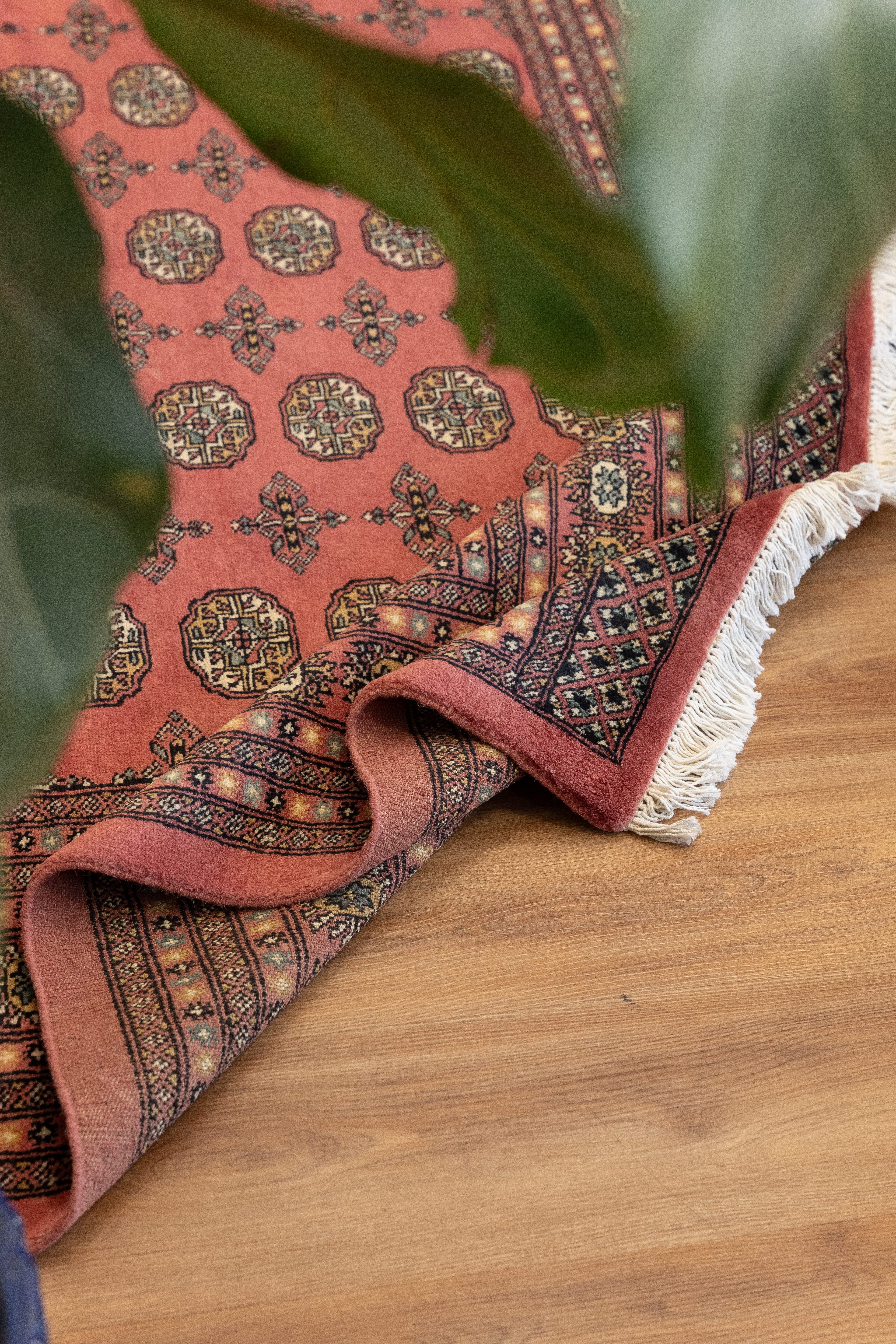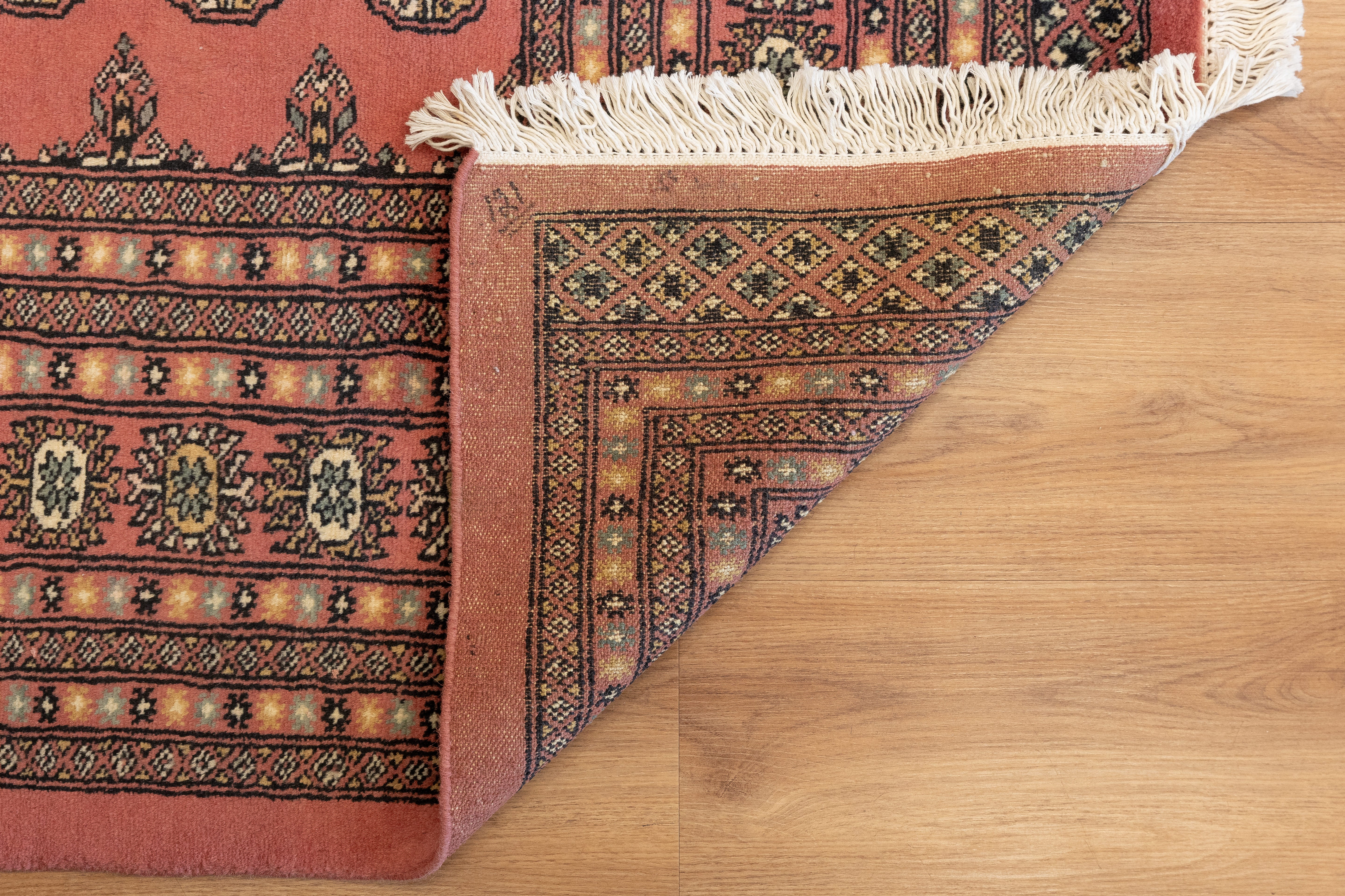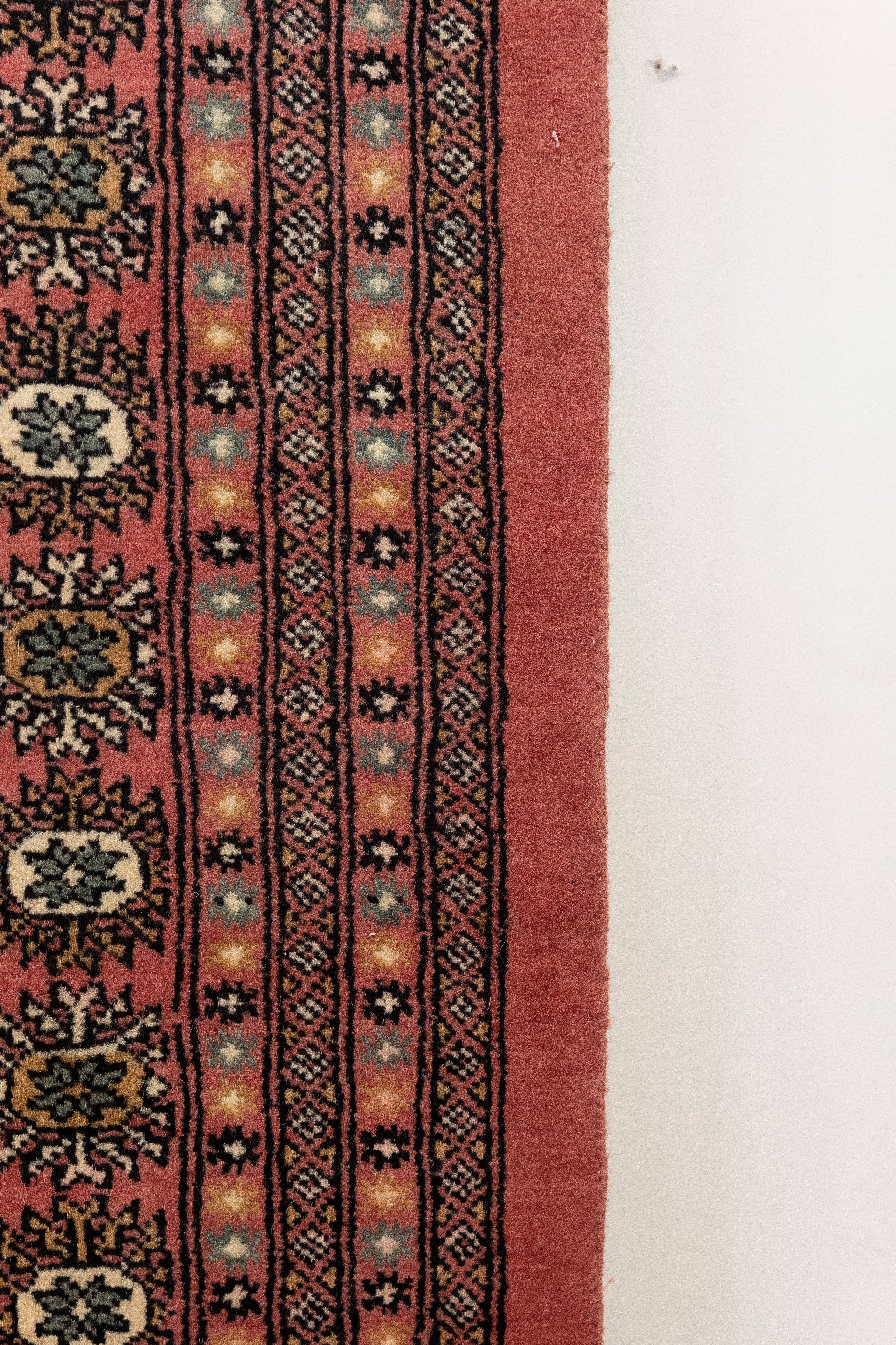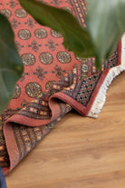 This one-of-a-kind rug is handmade from a cotton foundation and wool pile. It features repeated tribal octagonal-shaped motifs called Göl. This supple wool is dyed on a dark candy-pink ground and has blue and cream accents. This traditional rug feels velvety to the touch and is very soft. All of our rugs are authentic and handpicked by Nedim.