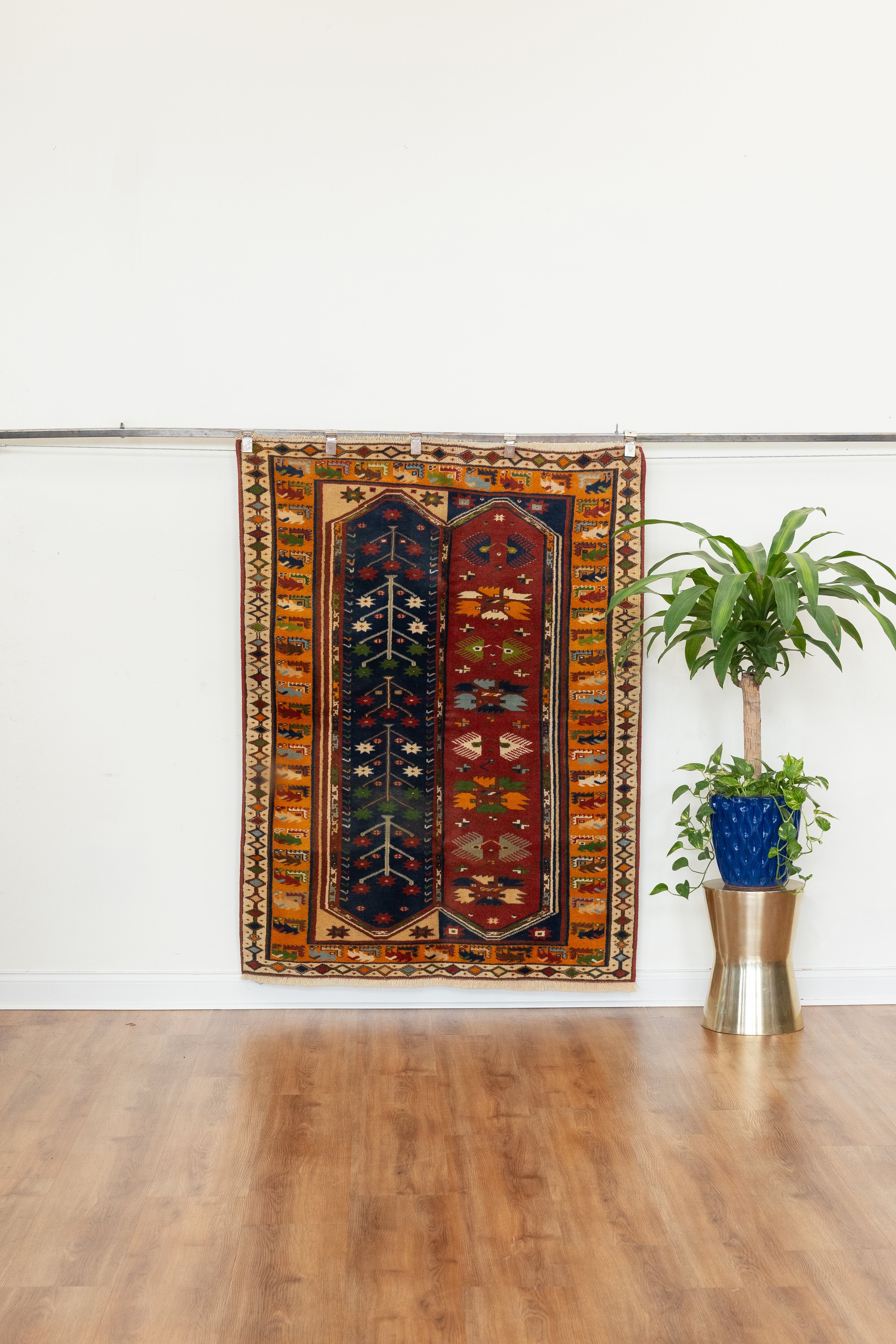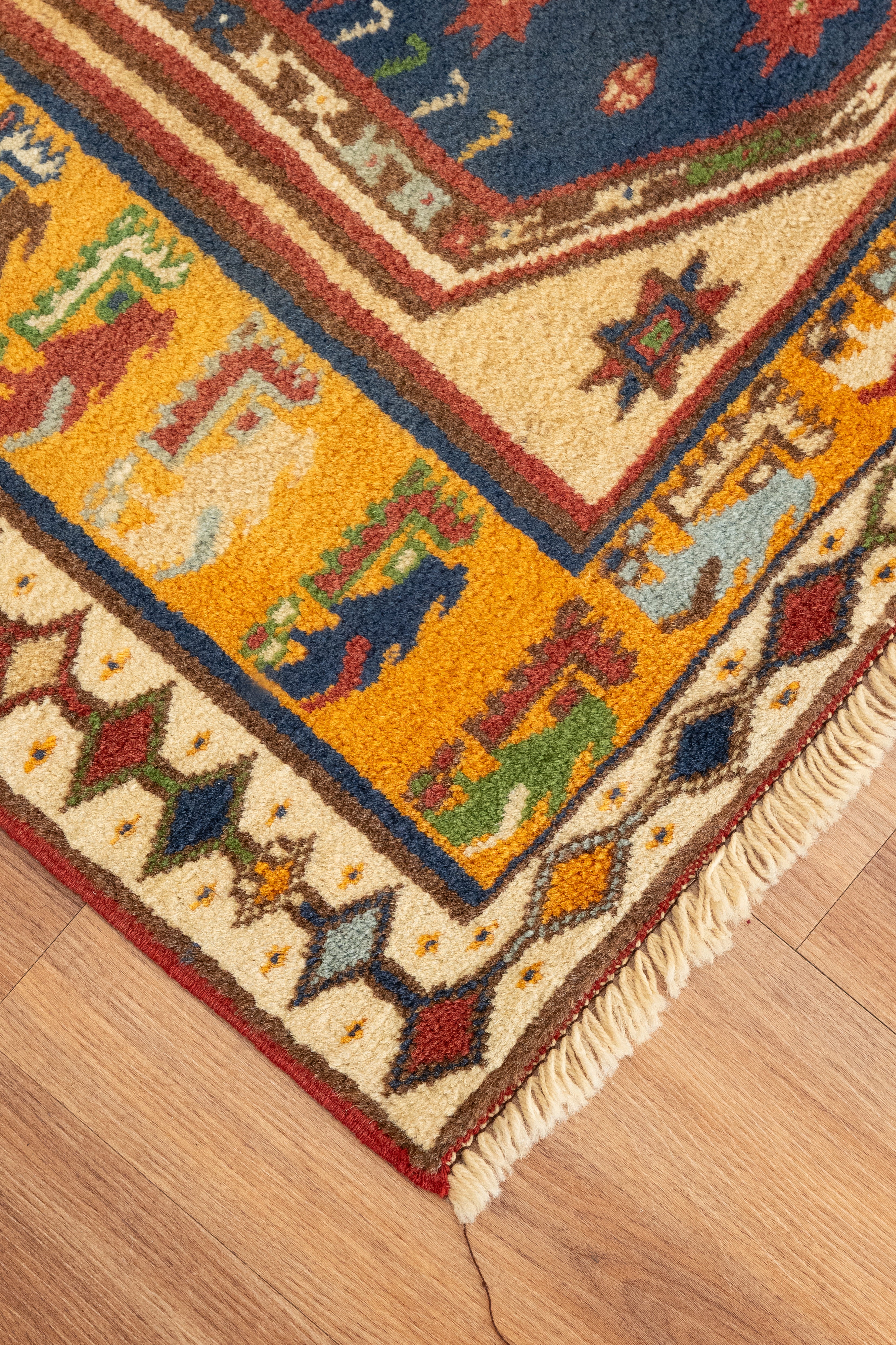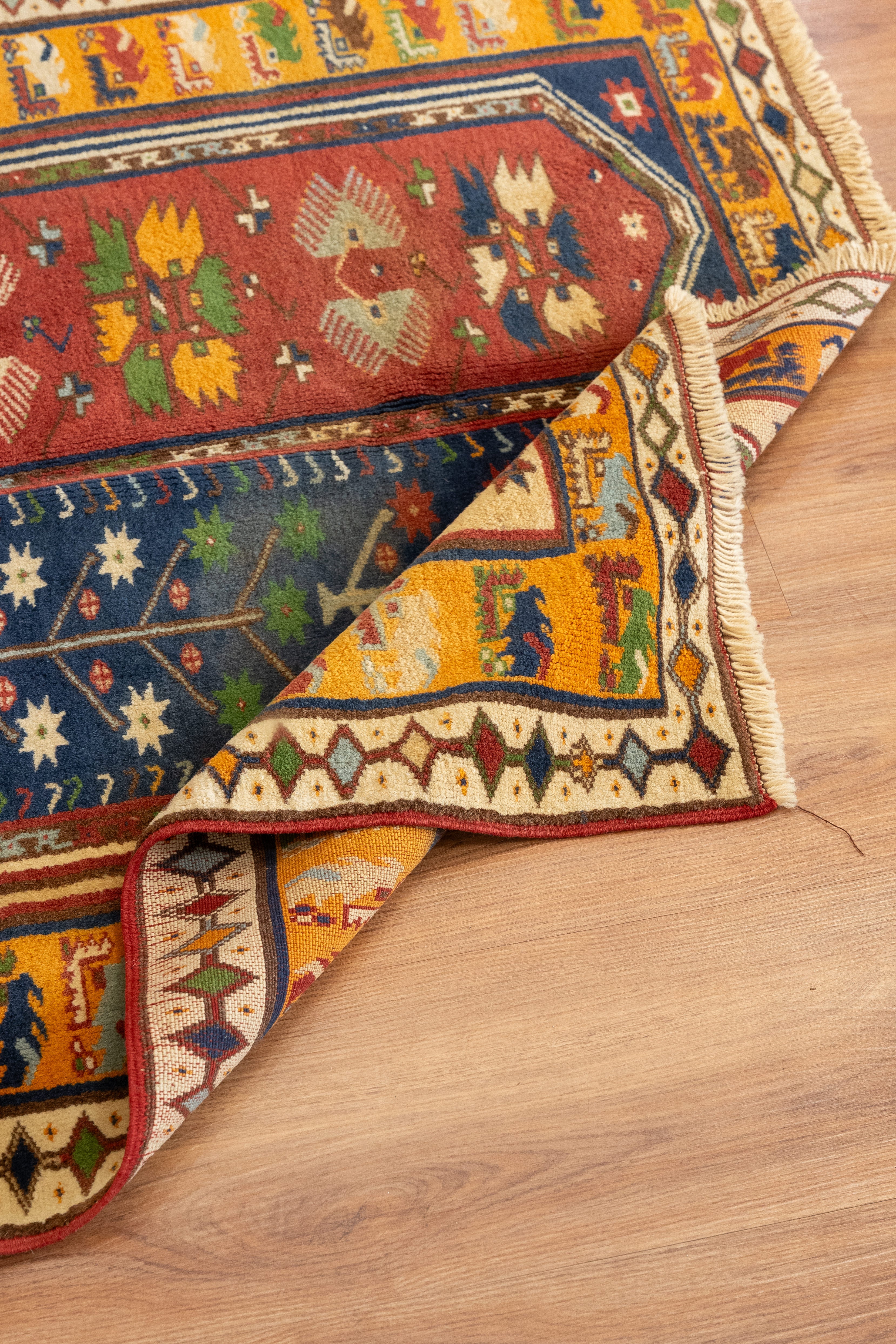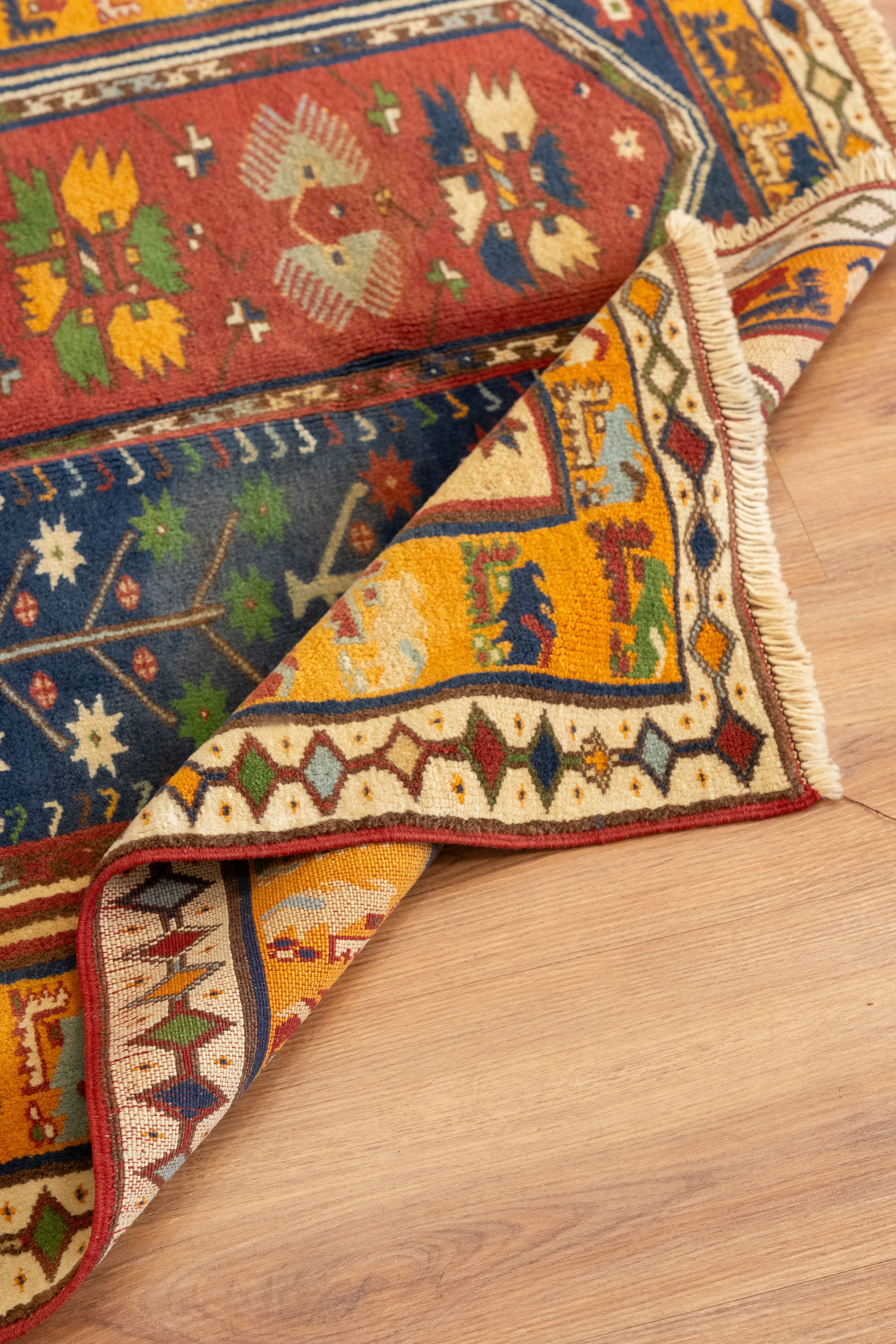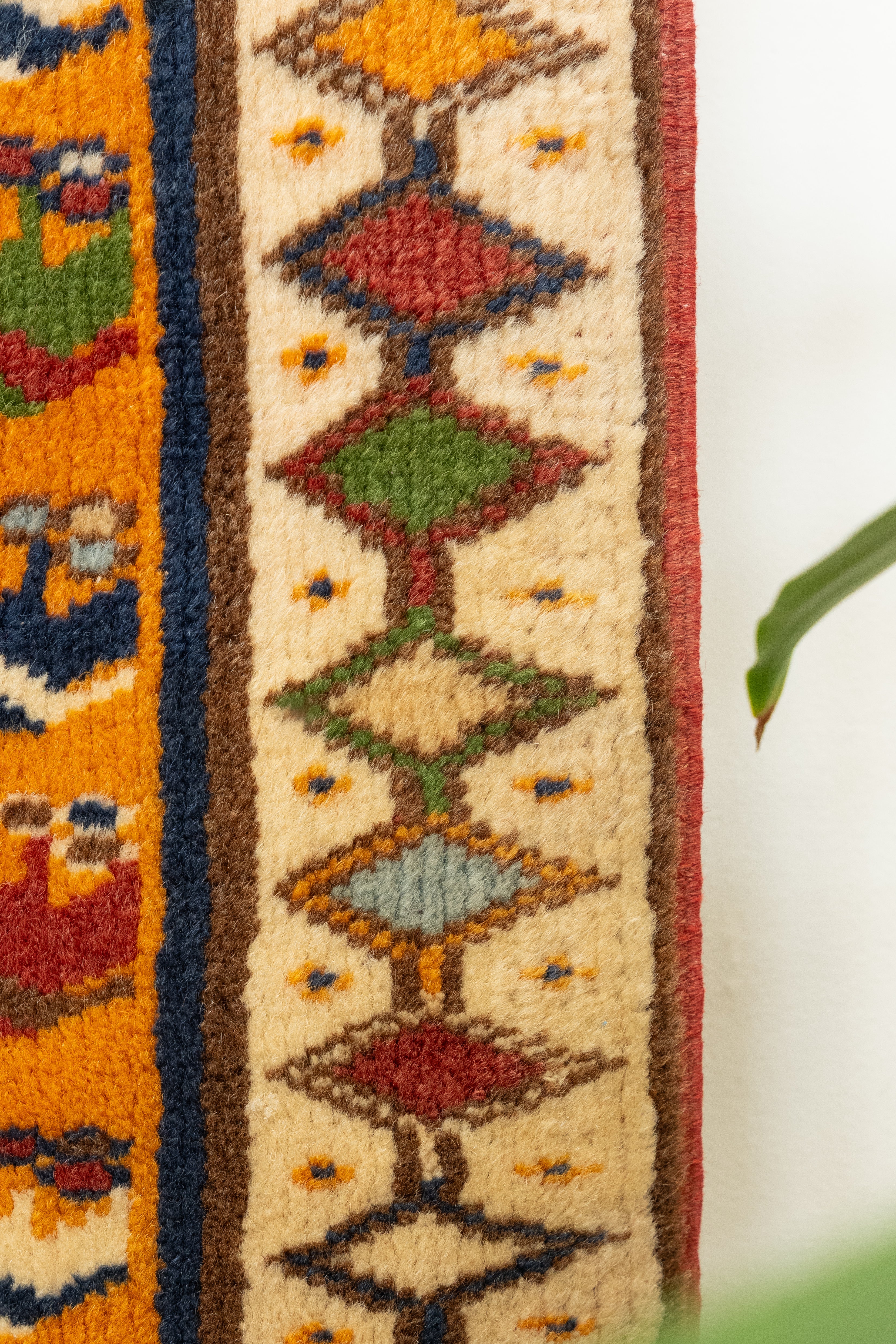 This one-of-a-kind vintage rug is made from 100% wool. This size rug is ideal for an entryway, bedroom, or home office. This soft rug is woven with a rich gold color base, and the tribal motifs are inspired by a classic field motifs, often use for weddings or praying traditions. Each of our rugs is authentic and carefully handpicked by Nedim himself.