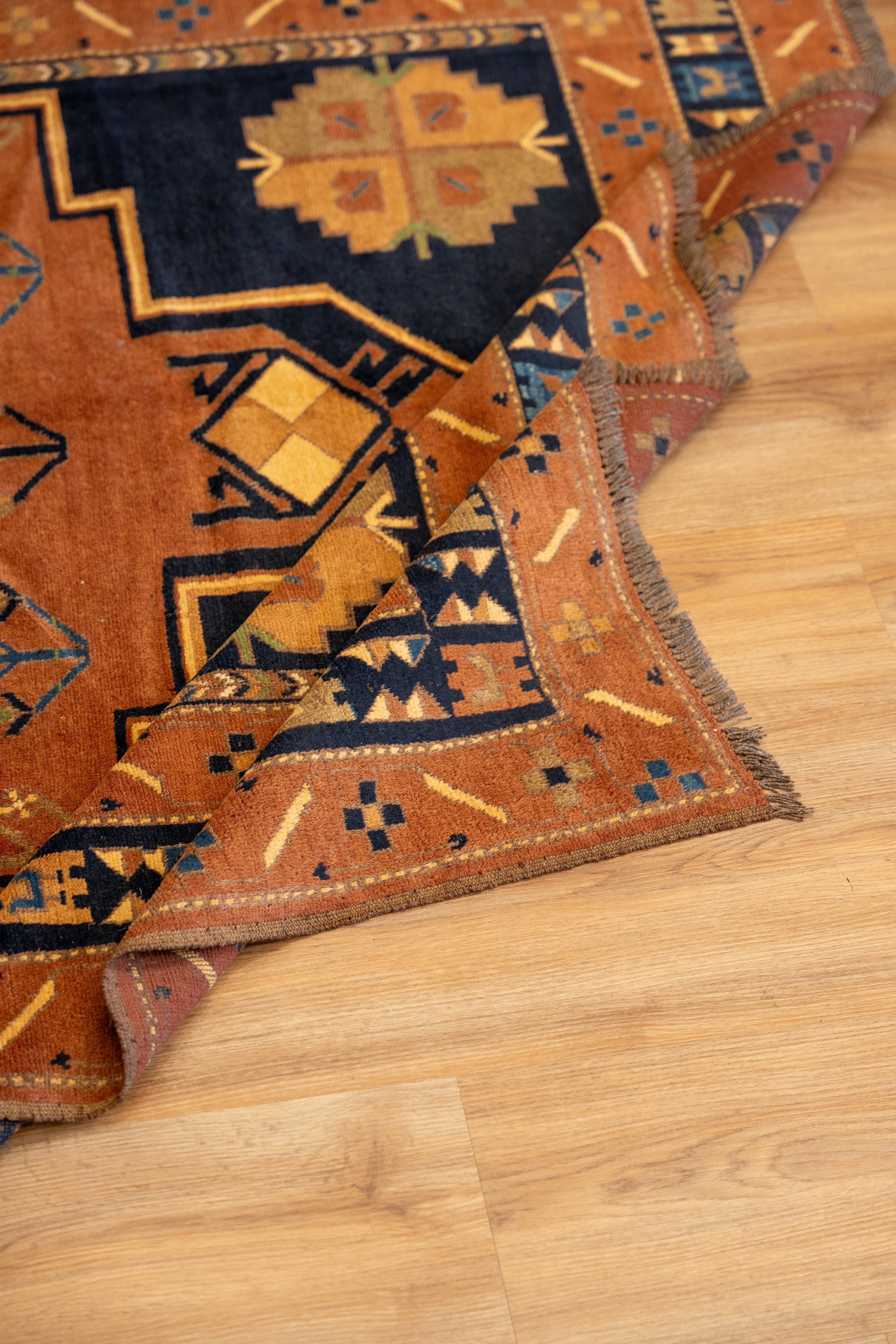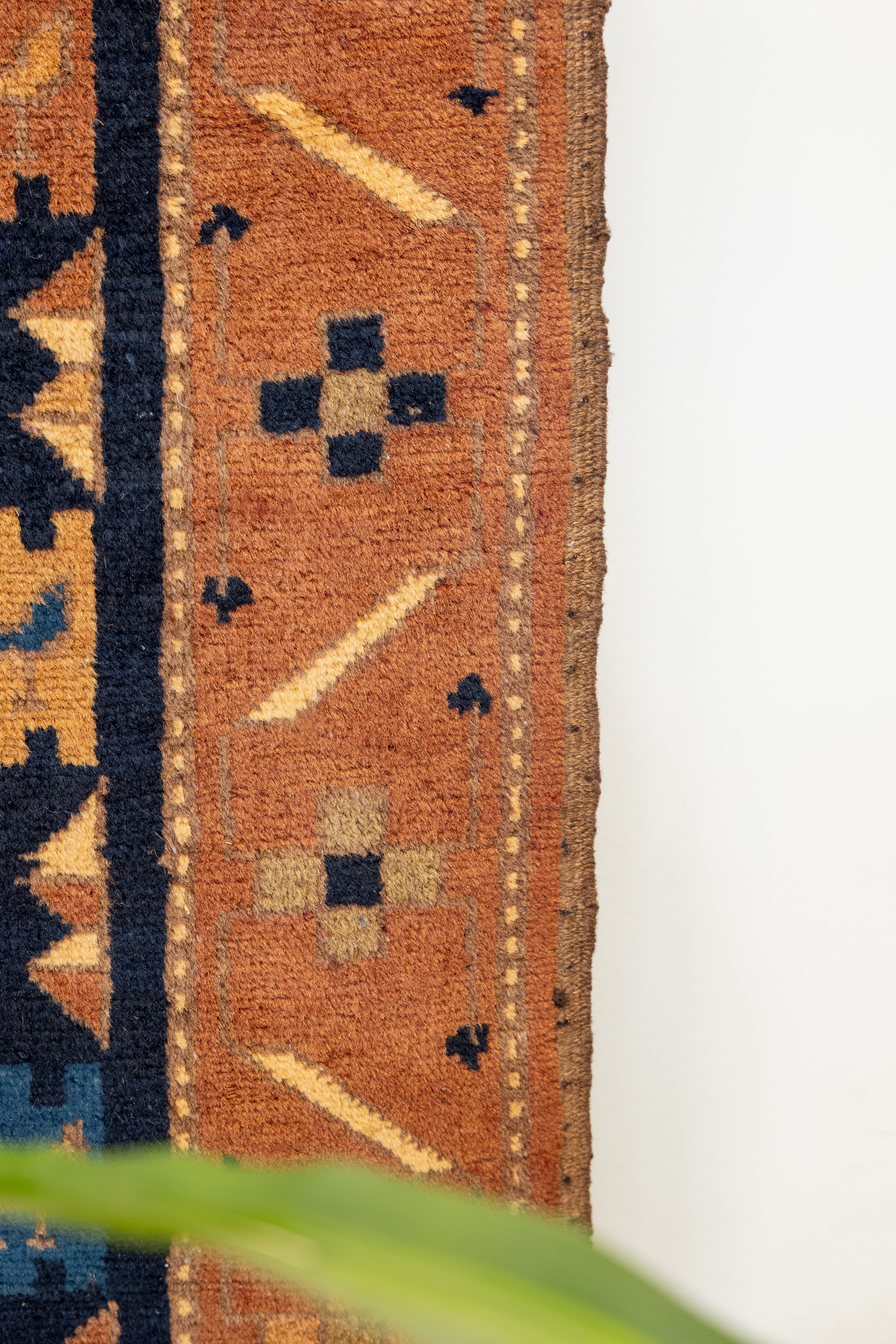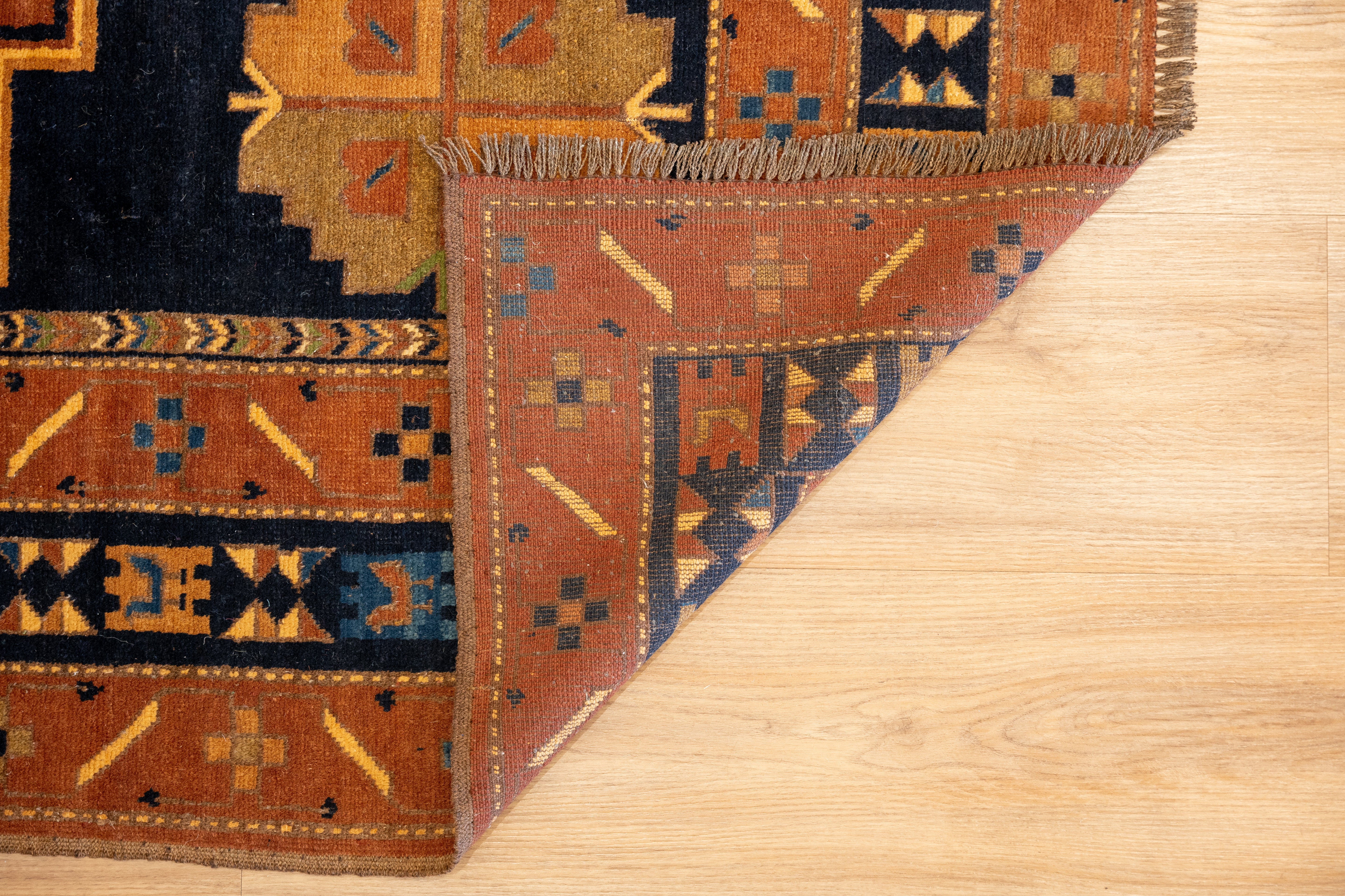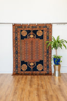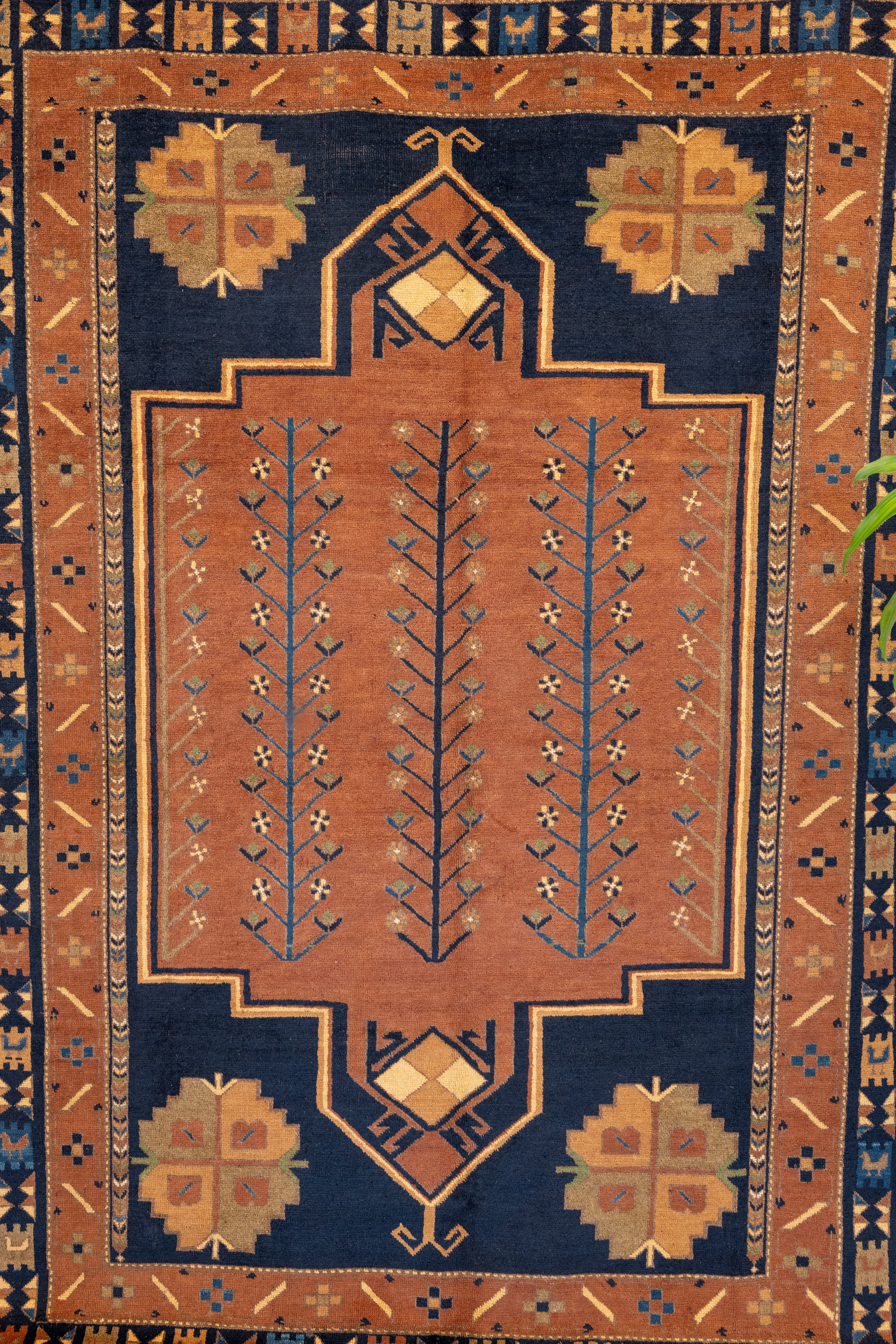 This one-of-a-kind vintage rug is at least 50 years old, and is made from 100% goats hair. It features some of the most traditional Turkmen tribe motifs, such as the tree of life and bird motifs woven along the border frame. This rug is woven on a natural, double-knotted natural colored wool, and true indigo dyes. All of our rugs are authentic and carefully handpicked by Nedim.