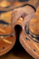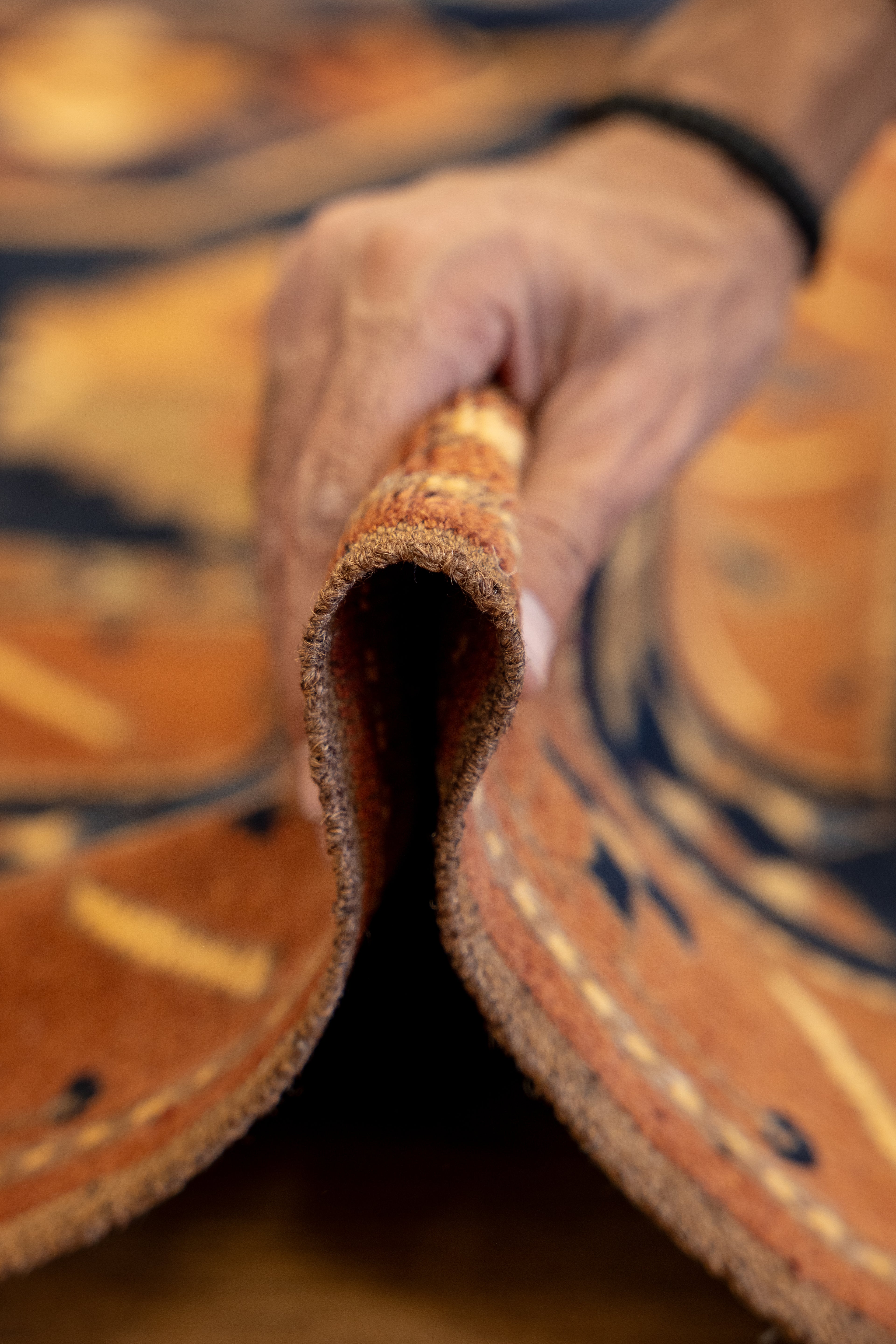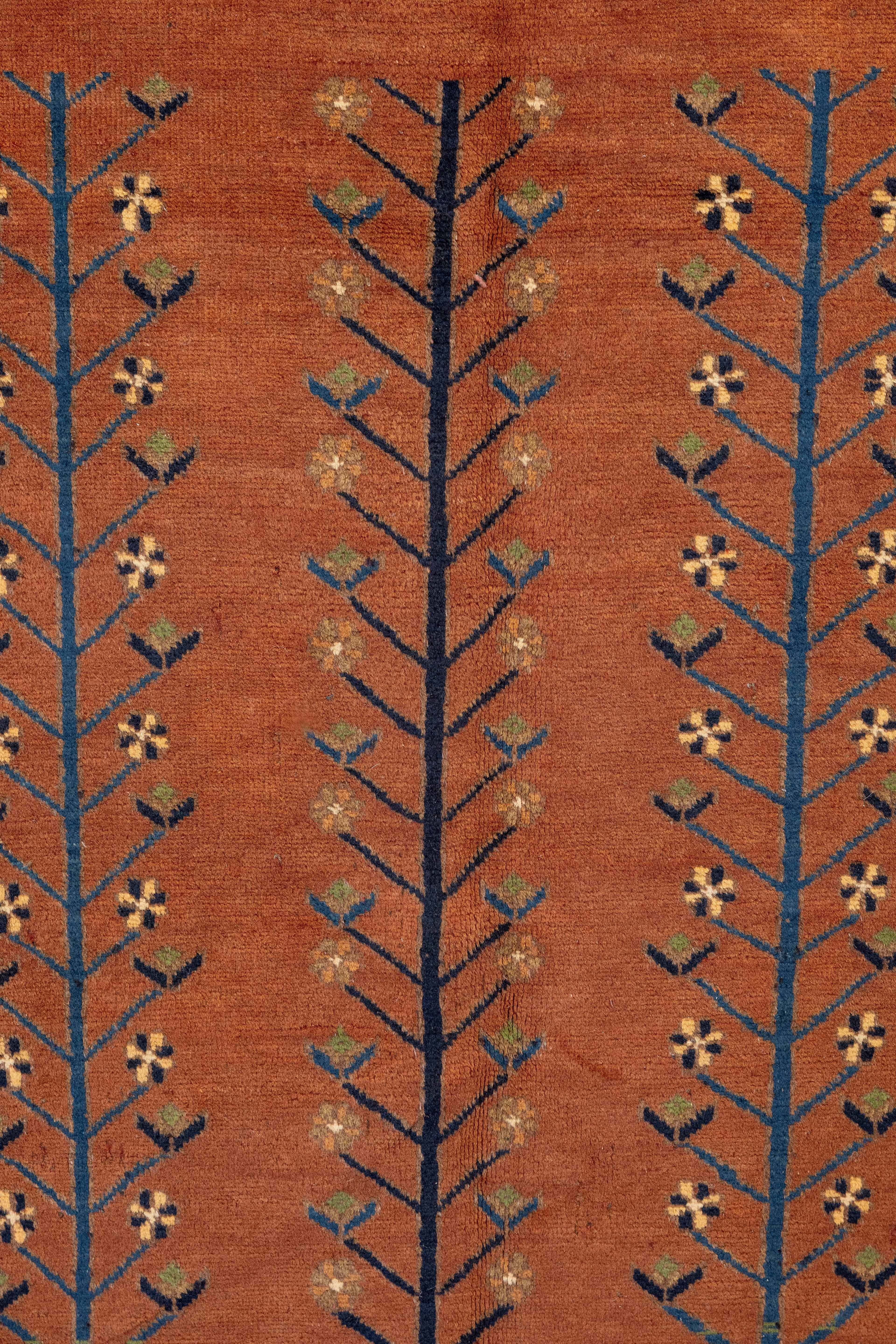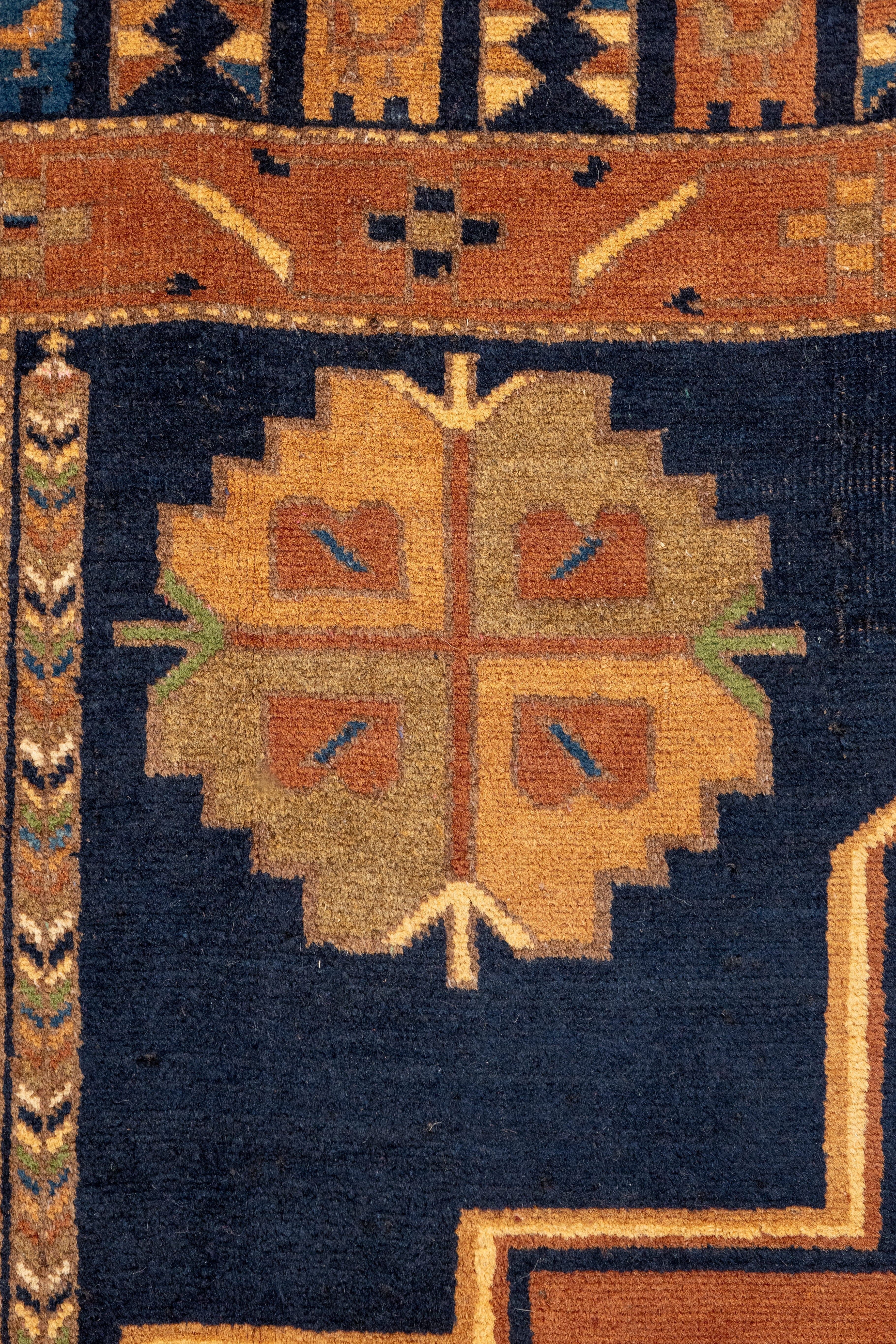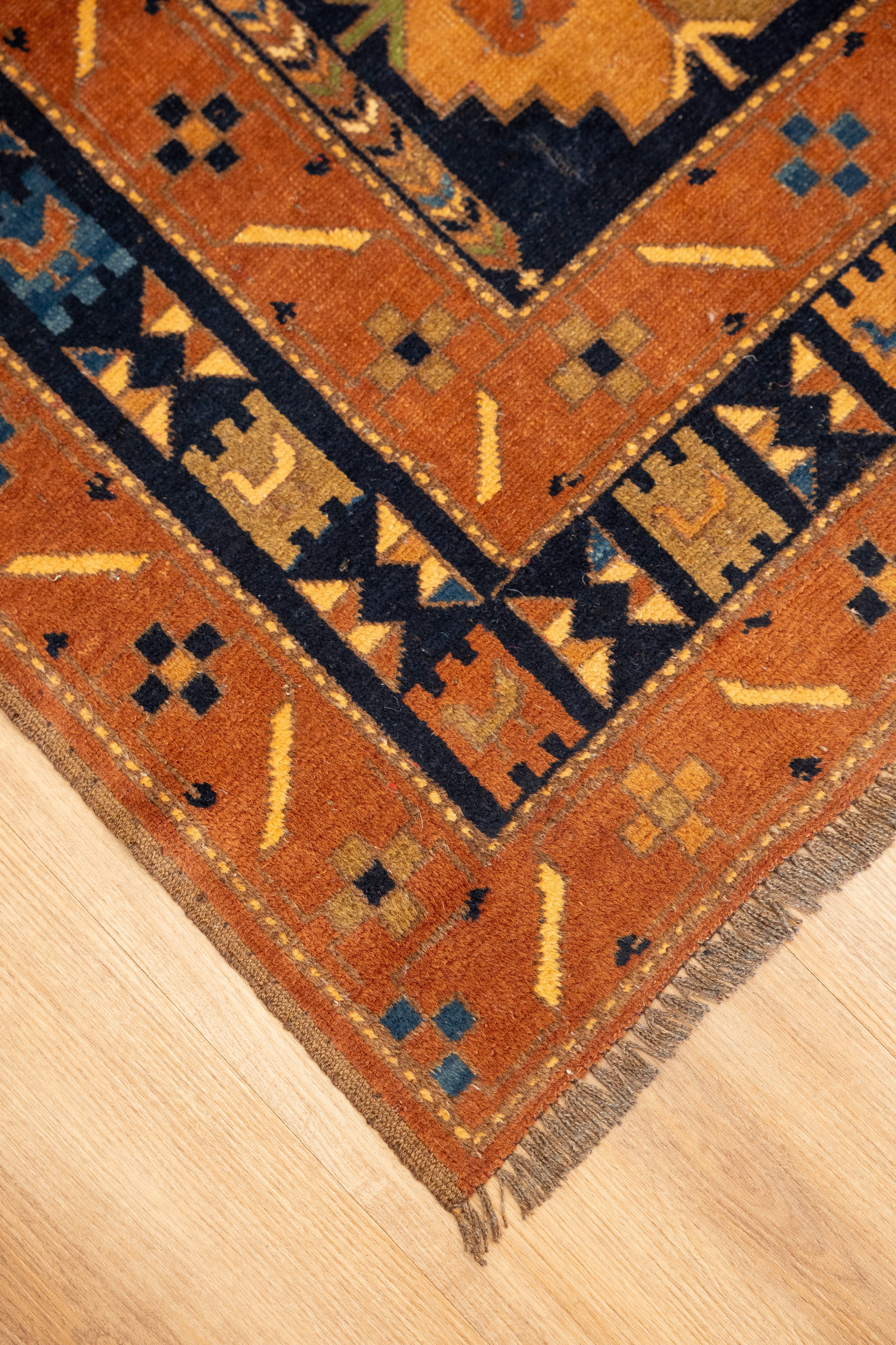 This one-of-a-kind vintage rug is at least 50 years old, and is made from 100% goats hair. It features some of the most traditional Turkmen tribe motifs, such as the tree of life and bird motifs woven along the border frame. This rug is woven on a natural, double-knotted natural colored wool, and true indigo dyes. All of our rugs are authentic and carefully handpicked by Nedim.